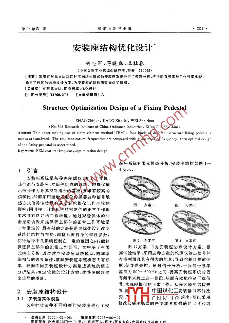 第27卷第1期彈箭與制導學報, 301安裝座結(jié)構(gòu)優(yōu)化設(shè)計*趙志軍,蔣曉,磊,衛(wèi)社春(中國兵器工業(yè)第203研究所.西安710065)[摘要]采用有限元方法對四種不同結(jié)構(gòu)形式的安裝座系統(tǒng)進行了模態(tài)分析.所得固有頻率與工作頻率比較,確定了較優(yōu)的結(jié)構(gòu)設(shè)計方案.為安裝座的結(jié)構(gòu)修改提供了依據(jù)。[關(guān)鍵詞]有限元方法;固有頻率;優(yōu)化設(shè)計[中圖分類號] TJ760.3+5 [文獻標識碼] AStructure Optimization Design of a Fixing PedestalZHAO Zhirjun,JIANG Xiao-lei, WEI She chun(No. 203 Research Institute of China 0rdnance Industries. Xi' an 710065 .China)Abstract: This paper making use of finite clement method( FEM). four kinds of different structure fixing pedestal'smodes are analyzed. The resultant natural frequencies are compared with given working frequency. then optimal designof the fixing pedestal is ascertained.Key words : FEM; natural frequency ;optimization design裝座系統(tǒng)有限元模態(tài)分析,安裝座結(jié)構(gòu)如圖1~ .1引言4所示。安裝座系統(tǒng)是某導彈陀螺儀、彈上計算機、熱電池與安裝座、立簡等組成的系統(tǒng)。陀螺儀輸出信號作為導彈控制指令的基準,要求有較高的信噪比,然而采用接觸式電位傳感器這種信號敏感方式使得該信號容易受到陀螺儀工作環(huán)境的圖1方案一圖2方案二影響;同時彈上計算機等精密器件的正常工作也要求具有良好的工作環(huán)境。通過減輕彈體的沖擊振動誘因來提供彈上部件的正常工作環(huán)境是非常困難的,最有效的方法是通過優(yōu)化設(shè)計改變系統(tǒng)的結(jié)構(gòu)與布局,調(diào)整系統(tǒng)自身的特性參數(shù),使得這種不良影響控制在一定的范圍之內(nèi),能夠圖3方案三圖4方案四保證彈上部件的正常工作即可。文中基于有限圖1(方案一)為安裝座初步設(shè)計方案。根元模態(tài)分析,通過建立安裝座系統(tǒng)模型,施加系據(jù)試驗結(jié)果,采用這種方案的陀螺儀輸出信號伴統(tǒng)相似的邊界條件,求解安裝座系統(tǒng)模態(tài)固有頻有毛刺而且具有很大的能量,導致陀螺儀提前倒率。根據(jù)不同安裝座設(shè)計方案組成系統(tǒng)的模態(tài)框,使導彈失控。通過信號分析,干擾信號頻率分析結(jié)果,確定較優(yōu)的設(shè)計方案,改善陀螺儀輸范圍為500~600Hz之間,提高安裝座系統(tǒng)的固出信號的質(zhì)量。有頻率來跨過這一頻段,從而有效地抑制干擾信號,實現(xiàn)陀螺儀的正常工作。從安裝座的結(jié)構(gòu)來2安裝座結(jié)構(gòu)設(shè)計看,中國煤化工安裝接口不能改.2.1安裝座實體模型變,iYHC NMH G頻率,可以采用文中針對四種不同構(gòu)型的安裝座進行了安修改安裝座底面的厚度或者加強筋的尺寸和結(jié)收稿日期:2006-02 -08;修回日期:2006-06-07作者簡介:趙志軍(1979- ).男.甘肅定西人.碩士.研究方向:武器系統(tǒng)及運用工程。302彈箭與制導學報2007年構(gòu)形式等方法改變安裝座的剛度來實現(xiàn)。為了個系統(tǒng)的共振。通過改變安裝座結(jié)構(gòu)設(shè)計,從方不影響彈上計算機的安裝定位,采用修改加強筋案一到方案四有效地提高了安裝座系統(tǒng)沿安裝來改變安裝座的剛度。座軸向模態(tài)的固有頻率,使系統(tǒng)固有頻率跨出了圖2(方案二)相對于初步設(shè)計方案,增加了陀螺儀干擾信號的頻率范圍,保證了陀螺儀良好安裝座中心圓柱形加強筋的軸向尺寸,與其相接的工作環(huán)境。的徑向發(fā)散板筋的高度相應(yīng)加長,成斜坡延伸至2.4 實驗結(jié)果安裝座邊沿。圖8為方案一上陀螺儀的輸出信號曲線,圖圖3(方案三)相對方案二有效地利用了安9為方案四上陀螺儀的輸出信號曲線。裝座陀螺儀、熱電池之間的安裝空隙,將徑向發(fā)散板筋在安裝座邊沿附近分支。圖4(方案四)相對方案三增加了徑向發(fā)散板筋的厚度。2.2安裝座系統(tǒng)模型安裝座系統(tǒng)實體模型如圖5所示。圖8優(yōu)化前陀螺圖9優(yōu)化后陀螺文中針對安裝座四種儀輸出信號設(shè)計方案建立了安裝座系統(tǒng)有限元模型,如圖6所3 結(jié)論示。模型采用具有中節(jié)點(1)從實驗結(jié)果可以看出,改變設(shè)計后,陀螺的高精度實體單元劃分網(wǎng)圖5實體模型,儀工作時間(橫向方框的個數(shù))延長,輸出信號的格,盡量防止單元畸形,各質(zhì)量明顯提高,說明文中安裝座的結(jié)構(gòu)優(yōu)化設(shè)計模型材料特性相同,區(qū)別在是有效的。于安裝座加強筋結(jié)構(gòu)形式的.(2)采用有限元方法進行結(jié)構(gòu)仿真通常與結(jié)不同。模型簡化了零部件之構(gòu)真實情況存在一-定的差距,尋求比較準確的仿間的連接方式,略去了螺釘、真建模方法以消除橫向誤差是工程應(yīng)用中的重螺紋孔,接觸面采用公共節(jié)圖6有限元模型點,然而實現(xiàn)這一點是比較困難的。文中根據(jù)真.點保持自由度一致。安裝座邊緣采用周向自由實結(jié)構(gòu)建立系統(tǒng)模型,利用縱向比較--步步優(yōu)化度固定的邊界條件,與安裝座系統(tǒng)在儀器艙內(nèi)的系統(tǒng)模型,對應(yīng)地修改真實結(jié)構(gòu),從而達到優(yōu)化安裝方式相似。真實結(jié)構(gòu)的目的,這種縱橫結(jié)合的仿真優(yōu)化設(shè)計2.3模態(tài)分析結(jié)果方法能夠有效地解決工程問題。文中對有限元模型進行[參考文獻