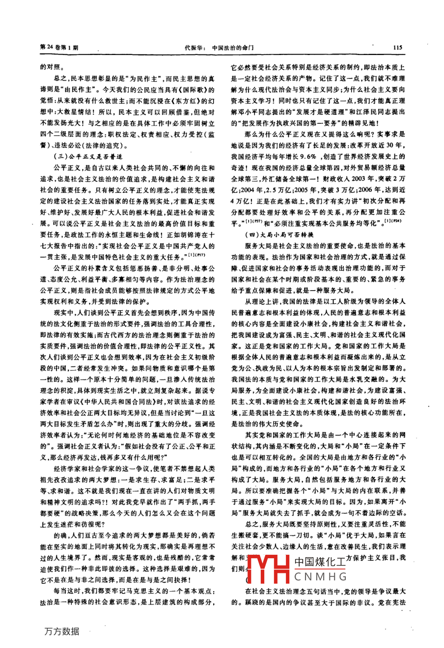 第24卷第1期華北水利水電學(xué)院學(xué)報(bào)(社科版)Vol, 24 No, I2008年2月stitute of Water Conservancy and Hydroelectric Power(Social Science)Feb.2008中國法治的命門代振華(河南省政法管理干部學(xué)院河南鄭州450002)摘要:法治作為現(xiàn)代世界各國社會治理或管理的基本方式,必須與歷史文化傳統(tǒng)和國情相適應(yīng),社會主義法治理念的提出和教育活動的廣泛開展,抓住了中國法治建設(shè)的牛鼻子,是中國法治建設(shè)的命門關(guān)鍵詞:法治;中國化;理舍中圖分類號:D920.1文獻(xiàn)標(biāo)識碼:A文章編號:10084444(2008)01-0113-042006—2007年,中國政法界發(fā)生了一件令人矚目的如果說黨的十五大作出“依法治國”的戰(zhàn)略性決策,九事,一件對中國政法界、民主政治產(chǎn)生深遠(yuǎn)積極影響的事,這屆人大二次會議將“依法治國,建設(shè)社會主義法制國家”基就是社會主義法治理念教育活動的廣泛開展。社會主義法本方略正式寫入憲法結(jié)束了“人治”與“法治”之爭的話,那治理念的提出和教育活動的廣泛開展,抓住了中國法治建設(shè)么社會主義法治理念的提出和教育活動的廣泛開展則標(biāo)志的牛鼻子,是中國法治建設(shè)的命門!著“法制”與“法治”之爭的終結(jié),必將成為我們黨和國家法制建設(shè)理論與實(shí)踐發(fā)展史上的一座重要的里程碑。社會主義法治理念教育的重要性與緊迫性司法實(shí)踐中存在的“重打擊輕保護(hù)”、“重實(shí)體輕程序”、二、社會主義法治理念的歷史定位“重口供輕證據(jù)”、“重配合輕制約”、“重(司法)秘密輕(司理念是指基于一定社會的政治、經(jīng)濟(jì)或生活、工作條件法)公開”、“重辦案輕服務(wù)”、“重法律效果輕社會效果”等就而形成的一種精神構(gòu)造與實(shí)踐模式,反映出追求的過程要求是有力的證明。由于沒有法治理念的指導(dǎo),我們甚至?xí)蛔院湍繕?biāo)要求的理論概括。可見理念不僅是一種理論和觀念己的“法制”捆住自己的手腳!央視“今日說法”報(bào)道的“尷式的精神構(gòu)造,更是一種主觀見之客觀的實(shí)踐模式或方法。尬的樓梯”,因“訴訟時(shí)效”二樓的業(yè)主不得不通過臨時(shí)的理念的興起和廣泛地使用,反映了社會注重理論、觀念和實(shí)“人字梯”上下樓;“新聞?wù){(diào)”查披露的“廣東公務(wù)員信用卡”,踐的結(jié)合,重視精神構(gòu)建形式,體現(xiàn)了人們努力的價(jià)值傾向違法的行賄行為被合法的信用卡所取代。這不僅是社會進(jìn)步的表現(xiàn),也是一種新型的理論作用于實(shí)踐在2006年3月召開的全國人民代表大會上,胡錦濤總的新方式。書記提出了以依法治國、執(zhí)法為民、公平正義、服務(wù)大局、黨現(xiàn)實(shí)生活中,一些同志認(rèn)為社會主義法治理念與國際上的領(lǐng)導(dǎo)為主要內(nèi)容的社會主義法治理念,五五普法中也寫進(jìn)通行的法治理念的表述不一樣,(西方一般表述為“主權(quán)在了社會主義法治理念的內(nèi)容。民、人權(quán)保障、權(quán)力制約、法律至上、司法獨(dú)立”)特別是對把2007年2月,中央政法委又出臺了《關(guān)于深化社會主義“黨的領(lǐng)導(dǎo)”也作為法治理念表示不解。也有一些同志表示,法治理念教育的意見》,明確提出要在政法領(lǐng)導(dǎo)機(jī)關(guān)和領(lǐng)導(dǎo)社會主義法治理念的五句話除了“公平正義”之外,其他根干部中組織好專題學(xué)習(xí),對新任政法領(lǐng)導(dǎo)干部進(jìn)行專題培本不像一種理念的表述。甚至還有人講,社會主義法治理念訓(xùn),對近年走上政法工作崗位的大學(xué)生進(jìn)行集中培訓(xùn)。要把的五句話非中非西、非古非今,是典型的四不象。社會主義法治理念納入國家司法考試的內(nèi)容,把好政法隊(duì)伍要正確理解、認(rèn)同并實(shí)踐這些理念,就必須搞清楚社會的“人口”,確保政法隊(duì)伍的政治素質(zhì)。意見還強(qiáng)調(diào),各地各主義法治理念的歷史定位或邏輯起點(diǎn)——社會主義初級階部門要通過知識竟賽、考試、隨機(jī)抽查等方式,加大集中教育段。胡錦濤總書記在黨的十七大報(bào)告中所講:“我國仍處于的考試考核力度。對單位考評不合格者,要進(jìn)行補(bǔ)課;對個(gè)并將中國煤化工國情沒有變,人民日人考試不合格者,要離崗培訓(xùn)。益增TH產(chǎn)之間的矛盾這CNMHG收稿日期:2007-12-06作者簡介:代振華(1963-),男河北石家莊人,河南省政法管理干部學(xué)院人文社會科學(xué)系副主任,副教授華北水利水電學(xué)院學(xué)報(bào)(社科版)2008年2月社會主要矛盾沒有變。m鄧小平同志正是基于對社會說是抓了“形式法治”,即有一定的法律制度,表面上似乎也主義初級階段的科學(xué)理解,才大膽地提出了“不爭論”(姓資在依法而治,卻只治下不治上,治事不治權(quán),治民不治官,是姓社)和“三個(gè)有利于“標(biāo)準(zhǔn)。正如林炎志同志所說:“鄧小“半截子法制”而已。因?yàn)楝F(xiàn)代意義的法治是法的統(tǒng)治,從平理論中總是出現(xiàn)‘二’字,其原因就是因?yàn)樯鐣髁x初級政府到政黨、從國家主席到一般官吏都要置于法的統(tǒng)治之階段有發(fā)展社會主義、學(xué)習(xí)資本主義的雙線運(yùn)行,有社會主下,而且所依之法是民主的法,是