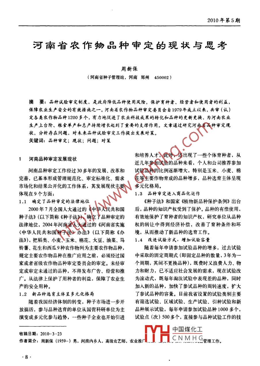2010年第5期河南省農(nóng)作物品種審定的現(xiàn)狀與思考.周新保(河南省種子管理站,河南鄭州450002 )摘要: 品種試驗(yàn)審定制度,是政府降低品種使用風(fēng)險,保護(hù)育種者、經(jīng)營者和使用者的利益,保障農(nóng)業(yè)生產(chǎn)安全的有效措施之一。河南省農(nóng)作物品種審定委員會自1979年成立以來,共審(認(rèn))定各類農(nóng)作物品種1200多個,有力地促進(jìn)了農(nóng)業(yè)科技成果的轉(zhuǎn)化和品種的更新更換,為河南農(nóng)業(yè)生產(chǎn)上臺階、糧食單產(chǎn)和總產(chǎn)持續(xù)增長起到了重要的支撐作用。文章通過研究河南省品種審定現(xiàn)狀,分析存在問題,對未來品種試驗(yàn)審定工作提出發(fā)展對策。關(guān)鍵詞:品種審定;現(xiàn)狀;問題;對策和培養(yǎng)人才,此外,還出現(xiàn)了一些個體育種者,從1河 南品種審定發(fā)展現(xiàn)狀近幾年參加試驗(yàn)的品種來看,個人和公司推薦參加河南品種審定工作經(jīng)過30多年的發(fā)展、改革和試驗(yàn)品種的比例逐漸增大,特別是玉米、小麥、棉完善,已基本形成管理規(guī)范化、審定標(biāo)準(zhǔn)化、需求花等主要作物育成的品種增多,品種選育主體呈現(xiàn)市場化和結(jié)果公開化的工作體系,其發(fā)展現(xiàn)狀主要.多元化格局。體現(xiàn)在9個方面:1.3 品種審定進(jìn)入商品化運(yùn)作1.1 確定了品種審定的法律地位《種子法》和國家《植物新品種保護(hù)條例》出臺2000年7月全國人大通過的《中華人民共和國后,品種的知識產(chǎn)權(quán)受到了保護(hù)。品種的有償使用,種子法》(以下簡稱《種子法》),確立了品種審定的有效地保護(hù)了育種者的知識產(chǎn)權(quán),研究單位從品種法律地位,2004 年河南省人大通過的《河南省實(shí)施權(quán)的轉(zhuǎn)讓中得到經(jīng)濟(jì)補(bǔ)償,改善了育種條件和環(huán)<中華人民共和國種子法>辦法》(以下簡稱《辦境,從而推動了新品種的選育工作。法》),把稻類、小麥、玉米、棉花、大豆、油菜.馬1.4改進(jìn)試驗(yàn)方式, 增加試驗(yàn)容量鈴薯、花生和西瓜9種農(nóng)作物列為主要農(nóng)作物品種,隨著每年申請參加試驗(yàn)品種的增多,過去試驗(yàn)規(guī)定主要農(nóng)作物品種在推廣應(yīng)用之前,必須經(jīng)過國中采取的固定周期式(即固定品種的數(shù)量, 3年為一家或者省級農(nóng)作物品種審定委員會的審定。未經(jīng)審個周期,其間不更換品種),既費(fèi)時又浪費(fèi)人力,物定或?qū)彾ㄎ赐ㄟ^的品種,不得發(fā)布廣告、經(jīng)營和推力和財力,已不適應(yīng)社會發(fā)展的需求,現(xiàn)在試驗(yàn)改廣。從法律上保護(hù)了用種者的利益,保障了農(nóng)業(yè)生為滾動式,既每年淘汰試驗(yàn)中表現(xiàn)差的品種,同時產(chǎn)的安全用種。加入新的品種,加快了參試品種的周轉(zhuǎn)速度,擴(kuò)大1.2 新品種選育主體呈多元化格局了參試品種的容量。目前我省設(shè)置的試驗(yàn)類別主要隨著我國經(jīng)濟(jì)體制的轉(zhuǎn)變,種子市場進(jìn)一步開有篩選試驗(yàn)、區(qū)域試驗(yàn)、生產(chǎn)試驗(yàn)、引種試驗(yàn)和新放搞活,參與品種選育的單位從國營科研單位為主品種展示試驗(yàn),每年申請參加試驗(yàn)品種1000多個,演變成多元化參與趨勢,-些種子企業(yè)也開始引進(jìn)試驗(yàn)點(diǎn)(次) 500多個,直接參與品種試驗(yàn)工作的技中國煤化工收稿日期: 2010-3-23作者簡介:周新保(1959-) 男,河南內(nèi)鄉(xiāng)人,高級農(nóng)藝師,農(nóng)業(yè)推廣,DYHCNMHG管理工作。.8..種業(yè)導(dǎo)刊術(shù)人員1600多人,試驗(yàn)體系十分龐大。辦法,2003年以來我省已經(jīng)陸續(xù)引進(jìn)了相鄰省份審1.5品種審定 步伐加快定的農(nóng)作物新品種176個,這些品種在生產(chǎn)上發(fā)揮河南省品種審定委員會自從1979年成立至2009著重要作用,如山東省農(nóng)科院培育的玉米品種魯單年,30年間共審定(引種)各種農(nóng)作物品種1244個,981,引進(jìn)以來在河南省推廣迅速,2006 年種植面其中從第1屆到第4屆20年時間審定品種439個,積居全省玉米品種第2位;西北農(nóng)大培育的優(yōu)質(zhì)小平均每年審定品種21.9個。2000年《種子法》頒布麥品種西農(nóng)979,因品質(zhì)優(yōu)良、綜合抗性好,引進(jìn)后.實(shí)施以后審定速度明顯加快,2000- -2009 年9年時推廣面積_上升很快,目前已成為河南省十大小麥品間共審定(引種)品種805個,平均每年審定(引種之一:在我省南部稻區(qū),生產(chǎn)上利用的水稻品種種) 89.4個, 是前4屆的4倍(表1)。80%以上來自省外引進(jìn)品種。1.9完善了品種退出機(jī)制表11979-2009 年河南省審定品種數(shù)量屆次起始時間審定(引種)年平均審定(引種)針對部分審定品種利用時間長、種性退化、抗逆性降低、產(chǎn)量下降等原因,以及近幾年審定但在,(年度)數(shù)量(個)第1屆1979-19836312.6推廣中發(fā)現(xiàn)存在重大缺陷、給生產(chǎn)造成損失的品種第2屆1984- 198979不宜繼續(xù)推廣的問題,2007 年河南省出臺了《農(nóng)作第3屆1990- 199415230.4物品種終止使用暫行辦法》,并于當(dāng)年終止使用了第4屆1995- 199914529.0第5屆2000- 200537374.6156個審定時間長、抗性退化、產(chǎn)量低的老品種,第6屆2006-2009432108.02009年又終止使用了84個老品種,這對加快我省合計(jì)1244品種更新更換速度.