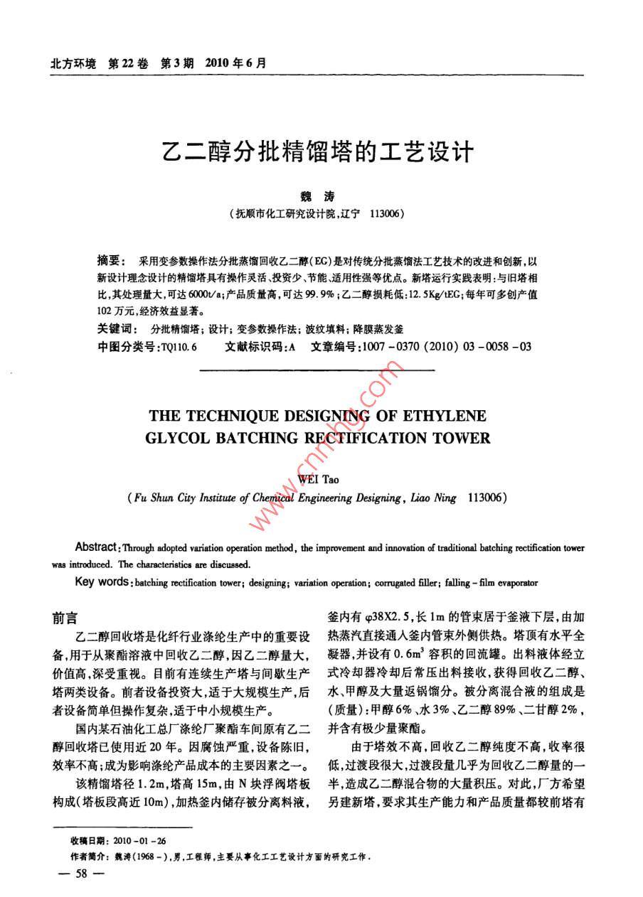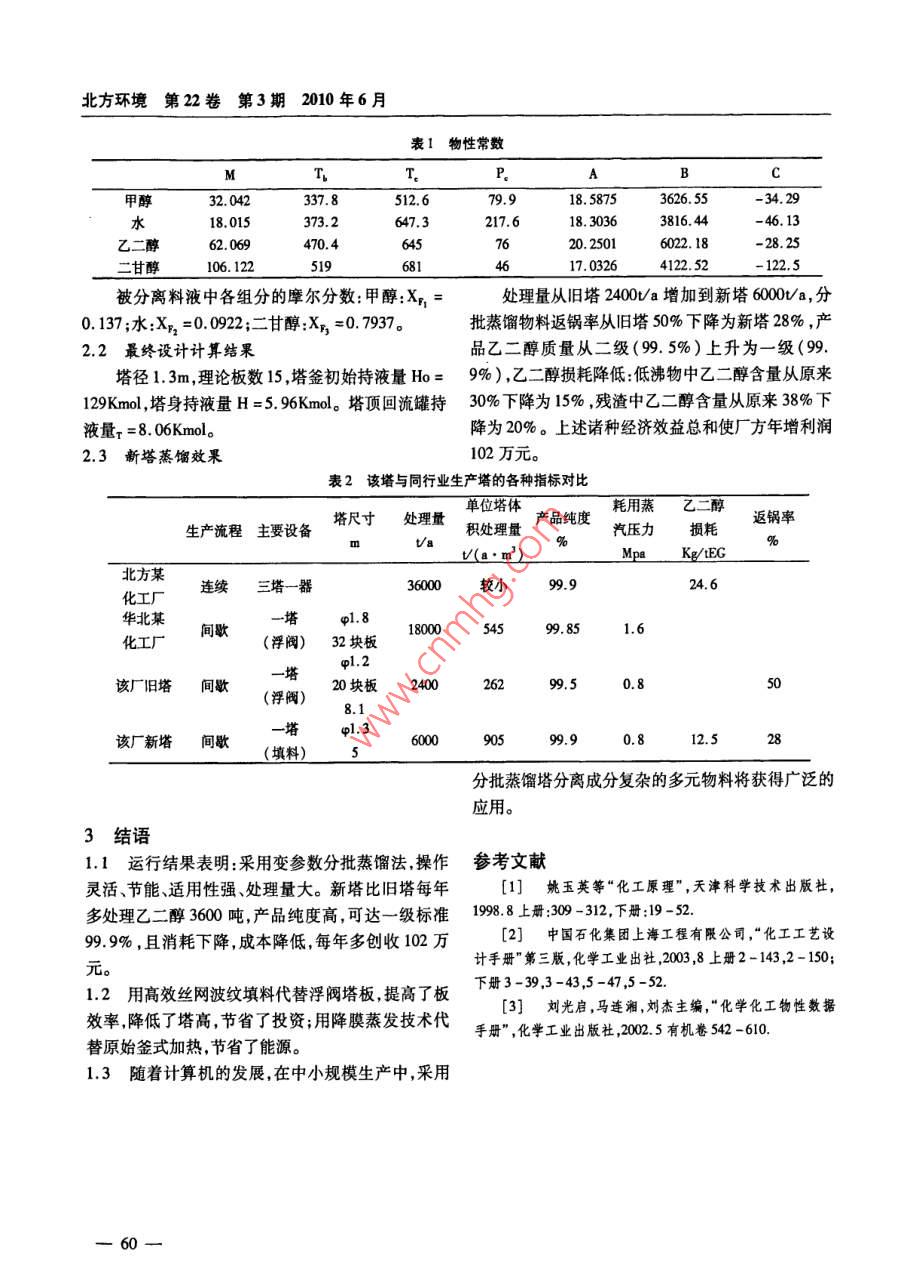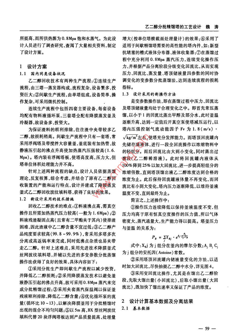 北方環(huán)境第22卷第3期2010年6月乙二醇分批精餾塔的工藝設(shè)計(jì)魏濤(撫順市化工研究設(shè)計(jì)院,遼寧113006)摘要:采用變參數(shù)操作法分批蒸餾回收乙二醇(E)是對(duì)傳統(tǒng)分批蒸餾法工藝技術(shù)的改進(jìn)和創(chuàng)新,以新設(shè)計(jì)理念設(shè)計(jì)的精餾塔具有操作靈活、投資少節(jié)能適用性強(qiáng)等優(yōu)點(diǎn)。新塔運(yùn)行實(shí)踐表明:與舊塔相比,其處理量大,可達(dá)6000ta;產(chǎn)品質(zhì)量高,可達(dá)9.9%;乙二醇損耗低:12.5g/tEG;每年可多創(chuàng)產(chǎn)值102萬元,經(jīng)濟(jì)效益顯著。關(guān)鍵詞:分批精餾塔;設(shè)計(jì);變參數(shù)操作法;波紋填料;降膜蒸發(fā)釜中圖分類號(hào):TQ110.6文獻(xiàn)標(biāo)識(shí)碼:A文章編號(hào):1007-0370(2010)03-0058-03 THE TECHNIQUE DESIGNING OF ETHYLENE GLYCOL BATCHING RECTIFICATION TOWER WEI Tac (Fu Shun City Institute of Chemical Engineering Designing, Liao Ning 113006) Abstract: Through adopted variation operation method, the improvement and innovation of traditional batching rectification tower was introduced. The characteristics are discussed. Key words batching rectification tower; designing; variation operation; corrugated filler; falling-film evaporator前言釜內(nèi)有q38X2.5,長1m的管束居于釜液下層,由加乙二醇回收塔是化纖行業(yè)滌綸生產(chǎn)中的重要設(shè)熱蒸汽直接通人釜內(nèi)管束外側(cè)供熱。塔頂有水平全備,用于從聚酯溶液中回收乙二醇,因乙二醇量大,凝器,并設(shè)有0.6m3容積的回流罐。出料液體經(jīng)立價(jià)值高,深受重視。目前有連續(xù)生產(chǎn)塔與間歇生產(chǎn)式冷卻器冷卻后常壓出料接收,獲得回收乙二醇、塔兩類設(shè)備。前者設(shè)備投資大,適于大規(guī)模生產(chǎn)后水、甲醇及大量返鍋餾分。被分離混合液的組成是者設(shè)備簡單但操作復(fù)雜,適于中小規(guī)模生產(chǎn)。(質(zhì)量):甲醇6%、水3%、乙二醇89%、二甘醇2%,國內(nèi)某石油化工總廠滌綸廠聚酯車間原有乙二并含有極少量聚酯。醇回收塔已使用近20年。因腐蝕嚴(yán)重,設(shè)備陳舊,由于塔效不高,回收乙二醇純度不高,收率很效率不高;成為影響滌綸產(chǎn)品成本的主要因素之一。低,過渡段很大,過渡段量幾乎為回收乙二醇量的一該精餾塔徑1.2m,塔高15m,由N塊浮閥塔板半,造成乙二醇混合物的大量積壓。對(duì)此,廠方希望構(gòu)成(塔板段高近10m),加熱釜內(nèi)儲(chǔ)存被分離料液,另建新塔,要求其生產(chǎn)能力和產(chǎn)品質(zhì)量都較前塔有收稿日期:2010-01-26作者簡介:魏濤(1968-),男,工程師,主要從事化工工藝設(shè)計(jì)方面的研究工作58乙二醇分批精餾塔的工藝設(shè)計(jì)魏濤所提高,而所供熱源為0.8Mpa飽和水蒸氣。為此設(shè)增大(按單位塔橫截面處理量計(jì))的效果;⑥采用了計(jì)人員進(jìn)行了調(diào)查研究,查閱了大量相關(guān)資料,定適用于間歇精餾塔需要的高性能的塔內(nèi)件,如新型了設(shè)計(jì)方案。抗堵塞的槽式液體分布器、液體收集器;⑦在蒸餾過程中充分利用0.8Mpa蒸汽壓力,連續(xù)變化操作壓1設(shè)計(jì)方案力,并根據(jù)產(chǎn)品分離階段分級(jí)變化回流比,從而實(shí)現(xiàn)1.1國內(nèi)同類設(shè)備狀況壓力、回流比、蒸發(fā)量、塔頂儲(chǔ)液量四參數(shù)的同時(shí)協(xié)乙二醇回收技術(shù)有兩種生產(chǎn)流程:①連續(xù)生產(chǎn)調(diào)變化的變參數(shù)分批蒸餾法,達(dá)到連續(xù)流程的損耗流程,由三塔一蒸發(fā)器構(gòu)成,流程復(fù)雜,設(shè)備繁多,投指標(biāo)。資巨大;②間歇生產(chǎn)流程,由單塔組成,設(shè)備簡單,1.3設(shè)計(jì)采用的新操作方法作復(fù)雜,可采用微機(jī)控制。是變參數(shù)操作法,即在蒸餾過程中壓力、回流比連續(xù)生產(chǎn)流程中包括四套主要設(shè)備,每套設(shè)備及塔頂儲(chǔ)液量均處于合理變化之中。即首先常壓蒸均配有物料液循環(huán)泵,三套塔全配有降膜蒸發(fā)釜及餾,以小于1的回流比蒸出甲醇及部分水,此時(shí)釜溫冷凝器,故設(shè)備多,投資大。逐漸升高,達(dá)到一定值后開真空泵使塔減壓運(yùn)行,以為保證渣料的順利排除,往往渣中夾帶較多乙塔內(nèi)壓強(qiáng)控制氣流動(dòng)能因子Fv為1.8(m/s)二醇,故損耗稍高。間歇生產(chǎn)流程中只有一套塔,?!蘫g/m左右,使塔充分發(fā)揮能力。而塔頂回流罐內(nèi)采用浮閥塔及帶攪拌大容量釜,釜底裝有加熱管先儲(chǔ)存滿液體,進(jìn)行一段全回流操作以濃縮物料中靜液壓引起的沸點(diǎn)升高使加熱蒸汽壓強(qiáng)較高(16.的輕組分。而后回流比由大到小變化,同時(shí)蒸出過Mpa)。塔內(nèi)裝有浮閥塔板,使塔高度高,壓力大但渡段(乙二醇稀溶液)。此時(shí)將回流罐內(nèi)液體從塔單位體積處理能力并不高。100%降到25%以加大回流比,進(jìn)一步提高輕組分的針對(duì)上述兩種流程的缺點(diǎn),設(shè)計(jì)人員依據(jù)蒸餾濃縮倍數(shù),直到塔頂餾出液乙二醇濃度達(dá)到合格的理論反復(fù)核算,綜合考慮,并結(jié)合了原有乙二醇回濃度為止。此后保持回流罐液體量不再變化,而回收裝置的產(chǎn)能和運(yùn)行特點(diǎn),設(shè)計(jì)并建成了降膜蒸發(fā)流比有小到大變化,塔內(nèi)壓力逐漸降低,以維持釜液釜式乙二醇回收波紋填料塔,獲得了良好的效果。溫度不變,直到最終為止。1.