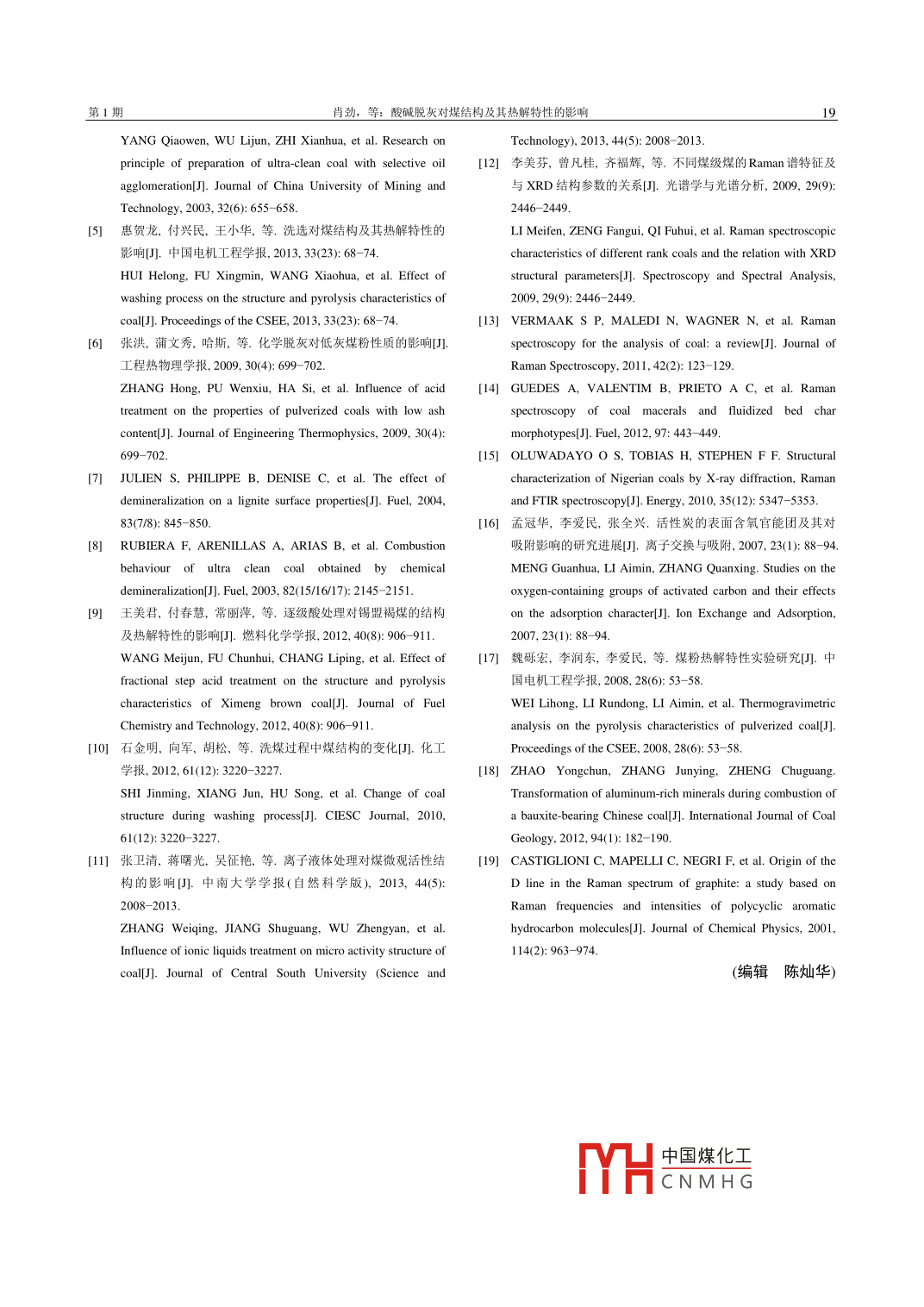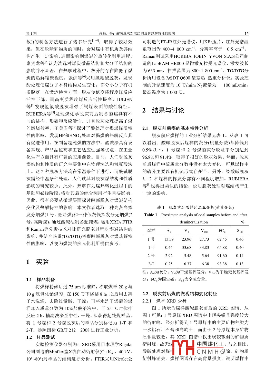 第47卷第1期中南大學(xué)學(xué)報(自然科學(xué)版)Vol 47 No2016年1月Journal of Central South University (Science and Technology)Jan 201DOl:10.11817is.1672-7207.2016.01.003酸堿脫灰對煤結(jié)構(gòu)及其熱解特性的影響肖勁,李發(fā)闖,鄧松云,仲奇凡,賴延清,李劼(中南大學(xué)冶金與環(huán)境學(xué)院,湖南長沙,410083)摘要:通過酸堿脫灰制備超純煤,運(yùn)用X線衍射(XRD)、拉曼光譜( Raman)、紅外光譜(FIR和熱重(GDrG)等分術(shù)硏究酸堿脫灰對煤結(jié)枃和熱解特性的影響。硏究結(jié)果表明:酸堿脫灰達(dá)到很好的脫灰效果,煤樣灰分質(zhì)量分?jǐn)?shù)降低到05%以下;脫灰處理破壞煤中碳微晶結(jié)枃,使煤中分亍結(jié)枃有序性減弱;脫灰煤中羥基和甲基、亞甲基脂肪烴類官能團(tuán)含量減少,Si-O-_Si和SiO基團(tuán)消失,酚、醚類含氧官能團(tuán)含量顯著增加;脫灰對低階煤的分子結(jié)構(gòu)影響較大:在熱解過程中,脫灰煤的初始分解溫度(、)和最大質(zhì)量損失溫度(mx)均向低溫區(qū)推移;灰分脫除降低傳質(zhì)傳熱的勢壘,有助于促進(jìn)熱解反應(yīng)關(guān)鍵詞:脫灰;結(jié)構(gòu);含氧基團(tuán);熱解特性中圖分類號:TK16獻(xiàn)標(biāo)志碼:A文章編號:1672-7207(201601-001406Influence of demineralization on structure andpyrolysis characteristics of coal with acid-alkali methodXIAO Jin, LI Fachuang, DENG Songyun, ZHONG Qifan, LAI Yanqing, LI Jiechool of Metallurgy and Environment, Central South University, Changsha 410083, China)Abstract: The ultra-clean coal was prepared by acid-alkali method, the influence of the demineralization on the structureand pyrolysis characteristics of coal were investigated comprehensively based on XRD, Raman spectroscopy, FTIR andTG/DTG tenologies. The results show that good effect of demineralization is achieved by acid-alkalid and that theash content of coal samples is reduced to below 0.5%. The molecular structure of the treated coal is destroyed anddisordered structure is increased. The contents of hydroxyl and aliphatic functional groups(methyl, methylene) decreasein the ultra-clean coal, the Sio--Si and SiO groups disappear, but the number of oxygen functional groups such asphenol and ether increase significantly. Furthermore, demineralization has greater effect on the molecular structure of thecoal with lower metamorphic degree. The barrier of mass and heat transfer is reduced by demineralization, thus the initialdecomposition temperature (ts)and the maximum mass loss temperature(tmax move to low temperature area, and thereaction is promoted during pyrolysisKey words: demineralization; structure; oxygen functional groups; pyrolysis characteristic煤長期以來主要用于民用和工業(yè)燃料,生產(chǎn)附加以減少石油消費(fèi)量,促進(jìn)環(huán)境保護(hù)。然而,煤炭中通值低,若用煤制備高附加值的煤基炭材料,則不僅有常含有一定量礦物質(zhì),這些礦物質(zhì)對煤的綜合利用有利于發(fā)揮煤炭資源優(yōu)勢,提高能源利用效率,而且可很大的限制。目前,人們對超純煤(灰分<1%(質(zhì)量分收稿日期:201501-10:修回日期:201503-08中國煤化工基金項目 Foundation iter):國家自然科學(xué)基金資助項目(51374253)( Project(51374253) supporHCNMH Gndation of Chin通信作者:肖勁,教授,博士生導(dǎo)師,從事輕金屬冶金及炭素材料研究: E-mail: changshaxiaojin@126com第1期。肖勁,等:酸堿脫灰對煤結(jié)構(gòu)及其熱解特性的影響數(shù))的制備方法進(jìn)行了諸多研究4,取得了較好效司制造的FTR紅外光譜儀,用KB壓片,紅外光譜波果,但在脫除礦物質(zhì)的同時,會對煤中有機(jī)質(zhì)及其結(jié)數(shù)范圍為400~4000cm,分辨率高于0.5cm構(gòu)產(chǎn)生一定影響,進(jìn)而影響到煤炭的熱轉(zhuǎn)化利用進(jìn)程。 Raman測試采用 HORIBA JOBⅠ N YVON S.A.S公司制惠賀龍等S認(rèn)為洗選對煤炭微晶結(jié)構(gòu)和大分子結(jié)構(gòu)的造的 LabRAM hr800顯微激光拉曼光譜儀,激發(fā)波長影響并不顯著,在熱解過程中,灰分的存在降低了煤為633m,掃描范圍為800-1800cml。 TG/DTG分炭的熱解縮聚程度。張洪等采用氫氟酸脫灰,發(fā)現(xiàn)析所用設(shè)備為SDTQ600型差熱-熱重分析儀,實驗控酸處理使煤分子本身結(jié)構(gòu)發(fā)生變化,部分小分子有機(jī)制的升溫速度為10℃/min,N2流量為100ml/min質(zhì)脫落,在燃燒特性方面,脫灰使低變質(zhì)程度煤反應(yīng)最高溫度為1000℃活性下降,而高變質(zhì)程度煤反應(yīng)活性提高。 JULIEN等發(fā)現(xiàn)氫氟酸脫灰增強(qiáng)了褐煤表面的酸性特征RUBIERA等發(fā)現(xiàn)煤化學(xué)脫灰前后制備的焦具有不2結(jié)果與討論同的結(jié)構(gòu)、形貌和反應(yīng)活性,并且脫灰處理提高了煤的燃燒效率。王美君等探討了酸處理對褐煤煤質(zhì)特2.1脫灰前后煤的基本特性分析性的影響,發(fā)現(xiàn)HF和HNO3處理對褐煤的熱解反應(yīng)具脫灰前后煤樣的工業(yè)分析結(jié)果見表1。從表1可有促進(jìn)作用。在制備超純煤的方法中,酸堿法具有設(shè)以看出:酸堿脫灰后煤樣的灰分(質(zhì)量分?jǐn)?shù))都降低到備常規(guī)、產(chǎn)品品位高和工藝適應(yīng)性強(qiáng)等優(yōu)點,在工業(yè)0.5%以下,1號煤和2號煤的灰分脫除率分別達(dá)到化生產(chǎn)方面具有廣闊的應(yīng)用前景。目前,人們對脫灰96.8%和914%,取得了很好的脫灰效果。然而,脫灰煤結(jié)構(gòu)和性質(zhì)的硏宄主要集中在物理洗選和氫氟酸法前后煤樣中硫質(zhì)量分?jǐn)?shù)并沒有太大變化,可見煤樣中