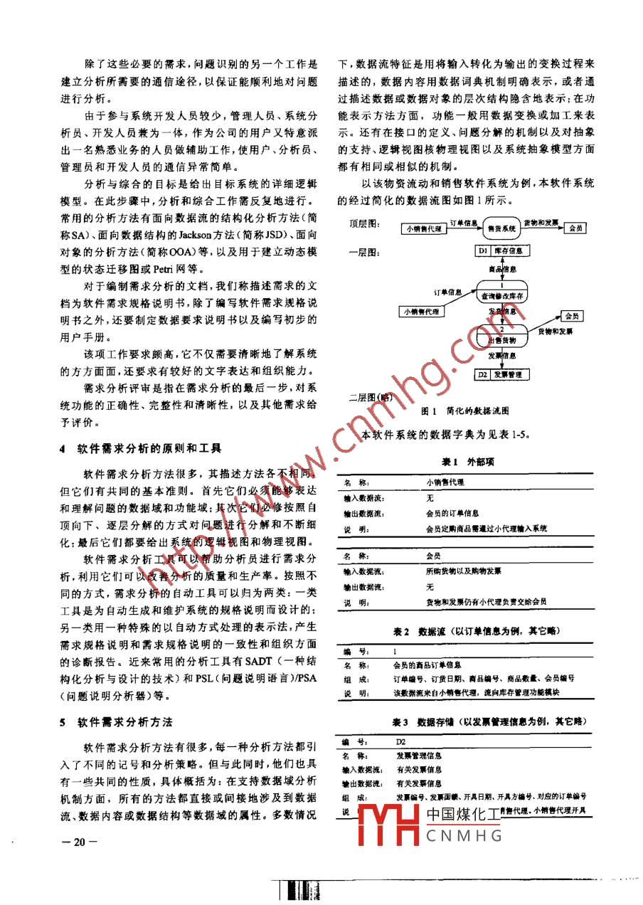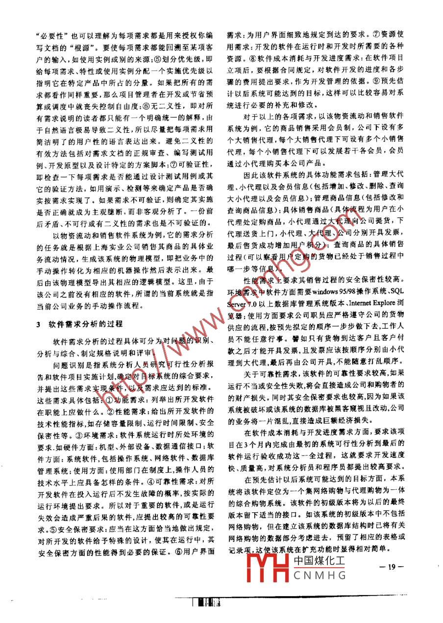 第23卷第8期計(jì)算機(jī)工程與設(shè)計(jì)2002年8月Vol.23 No. 8COMPUTER ENGINEERING AND DESIGNAug. 2002文章編號(hào)1000-7024(2002)08-0018-04中圈分類號(hào):TP311文獻(xiàn)標(biāo)識(shí)碼:A軟件需求分析的研究王繼成,高珍(同濟(jì)大學(xué)計(jì)算機(jī)科學(xué)與工程系,上海200092)摘要: 通過對物資管理系統(tǒng)的需求分析,說明了軟件需求分析的重要性,詳細(xì)闡述了軟件需求分析的任務(wù)、過程、原則和方法.關(guān)鍵詞:軟件需求;軟件工程;管理信息系統(tǒng)Research on software requirement analysisWANG Ji-cheng, GAO Zhcn(Dept. of Cormputer Science and Engineering, Tongji University, Shanghai 200092, China)Abstract: In this paper, an example about the material management requirement analysis will be used to show the importance ofsofware requirement analysis. Then the task, process, principle and methods of software requirement analysis are discused.Key words: software requirement; software egineering; MIS的限制和軟件同其他元素的接口細(xì)節(jié),定義軟件的其1引言他有效性要求。缺乏用戶參與、不完整的需求及不斷變更需求,需求分析的任務(wù)就是借助于當(dāng)前系統(tǒng)的邏輯模是導(dǎo)致信息技術(shù)項(xiàng)目不能按進(jìn)度安排和資金預(yù)算完型導(dǎo)出目標(biāo)系統(tǒng)的邏輯模型,解決目標(biāo)系統(tǒng)的“做什成全部功能的主要原因。許多軟件開發(fā)人員不能熟么”的問題。其實(shí)現(xiàn)步驟是:①獲得當(dāng)前系統(tǒng)的物理練地收集客戶需求,很多開發(fā)者并不知道實(shí)用的需求模型;②抽象出當(dāng)前系統(tǒng)的邏輯模型;③建立目標(biāo)系統(tǒng)工程技術(shù),工程參與者甚至連“需求”是什么也有不同的邏輯樸型。的看法。軟件開發(fā)中,信息溝通(交流)至少應(yīng)與計(jì)算優(yōu)秀需求應(yīng)具有如下特性:①完整性,即每一項(xiàng)占有同等的比重,然而現(xiàn)實(shí)往往強(qiáng)調(diào)了計(jì)算而忽略了需求都必須將所要實(shí)現(xiàn)的功能描述清楚,以使開發(fā)人信息溝通。員獲得設(shè)計(jì)和實(shí)現(xiàn)這些功能所需的所有必要信息;②在軟件工程中,軟件需求分析是軟件定義時(shí)期的正確性,即每一項(xiàng)需求都必須準(zhǔn)確地陳述其要開發(fā)出最后一個(gè)階段,它是軟件生存期中極其重要的一-步,的功能性。 判斷正確的參考是需求的來源,如客戶或需求分析的結(jié)果是整個(gè)軟件系統(tǒng)開發(fā)的基礎(chǔ),關(guān)系到高層的系統(tǒng)需求規(guī)格說明。若軟件需求與對應(yīng)的系工程的成敗和軟件產(chǎn)品的質(zhì)量,是軟件成敗的決定因統(tǒng)需求相抵觸則是不正確的。只有用戶代表才能確素之一。下面作者將結(jié)合一個(gè)具體的物資流動(dòng)和銷定用戶需求的正確性,這就是為何一定要有用戶的積售軟件系統(tǒng)的實(shí)例對軟件需求分析進(jìn)行詳細(xì)的研究。極參與的原因:⑧可行性,即每一項(xiàng)需求都必需是在已知系統(tǒng)和環(huán)境的權(quán)能和限制范圍內(nèi)可以實(shí)施的。為2軟件需求分 析的任務(wù)避免不可行的需求,最好在獲取需求(收集黹求)過程軟件需求分析的任務(wù)不是確定系統(tǒng)怎樣完成它中始終有一位軟件工程小組的組員與需求分析人員.的工作,而是確定系統(tǒng)必須完成哪些工作,也就是對或考慮市場的人員在一起工作,由他來負(fù)責(zé)技術(shù)可行目標(biāo)系統(tǒng)提出完整、準(zhǔn)確、清晰、具體的要求。它所做性上的檢查:④必要性,即每一項(xiàng)需求都應(yīng)把客戶真.的工作是深入描述軟件的功能和性能確定軟件設(shè)計(jì)正所需要的和最終系統(tǒng)所需遵從的標(biāo)準(zhǔn)記錄下來。收稿日期: 2001-08-28作者簡介:玉繼成(198-),男,江蘇人,博士,救報(bào).博士生導(dǎo)師, 主要研究中國煤化工等.- 18-TYHCNMHG“必要性”也可以理解為每項(xiàng)需求都是用來授權(quán)你編需求:為用戶界面細(xì)致地規(guī)定到達(dá)的要求。⑦資源使寫文檔的“根源”。要使每項(xiàng)需求都能回溯至某項(xiàng)客用需求:開發(fā)的軟件在運(yùn)行時(shí)和開發(fā)時(shí)所需要的各種.戶的輸入,如使用實(shí)例或別的來源:⑤劃分優(yōu)先級(jí),即資源。⑧軟件成本消耗與開發(fā)進(jìn)度需求:在軟件項(xiàng)目給每項(xiàng)需求、特性或使用實(shí)例分配一個(gè)實(shí)施優(yōu)先級(jí)以立項(xiàng)后,要根據(jù)合同規(guī)定,對軟件開發(fā)的進(jìn)度和各步指明它在特定產(chǎn)品中所占的分量。如果把所有的帶驟的費(fèi)用提出要求,作為開發(fā)管理的依據(jù)。⑨預(yù)先估求都看作同樣重要,那么項(xiàng)目管理者在開發(fā)或節(jié)省預(yù)計(jì)以后系統(tǒng)可能達(dá)到的目標(biāo),這樣可以比較容易對系算或調(diào)度中就喪失控制自由度:⑧無二義性,即對所統(tǒng)進(jìn)行必要的補(bǔ)充和修改。有需求說明的讀者都只能有一個(gè)明確統(tǒng)-的解釋,由對于以上的各項(xiàng)需求,以該物資流動(dòng)和銷售軟件于自然語言極易導(dǎo)致二義性,所以盡量把每項(xiàng)需求用系統(tǒng)為例,它的商品銷售采用會(huì)員制,公司下沒有多簡潔明了的用戶性的語言表達(dá)出來。避免二義性的個(gè)大銷售代理,每個(gè)大銷售代理下可設(shè)有多個(gè)小銷售有效方法包