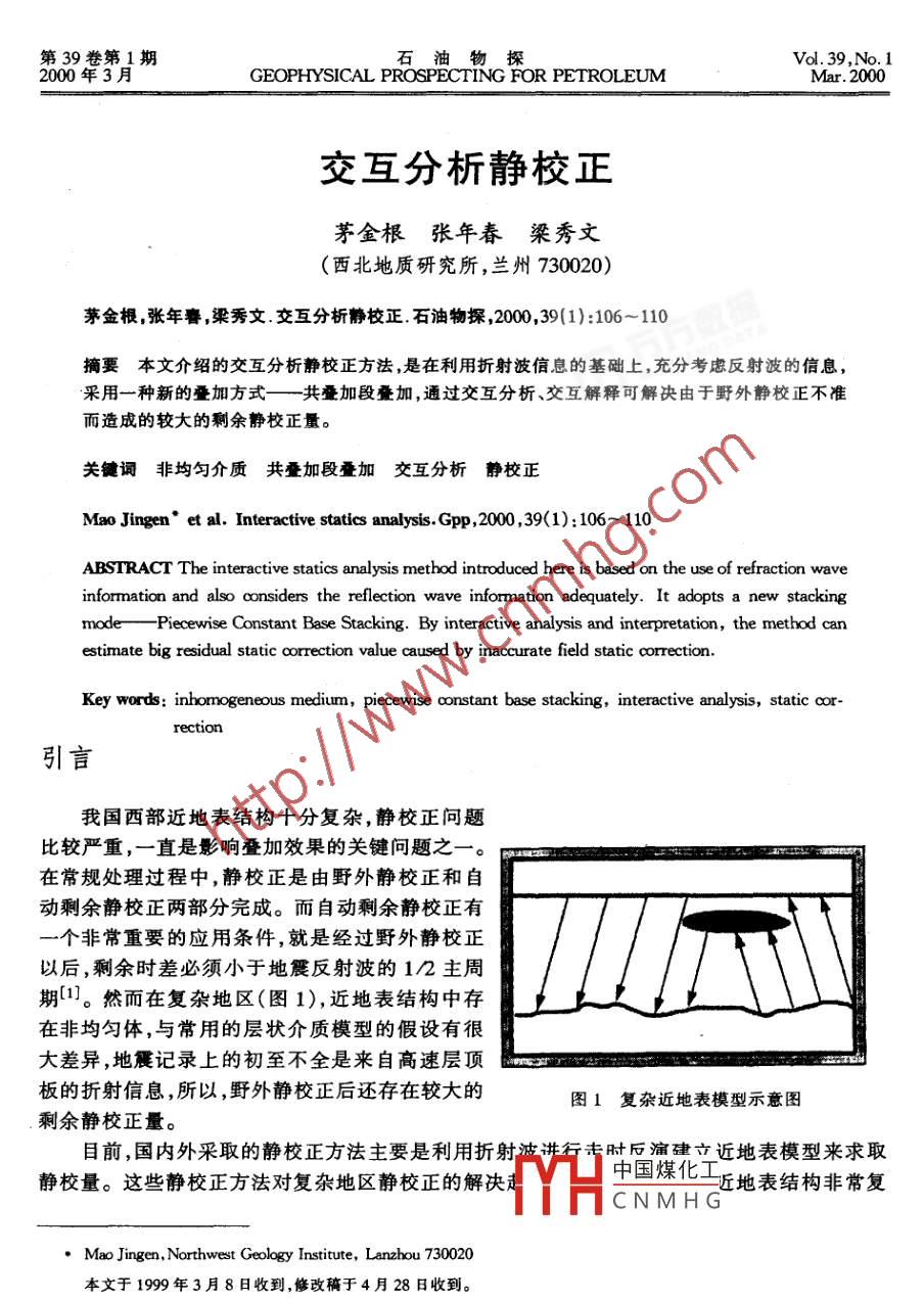 第39卷第1期石油物探__Vol. 39,No. 12000年3月GEOPHYSICAL PROSPECTING FOR PETROLEUMMar.2000交互分析靜校正茅金根張年春梁秀文(西北地質(zhì)研究所,蘭州730020)茅金根,張年春,梁秀文.交互分析靜校正.石油物探,2000,39(1):106~110摘要本文介紹的交互分析靜校正方法,是在利用折射波信息的基礎(chǔ)上,充分考慮反射波的信息,采用一種新的疊加方式一共疊加段疊加,通過交互分析、交互解釋可解決由于野外靜校正不準(zhǔn)而造成的較大的剩余靜校正量。關(guān)鍵詞非均勻介質(zhì) 共疊加段疊加交互分析 靜校正Mao Jingen* et al. Interactive statics analysis. Gpp,2000 ,39(1): 106~ 110ABSTRACT The interactive statics analysis method introduced here is based on the use of refraction waveinformnation and also considers the reflection wave information adequately. It adopts a new stackingmode Piecewise Constant Base Stacking. By interactive analysis and interpretation, the method canestimate big residual static oorrection value caused by inaccurate field static correction.Key words: inhomogeneous medium, piecewise o∞onstant base stacking, interactive analysis, static or-rection引言我國(guó)西部近地表結(jié)構(gòu)十分復(fù)雜,靜校正問題比較嚴(yán)重,一直是影響疊加效果的關(guān)鍵問題之一。在常規(guī)處理過程中,靜校正是由野外靜校正和自動(dòng)剩余靜校正兩部分完成。而自動(dòng)剩余靜校正有一個(gè)非常重要的應(yīng)用條件,就是經(jīng)過野外靜校正以后,剩余時(shí)差必須小于地震反射波的1/2主周期[1]。然而在復(fù)雜地區(qū)(圖1),近地表結(jié)構(gòu)中存在非均勻體,與常用的層狀介質(zhì)模型的假設(shè)有很大差異,地震記錄上的初至不全是來自高速層頂板的折射信息,所以,野外靜校正后還存在較大的圖1復(fù)雜近地表模型示意圖剩余靜校正量。目前,國(guó)內(nèi)外采取的靜校正方法主要是利用折射波講行專時(shí)后演建立近地表模型來求取靜校量。這些靜校正方法對(duì)復(fù)雜地區(qū)靜校正的解決中國(guó)煤化工近地表結(jié)構(gòu)非常復(fù)TYHCNMHG●Mao Jingen, Northwest Geology Institute, Lanzhou 730020本文于1999年3月8日收到,修改稿于4月28日收到。第1期交互分析靜校正107●雜的地區(qū),上述方法的效果往往不夠理想。本文討論的方法一-交互分析靜校正(ISA)在利用折射信息的基礎(chǔ)上,充分考慮反射波的信息,二者緊密結(jié)合。復(fù)雜地區(qū)靜校正應(yīng)該是由野外靜校正、ISA和自動(dòng)剩余靜校正三步來完成。1方法原理1.1數(shù)學(xué)基礎(chǔ)經(jīng)過野外靜校正后,地震記錄上的反射時(shí)間由4部分組成:地層的垂直反射時(shí)間、動(dòng)校正時(shí)差、炮點(diǎn)位置的剩余靜校正量、檢波點(diǎn)位置的剩余靜校正量??捎霉奖硎緸?T;=OT;+OT1+To+NMO1T;2=△T:+OT2+To+NMO2(1)T:v=OT;+OTn+To+NMON對(duì)(1)式進(jìn)行動(dòng)校正加權(quán)疊加得名T。=OT:+六2o;++7o(2)令T=Er。(3)OT =2s△T;(4)則(2)式可以簡(jiǎn)寫為T:=OT:+△T+To(5)其中,T;為道集在某- -時(shí)刻的反射時(shí)間,i為疊加序號(hào),j為疊加段序號(hào);OT;為疊加道位置的剩余靜校正量;△T;為疊加段位置的剩余靜校正量; T;為總記錄時(shí)間;OT為疊加段的平均剩余靜校正量;To為某層位的垂直反射時(shí)間;NMO;為動(dòng)校正時(shí)差。在(5)式中To是反映構(gòu)造本身的信息,當(dāng)?shù)叵聵?gòu)造變化不是非常劇烈時(shí),相鄰的疊加道上To變化對(duì)T;的影響可以忽略不記。下面分兩種情況討論疊加段內(nèi)的平均剩余靜校正OT對(duì)總記錄T;的影響。(1) OT≈0。通常我們認(rèn)為,經(jīng)過野外靜校正后,剩余靜校正量在各個(gè)位置上符合隨機(jī)分布,其加權(quán)平均后近似等于零[2],從(5)式不難看出,疊加剖面上相鄰兩道的時(shí)差就是疊加點(diǎn)上的剩余靜校正時(shí)差。分別進(jìn)行共炮點(diǎn)疊加、共檢波點(diǎn)疊加,就可以求出個(gè)別位置上較大的剩余靜校正量(即高頻剩余靜校正量)。中國(guó)煤化工(2) OT≠0。當(dāng)近地表結(jié)構(gòu)存在象圖1所示的較HCNMHG剩余靜校正在各個(gè)位置點(diǎn)上的分布就不是隨機(jī)的,在某---局部范圍內(nèi)或正或負(fù),這時(shí)按上述方法求取的靜校正量會(huì)帶來較大誤差。因?yàn)楫?dāng)OT≠0,在做共炮點(diǎn)、共檢波點(diǎn)疊加時(shí),疊加點(diǎn)變化,疊加段也變化,也就是說(5)式中前兩項(xiàng)都在變,所以在共疊加點(diǎn)疊加剖面上相鄰兩道的時(shí)差包括2個(gè)因石油物探39卷素的影響,無法提取共疊加點(diǎn)位置上的剩余靜校正量。那么能否采用另外一種疊加方式,以確保在一個(gè)相對(duì)小的范圍內(nèi)使(5)式中關(guān)于疊加段上的剩余靜校正量的平均值為一常數(shù)呢?答案是肯定的,共疊加段疊加能夠解決這一問題。因?yàn)樵谝粋€(gè)共疊加段疊加所形成的道集內(nèi),相鄰道的時(shí)差只反映出疊加點(diǎn)位置上的相對(duì)剩余靜校正量。1.2共疊加段疊加自從多次覆蓋技術(shù)發(fā)展以來,基于各種疊加方法來求取剩余靜校正量一直就被廣泛地采用,尤其以共炮點(diǎn)疊加(CSP)、共檢波點(diǎn)疊加(CRP)使用最多。這兩種方法有一定的假設(shè)條件,在某些情況下會(huì)帶來很大的誤差;而另外- -種疊加技術(shù)一即 共疊加段疊加(PCB),則不會(huì)帶來誤差。PCB是由CSP和CRP疊加所次生出來的一種疊加方式,其實(shí)質(zhì)是實(sh