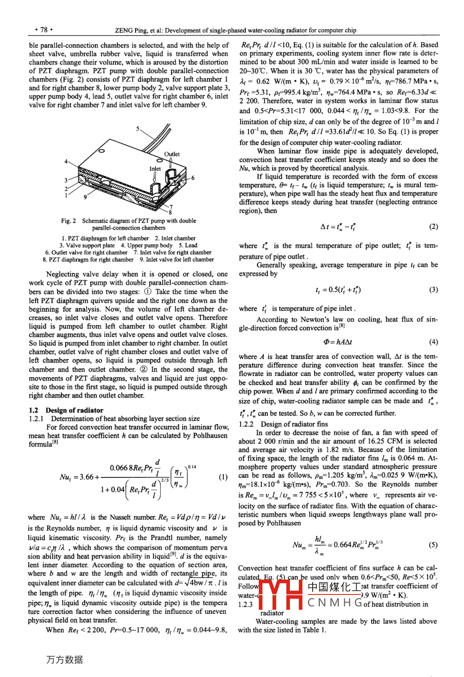 CHINESE JOURNAL OF MECHANICAL ENGINEERINGVol. 20,No. 2, 2007●77●ZENG PingDEVELOPMENT OF SINGLE-PHASEDCHENG GuangmingWATER-COOLING RADIATOR FOR,LIU JiulongCOMPUTER CHIP*YANG ZhigangCollege of Mechanical Engineeringand Automatizatin,Jilin University,Changchun 130022, ChinaSUN XiaofengAbstract: In order to cool computer chip ftciently with the least noise, a single phase water coolingradiator for computer chip driven by piezoelecric pump with two pall-onnection chambers isdeveloped. The structure and work principle of this radiator is described. Material, processing methodand Automatization,and design principles of whole radiator are also explained. Finite element analysis (FEA) software,Jlin University,ANSYS, is used to simulate the heat distibution in the radiator. Testing equipments for water-coolingradiator are also listed. By experimental tests, influences of flowrate inside the cooling system and fanon chip cooling are explicated. This water-cooling radiator is proved more efficient than curentDepartment of Mechetronics,air-cooling radiator with comparison experiments. During cooling the heater which simulates theJlin Institute of Chemical Technolgy,working of computer chip with different power, the water-cooling radiator needs shorter time to reachJjlin 132022, Chinalower steady temperatures than curent air-cooling radiator.Key words: Computer chip Water-cooling Piezoelecric pump Radiator ANSYS simulationSimulative heaterPENG TaijiangJilin UniversitvChangchun130022, Chinaselected as the material of radiator for its higher heat conduction0 INTRODUCTIONcoefficient and easy machining ability. Heat absorbing layer andThe computer size gets smaller and smaller from the firstheat emission layer are welded together with three pieces of pur-vacuum tube computer to the sixth NN computer, but its capabil-ple copper plates, and the middle one is machined by numericality and computing speed is continuously improved. In 1965, Dr.controlled line cutting machine to form pipeline. Thin purpleMoore predicted that transistors integrated in the molectron wouldcopper plate is welded between heat absorbing and emission layeras fins to strengthen heat transfer effect. Fan is installed on thebe doubled every 18 months, which called Moore law. But itback of radiator to blow cool air to it, and PZT pump is attachedcomes the bigger electricity consumption and greater heat emis-on the side of radiator to pump coolant in the system. After manysion. Heat resulted from improved electricity consumption willcomparison experiments, water is selected as the coolant becausedisable computer chip, even make the computer out of function.of its lower viscosity and higher specific heat.The bulk and quantity of transistors will be limited by heat trans-mission ability. Therefore, efficient heat emission method must bedeveloped in order to ensure chips in function!-l. At present,computer chip power has reached 60~75 W, and rotation speed ofthe fans used on P4 processors is beyond 4 000 r/min which pro-duce insufferable noise. However, by the end of 2005, the heatflux of chip with high performance expects to be 100 W/cm2,what's more, chips will become an uneven heat resource becauseof the decrease of chip core and improved integration. Heat emis-sion power of current air-cooling method has reached its limit, sonew ways to cool computer chip are badly neededb. Pumpedliquid cooling has been implemented in commercial laptop anddesktop computers, in many cases exploring novel electrokineticand electrohydrodynamic pumps'1 DESIGN OF WATER-COOLING RADIATORFig. 1 Structure of integrated water-cooling radiatorFor decreasing the bulk of water- cooling radiator and sim-1. Heat absorbing layer 2. Radiatorrfins3. Lateral planeplifying its usage, integrated radiator is developed which is driven4. Heat emiting layer 5. Radiator outlet/pump inlet6. Radiator inletpump outlet 7. Coolant pipeby piezoeletric (PZT) pump. Fig. 1 ilustrates the structure ofintegrated water-cooling radiator.This system consists of heat absorbing layer 1, radiator fins 1.中國煤化工2, lateral plane 3, heat emitting layer 4, radiator outlet/pump inletFof PZT actuators, which5, radiator inlet/pump outlet 6 and coolant pipe 7. Purple copperis is a kinHCNMHGgPZTdiaphragmastheactuator. Comparea witn raitional pumps, PZT pump is simple,small, light, lower power consuming, noiseless, immune to the●This proet is supported by National Hi-tech Research and Development disturbance of electromagnetism and its output flowrate can beProgram of China (863 Program, No. 2002AA404250) and National Natural controlled through adjusting the voltage or frequency of appliedScience Foundation of China (No. 50575093). Received April 26, 2006; reelectricity. In this water-cooling radiator, PZT pump with dou-ceived in revised form December 18, 2006; accepted December 25, 2006●78.ZENG Ping, et al: Development of single-phased water cooling radiator for computer chipble parallel-connection chambers is selected, and with the help ofRe,Pr d/l <10, Eq. (1) is suitable for the calculation of h. Basedsheet valve, umbrella rubber valve, liquid is transferred when on primary experiments, cooling system inner flow rate is deter-chambers change their volume, which is aroused by the distortion mined to be about 300 mL/min and water inside is learned to beof PZT diaphragm. PZT pump with double parallel-connection 20~30C. When it is 30 C, water has the physical parameters ofchambers (Fig.2) consists ofPZT diaphragm for left chamber1 i= 0.62 W(m. K), u,= 0.79X 106 m/s, ne 78.7 MPa.s,and for right chamber 8, lower pump body 2, valve support plate 3,Prp =5.31, ρ=995.4 kg/m?, nw=764.4 MPa.s, so Re-6.33d