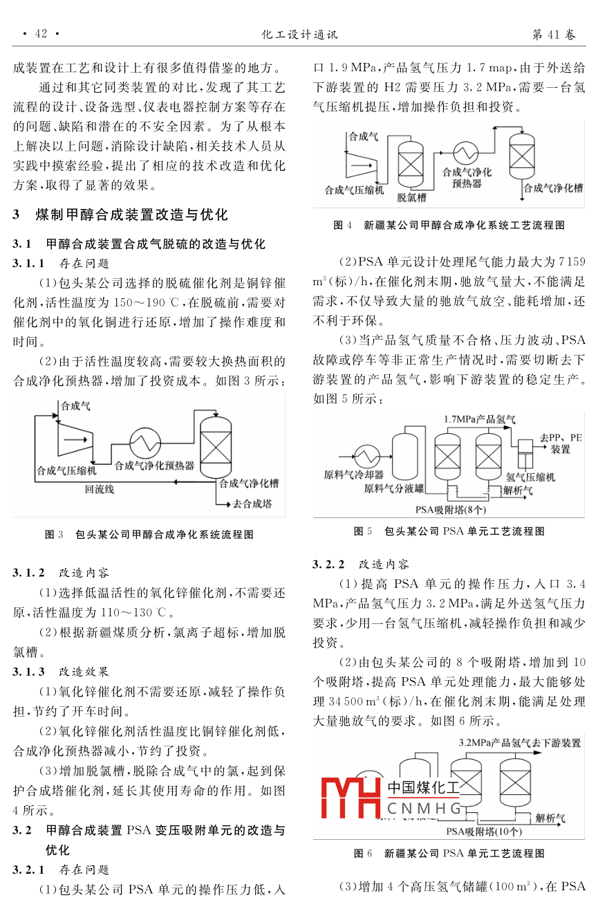 第41卷第1期化工設(shè)計通訊2015年2月Chemical Engineering Design Communications煤制甲醇合成裝置改造與優(yōu)化易洪民(中國神華煤制油化工有限公司新疆分公司,新疆烏魯木齊830019摘要:通過對比國內(nèi)同類型180萬t/h煤制甲醇合成裝置的工藝設(shè)計,分析其實際生產(chǎn)情況中出現(xiàn)的問題及產(chǎn)生的原因,提出相應(yīng)的技術(shù)改造和調(diào)整方案,對筆者所在公司甲醇合成裝置進行了改造和優(yōu)化,取得了顯著的效果關(guān)鍵詞:煤制甲醇合成裝置;合成;改造;優(yōu)化中圖分類號文獻標志碼:A文章編號:1003-6490(2015)01-0041-04Improvement and Optimization of Coal to methanol Synthesis PlantYI Hong-minChina shenhua coal oil chemical Co, Ltd. Xinjiang branch urumqi, Xinjiang)Abstract: By comparison of technological design in domestic other 1 800 000 t/a coal tsynthesis pants, it analyzes the reasons of the problems in the production. It also puts forward thetechnological transformation and corresponding adjustment programs.Key words: coal-to-methanol plant; gasification; synthesis; transform; optimization1項目裝置簡介son Matthey)的甲醇合成催化劑來生產(chǎn)MTO級甲醇。該技術(shù)具有合成氣轉(zhuǎn)化率高(99%)、原料國內(nèi)某新建180萬t/a煤制甲醇項目為目前消耗低、系統(tǒng)壓降小、能耗利用合理、流程簡練、控全球最大規(guī)模煤制甲醇裝置之一,該項目計劃于制簡單、三廢排放少等特點,其流程采用雙反應(yīng)器016年5月底開始投料試車,7月初生產(chǎn)出合格串并聯(lián)的方式,如圖2所示甲醇產(chǎn)品。該煤制甲醇裝置主要由空分裝置、氣蒸汽蒸汽化裝置、凈化硫回收裝置、甲醇合成裝置4個裝置泡包組成。煤制甲醇項目流程示意圖如圖1所示汽包排污原料煤化粗煤氣鍋爐馳放氣凈化氫回收尾氣進燃料10氣管網(wǎng)給水3閃蒸氣氧氣氫氣送其他裝置新鮮氣馳放氣粗甲醇至穩(wěn)定塔爭化氫氣硫硫園收人氣體甲醇合成}甲那罐區(qū)圖2甲醇合成流程示意圖1、2一合成塔;3、4一合成汽包;5一鍋爐給水預(yù)熱器;6、7一空冷器;8一循環(huán)氣壓縮機;9、10一水冷器;1甲醇分離器圖1煤制甲醇項目流程示意圖13一閃蒸槽;14、15—中間換熱器本文主要討論甲醇合成裝置的改造與優(yōu)化2煤制甲醇裝置運行情況甲醇合成裝置采用英國Davy工藝技術(shù)有限同180萬t/a煤制甲醇裝公司( Davy Process Technology,簡稱DPT公司)中國煤化工的甲醇合成工藝技術(shù)及英國莊信萬豐公司(JohnCNMHG·現(xiàn)國內(nèi)已有成功運a裝置,因此煤制甲醇合收稿日期:2014-11-07作者簡介:易洪民(1986-),男,漢族,重慶市人,助理工程師,主要從事煤制甲醇生產(chǎn)技術(shù)工作化工設(shè)計通訊第41卷成裝置在工藝和設(shè)計上有很多值得借鑒的地方口1.9MPa,產(chǎn)品氫氣壓力1.7map,由于外送給通過和其它同類裝置的對比,發(fā)現(xiàn)了其工藝下游裝置的H2需要壓力3.2MPa,需要一臺氫流程的設(shè)計、設(shè)備選型、儀表電器控制方案等存在氣壓縮機提壓,增加操作負擔和投資。的問題、缺陷和潛在的不安全因素。為了從根本合成氣上解決以上問題,消除設(shè)計缺陷,相關(guān)技術(shù)人員從實踐中摸索經(jīng)驗,提出了相應(yīng)的技術(shù)改造和優(yōu)化合成氣凈化方案,取得了顯著的效果合成氣壓縮預(yù)熱器合成氣凈化槽脫氯槽3煤制甲醇合成裝置改造與優(yōu)化圖4新疆某公司甲醇合成凈化系統(tǒng)工藝流程圖3.1甲醇合成裝置合成氣脫硫的改造與優(yōu)化3.1.1存在問題(2)PSA單元設(shè)計處理尾氣能力最大為7159(1)包頭某公司選擇的脫硫催化劑是銅鋅催m(標)h,在催化劑末期,馳放氣量大,不能滿足化劑,活性溫度為150~190℃,在脫硫前,需要對需求,不僅導(dǎo)致大量的馳放氣放空、能耗增加,還催化劑中的氧化銅進行還原,增加了操作難度和不利于環(huán)保。時間(3)當產(chǎn)品氫氣質(zhì)量不合格、壓力波動、PSA(2)由于活性溫度較高,需要較大換熱面積的故障或停車等非正常生產(chǎn)情況時,需要切斷去下合成凈化預(yù)熱器,增加了投資成本。如圖3所示:游裝置的產(chǎn)品氫氣,影響下游裝置的穩(wěn)定生產(chǎn)。合成氣如圖5所示17MPa產(chǎn)品氫氣去PP、PE裝置合成氣壓縮機一合成氣凈化預(yù)熱器原料氣冷卻器氣壓縮機回流線合成氣凈化槽原料氣分液罐↓解析氣去合成塔PSA吸附塔(8個)圖3包頭某公司甲醇合成凈化系統(tǒng)流程圖圖5包頭某公司PSA單元工藝流程圖3.1.2改造內(nèi)容3.2.2改造內(nèi)容(1)選擇低溫活性的氧化鋅催化劑,不需要還(1)提高PSA單元的操作壓力,入口3.4原,活性溫度為110~130C。MPa,產(chǎn)品氫氣壓力3.2MPa,滿足外送氫氣壓力(②)根據(jù)新疆煤質(zhì)分析,氯離子超標,增加脫要求,少用一臺氫氣壓縮機,減輕操作負擔和減少氯槽。投資。(2)由包頭某公司的8個吸附塔,增加到103.1.3改造效果個吸附塔,提高PSA單元處理能力,最大能夠處(1)氧化鋅催化劑不需要還原,減輕了操作負理34500m(標)/h,在催化劑末期,能滿足處理擔,節(jié)約了開車時間大量馳放氣的要求。如圖6所示。(2)氧化鋅催化劑活性溫度比銅鋅催化劑低合成凈化預(yù)熱器減小,節(jié)約了投資。32MPa產(chǎn)品氫氣去下游裝置(3)增加脫氯槽.脫除合成氣中的氯,起到保護合成塔催化劑,延長其使用壽命的作用。如圖所示。H中國煤化工CNMHG解析氣3.2甲醇合成裝置PSA變壓吸附單元的改造與PSA吸附塔(10個)優(yōu)化圖6新