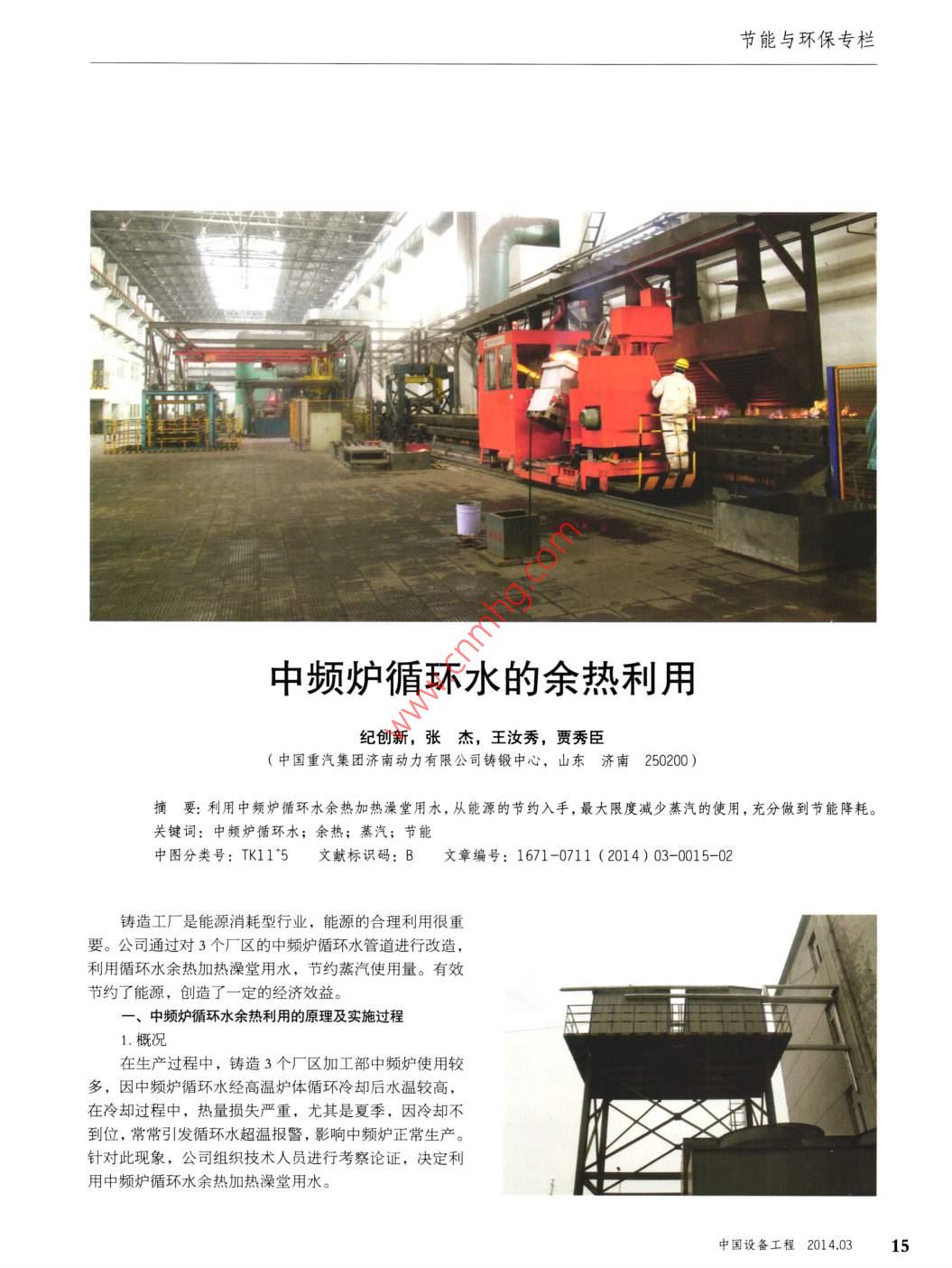 節(jié)能與環(huán)保專欄中頻爐循環(huán)水的余熱利用紀(jì)創(chuàng)新,張杰,王汝秀,賈秀臣(中國重汽集團(tuán)濟(jì)南動(dòng)力有限公司鑄鍛中心,山東濟(jì)南250200)摘要:利用中頻爐循環(huán)水余熱加熱澡堂用水,從能源的節(jié)約入手,最大限度減少蒸汽的使用,充分做到節(jié)能降耗關(guān)鍵詞:中頻爐循環(huán)水;余熱;蒸汽;節(jié)能中圖分類號:TK115文獻(xiàn)標(biāo)識碼:B文章編號:1671-0711(2014)03-0015-02鑄造工廠是能源消耗型行業(yè),能源的合理利用很重要。公司通過對3個(gè)廠區(qū)的中頻爐循環(huán)水管道進(jìn)行改造利用循環(huán)水余熱加熱澡堂用水,節(jié)約蒸汽使用量。有效節(jié)約了能源,創(chuàng)造了一定的經(jīng)濟(jì)效益中頻爐循環(huán)水余熱利用的原理及實(shí)施過程概況在生產(chǎn)過程中,鑄造3個(gè)廠區(qū)加工部中頻爐使用較多,因中頻爐循環(huán)水經(jīng)高溫爐體循環(huán)冷卻后水溫較高,在冷卻過程中,熱量損失嚴(yán)重,尤其是夏季,因冷卻不到位,常常引發(fā)循環(huán)水超溫報(bào)警,影響中頻爐正常生產(chǎn)。針對此現(xiàn)象,公司組織技術(shù)人員進(jìn)行考察論證,決定利用中頻爐循環(huán)水余熱加熱澡堂用水。中國設(shè)備工程2014.0315節(jié)能與環(huán)保專欄2改造方案3.雙螺紋管換熱器的優(yōu)點(diǎn)在電爐循環(huán)水出水管道處與中頻爐冷卻塔之間并雙螺紋管是根據(jù)用戶不同的循環(huán)水量,設(shè)計(jì)換熱管接一條管道,用閥門控制水量,此管接λ雙紋管換熱器螺旋線的螺距及螺紋的深度,扎制而成的螺旋換熱管件。與自來水換熱后返回電爐循環(huán)水道,加熱后的自來水直利用流體在特制螺旋槽管內(nèi)以一定流速旋轉(zhuǎn)流動(dòng),達(dá)到接引至澡堂水箱,在澡堂水箱進(jìn)水口增加溫度顯示裝湍流狀態(tài),管壁附近的流速增加,橫向沖刷管壁,使水置,值班人員可以隨時(shí)調(diào)節(jié)澡堂水溫。新增加的換熱水垢附著不到管壁上;該換熱管是用特殊工藝制作的換熱與原澡堂加熱水共存,以便于根據(jù)季節(jié)狀況隨時(shí)調(diào)節(jié)水元件,本身有熱脹冷縮的適應(yīng)能力,收縮和膨脹還能起溫(圖1)。到自潔的作用;該換熱管在正常運(yùn)行時(shí),由于螺旋作用,會(huì)產(chǎn)生固定范圍高頻顫動(dòng),外加使介質(zhì)中的雜質(zhì)處于懸浮狀熱水態(tài),也是使管壁不會(huì)積垢的高位水箱重要因素。電爐由于換熱管由特制螺旋冷卻塔槽組成,蒸汽在傳熱面冷凝體冷卻水水水換熱器堂!后所形成的水膜,迅速在螺用旋槽內(nèi)形成水滴,通過換熱管的高頻顫動(dòng),水滴被快速溫度表拋出,以清潔傳熱面,保持系統(tǒng)高效運(yùn)行。該產(chǎn)品的傳自來水熱系數(shù)約為汽一水6000~7000kcal/m2·h·℃、水一水4000~5000kcal/m2h·℃不銹鋼換熱管與管板的連接采用的是先焊接后脹接的加接方式,杜絕了循環(huán)水的泄漏條件。由于該換熱器不易結(jié)水垢,能長期保持高效率運(yùn)行,節(jié)能效果顯著。據(jù)統(tǒng)計(jì),該換熱器比等離子改性體換熱器換熱效率提高1~3倍,是實(shí)施改造的理想產(chǎn)品。4項(xiàng)目實(shí)施過程(1)在電爐循環(huán)水冷卻塔旁增加水箱及換熱器1臺。(2)在中頻爐循環(huán)水出水口增設(shè)管道及旁路,把循環(huán)水引至換熱器。增加旁路的目的是當(dāng)換熱器出現(xiàn)故障時(shí),可以隨時(shí)關(guān)掉閥門,不影響原來設(shè)備的使用。(3)架設(shè)管道,把換熱器換熱的水經(jīng)過管道引至澡堂,與原有方式供水協(xié)同調(diào)控水溫。(4)中頻爐降溫循環(huán)水出口溫度50℃左右,經(jīng)換熱后的水溫應(yīng)在40℃左右,能夠保證3個(gè)廠區(qū)4~10月洗澡用水,其余時(shí)間可進(jìn)行冬季澡堂用水的預(yù)加熱。、效益分析改造后,對3個(gè)廠區(qū)的電爐循環(huán)水余熱加熱系統(tǒng)進(jìn)行了跟蹤調(diào)查,效果良好,尤其是在夏季,可大大減少蒸汽費(fèi)用的支出,節(jié)能降耗。據(jù)2012年統(tǒng)計(jì),平均每月可節(jié)約蒸汽250t,蒸汽價(jià)格為200元/t,年可節(jié)約蒸汽費(fèi)用約60萬元。同時(shí)對3臺中頻爐的循環(huán)水溫度進(jìn)行檢測,冷卻效果良好,夏季設(shè)備基本無報(bào)警現(xiàn)象,保證了正常生產(chǎn)。(收稿日期:2013-12-19)6中國設(shè)備工程2014.03