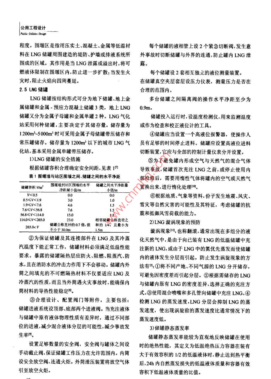 |公用工程設(shè)計(jì)| Publie lilier Duien程度。圍堰區(qū)是指用壓實(shí)土、混凝土、金屬等低溫材每個(gè)儲(chǔ)罐的液相管上設(shè)2個(gè)緊急切斷閥,發(fā)生意料在LNG儲(chǔ)罐周圍建造的堤防、護(hù)墻或排液系統(tǒng)所外事故時(shí)切斷儲(chǔ)罐與外界的連通,防止罐內(nèi)LNG泄圍成的區(qū)域。其作用是當(dāng)LNG泄露或溢出時(shí),將可燃液體限制在圍堰區(qū)內(nèi),防止進(jìn)一-步擴(kuò) 散;當(dāng)發(fā)生火每個(gè)儲(chǔ)罐設(shè)2套相互獨(dú)立的液位測(cè)量裝置。災(zāi)時(shí),阻止火焰向四周蔓延。在儲(chǔ)罐真空夾層套層設(shè)壓力儀表,測(cè)量壓力是否在2.5LNG儲(chǔ)罐合理的范圍內(nèi)。LNG儲(chǔ)罐按結(jié)構(gòu)形式可分為地下儲(chǔ)罐、地上金多臺(tái)儲(chǔ)罐之間隔離閥的操作水平凈距至少為屬儲(chǔ)罐和金屬-預(yù)應(yīng)力混凝土儲(chǔ)罐3類,地上LNG0.9m.儲(chǔ)罐又分為金屬子母罐和金屬單罐2種。LNG氣化儲(chǔ)罐投入運(yùn)行時(shí),設(shè)溫度檢測(cè)儀,用來監(jiān)測(cè)溫度站采用何種儲(chǔ)罐,主要決定于其儲(chǔ)存量。儲(chǔ)存量為或作為檢查和校正液位計(jì)的工具。1200m^~5000m2時(shí)可采用金屬子母儲(chǔ)罐帶壓儲(chǔ)存和④儲(chǔ)罐應(yīng)當(dāng)設(shè)置一一個(gè)高液位報(bào)警器,使操作人常壓罐儲(chǔ)存。儲(chǔ)存量為1200m'以下的城市LNG氣員有足夠的時(shí)間停止進(jìn)料。儲(chǔ)罐應(yīng)設(shè)置高液位進(jìn)料化站,基本采用金屬單罐帶壓儲(chǔ)存。切斷裝置,它應(yīng)與全部的控制計(jì)量?jī)x表分開設(shè)置。1)LNG儲(chǔ)罐的安全措施⑤為了避免罐內(nèi)形成空氣與天然氣的混合氣體根據(jù)儲(chǔ)罐容積合理確定安全間距,見表1四導(dǎo)致事故,儲(chǔ)罐首次充注LNG之前,或停止使用內(nèi)表1圍堰墻與站區(qū)圍墻之間、儲(chǔ)罐之間的水平凈距部檢修后,需要用惰性氣體將罐內(nèi)的空氣或天然氣儲(chǔ)罐容積VIm'園堰墻到站區(qū)圍墻的水平儲(chǔ)罐之間水平凈距最置換出來,進(jìn)行情化處理響。凈距最小值/m小值/m0.0⑥根據(jù)地質(zhì)、氣象等資料,份子發(fā)生地震、風(fēng)災(zāi)、0.5≤V<193.0.01.9≤V<7.64.6.5雪災(zāi)等自然災(zāi)害的可能性及其特征,考慮儲(chǔ)罐的抗7.6≤V<56.87.656.8≤V<114.015.0震和抵御風(fēng)雪荷載的能力。114.0≤V<265.0儲(chǔ)罐公稱直徑的0.7倍,但和的 14,且最小為23.0相鄰儲(chǔ)罐公稱直徑之2)LNG漩渦現(xiàn)象的預(yù)防265.0k v不小于30.0m1.5m漩渦現(xiàn)象叫,也稱翻滾,通常出現(xiàn)在多組分的液②為保證儲(chǔ)罐及其連接部件在LNG及其冷蒸化天然氣中,是由于向已裝有LNG的低溫儲(chǔ)罐中充汽溫度下能正常工作,儲(chǔ)罐材料必須滿足低溫性能注新的LNG,或由于LNG中的氮優(yōu)先蒸發(fā)而使儲(chǔ)罐要求。暴露的儲(chǔ)罐隔熱層應(yīng)防火、阻燃、阻蒸汽、防內(nèi)的液體發(fā)生分層而引起。防止發(fā)生渦旋現(xiàn)象的方水,且在消防水的沖擊力作用下不會(huì)移動(dòng)。儲(chǔ)罐內(nèi)外法有":①將不同產(chǎn)地、不同氣源的LNG分開儲(chǔ)存,簡(jiǎn)之間填充的不可燃隔熱材料不僅要適應(yīng)LNG及可避免因密度差而引起分層。②根據(jù)需儲(chǔ)存的LNG冷蒸汽的性質(zhì),而且當(dāng)外簡(jiǎn)遇火災(zāi)事故時(shí),能確保內(nèi)與儲(chǔ)罐內(nèi)原有LNG的密度差異,選擇正確的充注方筒材料的導(dǎo)熱性能穩(wěn)定圈。式.③使用混合噴嘴和多孔管向儲(chǔ)罐中充注LNG.④③合理設(shè)計(jì)、配置閥門等附件,主要包括:檢測(cè)LNG的蒸發(fā)速度,LNG分層會(huì)抑制LNG的蒸儲(chǔ)罐進(jìn)液系統(tǒng)設(shè)頂部、底部?jī)蓚€(gè)進(jìn)液閥。當(dāng)充注液體發(fā)速度,使出現(xiàn)渦旋前的蒸發(fā)速度比通常情況下的與儲(chǔ)罐中原有液體物理性質(zhì)有差異時(shí),通過不同部蒸發(fā)速度低。位的進(jìn)液,減少混合液體分層的可能性,減少事故發(fā)3)儲(chǔ)罐靜態(tài)蒸發(fā)率生率明。儲(chǔ)罐靜態(tài)蒸發(fā)率能較為直觀地反映儲(chǔ)罐在使用設(shè)置足夠數(shù)量的安全閥,安全閥與罐體之間設(shè)時(shí)的絕熱性能,其定義為低溫絕熱壓力容器在裝有手動(dòng)截止閥,保證儲(chǔ)罐工作壓力在允許范圍內(nèi)。內(nèi)簡(jiǎn)大于有效容積的1/2的低溫液體時(shí),靜止達(dá)到熱平衡設(shè)安全放空閥,連通火炬。外簡(jiǎn)泄壓裝置將放空氣體后,24h內(nèi)自然蒸發(fā)損失的低溫液體質(zhì)量和容器有效引至放空火炬。容積下低溫液體質(zhì)量的比值。公用工程設(shè)計(jì)Puble Unies Deirn國家現(xiàn)行標(biāo)準(zhǔn)中沒有給出LNG儲(chǔ)罐蒸發(fā)率的的隔熱要求,還應(yīng)特別注意因低溫引起的熱應(yīng)力、防上限標(biāo)準(zhǔn),設(shè)計(jì)時(shí)可以參考液氮的標(biāo)準(zhǔn)。止水蒸氣滲漏、避免出現(xiàn)冷凝和結(jié)冰、管道泄露的探2.6氣化器測(cè)方法以及防火等問題。LNG管道和其他低溫液體美國標(biāo)準(zhǔn)NFPA59A[7]將氣化器分為加熱氣化輸送管道一樣,管道的熱補(bǔ)償是一一個(gè)需要細(xì)心考忠器、環(huán)境氣化器和工藝氣化器3類。氣化器安全設(shè)計(jì)的重要問題。主要有以下2方面內(nèi)容:2.8氣化站的消防1)保證安全間距消防系統(tǒng)的安全設(shè)計(jì)原