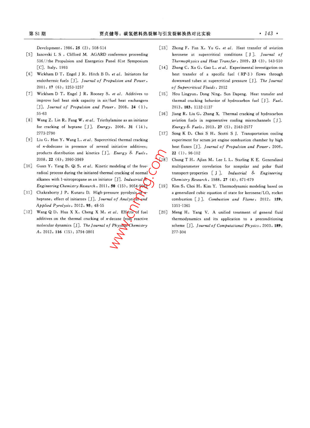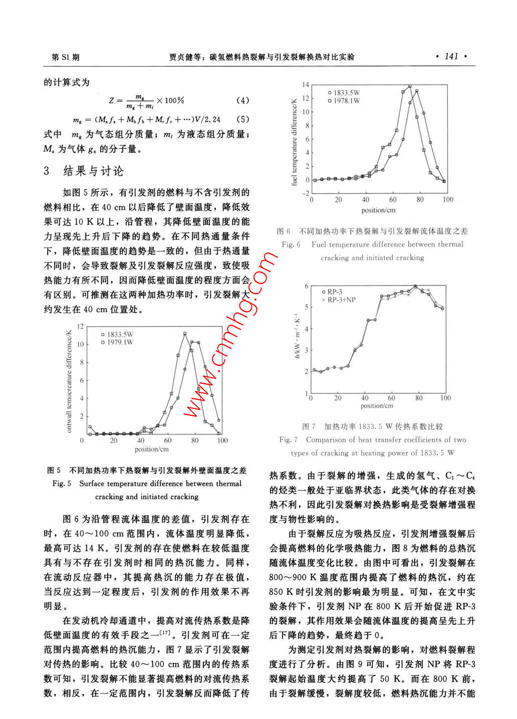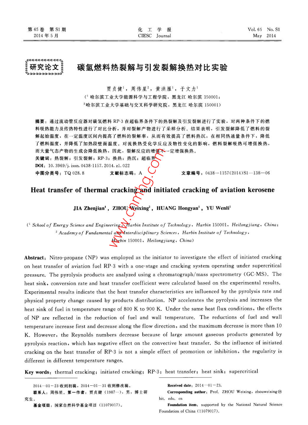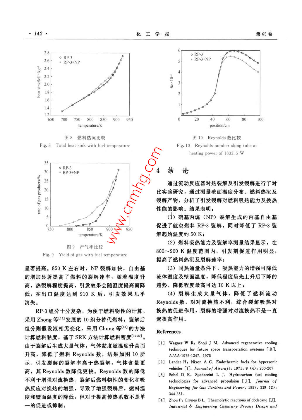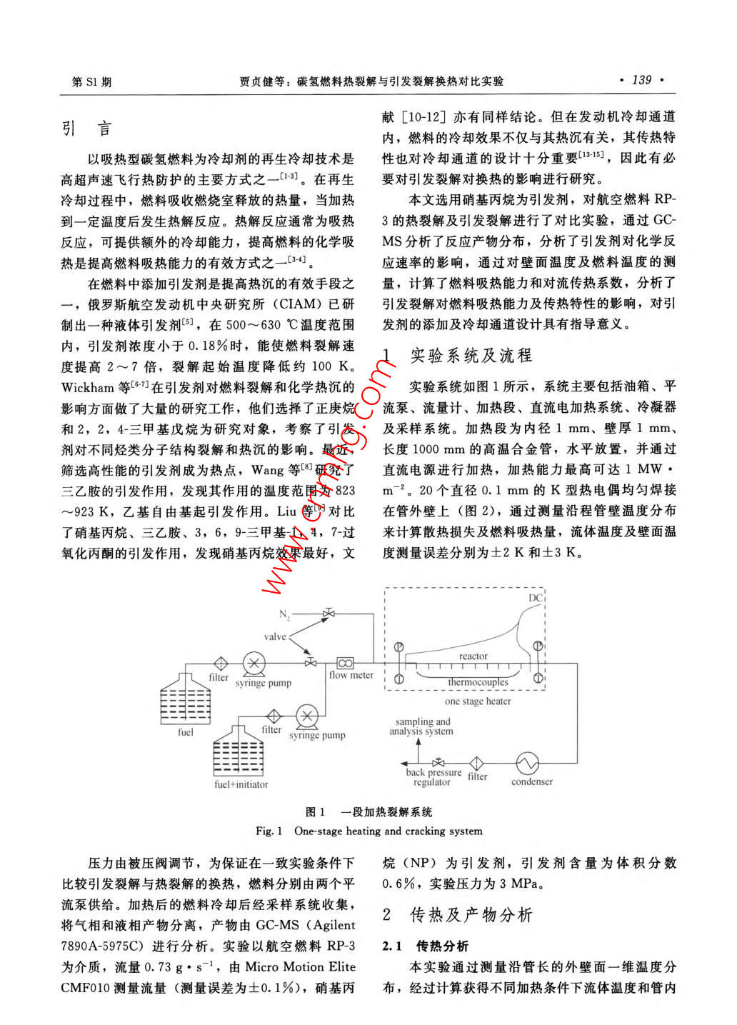 第65卷第S1期化工學(xué)報Vol. 65 No S12014年5月CIESC JournalMay 2014研究論文碳?xì)枞剂蠠崃呀馀c引發(fā)裂解換熱對比實驗賈貞健1,周偉星2,黃洪雁',于文力(哈爾濱工業(yè)大學(xué)能源科學(xué)與工程學(xué)院,黑龍江哈爾濱150001;哈爾濱工業(yè)大學(xué)基礎(chǔ)與交叉科學(xué)研究院,黑龍江哈爾濱150001)摘要:通過流動管反應(yīng)器對碳?xì)淙剂蟁P3在超臨界條件下的熱裂解及引發(fā)裂解進(jìn)行了實驗,對兩種條件下的燃料吸熱能力及傳熱特性進(jìn)行了對比分析,并對裂解產(chǎn)物進(jìn)行了采樣分析。結(jié)果表明,引發(fā)裂解降低了燃料的裂解起始溫度,在一定溫度區(qū)間內(nèi)提高了燃料的裂解率,從而有效提高了燃料熱沉,在相同熱通量條件下,降低了燃料溫度,并降低了加熱段壁面溫度。對流換熱受化學(xué)反應(yīng)及物性變化的影響,燃料裂解吸熱可增強(qiáng)換熱而大量氣態(tài)產(chǎn)物的生成會降低換熱,因此,裂解反應(yīng)的增強(qiáng)不一定增強(qiáng)換熱。關(guān)鍵詞:熱裂解;引發(fā)裂解;RP3;換熱;熱沉;超臨界DOI:10.3969/ 1. Issn.0438-1157.2014.z1.022中圖分類號:TQ028.8文獻(xiàn)標(biāo)志碼:A文章編號:0438-1157(2014)S1-138—06Heat transfer of thermal cracking and initiated cracking of aviation keroseneJIA Zhenjian, ZHOU Weixing, HUANG Hongyan, YU WenliSchool of Energy Science and Engineering, Harbin Institute of Technology, Harbin 150001, Heilongjiang, China:2 Academy of Fundamental and Interdisciplinary Sciences, Harbin Institute of TechnologyHarbin 150001, Heilong jiang, China)Abstract: Nitro-propane(NP) was employed as the initiator to investigate the effect of initiated crackingon heat transfer of aviation fuel RP-3 with a one-stage and cracking system operating under supercriticalpressure. The pyrolysis products are analyzed using a chromatograph/ mass spectrometry (GC-MS). Theheat sink, conversion rate and heat transfer coefficient were calculated based on the experimental results.Experimental results indicate that the heat transfer characteristics are influenced by the pyrolysis rate andphysical property change caused by products distribution. NP accelerates the pyrolysis and increases theheat sink of fuel in temperature range of 800 K to 900 K. Under the same heat flux conditions, the effectsof NP are reflected in the reduction of fuel and wall temperature. The reductions of fuel and walltemperature increase first and decrease along the flow direction, and the maximum decrease is more than 10K. However, the Reynolds numbers decrease because of large amount gaseous products generated bypyrolysis reaction, which has negative effect on the convective heat transfer. So the influence of initiatedcracking on the heat transfer of RP-3 is not a simple effect of promotion or inhibition, the regularity isdifferent in different temperature ranges.Key words: thermal cracking; initiated cracking; RP-3; heat transfer; heat sink; supercritica2014—01-23收到初稿,2014-01-31收到修改稿Received date: 2014-01-23聯(lián)系人:周偉星。第一作者:賈貞健(1987-),男,博土研Corresponding author: Prof. ZHOU Weixing, zhouweixing@究生基金項目:國家自然科學(xué)基金項目(11079017)Foundation item: supported by the National Natural ScieFoundation of China(11079017)第Sl期賈貞健等:碳?xì)淙剂蠠崃呀馀c引發(fā)裂解換熱對比實驗13獻(xiàn)[10-12]亦有同樣結(jié)論。但在發(fā)動機(jī)冷卻通道引言內(nèi),燃料的冷卻效果不僅與其熱沉有關(guān),其傳熱特以吸熱型碳?xì)淙剂蠟槔鋮s劑的再生冷卻技術(shù)是性也對冷卻通道的設(shè)計十分重要131,因此有必高超聲速飛行熱防護(hù)的主要方式之一13。在再生要對引發(fā)裂解對換熱的影響進(jìn)行研究冷卻過程中,燃料吸收燃燒室釋放的熱量,當(dāng)加熱本文選用硝基丙烷為引發(fā)劑,對航空燃料RP到一定溫度后發(fā)生熱解反應(yīng)。熱解反應(yīng)通常為吸熱3的熱裂解及引發(fā)裂解進(jìn)行了對比實驗,通過GC反應(yīng),可提供額外的冷卻能力,提高燃料的化學(xué)吸MS分析了反應(yīng)產(chǎn)物分布,分析了引發(fā)劑對化學(xué)反熱是提高燃料吸熱能力的有效方式之應(yīng)速率的影響,通過對壁面溫度及燃料溫度的測在燃料中添加引發(fā)劑是提高熱沉的有效手段之量,計算了燃料吸熱能力和對流傳熱系數(shù),分析了俄羅斯航空發(fā)動機(jī)中央研究所(CIAM)已研引發(fā)裂解對燃料吸熱能力及傳熱特性的影響,對引制出一種液體引發(fā)劑,在500~630℃溫度范圍發(fā)劑的添加及冷卻通道設(shè)計具有指導(dǎo)意義。內(nèi),引發(fā)劑濃度小于0.18%時,能使燃料裂解速1實驗系統(tǒng)及流程度提高2~7倍,裂解起始溫度降低約100K。Wickham等67在引發(fā)劑對燃料裂解和化學(xué)熱沉的實驗系統(tǒng)如圖1所示,系統(tǒng)主要包括油箱、平影響方面做了大量的研究工作,他們選擇了正庚烷流泵、流量計、加熱段、直流電加熱系統(tǒng)、冷凝器和2,2,4-三甲基戊烷為研究對象,考察了引發(fā)及采樣系統(tǒng)。加熱段為內(nèi)徑1mm、壁厚1mm、劑對不同烴類分子結(jié)構(gòu)裂解和熱沉的影響。最近,長度1000mm的高溫合金管,水平放置,并通過篩選高性能的引發(fā)劑成為熱點,Wang等。研究了直流電源進(jìn)行加熱,加熱能力最高可達(dá)IMW三乙胺的引發(fā)作用,發(fā)現(xiàn)其作用的溫度范圍為823m-2。20個直徑0.1mm的K型熱電偶均勻焊接~923K,乙基自由基起引發(fā)作用。Liu等對比在管外壁上(圖2),通過測量沿程管壁溫度分布了硝基丙烷、三乙胺、3,6,9