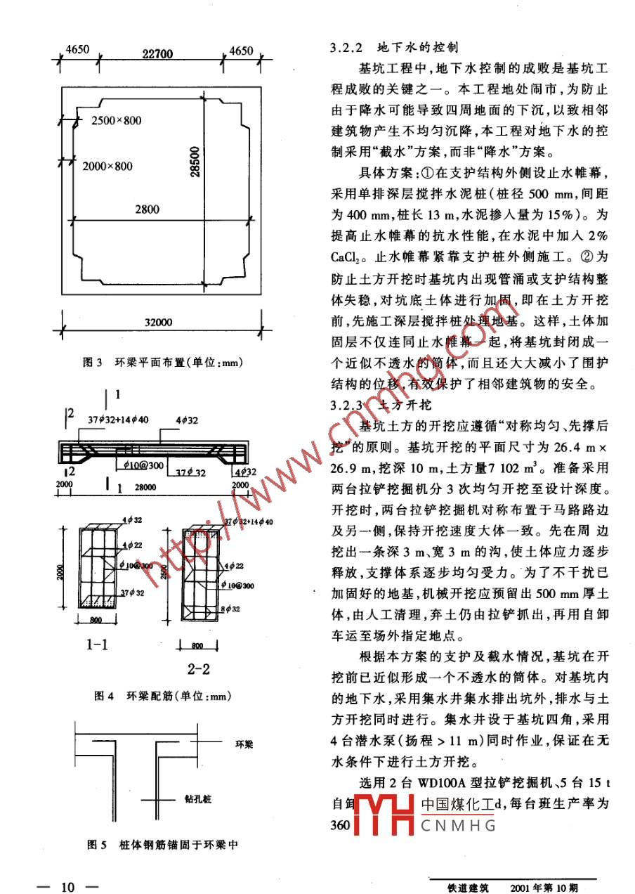 基坑支護(hù)設(shè)計邵小江eeeeceeeeececcecceeccccceee(太原鐵路工程總公司)eeeeeeeeeeeeeeeeeeeeeeeeee[摘要]由于周邊環(huán)境和地質(zhì)條件復(fù)雜,有必要在深基坑支護(hù)設(shè)計中,將支護(hù)、止水、地基加固、土方開挖諸問題,加以綜合考慮,以確保施工安全、經(jīng)濟(jì)合理。[關(guān)鍵詞]深基坑基坑支護(hù) 基坑穩(wěn)定 鋼 筋混凝土環(huán)梁對于高層建筑,基坑工程最為關(guān)鍵,大量的結(jié)構(gòu)為框一剪結(jié)構(gòu),基坑的開挖平面尺寸為.高層建筑都有1~3層的地下室,基坑開挖深度26.4 mx26.9 m,基坑開挖深度為10 m,地基處通常為6~ 15 m。由于工程地質(zhì)及水文地質(zhì)條理采用深層攪拌粉噴樁。件復(fù)雜,尤其是一般高層建筑地處鬧市,周圍地上地下建筑物多,環(huán)保要求更加嚴(yán)格。在這種2周邊環(huán)境及地質(zhì)條件情況下,基坑工程往往成為當(dāng)?shù)亟ㄖこ讨须y度大、風(fēng)險也大的組成部分。這就要求工程技本建筑地處鬧市,場地狹小,三面靠近高層術(shù)人員在進(jìn)行深基坑工程施工方案設(shè)計時,周建筑和馬路,相距均為5 m,其余一面為開闊空密考慮,不斷總結(jié)創(chuàng)新,提高技術(shù)水平。本文敘地,可做施工場地(圖1)。既有高層建筑均為述某工程的深基坑施工方案的設(shè)計。深基礎(chǔ),深度均超過本基礎(chǔ)。本工程土層地質(zhì)自上而下依次為:①雜填土:厚度為4.66 m,pr1工程概況= 10°,c =0,Y = 15 kN/m2 ;②粉土:厚度為7.96 m, φ2 = 11.25°, C2 = 17.6 kPa, Y2 = 19.8本工程是一幢集寫字間、商場、酒店為一體kN/m' ;③粉土:厚度為16.5 m,P3 = 28.25°,C3的高級樓宇,總建筑面積13 750 m2 ,主體結(jié)構(gòu)=22 kPa,Y3 = 20 kN/m。地下水位在- 1.0~地上20層,地下2層,建筑總高度84.6 m,主體-2.0m之間,以上γ值均為飽和密度。⑤按.上述配方配置環(huán)氧樹脂粘結(jié)劑。4小結(jié)⑥在混凝土粘結(jié)面上均勻涂刷配置好的環(huán)梁底裂縫為預(yù)應(yīng)力束集中錨固所致。裂縫氧樹脂粘結(jié)劑作底層,然后在鋼板上均勻涂刷處理后,1年內(nèi)經(jīng)多次觀測,沒有再發(fā)現(xiàn)裂縫,配好后的環(huán)氧樹脂粘結(jié)劑。⑦壓貼鋼板,并迅速擰緊脹錨螺栓,將鋼板證明處理效果良好。為避免類似裂縫在其他橋梁中發(fā)生,從設(shè)壓緊。⑧環(huán)氧樹脂粘結(jié)劑養(yǎng)生不少于3d。計上應(yīng)采取的主要措施有:(1)減少個別截面的⑨粘貼鋼板3m范圍封C40細(xì)石混凝土,預(yù)應(yīng)力束的錨固根數(shù),將其中一部分預(yù)應(yīng)力柬厚度5 cm,混凝土內(nèi)設(shè)置10 cmx 10 cm的$6越過此截面錨固于下一截面;(2)在接縫位置附中國煤化工量。mm鋼筋網(wǎng)一層。YHCN M H G高日期:2001-07-11(責(zé)任審編邵根大)鐵道建筑.2001年第10期在環(huán)梁內(nèi)側(cè)增設(shè)交叉支撐,就可以減小環(huán)梁截3基坑工程施工方案面及配筋,但開挖土方時施工難度加大,工期加長,而成本亦略有增加;第四種方案采用I形3.1施工設(shè)計思路雙排鋼筋混凝土樁,計算結(jié)果表明,當(dāng)樁長15從地質(zhì)條件和周邊環(huán)境來看,基坑施工需m、直徑φ800 mm、間距2 m時,采用此種方案,解決以下幾方面的問題:①擋土結(jié)構(gòu)應(yīng)能承受可有效減少鋼筋混凝土樁體配筋及插人深度,靜止側(cè)向土壓力,有效防止坑外土向坑內(nèi)平移但其存在兩方面的缺點:①采用樁間距2 m時,和垂直沉降,以保證基坑和周邊環(huán)境的安全。加上樁外側(cè)止水帷幕(樁徑φ500 mm),考慮場②切斷坑外地下水,防止坑內(nèi)發(fā)生管涌導(dǎo)致基地實際情況(與相鄰建筑物間距僅3 m),施工坑破壞。③確保土方開挖時的基坑穩(wěn)定。難度極大。②結(jié)構(gòu)實際受力狀態(tài)不易控制。隨著土方開挖,后排樁首先承受側(cè)向土壓力,這時土壓力本應(yīng)通過前后排間的土體傳遞給前排馬+路樁,但由于成樁過程中,土體遭到一定松動破壞,土壓力傳遞會有所減弱,致使前排樁受力很新建建筑物既有建筑物.小。只有當(dāng)后排樁承受土壓力及位移達(dá)到較高值時,土壓力才逐漸通過排間土體傳給前排樁。施T場地綜合以上分析結(jié)果,經(jīng)反復(fù)計算論證,決定采用頂部設(shè)一道鋼筋混凝土環(huán)梁支撐的方案。采用內(nèi)撐法支護(hù)方案,即利用鋼筋混凝土圖1總平面布置圖環(huán)梁來支撐鋼筋混凝土鉆孔灌注樁的支護(hù)結(jié)基于以上要求,本方案設(shè)計原則確定為:①構(gòu) 。安全可靠;②經(jīng)濟(jì)合理;③縮短工期。鋼筋混凝土鉆孔樁的直徑為800 mm,樁長3.2方案設(shè)計15.51m,樁間距1m,樁體主筋為15φ32mm,構(gòu)3.2.1支護(hù)方案造配筋10$16mm,螺旋筋φ8mm@200mm。為針對本工程的地質(zhì)、環(huán)境特點,擬選用鋼筋最大限度發(fā)揮鋼筋作用,將主筋集中配置于受混凝土鉆孔樁作基坑支護(hù)。初步確定的方案有拉區(qū)域(圖2),而不是沿樁周均勻配置,采用4個:①懸臂樁;②鋼筋混凝土樁加單拉錨;③C30混凝土。環(huán)梁支撐鋼筋混凝土樁;④II形雙排鋼筋混凝土樁。經(jīng)初步計算分析得出以下結(jié)論:第一種10φ 16 mm15032 mm方案不經(jīng)濟(jì)。因地基土軟,所以在采用懸臂樁時,其插人深度需相當(dāng)深,由此增加費(fèi)用約138.4萬元;第二種方案存在的問題是,為了減圖2柱 體配筋少人土深度,雖可采取拉錨的方法。但經(jīng)計算采取單拉