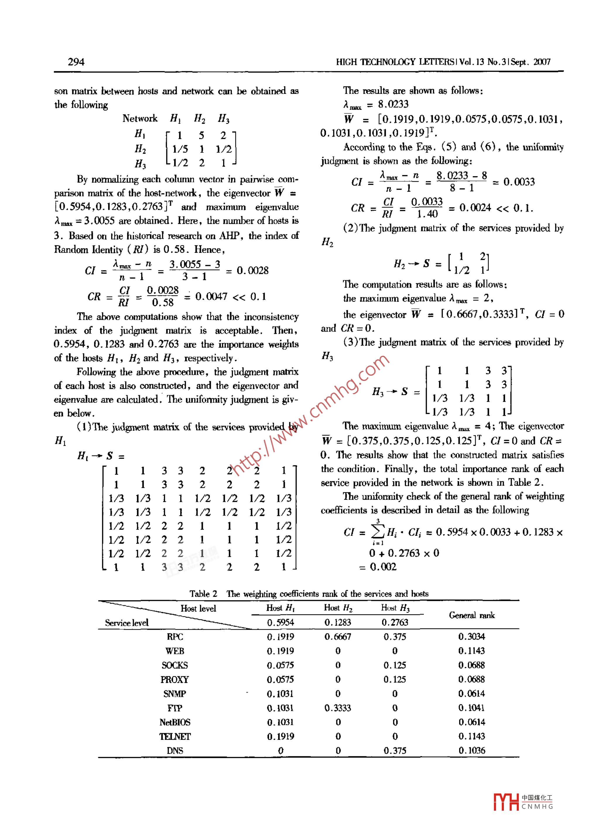 294HICH TECHNOLOGY LETTERSIVol. 13 No.3ISept. 2007son matrix between hosts and network can be obtained asThe results are shown as follows:the followingλmax = 8.0233W =[0.1919,0.1919 ,0.0575,0.0575 ,0. 1031,H「15210.1031 ,0.1031 ,0. 1919]T.1/5 1 1/2According to the Eqs. (5) and (6), the unifomityjudgment is shown as the following:By nommalizing each column vector in pairwise com-8.0233一8= 0.00338-1parison matrix of the host-network, the eigenvector W =0.0033[0. 5954,0.1283,0.2763]T and maximum eigenvalueCR=R=1.40= 0.0024 << 0.1.λmx = 3.0055 are obtained. Here, the number of hosts is(2 )The judgment matrix of the services provided by3. Based on the historical research on AHP, the index ofRandom Identity ( RI) is 0.58. Hence,cI=Amex-n.=3.0055-= 0.0028H2→S=lI3- 1The computation results are as follows:CR =CI 0. 0028the maximum eigenvalue λmax = 2,RI=0.58=0.0047<<0.1The above computations show that the inconsistencythe eigenvector W = [0.6667,0.3333]T, CI =0index of the judgment matrix is acceptable. Then,and CR=0.0.5954, 0. 1283 and 0. 2763 are the importance weights(3)The judgment matrix of the services provided byof the hosts H;, H2 and Hz, respectively.Following the above procedure, the judgment matrixof each host is also constructed, and the eigenvector andeigenvalue are calculated, The uniformity judgment is giv-H3+S=1/31/311en below.(1)The judgment matrix of the services provided byThe maximum eigenvalue λmux = 4; The eigenvectorW = [0.375,0.375,0.125,0.125]", CI=0 and CR =Hl→S=0. The results show that the constructed matrix satisfiesthe condition. Finally, the total importance rank of each33service provided in the network is shown in Table 2.1/31/3111/21/21/21/3The uniformity check of the general rank of weightingcoefficients is described in detail as the following1 1/2CI=2H;.CI;=0.5954x0.0033+0.1283x1/21/2221/20+ 0.2763 x 011331.= 0.002:able 2 The weighting coefficients rank of the services and hostsHost levelHost HHost H2Host H3General rankService level0. 59540.12830.2763RPC0. 19190.66670.3750.3034WEB00.1143SOCKS0.05750.1250.0688PROXYSNMP0. 10310.0614FTP0.33330.1041NetBIOSTELNET).1919DNSC0. 1036中國煤化工CN MHG .296HIGH TECHNOLOGY LETTERSIVol. 13 No.3ISept. 2007National Symposium on Sensor and Data Fusion, 1999. 1-63 Conclusions[ 5] XiaoHD, Li J H. Analyeis of security aituation of networksbased on knowledge base. WSEAS Trans on Electronics ,2006, 3(1): 34-39It is an emenging technique to utilize multi-source[ 6] ChenXZ, ZhengQ H, Guan X H, et al. Approach to secu-data with weighting cofficients to achieve a quantitativerity evaluation based on rough set theory for host comnputer.description about the overall data. By combining the alertJournal of Xi' an JiaoTong Unizersity , 2004, 38(12): 1228-necords and fusing the data from the bottom to the top,1231, 1255 (in Chineae)the quantitative evaluation of the attack degree that the[ 7] Li W s, Wang B S. Sitnation asment based on Bayesiannetwork suffers can be accomplished. The above proce-network. Systems Engineering and Electronics , 2003, 25(4):dure will be the goal of the network management systems480- 483 ( in Chinese)in the future. Starting with the Snort alerts, this paper[ 8] Mahew S, Shah C, Upadhyaya S. An alert fusion frameworksituation awareness of coordinated multistage attacks. Inimplements a great deal of calculation, and achieves theProceedings of the 3rd EEE Intermational Workshop on Infor-curent situation of the network security . The experimen-mation Assurance, Maryland, 2005. 95-104tal results reflect the security situation of the evaluated[ 9] Chen X Z, Zheng Q H, Guan X H, et al. Multiple behaviornetwork accurately, and lay an academic foundation forinformation fusion based quanhitative threat evaluation. Com-the future research. The proposed approach makes theputer & Seurity, 24 (3): 218-231analysis more reliable and easier to realize. Several mea-[10] Satty T L. The Analytic Hierarchy Process. New York: Mc-sures can be implemented to improve our proposedGraw-Hll,1980. 17-34scheme, like the order reduction of the pairwise compari-[11] Chen X Z, ZhengQ H, Guan XH, et al. Study嘰evalua-tion for security situation of networked systeme. Joumal ofson matrix. It is a tradeoff between perfomance and com-Xi' an }iaoTong Unitersity, 2004, 38 (4): 404 407 (in Chi-plexity for the large scale network to meet the demands.nese)[12] The Nessus Vulnerability Scanner. http://www. nessus. com;ReferenceTenable Network SecunityTM, 2005[ 1] Hall D L, Llinas J. Introduction to mulb sensor data fusion.[13] Snort. http://www. snort. org: SourceFile Inc, 2006In: Proceedings of the IEEE Intemational Symposium on Cir-[14] Ted Hale. Analysis of Snt Alent Log for the Project HoneyNetcuits and Systeme, Monterey, 1998. 537-540Scan of the Month 17. http://www. honeynet. rg/ scans/[ 2] Bass T, Intnusion detection systems and multi-sensor data fu-scan17/ soo/ 8om1/ som1-LogAnalysis. html:HoneyNet. org, 2001sion: creating cyberspace situation awareness. Communica-[15]Nation Anti-Intnusion & Anti- Vinus Center. htp://www. a-tions of the ACM, 2000, 43(4): 99-105iav . com.cn: AI & AV, 2005 (in Chinese)[ 3] Bass T, Robichaux R. Defense -in deph revisited; qualitativerisk analysis methodology for complex network- centric opeta-Hu Wei, born in 1977. Now he is a Ph.D candi-tions. hn: Proceedings of the IEEE Military Communicationsdate in Electronic Engineering Departnent of Shanghai[ 4} Bass T. Multi-seneor data fusion for next generation distribut-Jiaotong University. His research interests include com-ed intrusion detection systems. In: Proceedings of the IRISputer cormunication network, network secunty manage-ment and data fusion ,中國煤化工CNMHG