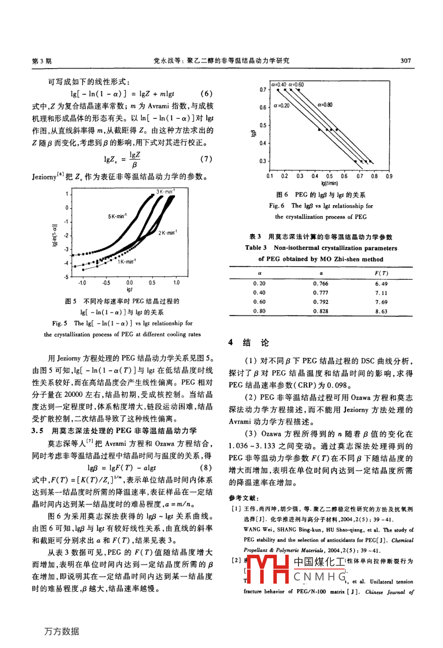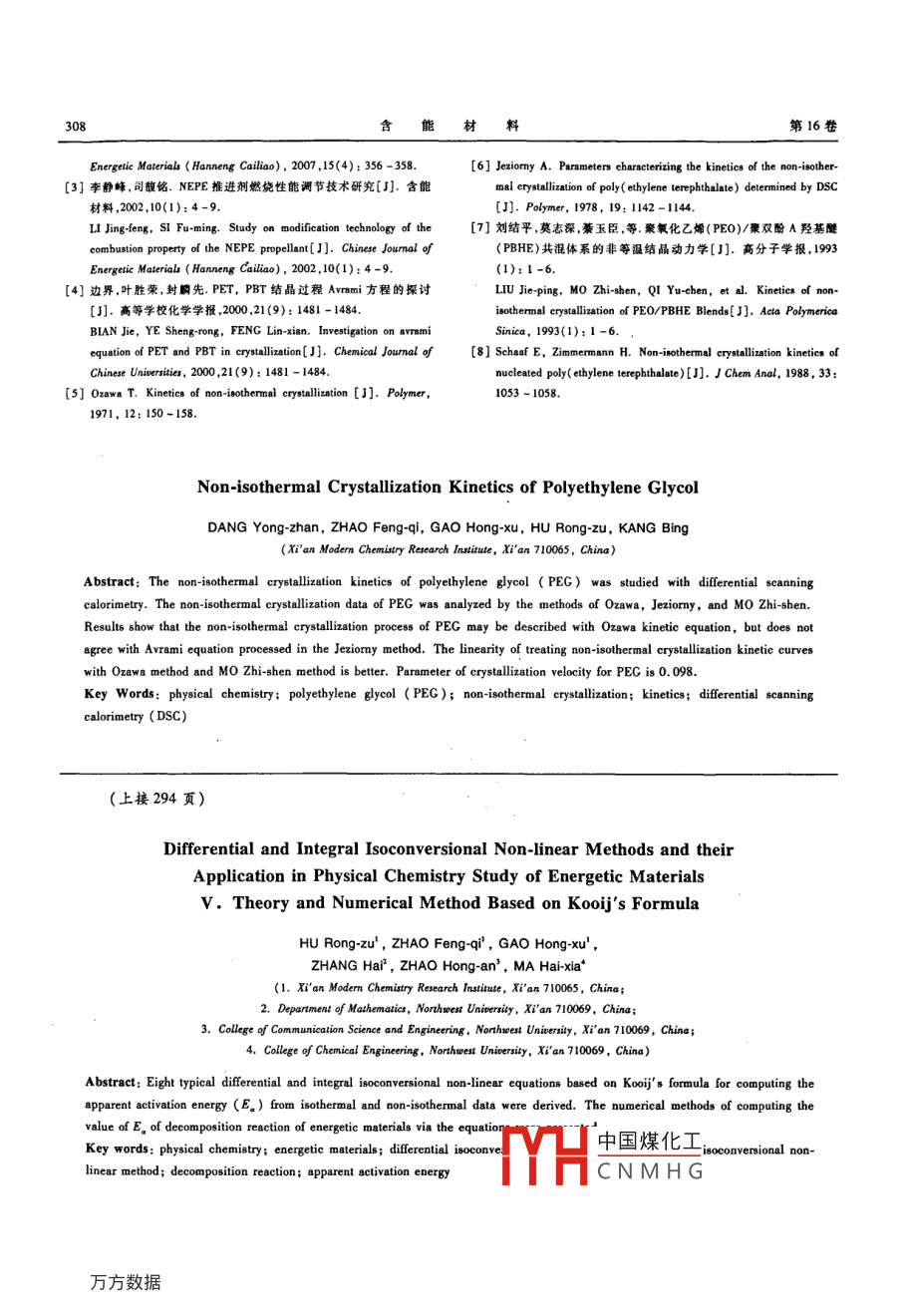 第16卷第3期含能材料Vol 16. No. 32008年6月CHINESE JOURNAL OF ENERGETIC MATERIALSJune, 2008文章編號(hào):10069941(2008)0303050聚乙二醇的非等溫結(jié)晶動(dòng)力學(xué)研究黨永戰(zhàn),趙鳳起,高紅旭,胡榮祖,康冰(西安近代化學(xué)研究所,陜西西安710065)摘要:用差示掃描量熱法(DSC)研究了聚乙二醇(PEG)的非等溫結(jié)晶動(dòng)力學(xué)。用 Ozawa法、 Jeziorny法和莫志深法處理了PEG的非等溫結(jié)晶數(shù)據(jù)。結(jié)果表明,PEG的非等溫結(jié)晶過(guò)程可用Owa動(dòng)力學(xué)方程描述,與 Avrami動(dòng)力學(xué)方程不符,采用 Ozawa法和莫志深法處理數(shù)據(jù)可得到較好的線性關(guān)系,PEC的結(jié)晶速率參數(shù)為0.098。關(guān)鍵詞:物理化學(xué);聚乙二醇(PEG);非等溫結(jié)晶;動(dòng)力學(xué);差示掃描量熱法(DSC)中圖分類號(hào):T555;064文獻(xiàn)標(biāo)識(shí)碼:A醇,廣東汕頭市西隴化工廠,相對(duì)分子量200002.2實(shí)驗(yàn)條件聚乙二醇( polyethylene glycol,PEG)是用環(huán)氧乙試樣量,(543±0.25)mg;吹掃載氣,40 mL. min1烷與水或乙二醇逐步加成聚合得到的水溶性聚醚,有(氮?dú)?;熔融熱和溫度校正用銦作標(biāo)準(zhǔn),熔融熱校正多種優(yōu)良特性而被廣泛應(yīng)用。PEG作為NEPE推進(jìn)值為28.70J·g。Dsc的操作條件:快速升溫至劑的黏合劑賦于NEPE推進(jìn)劑較優(yōu)異的力學(xué)性能口2。70.0℃使PEC熔融,恒溫5min,消除熱歷史后,分別含PEG的NEPE推進(jìn)劑是一類硝酸酯增塑的聚醚推以5,3,2,1℃·min降溫速率降至室溫。進(jìn)劑,是現(xiàn)役固體推進(jìn)劑中能量最高的一種3。PEG是一種結(jié)晶型高分子聚合物,為改善NEPE推進(jìn)劑低3結(jié)果與討論溫力學(xué)性能,避免NEPE推進(jìn)劑內(nèi)部結(jié)晶缺陷的出現(xiàn),3.1冷卻速率對(duì)結(jié)晶溫度的影響分析NEPE推進(jìn)劑在一些特定條件下的力學(xué)現(xiàn)象,為圖1為不同冷卻速率下PEG的DSC曲線。PEGEG的生產(chǎn)和在其他領(lǐng)域的應(yīng)用提供理論參考依據(jù)試樣的結(jié)晶終止溫度(T)、結(jié)晶峰溫(T)和開始結(jié)晶本工作用差示掃描量熱法(DSC)考察了PEC的非等溫度(T)與冷卻速率之間的線性關(guān)系見圖2。結(jié)晶溫溫結(jié)晶行為我們?cè)诳疾斓人俳禍貤l件下PEG結(jié)晶行度都隨著冷卻速率增大而降低,這是因?yàn)槔鋮s速率增為的同時(shí),用3種動(dòng)力學(xué)方法(Ozwa法、 Jeziorny法和大時(shí),結(jié)晶溫度下降很快,高分子鏈在高溫下來(lái)不及作志深法)分析了PEG的非等溫結(jié)晶過(guò)程,從不同規(guī)則排列,結(jié)晶熱效應(yīng)在較低溫度下顯現(xiàn)結(jié)晶平衡需角度分析了PEG非等溫結(jié)晶特點(diǎn)。要在較寬溫度范圍才能達(dá)到般認(rèn)為,高聚物的非等溫結(jié)晶過(guò)程較復(fù)雜,等溫3.2冷卻速率對(duì)結(jié)晶時(shí)間的影響結(jié)晶過(guò)程可用 Avrami方程來(lái)描述。在非等溫結(jié)晶究領(lǐng)域, Ozawa導(dǎo)出了求取 Avrami指數(shù)(n)的非由聚合物熔體降溫DsC曲線得特征溫度:結(jié)晶峰溫(Tn)等溫結(jié)晶動(dòng)力學(xué)模型。 Jeziorny“"提出了非等溫動(dòng)力開始結(jié)晶溫度(T)和非等溫結(jié)晶過(guò)程峰面積達(dá)總面積學(xué)結(jié)晶能力的概念。近年來(lái),也有用描述等溫結(jié)晶過(guò)50%的溫度(Ta)。從T、T和B由下式得半結(jié)晶時(shí)間程的 Avrami公式導(dǎo)出非等溫結(jié)晶動(dòng)力學(xué)方法研究聚酯、聚酰胺的非等溫結(jié)晶過(guò)程。假設(shè)結(jié)晶放熱峰對(duì)稱,且不考慮曲線的非均衡性,則可用T,代替T1,于是有:2實(shí)驗(yàn)部分1n=(7.-T)/B(2)2.1儀器和試柱對(duì)PEC的非等溫結(jié)晶過(guò)程,由特征結(jié)晶溫度計(jì)算的半美國(guó)TA公司2910型差示掃描量熱儀。聚乙二結(jié)晶時(shí)間(tn)見表1收稿日期:2007-1205;修回日期:200802-14中國(guó)煤化工3所示直線,直線斜率d(基金項(xiàng)目:火炸藥燃燒國(guó)防科技重點(diǎn)實(shí)驗(yàn)室基金(No9140030010601)參數(shù)CRP( crystalli作者簡(jiǎn)介:黨水戰(zhàn)(1971-),男,博士,主要從事固體推進(jìn)劑配方和工 zationCNMHG開始結(jié)晶時(shí),結(jié)晶藝研究。e-mail: pecc@163.c0m含能材料第16卷速率較慢然后慢慢加快,約在t1達(dá)到最高,而到了后3.3用Ozwa方程處理的PEG結(jié)晶動(dòng)力學(xué)期,結(jié)晶速率又降低。由圖3直線斜率求得PEG的0zawa方程是20世紀(jì)70年代出現(xiàn)的處理聚合物CRP值為0.098。非等溫結(jié)晶過(guò)程的方法,以聚合物結(jié)晶的成核和生長(zhǎng)為著眼點(diǎn),導(dǎo)出了不同T時(shí)a(T)與B之間的關(guān)系式5℃mr1-a(T)=exp[-k(T)/B](3)對(duì)式(3)進(jìn)行簡(jiǎn)單數(shù)學(xué)變換,得Ig[ -In(1-a(T))]= lgk (T)-nlgBb (4)2℃mr1式中,a(T)為在溫度T時(shí)的相對(duì)結(jié)晶度;k(T)與成核方式、成核速率T、晶核生長(zhǎng)速率等因素相關(guān),是溫度的函數(shù),稱為冷卻結(jié)晶函數(shù);n為 Avrami指數(shù)。在給定溫度的條件下,用lg[-hn(1-a(T))]對(duì)lg作圖得圖4所示斜率為n的直線。圖1不同冷卻速率下PEG結(jié)晶過(guò)程的DSC曲線Fig. I DSC curves of the crystallization proceof PEG at different cooli3175KE32315K圖4不同溫度時(shí)PEG結(jié)晶過(guò)程的B/℃.mlg[-ln(1-a(T)]對(duì)lg的關(guān)系圖2冷卻速率對(duì)PEG結(jié)晶溫度的影響Fig 4 Ig[ -In(1-a(T))]vs lgB relationship for the crystallizatio