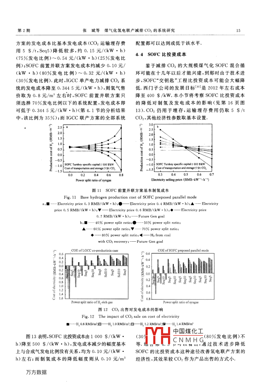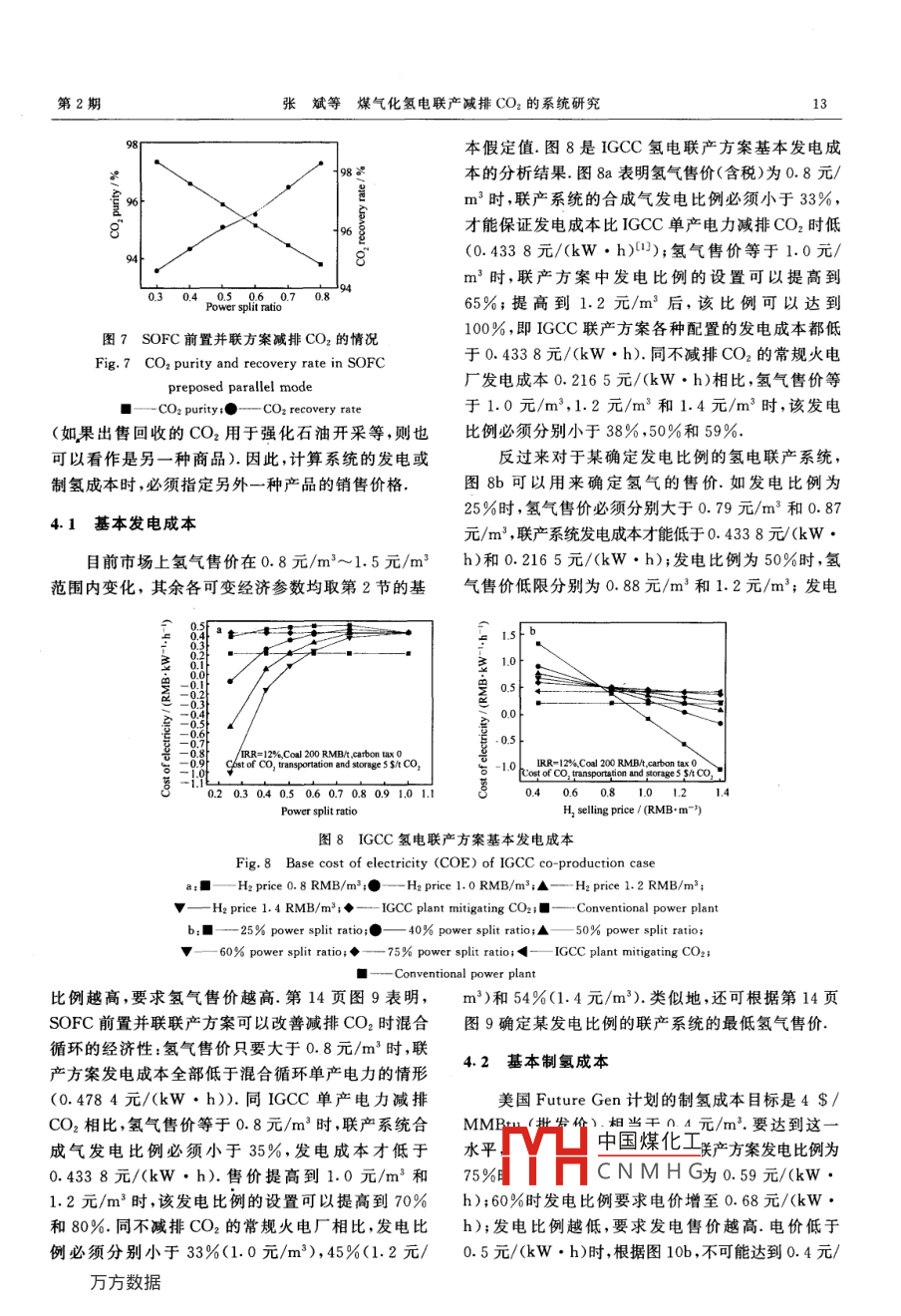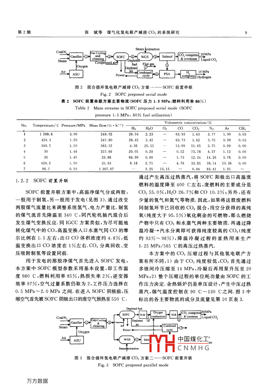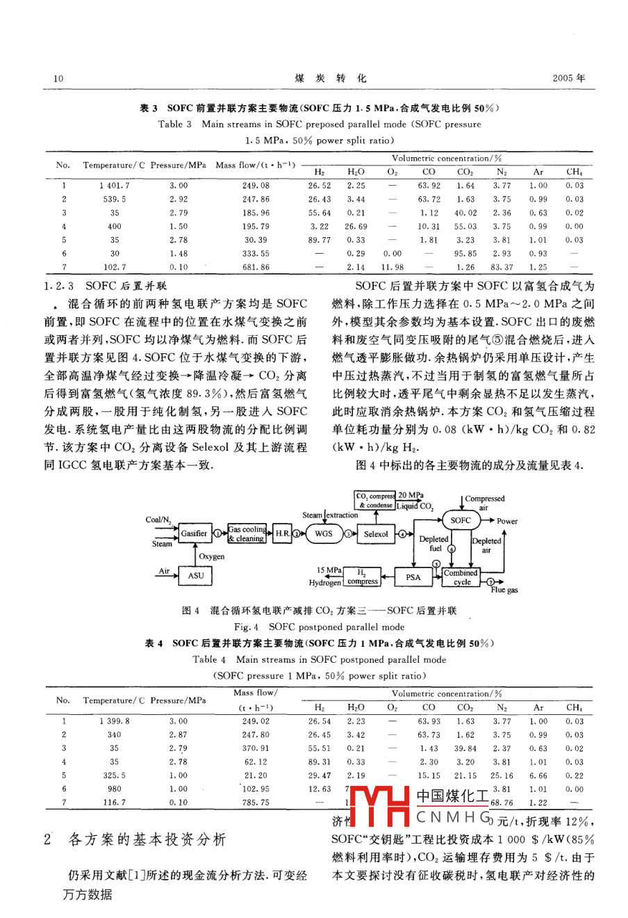 第28卷第2期煤炭轉(zhuǎn)化Vol.28 No.2005年4月COAL CONVERSIONApr. 2005煤氣化氫電聯(lián)產(chǎn)減排CO2的系統(tǒng)研究張斌})李政2)倪維斗3)摘要征收碳稅、強(qiáng)化石油開(kāi)采以及開(kāi)放二氧化碳減排貿(mào)易等措施可以促進(jìn)發(fā)電行業(yè)減排CO2.但是這些措施,尤其是碳稅和減排貿(mào)易,可能需要較長(zhǎng)的時(shí)間才能在中國(guó)施行.因此,必須考慮在這段時(shí)期內(nèi)如何改善減排CO2的IGCC和煤氣化固體氧化物燃料電池(SOFC)混合循環(huán)的經(jīng)濟(jì)性,進(jìn)而促進(jìn)IGCC和混合循環(huán)的發(fā)展.以煤氣化氫電聯(lián)產(chǎn)系統(tǒng)作為嘗試,設(shè)計(jì)、模擬了四種不同的聯(lián)產(chǎn)方案,通過(guò)對(duì)各方案的投資、發(fā)電和制氫成本的分析,就氫電聯(lián)產(chǎn)能否及如何改善經(jīng)濟(jì)性、如何從能量利用和成本兩方面配置聯(lián)產(chǎn)系統(tǒng)、以及實(shí)施碳稅等措施前后如何促進(jìn)發(fā)電廠減排CO2等方面進(jìn)行了探討.關(guān)鍵詞煤氣化,氫電聯(lián)產(chǎn) ,二氧化碳,減排,IGCC,SOFC混合循環(huán)中圖分類(lèi)號(hào)TQ544,TM661. 31氫電聯(lián)產(chǎn)減排CO2的方案0引言通過(guò)對(duì)常規(guī)火電廠和IGCC及煤氣化固體氧化1.1 IGCC 方案物燃料電池(SOFC)混合循環(huán)在減排CO2前后的技如第8頁(yè)圖1所示,IGCC方案考慮在用Selexol術(shù)經(jīng)濟(jì)性的探討,發(fā)現(xiàn)雖然減排CO2時(shí),IGCC和技術(shù)分離CO,之后,將一部分富氫燃?xì)庖胱儔何旌涎h(huán)的基本發(fā)電成本低于常規(guī)火電廠,但是要附制氫裝置,另-部分通人燃?xì)廨啓C(jī)做功發(fā)電.促進(jìn)發(fā)電行業(yè)減排CO2的實(shí)施,需要開(kāi)放CO2減排同IGCC單產(chǎn)電力減排CO2系統(tǒng)相比,該系統(tǒng)貿(mào)易及碳稅政策的輔助,而這兩者可能需要較長(zhǎng)時(shí)空分、煤氣化和高溫煤氣凈化等系統(tǒng)的配置不變,而間的努力才能奏效.所以有必要探討在這兩種手段高溫水煤氣變換(HTS)人口溫度控制在340 C~實(shí)施前,IGCC和混合循環(huán)經(jīng)濟(jì)性的方案.由于多聯(lián)350 C之間,出高溫變換溫度在400 C左右,人低溫產(chǎn)可以改善IGCC的經(jīng)濟(jì)性田,而且IGCC和煤氣變換(LTS)溫度在220 C左右.變換所需的水蒸氣/化-SOFC混合循環(huán)減排CO2的流程均存在CO2分CO比例保持不變,仍為1.5,需要從汽輪機(jī)中抽汽,離制富氫合成氣這一-環(huán)節(jié).因此,考慮聯(lián)產(chǎn)市場(chǎng)價(jià)格此時(shí)高溫變換人爐汽氣比約為1,低溫變換人口降較高的氫氣似乎是一一個(gè)可行的方向;另外,以煤為原至0.27左右.水煤氣變換前后回收的顯熱用于產(chǎn)生料聯(lián)產(chǎn)氫氣和電力同時(shí)臧排CO2也是美國(guó)Future12.5 MPa的高壓飽和蒸汽,該蒸汽被透平煙氣過(guò)Gen計(jì)劃的主要內(nèi)容. [l]本文將就IGCC及混合循熱后進(jìn)入高壓蒸汽輪機(jī)做功;CO2分離設(shè)備入口混環(huán)氫電聯(lián)產(chǎn)減排CO2的各種方案進(jìn)行分析:1)考察.合氣中CO2分壓約1. 12 MPa,仍采用物理溶劑法,氫電聯(lián)產(chǎn)能否及如何改善減排COz時(shí)的IGCC和混此處CO2回收率設(shè)為95%.回收的CO2量約308合循環(huán)的經(jīng)濟(jì)性;2)從能量利用效率最高和發(fā)電成t/h,壓力0. 2 MPa左右,用三級(jí)間冷壓縮機(jī)升壓至本(或制氫成本)最低的角度,如何配置各氫電聯(lián)產(chǎn)8MPa,冷凝后仍用泵升壓至20MPa,整個(gè)壓縮過(guò)方案的參數(shù);3)比較各方案的優(yōu)缺點(diǎn),針對(duì)促進(jìn)發(fā)程單中國(guó)煤化工)/kg CO:;部分富氫電廠減排CO,,描述一下技術(shù)發(fā)展路線及前景(碳稅合成MH)進(jìn)人變壓吸附的實(shí)施前后).(PSCNMH.G這部分合成氣的比*國(guó)家自然科學(xué)基金資助項(xiàng)目(90210032).1)博士生;2)教授、博士生導(dǎo)師:3)中國(guó)工程院院士、教授、博士生導(dǎo)師,清華大學(xué)熱能工程系.00084北京收稿日期:2004-11-29;修回日期:2005-01-108煤炭轉(zhuǎn)化2005年例(變化范圍0~1)來(lái)控制系統(tǒng)的氫、電產(chǎn)量比,制尾氣壓力跟人口原料氣壓力水平有關(guān),-般在0. 02得的氫氣(約2.7MPa)被兩級(jí)氫氣壓縮機(jī)間冷壓縮MPa~0.2 MPa左右.變壓吸附的尾氣經(jīng)壓縮預(yù)熱至15 MPa,壓縮過(guò)程單位耗功量為0.82 (kW●h)/后進(jìn)入燃?xì)廨啓C(jī)燃燒室 ,燃機(jī)系統(tǒng)根據(jù)需要選擇合kg H2;大型變壓吸附裝置一般都采用多床流程(10適的型號(hào);余熱鍋爐僅采用單壓設(shè)計(jì),產(chǎn)生中壓過(guò)熱床到12床),氫氣純度可達(dá)5 N. [4}我國(guó)西南化工研蒸汽,蒸汽參數(shù)為3MPa/360C.排放的煙氣溫度究設(shè)計(jì)院51成功設(shè)計(jì)了制氫能力5萬(wàn)m*/h以上的控制在120 C~150 C之間.圖1中標(biāo)出的各主要PSA裝置,氫氣回收率大于95%. PSA實(shí)際運(yùn)行數(shù)物流的成分及流量見(jiàn)表1(powersplitratio是指合據(jù)表明[6],產(chǎn)品氫氣的壓力和原料氣壓力相差不大,成氣或富氫燃?xì)夥峙溆糜诎l(fā)電的比例,下同).steanlextractionGias colig ,2(JCo, compes 20MPa廣十 and cleaningSteamL and condens LiquidCO2,OxygenFluegesAi> ASUCombinedSAH 1SMPacyclecompress HydrogenPower圖1 IGCC 氫電聯(lián)產(chǎn)減排CO2Fig. 1 IGCC case for H2 and electricity coproduction with COz recovery表1 IGCC 氫電聯(lián)產(chǎn)方案主要物流(合成氣發(fā)電比例50%)Ta