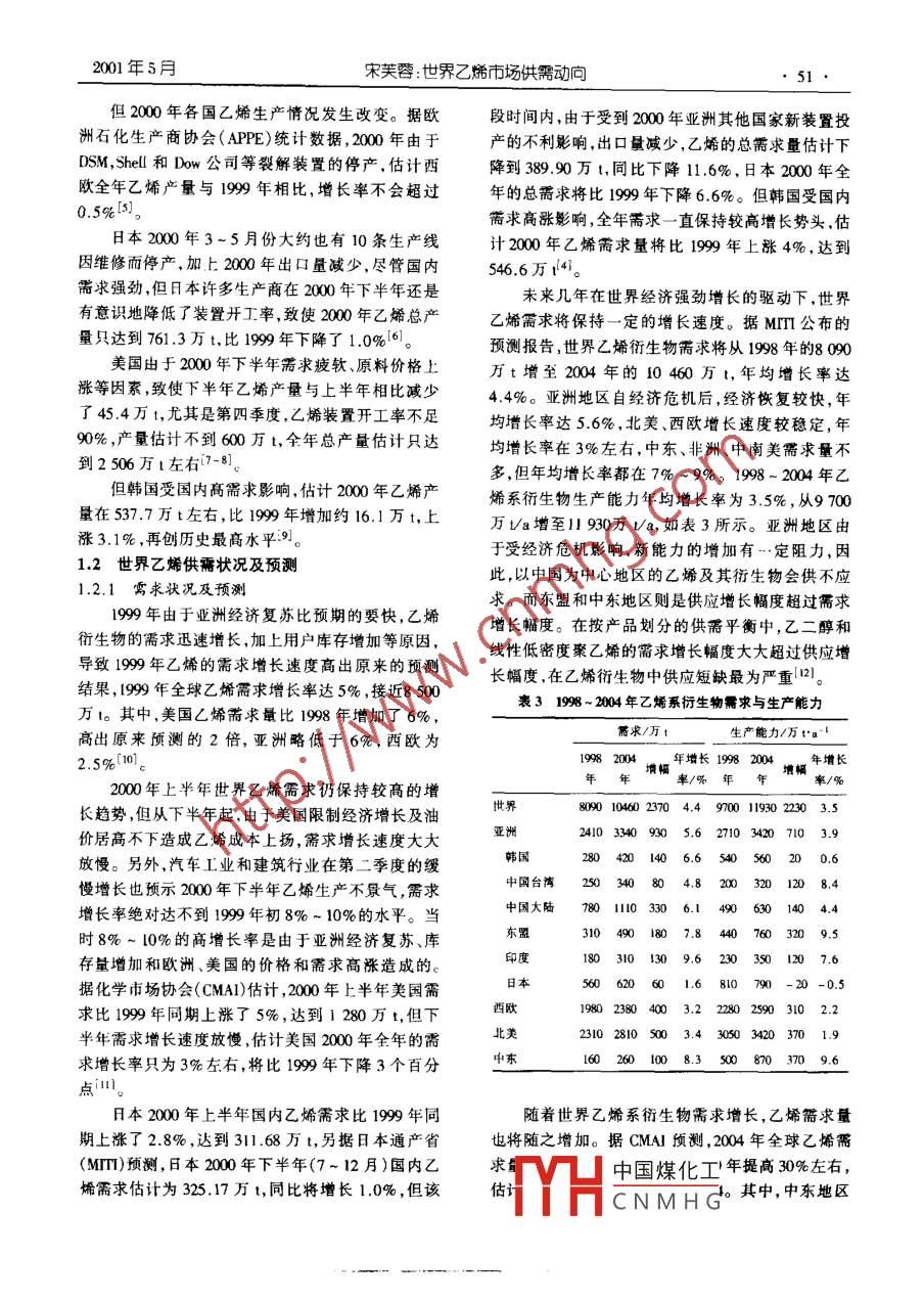 May 2001現(xiàn)代化工第21卷第5期,50●Modem Chemical Industry2001年5月世界乙烯市場供需動(dòng)向宋芙蓉(中國石油化工集團(tuán)公司北京化工研究院,北京100013)摘姜:截止到1999年底世界乙烯生產(chǎn)能力達(dá)到9270.4萬Va.1999年世界乙婚需求量接近8500萬t。末來兒年在世界經(jīng)濟(jì)強(qiáng)勁增長的驅(qū)動(dòng)下,預(yù)計(jì)世界乙烯需求量將以年均5.2%的速度增長,到200年將達(dá)到10941.2萬1;同時(shí)世界乙端生產(chǎn)能力將以年均4.7%的速度增長.到2004年將達(dá)到11 62.5萬Vao近幾年我國乙烯工業(yè)發(fā)展很快,日前已有生產(chǎn)裝置18套,總生產(chǎn)能力達(dá)40.3萬Va, 199年消費(fèi)量達(dá)到900多萬1.頁計(jì)到2010年將達(dá)到1500萬1。關(guān)鍵詞:乙烯;市場;供需;預(yù)測中圈分類號(hào):T0221.211文獻(xiàn)標(biāo)識(shí)碼:ASupply and demand trends of global ethylene marketSONG Fu-rong(Bejjig Research Insitute of Chemnical Industry , SIN0PEC, Bejing 10013,0 Chinm)Abstract: The global production capacity of etylne reached 92 704 milin lors per year by the end of 199 and thedemand of ethylene was 85 milio tons in 199. Drived by the strong globel economie gowth in the near term, frecast of de-mand annul gowth mate of ethylene will be 5.2% ,and the demand of ethylene will increase to 109 .412 mllion tons by 2004.The globeal production capacity of ethylene is forecasted to inerease to 116.525 mllion tons by 2004 with a annuel gowth nate of4.7% . Euhylene industry rapidly growms in China in the reent years. Now there ure 18 sets of poucion inalatins, and theirlotal production capecity is 4.403 million tons yearly . The consumption of ethylene was over 9 mllin tons in 1999, and it is ex-pected that it will rise to 15 mllion tons by 2010.Key words: ehylene;market; spply and demand; forecast需求,許多國家和地區(qū)的厶烯生產(chǎn)商都滿負(fù)荷生產(chǎn),1世界乙烯生產(chǎn)概況總產(chǎn)量都達(dá)到了歷史最高位,見表2-41。l.1 世界乙烯生產(chǎn)能力和產(chǎn)量t表1世界各地區(qū)乙烯生產(chǎn)能 力現(xiàn)狀hivs1.1.1能力據(jù)油氣雜志(0GJ)的年度統(tǒng)計(jì)數(shù)據(jù),截止于亞太東歐/ 中東/北美南美西歐合計(jì)地區(qū)前蘇聯(lián)非洲2000年1月1日,全球乙烯生產(chǎn)能力達(dá)9270.4萬1998年2185.7 746.7 632.7 3112.6 345.2 2078.5 9101.4Va,與1998年年底相比僅增長1 .9%,是過去10年1999年2314.7 733.7 631.2 3130.5 345.6 2114.7 9270.4間增長最低的一年。能力增長主要來自亞太、西歐增長最129.0 -13.0 -1.5 17.9 0.436.2 169.0和北美,其中亞太地區(qū)能力增長最為顯著,接近130增長率/% 5.9 -1.7 -0.2 0.6 0.1 1.7 1.9萬Va,占全球增加值的76.3%,見表中。1.1.2產(chǎn)量表2世界主要乙烯生產(chǎn)國乙烯產(chǎn)量萬199年亞洲經(jīng)濟(jì)開始復(fù)蘇,馬來西亞、菲律賓、芙國日本德國韓國中國加拿大法國韓國、泰國和新加坡等國內(nèi)生產(chǎn)總值(CDP)增長都1998年2363.6 707.6 427.4 511.0 376.2 355.7 300.7至少達(dá)3%。GDP強(qiáng)勁的增長勢頭激發(fā)了乙烯需求1999年2532.3 768.7 490.0 521.6 435.1 385.1 312.9 .的增長,使得整個(gè)世界乙烯市場趨緊。為滿足市場增長率/% 7.1 8.6 14.6 2.1 15.6 8.2 4.0收稿日期:2001-03-22中國煤化工作者簡介:宋芙蓉,女,1967年生,本科,工程師,從事信息調(diào)研工作。MYHCNMHG2001年5月宋芙蓉:世界乙烯市場供需動(dòng)向但2000年各國乙烯生產(chǎn)情況發(fā)生改變。據(jù)歐段時(shí)間內(nèi),由于受到2000年亞洲其他國家新裝置投洲石化生產(chǎn)商協(xié)會(huì)(APPE)統(tǒng)計(jì)數(shù)據(jù),2000年由于產(chǎn)的不利影響,出口量減少,乙烯的總需求量估計(jì)下DSM,Shell和Dow公司等裂解裝置的停產(chǎn),估計(jì)西降到389.90萬t,同比下降11.6%,日本2000年全歐全年乙烯產(chǎn)量與1999年相比,增長率不會(huì)超過年的總需求將比1999年下降6.6%。但韓國受國內(nèi)0.5%[5]。需求高漲影響,全年需求一直保持較高增長勢頭,估日本2000年3~5月份大約也有10條生產(chǎn)線計(jì)2000年乙烯需求量將比1999年上漲4%,達(dá)到因維修而停產(chǎn),加上2000年出口量減少,盡管國內(nèi)546.6萬r4。需求強(qiáng)勁,但日本許多生產(chǎn)商在2000年下半年還是未來幾年在世界經(jīng)濟(jì)強(qiáng)勁增長的驅(qū)動(dòng)下,世界有意識(shí)地降低了裝置開工率,致使2000年乙烯總產(chǎn)乙烯需求將保持--定的增長速度。據(jù)MII公布的量只達(dá)到761.3萬t,比1999年下降了1.0%01。.預(yù)測報(bào)告,世界乙烯街生物需求將從1998年的8090美國由于2000年下半年需求疲軟、原料價(jià)格上萬t增至2004年的10460萬t, 年均增長率達(dá)漲等因素,致使下半年乙烯產(chǎn)量與上半年相比減少4.4%。亞洲地區(qū)自經(jīng)濟(jì)危機(jī)后,經(jīng)濟(jì)恢復(fù)較快,年了45.4萬t,尤其是第四季度,乙烯裝置開工率不足均增長率達(dá)5.6%,北美西歐增長速度較穩(wěn)定,年90%,產(chǎn)量估計(jì)不到600萬l,全年總產(chǎn)量估計(jì)只達(dá)均增長率在3%左右,中東、非洲、中南美需求量不.到2 506萬l左右7-8]:多,但年均增長率都在7%-9%。1998- 2004年乙但韓國受國內(nèi)高需求影響,估計(jì)2000年乙烯產(chǎn)烯系衍生物生產(chǎn)能力年均增長率為3.5% ,從9700量在537.7萬t左右,比1999年增加約16.1萬t,上萬va增至11 930萬Va,如表3所示。亞洲地區(qū)由漲3.1% ,再創(chuàng)歷史最高水平9。于受經(jīng)濟(jì)危機(jī)影響,新能力的增加有..定阻力,因1.2世界乙烯供需狀況及預(yù)測此,