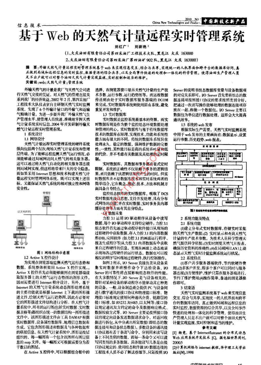 信息技術(shù)mNmh0中曲斯技術(shù)斯產(chǎn)品基于Web的天然氣計(jì)量遠(yuǎn)程實(shí)時(shí)管理系統(tǒng)劉紅廣1劉新艷(1、大慶油田有限賁任公司第四采油廠工程技術(shù)大隊(duì),黑龍江大慶1630002、大慶油田有限貴任公司第四采油廠第四油礦902隊(duì),黑龍江大慶163000摘要:外榆夭然氣計(jì)量遠(yuǎn)程實(shí)時(shí)管理系統(tǒng)基于wb來(lái)實(shí)現(xiàn)信息交互、綜合與共享,實(shí)現(xiàn)統(tǒng)一的人機(jī)界面和跨平臺(tái)的數(shù)據(jù)庫(kù)訪問(wèn),真做到局域和遠(yuǎn)程信息的實(shí)時(shí)監(jiān)控,敦播資源的綜合共享,以及全局事件快速的處理和一體化的科學(xué)管理。使得油田生產(chǎn)管理人員不出戶(hù)就可以對(duì)整個(gè)油田天然氣計(jì)量實(shí)現(xiàn)監(jiān)視、實(shí)時(shí)控制和適當(dāng)?shù)木S護(hù)關(guān)鍵詞;web;天然氣計(jì)量;管理系統(tǒng)輸天然氣的計(jì)量是我廠與天然氣公司進(jìn)選擇,在瀏覽器窗口顯示天然氣計(jì)量的生產(chǎn)技sr的說(shuō)明書(shū)組態(tài)數(shù)據(jù)庫(kù)變量與設(shè)備數(shù)據(jù)項(xiàng)系到我的經(jīng)濟(jì)效益。2002年2月,第四采油廠傳送則由處于實(shí)時(shí)數(shù)據(jù)庫(kù)服務(wù)器端的DCOM據(jù)連接項(xiàng)按照接口協(xié)議的要求按照類(lèi)別分好工程技術(shù)大隊(duì)儀表室自主研制天然氣實(shí)時(shí)監(jiān)測(cè)來(lái)完成實(shí)時(shí)數(shù)據(jù)庫(kù)系統(tǒng)則使用原有系統(tǒng)避免把通過(guò)一次讀寫(xiě)操作能夠處理的數(shù)據(jù)連接項(xiàng)存系統(tǒng),實(shí)現(xiàn)了6個(gè)外輸計(jì)量口的外輸氣和返輸重復(fù)開(kāi)發(fā)和維護(hù)在一起稱(chēng)做一個(gè)數(shù)據(jù)包。 LO Server主要以氣精確計(jì)量。為進(jìn)一步提升我廠外輸天然'生13實(shí)時(shí)數(shù)據(jù)庫(kù)數(shù)據(jù)包為單位進(jìn)行數(shù)據(jù)處理,這樣會(huì)大大提高產(chǎn)管理水平使管理人員快速、準(zhǔn)確地握天然實(shí)時(shí)數(shù)據(jù)是監(jiān)控系統(tǒng)最基本的資源,而實(shí)通訊效率氣計(jì)量系統(tǒng)實(shí)時(shí)信息,2004年開(kāi)發(fā)硏制外輸天時(shí)數(shù)據(jù)庫(kù)則是作為整個(gè)監(jiān)控組態(tài)環(huán)境數(shù)據(jù)處理15系統(tǒng)的web發(fā)布然氣計(jì)量遠(yuǎn)程實(shí)時(shí)管理系統(tǒng)和管理的核心。實(shí)時(shí)數(shù)據(jù)庫(kù)與基于傳統(tǒng)數(shù)據(jù)庫(kù)根據(jù)實(shí)際生產(chǎn)需要,天然氣實(shí)時(shí)監(jiān)測(cè)系統(tǒng)技術(shù)的數(shù)據(jù)庫(kù)在原理、實(shí)現(xiàn)技術(shù)、功能和系統(tǒng)性中用于wb發(fā)布的主要畫(huà)面有數(shù)據(jù)顯示、設(shè)置LI網(wǎng)絡(luò)設(shè)計(jì)能力面有很大的不同。傳統(tǒng)的數(shù)據(jù)庫(kù)系統(tǒng)旨在運(yùn)行參數(shù)歷史趨勢(shì)、web報(bào)表天然氣計(jì)最遠(yuǎn)程實(shí)時(shí)管理系統(tǒng)的硬件系統(tǒng)處理水久、穩(wěn)定的數(shù)據(jù),強(qiáng)調(diào)維護(hù)數(shù)據(jù)的完整縱向包括兩個(gè)層次現(xiàn)場(chǎng)天然氣計(jì)量系統(tǒng)和管理性、一致性其性能H標(biāo)是高的系統(tǒng)吞葉量和低層終端。為∫能夠遠(yuǎn)程監(jiān)測(cè)天然氣運(yùn)行情況,必的代價(jià),并不考慮有關(guān)數(shù)據(jù)及其處理的定時(shí)限須能夠通過(guò)局域網(wǎng)訪問(wèn)天然氣的相關(guān)服務(wù)器。制。這可以通過(guò)將天然氣自動(dòng)化的相關(guān)服務(wù)器連接實(shí)時(shí)數(shù)據(jù)庫(kù),其數(shù)據(jù)和事務(wù)都有顯式定時(shí)而如果采用 Intemet思想和技術(shù)構(gòu)建天然氣計(jì)果而且依賴(lài)下該邏輯結(jié)果所產(chǎn)生的時(shí)間。但實(shí)遠(yuǎn)程實(shí)時(shí)管理網(wǎng)絡(luò)系統(tǒng),既可以實(shí)現(xiàn)十述目時(shí)數(shù)據(jù)庫(kù)并不是數(shù)據(jù)庫(kù)技術(shù)和實(shí)時(shí)系統(tǒng)兩者的標(biāo),又能侏證天然氣系統(tǒng)的相對(duì)獨(dú)立性和網(wǎng)絡(luò)簡(jiǎn)單結(jié)合,它在概念、理論技術(shù)、方法和機(jī)制方安全性面具備白身特點(diǎn)。鳥(niǎo)監(jiān)控組態(tài)軟件的實(shí)時(shí)數(shù)據(jù)庫(kù),吸取了DCS實(shí)時(shí)數(shù)據(jù)庫(kù)設(shè)計(jì)思想,支持并發(fā)處理,具有分布式網(wǎng)絡(luò)的功能并在實(shí)時(shí)數(shù)據(jù)實(shí)時(shí)事務(wù)及內(nèi)部緩存處理等方面有其自身特點(diǎn)以大光判且2態(tài)款骨說(shuō)備是動(dòng)啦物翻14數(shù)據(jù)采集力控3!運(yùn)用W驅(qū)動(dòng)程序從設(shè)備中讀寫(xiě)2系統(tǒng)功能及特點(diǎn)數(shù)據(jù)每個(gè)W驅(qū)動(dòng)程序支持特定硬件。力控3121系統(tǒng)功能組態(tài)軟件首先通過(guò)驅(qū)動(dòng)程軟件接口從現(xiàn)場(chǎng)的建立分布式實(shí)時(shí)數(shù)據(jù)庫(kù)存儲(chǔ)實(shí)時(shí)采集過(guò)程硬件中獲取數(shù)據(jù)存入力控31的內(nèi)部數(shù)據(jù)的天然氣生產(chǎn)數(shù)據(jù);②實(shí)時(shí)顯小和查詢(xún)?nèi)巳粴鈳?kù)①B應(yīng)用軟件(如力控3的畫(huà)面運(yùn)行程序、計(jì)量的生產(chǎn)技術(shù)參數(shù),為技術(shù)人員科學(xué)管理天報(bào)表生成程序等從力控3