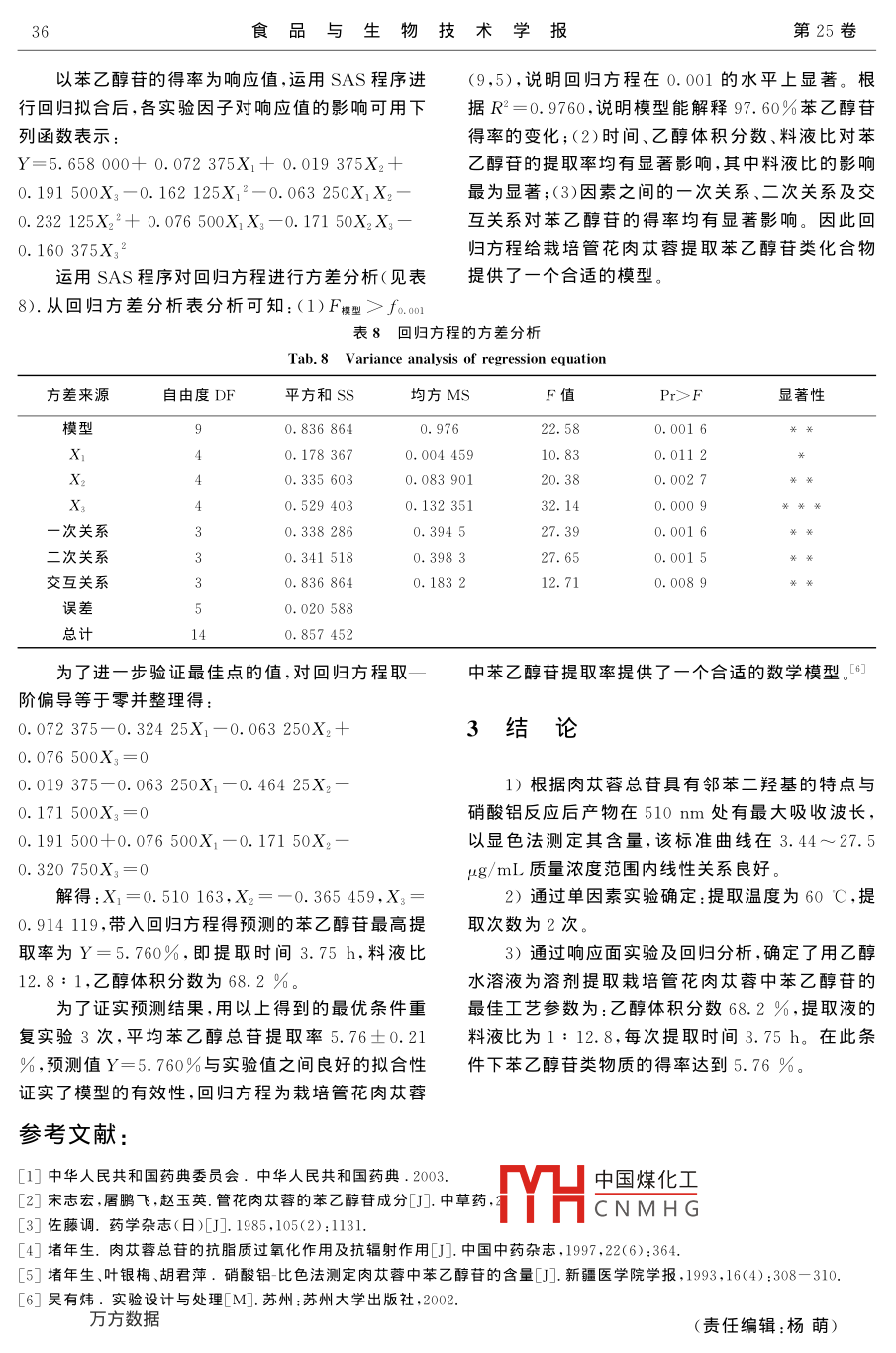 第25卷第3期食品與生物技術(shù)學(xué)報(bào)VoL 25 No. 32006年5月urnal of Food Science and BiotechnologyMay 2006文章編號:1673-1689(2006)03-0033-04栽培管花肉蓯蓉中苯乙醇苷的乙醇提取工藝任璐,顧小紅2,湯堅(jiān)2,陳衛(wèi)1(1.江南大學(xué)食品科學(xué)與安全教育部重點(diǎn)實(shí)驗(yàn)室,江蘇無錫214036;2.江南大學(xué)分析測試中心江蘇無錫214036)摘要:探索了用乙醇回流法從栽培管花肉蓯蓉中提取苯乙醇苷類物質(zhì)的工藝流程。通過單因素和響應(yīng)面實(shí)驗(yàn),對影響苯乙醇苷提取的因素進(jìn)行了探討和研究,運(yùn)用響應(yīng)面分析法確定了提取工藝的最優(yōu)化條件:提取溫度為60C,料液比(g:mL)為1:12.8,提取時(shí)間為3.75h,乙醇體積分?jǐn)?shù)為68.2%,提取次數(shù)2次。在此條件下苯乙醇苷的得率為5.76%關(guān)鍵詞:栽培管花肉蓯蓉;苯乙醇苷;提取;響應(yīng)面分析法(RSA)中圖分類號:Q33文獻(xiàn)標(biāo)識碼:APhenylethanoid glycosides extracting Method from CultivatedCistanche tubulosa (Schenk )R. wight by ethanolREN Lu, GU Xiao-hong*, TANG Jian, CHEN Wei(1. Key Laboratory of Food Science and Safety, Ministry of Education, Southern Yangtze University, Wuxi214036, China; 2. Test and Analysis Center, Southern Yangtze University, Wuxi 214036, China)Abstract: The technology of extracting phenylethanoid glycosides by ethanol from the cultivatedCistanche tubulosa Schenk )R. Wight was studied in this article. The factors affecting thextraction were explored and studied. By the response surface analysis, the optimal parameterswere obtained as following temperature of 60 C, phase ratio of solid to liquid(g: mL) of 112.8, extraction time of 3. 5 h, ethanol to whole extraction system in volume of 68.2%, andexaction in two times. The extraction yield reached 5.76%Key words cultivated Cistanche tubulosa Schenk)R. Wight; phenylethanoid glycosides;extraction; response surface analysis (RSA)肉蓯蓉( Cistanche deserticola y.C.Ma)為列分組成,包括海膽苷、麥角甾苷、順式麥角甾苷、異當(dāng)科肉蓯蓉屬寄生植物,中藥肉蓯蓉為肉蓯蓉的干麥角甾苷、2乙?;溄晴捃?、肉蓯蓉苷等物質(zhì)燥帶鱗葉肉質(zhì)莖,中藥名又稱金筍、地精,俗稱大1985年,日本學(xué)者佐藤調(diào)證眀苯乙醇苷類物質(zhì)能明蕓,其味甘、咸、性溫。歷代經(jīng)書記載肉蓯蓉具顯提高小鼠的性功能,增強(qiáng)學(xué)習(xí)記憶力。1993有補(bǔ)腎陽、益精血、潤腸通便的作用。苯乙醇苷類年,堵年生竿譚討剄肉蓯蓉總苷可以增強(qiáng)化合物( phenylethanoid glycosides,PeG)是肉蓯蓉小中國煤化低血清MDA含量提的主要活性成份,它由咖啡酸、苯乙醇苷元、糖三部高胛CNMHG含量,具有增強(qiáng)免疫、收稿日期:2005-04-18;修回日期:2005-06-19基金項(xiàng)目:國家“863”計(jì)劃項(xiàng)目(2002AA248031)作者簡方鼗鵝(1980),女黑龍江伊春人,食品科學(xué)與工程碩士研究生;*責(zé)任作者34食品與生物技術(shù)學(xué)報(bào)第25卷延緩衰老等作用。1.2.2栽培管花肉蓯蓉中苯乙醇苷提取工藝研究作者通過乙醇回流提取,探討栽培管花肉蓯蓉1)提取溫度對得率的影響稱取20.00g肉中苯乙醇苷類物質(zhì)的提取工藝,采用了響應(yīng)面分析蓯蓉干粉4份,分別加入140mL體積分?jǐn)?shù)為70%法進(jìn)行實(shí)驗(yàn)設(shè)計(jì),利用多元二次回歸方程擬合因素乙醇溶液中,于40,50,60,70℃恒溫加熱回流提取與指標(biāo)之間的函數(shù)關(guān)系,通過對響應(yīng)面的等值線分3.0h,一次提取完畢后抽濾,殘?jiān)酝瑯拥姆椒ㄟM(jìn)析尋求最優(yōu)工藝參數(shù)行二次提取,合并兩次提取液,并用100mL質(zhì)量分?jǐn)?shù)70%的乙醇清洗殘?jiān)?采用1.2.1方法測定苯乙1試驗(yàn)材料與方法醇苷類物質(zhì)的含量。1.1試驗(yàn)材料2)乙醇體積分?jǐn)?shù)對得率的影響稱取20.00g1.1.Ⅰ原料干燥的栽培管花肉蓯蓉肉質(zhì)莖:新肉蓯蓉干粉5份,分別加入140mL不同體積分?jǐn)?shù)疆和田地區(qū)提供,水分質(zhì)量分?jǐn)?shù)為14.5%。(50%、60%、70%、80%、90%)的乙醇溶液中,于1.L.2主要材料乙醇:體積分?jǐn)?shù)95%國藥集60C恒溫加熱回流提取,提取時(shí)間及次數(shù)同上團(tuán)化學(xué)試劑有限公司產(chǎn)品;其他試劑均為分析純。3)料液比對得率的影響稱取20.00g肉蓯1.1.3主要儀器HH-4數(shù)顯恒溫水浴鍋,抽濾瓶蓉干粉5份,分別按料液比為1:5;1:7;1:9;1:及漏斗,紫外分光光度計(jì),電子天平11;1:13(g:mL)加入體積分?jǐn)?shù)70%乙醇中,同1.2試驗(yàn)方法上提取苯乙醇苷類物質(zhì)并測定其含量。1.2.1苯乙醇苷含量的測定4)提取時(shí)間對得率的影響稱取20.00g肉1)苯乙醇苷標(biāo)準(zhǔn)曲線的繪制精確吸取標(biāo)準(zhǔn)艾蓉干粉5份,分別加入體積分?jǐn)?shù)70%乙醇溶液的松果菊苷對照品溶液(0.43mg/mL)溶液10mL220mL…,并于60℃恒溫加熱回流提取1.0、2.0分別吸取以上溶液0.0、1.0、2.0、3.0、4.0、50、“5、4.0h,提取次數(shù)及測定苯乙醇苷的含量同于50mL容量瓶中,用蒸餾水稀釋至刻度,搖勻。3,6.0、7.0、8.0mL置于25mL容量瓶中,各加入質(zhì)5)提取次數(shù)對得率的影響稱取20.00g肉量分?jǐn)?shù)5%亞硝酸鈉1mL,搖勻放置6min,加入質(zhì)蓯蓉干粉4份,分別加入體積分?jǐn)?shù)70%乙醇溶液量分?jǐn)?shù)10%硝酸鋁溶液1mL,搖勻再放置6min220mL,于60℃恒溫加熱回流提取3.5h,并對4加入10%氫氧化鈉溶液10mL,用蒸餾水稀釋至刻份樣品分別進(jìn)行1次,2次,3次,4次提取合并提度,搖勻放置18min后,以第一管為空白,在取液,測