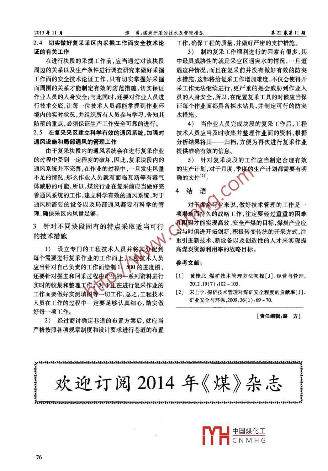 問題探討總第171期doi:10. 3969/j. issn. 1005 - 2798.2013. 11. 030煤炭開采的技術(shù)及管理措施連勇(潞安小南村煤業(yè)公司,山西屯留046100)摘要:為實現(xiàn)延 長礦井的使用年限,優(yōu)化煤炭資源利用率的戰(zhàn)略目標(biāo),文章主要針對復(fù)采塊段的技術(shù)以及管理措施進(jìn)行了粗淺的探討,旨在實踐的過程中探尋有效的煤炭開采技術(shù)和管理措施,既能保證煤炭資源的可持續(xù)利用,又能為國家和人民帶來更高的經(jīng)濟(jì)效益。關(guān)鍵詞:煤炭開采;技術(shù)管理;有效措施中圖分類號:TD823文獻(xiàn)標(biāo)識碼:B文章編號:1005- 2798 (2013)11- 0075- 02隨著經(jīng)濟(jì)的不斷發(fā)展和科學(xué)技術(shù)的進(jìn)步,傳統(tǒng)將這些煤層遺留在礦井內(nèi)?;诖?應(yīng)當(dāng)積極商討的煤炭開采技術(shù)已經(jīng)不能滿足煤炭行業(yè)的開采需求有效的復(fù)采方法和管理措施,盡可能的實施復(fù)采塊了,在科技創(chuàng)造生產(chǎn)力的新形勢下,煤炭行業(yè)只有加段以避免國家的經(jīng)濟(jì)損失和資源的浪費。強技術(shù)管理才能保證生產(chǎn)安全,不僅如此,一流的技2淺談關(guān)于加強復(fù)采塊段技術(shù)管理的幾個術(shù)管理對于煤炭行業(yè)的發(fā)展既具有指導(dǎo)作用,同時有效措施對于煤炭行業(yè)的開采工作又具有規(guī)劃作用。近些年來,煤礦頻繁發(fā)生坍塌等事故,追求其根本原因來2.1重視收集和整理 復(fù)采塊段采空區(qū)、巷道布置、說,很大程度上都是因為工作人員在煤礦的生產(chǎn)過地質(zhì)構(gòu)造等資料的工作程中出現(xiàn)工作失誤或者疏忽而造成的,如果煤炭行負(fù)責(zé)煤炭開采的作業(yè)人員應(yīng)當(dāng)在進(jìn)行復(fù)采工作業(yè)沒有先進(jìn)的技術(shù)管理措施或者并沒有認(rèn)真貫徹技前,認(rèn)真分析研究所要進(jìn)行復(fù)采塊段的地質(zhì)資料、圖術(shù)管理措施,那么,事故的發(fā)生率就會不斷攀升。因紙信息等,切實掌握有關(guān)該區(qū)域的一切資源信息,針此,煤炭企業(yè)應(yīng)當(dāng)切實加強本企業(yè)的技術(shù)管理工作,對采空區(qū)積水區(qū)以及殘留塊段煤柱等作業(yè)條件,更努力提升技術(shù)管理水平,既要為煤礦作業(yè)人員提供.應(yīng)該注重收集整理詳細(xì)資料信息的工作,而且要通安全可靠的環(huán)境保障,又要為國家?guī)砀叩慕?jīng)濟(jì)過認(rèn)真分析資料來準(zhǔn)確的制定復(fù)采方案,與此同時,效益。也可以利用在圖紙上進(jìn)行重點標(biāo)注的方法來完成對復(fù)采塊段的了解工作。1復(fù)采塊段的概念和背景2.2利用 圖紙上的有效信息制定最優(yōu)復(fù)采方案所謂的復(fù)采塊段主要是指在煤礦資源范圍內(nèi)的在復(fù)采工作前,通過對塊段的深人研究以及對一個整體開采區(qū)域或者是一個相對獨立的塊段,運該區(qū)域地質(zhì)進(jìn)行實時預(yù)測、嚴(yán)密的布置巷道等工作用煤礦產(chǎn)業(yè)原有的礦井生產(chǎn)系統(tǒng)和開采設(shè)備對該區(qū)來制定最優(yōu)的復(fù)采施工方案,必須確保復(fù)采方案既域進(jìn)行優(yōu)化改造和開采延伸的-一個過程,通過復(fù)采能保證施工安全可靠,還要確保技術(shù)切實可行。塊段,可以實現(xiàn)對各類邊角塊段煤礦的重新生產(chǎn)。2.3通過制定科學(xué)有效的《作業(yè)規(guī)程》和《安全技這種做法能有效提高資源的回收利用率。對于目前術(shù)措施》來指導(dǎo)煤礦的生產(chǎn)的煤炭行業(yè)來說,由于受到來自技術(shù)水平、管理水一般來說,所有需要進(jìn)行復(fù)采作業(yè)的塊段都存平、設(shè)備科技水平等--系列主客觀原因的制約,一-些在施工難度比較大,施工條件比較艱苦復(fù)雜的問題,礦井在進(jìn)行煤礦開采作業(yè)的過程中,僅僅將礦井的在這種情況下,就需要管理者們制定科學(xué)有效的上分層和中分層進(jìn)行了開采作業(yè),或者在開采的過《作業(yè)規(guī)程》或者是《安全技術(shù)措施》等規(guī)章制度來程中只選取硬度較高的分層和資源較好的部分,留指導(dǎo)并規(guī)范作業(yè)人員的在礦井內(nèi)的操作。值得注意下了底分層和頂層等較軟的煤層。這些沒有被開采的是,在制定《作業(yè)規(guī)程》的時候,應(yīng)當(dāng)切實考慮到的頂層和底層煤礦資源其實都是具有開采利用的價復(fù)采塊段的特點,根據(jù)不同特點的復(fù)采塊段要制定值的,但是由于現(xiàn)有的技術(shù)條件有限等原因,不得不有針對性的防節(jié)共*(U)中國煤化工收稿日期:2013-10-12TTHCNMHG作者簡介:連勇(1975 -) ,男,山西屯留人,助理工程師,從事煤炭開采技術(shù)及官埋⊥F。7.2013年11月連勇:煤炭開采的技術(shù)及管理措 施第22卷第11期2.4切實做好復(fù)采采區(qū)內(nèi)采掘工作面安全技術(shù)論工作,確保工程的質(zhì)量,并做好嚴(yán)密的支護(hù)措施。證的有關(guān)工作3)制約復(fù)采 工作順利進(jìn)行的因素有很多,其在進(jìn)行塊段的采掘工作前,應(yīng)當(dāng)通過對該塊段中最具威脅性的就是采空區(qū)遇突水的情況,一旦遭周邊的關(guān)系以及生產(chǎn)條件進(jìn)行調(diào)查研究來做好采掘遇這種情況,而且在復(fù)采前并沒有做好有效的防突工作面的安全技術(shù)論證工作,只有切實掌握好采掘水措施,這都將給復(fù)采工作