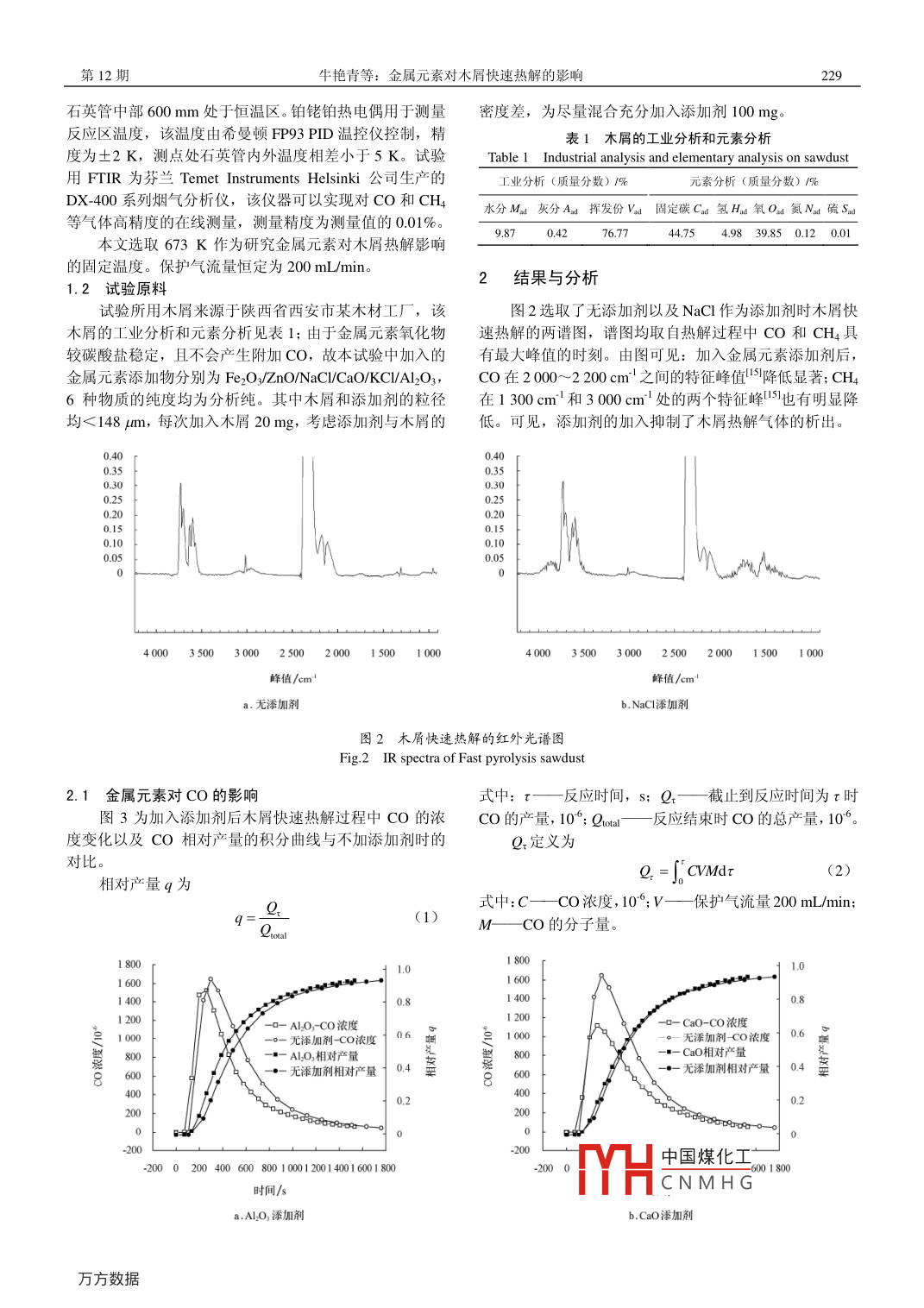 第25卷第12期農(nóng)業(yè)工程學(xué)報(bào)VoL 25 No 1282009年12月Transactions of the csaeDec.2009金屬元素對(duì)木屑快速熱解的影響牛艷青,王學(xué)斌,譚厚章,徐通模,惠世恩,趙欽新,周屈蘭(西安交通大學(xué)動(dòng)力工程多相流國(guó)家重點(diǎn)實(shí)驗(yàn)室,西安710049)摘要:采用傅立葉紅外光譜(FIIR)分析,以木屑為研究對(duì)象,在管式爐中研究了AJCa/Fe/K/Na/Zn金屬元素對(duì)生物質(zhì)快速熱解過程中熱解速率以及CO和CH4析出規(guī)律的影響。FIR分析表明:加入含金屬元素添加劑抑制了CO和CH4的產(chǎn)量,添加劑對(duì)CO產(chǎn)量和CH4產(chǎn)量的抑制能力依次為Fe2O3>ZnO>NaCl>CaO>KC1>A2O3;Al2OyFe2O3ZnO作為添加劑可縮短CO和CH4的析出時(shí)間,其中Fe2O3作用最為顯著,其他添加劑對(duì)析出時(shí)間的影響相對(duì)較小。對(duì)熱解速率的統(tǒng)計(jì)分析表明:加入金屬元素降低了生物質(zhì)的快速熱解速率,熱解反應(yīng)速率大小依次為:不加添加劑>Al2O3>Fe O3>Zno>KcI> Cao> NaCl關(guān)鍵詞:生物質(zhì),熱解,一氧化碳,甲烷,木屑,金屬元素,傅立葉紅外光譜doi:10.3969/jiss.1002-6819.2009.12.040中圖分類號(hào):TK6文獻(xiàn)標(biāo)識(shí)碼:A文章編號(hào):1002-6819(2009)-12-022806牛艷青,王學(xué)斌,譚厚章,等.金屬元素對(duì)木屑快速熱解的影響[].農(nóng)業(yè)工程學(xué)報(bào),2009,25(12):228-233Niu Yanqing, Wang Xuebin, Tan Houzhang, et al. Effect of metal elements on sawdust fast-pyrolysis[J]. Transactions of theCSAE, 2009, 25(12): 228-233. (in Chinese with English abstract)言1試驗(yàn)原料與裝置生物質(zhì)燃料不僅氮硫含量低,而且可再生能實(shí)現(xiàn)1.1試驗(yàn)裝置氧化碳的零排放,因此對(duì)生物質(zhì)燃料的利用成為近年來試驗(yàn)系統(tǒng)如圖1所示:99,9%的高純氮?dú)?室溫)研究的熱點(diǎn)。目前世界各國(guó)對(duì)生物質(zhì)能的利用主要集中分為兩路進(jìn)入石英反應(yīng)器中,使反應(yīng)器內(nèi)保持還原氣氛在生物質(zhì)熱化學(xué)轉(zhuǎn)變的研究,而熱解則是生物質(zhì)在熱化木屑和添加物通過石英反應(yīng)器正上方的給料口由一路氮學(xué)轉(zhuǎn)變中最基本和重要的過程14由于生物質(zhì)中灰份高,氣送入,沉降在反應(yīng)器中部的孔板上進(jìn)行反應(yīng),物料混金屬元素含量豐富,其對(duì)生物質(zhì)大分子分解的影響很合均勻:熱解產(chǎn)物引岀后經(jīng)過二級(jí)過濾裝置以脫除煙氣大5,因此有必要對(duì)生物質(zhì)熱解過程中金屬元素的影響進(jìn)攜帶的固體和焦油等,進(jìn)入傅立葉紅外分析儀(FTIR行硏究。已有學(xué)者對(duì)生物質(zhì)熱解過程中金屬元素的影響進(jìn)行在線分析。通過溫控儀控制反應(yīng)器內(nèi)溫度,反應(yīng)結(jié)進(jìn)行了研究,但由于反應(yīng)條件差異很大,得出的結(jié)論未束通入氧氣使反應(yīng)器內(nèi)殘余固體物質(zhì)燃燒后再將反應(yīng)器盡一致: Pen gmei L和 Desmond研究表明白云石(主內(nèi)的固體清空;并對(duì)每種工況均進(jìn)行重復(fù)性驗(yàn)證試驗(yàn)兩要組分為碳酸鎂與碳酸鈣)可以明顯降低生物質(zhì)熱解過次,誤差不超過5%程中的CO和CH4產(chǎn)量;肖軍和楊昌炎等81的研究則分別指出NO和CaO可以促進(jìn)CO和CH4的生成,Ca和K1.管式爐對(duì)CO和CH4析出的影響不大,溫度對(duì)催化作用的影響2.孔板很大; Demirall2的研究則表明A和Na對(duì)生物質(zhì)熱解氣析出量的影響在不同升溫速率下差別也很大。木屑熱解4.氮?dú)馄?.溫控儀產(chǎn)物主要為CO、CH4、CO2、H,且CO和CH4占絕對(duì)6.給料口優(yōu)勢(shì)。文獻(xiàn)[8,13-14]均表明溫度673K時(shí),生物質(zhì)已開始7.石英反應(yīng)器劇烈熱解,因此本文在管式爐上研究了溫度為673K時(shí)8.過濾裝置1不同金屬元素AlCa/le/KNa/Zn對(duì)木屑快速熱解的影響,9.過濾裝置210用傅立葉紅外光譜(FTIR)分析熱解產(chǎn)物—CO和CH4,10.PC機(jī)并對(duì)添加劑對(duì)木屑熱解速率的影響進(jìn)行了統(tǒng)計(jì)分析。11.FTR分析儀圖1試驗(yàn)系統(tǒng)圖收稿日期:20090409修訂日期:200908-17leccrintion nf tect system基金項(xiàng)目:973國(guó)家基礎(chǔ)研究發(fā)展項(xiàng)目(No.2005CB221206);十一五科技中國(guó)煤化工支撐計(jì)劃(No.2006BAK02B03)石英反應(yīng)CNMH Gn,由于物料少作者簡(jiǎn)介:牛艷青(195-),男,山西長(zhǎng)治人,主要從事清潔燃燒技木研避免了物料在孔極上堆:試驗(yàn)前物料于105℃處于烘干究。西安西安交通大學(xué)熱能工程系,710049。 Email: yqniut00l@ yahoo.cl箱內(nèi),試驗(yàn)期間放于干燥器中。電爐由S讠C元件加熱,第12期牛艷青等:金屬元素對(duì)木屑快速熱解的影響石英管中部600mm處于恒溫區(qū)。鉑銠鉑熱電偶用于測(cè)量密度差,為盡量混合充分加入添加劑100mg反應(yīng)區(qū)溫度,該溫度由希曼頓FP93PID溫控儀控制,精表1木屑的工業(yè)分析和元素分析度為士2K,測(cè)點(diǎn)處石英管內(nèi)外溫度相差小于5K。試驗(yàn) Table 1 Industrial analysis and elementary analysis on sav用FTIR為芬蘭 Temet Instruments helsinki公司生產(chǎn)的工業(yè)分析(質(zhì)量分?jǐn)?shù))/%元素分析(質(zhì)量分?jǐn)?shù))/%DX-400系列煙氣分析儀,該儀器可以實(shí)現(xiàn)對(duì)CO和CH水分Ma灰分Aa揮發(fā)份V固定碳Ca氫Had氧Oa4氮Na硫Sad等氣體高精度的在線測(cè)量,測(cè)量精度為測(cè)量值的0.01%。本文選取673K作為研究金屬