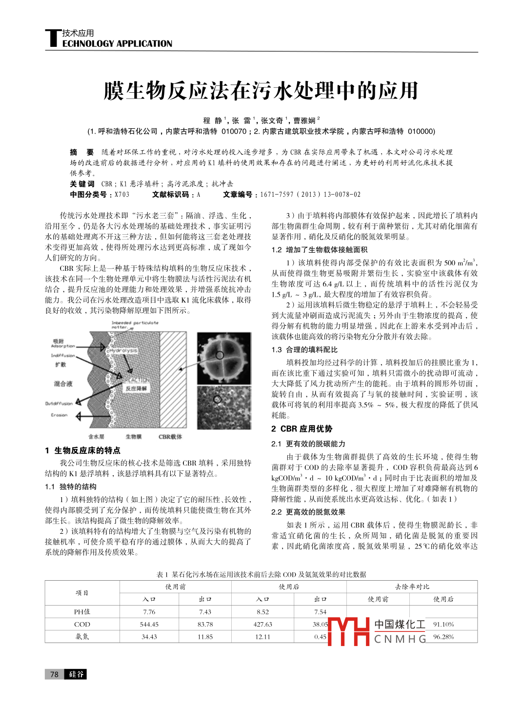 技術(shù)應(yīng)用.ECHNOL .OGY APPL ICATION膜生物反應(yīng)法在污水處理中的應(yīng)用程靜',張雷',張文奇',曹雅嫻2(1.呼和浩特石化公司,內(nèi)蒙古呼和浩特010070 ; 2.內(nèi)蒙古建筑職業(yè)技術(shù)學(xué)院,內(nèi)蒙古呼和浩特010000)摘要隨著對環(huán)保工作的重視,對污水處理的投入逐步增多,為CBR在實(shí)際應(yīng)用帶來了機(jī)遇,本文對公司污水處理場的改造前后的數(shù)據(jù)進(jìn)行分析,對應(yīng)用的K1填料的使用效果和存在的問題進(jìn)行闡述,為更好的利用好流化床技術(shù)提供參考。關(guān)鍵詞CBR; K1懸浮填料;高污泥濃度;抗沖擊中圖分類號:X703文獻(xiàn)標(biāo)識碼: A文章編號: 1671-7597 (2013) 13-0078-02傳統(tǒng)污水處理技術(shù)即“污水老三套”:隔油、浮選、生化,3)由于填料將內(nèi)部膜體有效保護(hù)起來,因此增長了填料內(nèi)沿用至今,仍是各大污水處理場的基礎(chǔ)處理技術(shù),事實(shí)證明污部生物菌群生命周期,較有利于菌種繁衍,尤其對硝化細(xì)菌有水的基礎(chǔ)處理離不開這三種方法,但如何能將這三套老處理技顯著作用,硝化及反硝化的脫氮效果明顯。術(shù)變得更加高效,使得所處理污水達(dá)到更高標(biāo)準(zhǔn),成了現(xiàn)如今1.2增加了生物載體接觸面積人們研究的方向。CBR實(shí)際上是--種基于特殊結(jié)構(gòu)填料的生物反應(yīng)床技術(shù),1)該填料使得內(nèi)部受保護(hù)的有效比表面積為500m2/m',該技術(shù)在同- -個生 物處理單元中將生物膜法與活性污泥法有機(jī)從而使得微生物更易吸附并繁衍生長,實(shí)驗(yàn)室中該載體有效結(jié)合,提升反應(yīng)池的處理能力和處理效果,并增強(qiáng)系統(tǒng)抗沖擊生物濃度可達(dá)6.4g/L以上,而傳統(tǒng)填料中的活性污泥僅為能力。我公司在污水處理改造項(xiàng)目中選取K1流化床載體,取得1.5g/L ~ 3g/L, 最大程度的增加了有效容積負(fù)荷。2)運(yùn)用該填料后微生物穩(wěn)定的懸浮于填料上,不會輕易受良好的收效,其污染物降解原理如下圖所示。到大流量沖刷而造成污泥流失;另外由于生物濃度的提高,使得分解有機(jī)物的能力明顯增強(qiáng),因此在上游來水受到?jīng)_擊后,該載體也能高效的將污染物充分分散并有效去除。1.3合理的填料配比填料投加均經(jīng)過科學(xué)的計算,填料投加后的掛膜比重為1,而在該比重下通過實(shí)驗(yàn)可知,填料只需微小的擾動即可流動,混合液反應(yīng)降解大大降低了風(fēng)力擾動所產(chǎn)生的能耗。由于填料的圓形外切面,旋轉(zhuǎn)自由,從而有效提高了與氧的接觸時間,實(shí)驗(yàn)證明,該載體可將氧的利用率提高3.5% ~ 5%,極大程度的降低了供風(fēng)2 CBR應(yīng)用優(yōu)勢含水層生物膜CBR載體2.1更有效的脫碳能力1生物反應(yīng)床的特點(diǎn)我公司生物反應(yīng)床的核心技術(shù)是篩選CBR填料,采用獨(dú)特由于載體為生物菌群提供了高效的生長環(huán)境,使得生物菌群對于C0D的去除率顯著提升,COD容積負(fù)荷最高達(dá)到6結(jié)構(gòu)的K1懸浮填料,該懸浮填料具有以下顯著特點(diǎn)。kgCOD/m3●d ~ 10 kgCOD/m3●d;同時由于比表面積的增加及1.1獨(dú)特的結(jié)構(gòu)生物菌群類型的多樣化,很大程度上增加了對難降解有機(jī)物的1)填料獨(dú)特的結(jié)構(gòu)(如上圖)決定了它的耐壓性、長效性,降解性能,從而使系統(tǒng)出水更高效達(dá)標(biāo)、優(yōu)化。(如表1)使得內(nèi)部膜受到了充分保護(hù),而傳統(tǒng)填料只能使微生物在其外2.2更高效的脫氮效果部生長。該結(jié)構(gòu)提高了微生物的降解效率。2)該填料特有的結(jié)構(gòu)增大了生物膜與空氣及污染有機(jī)物的如表1所示,運(yùn)用CBR載體后,使得生物膜泥齡長,非接觸機(jī)率,可使介質(zhì)平穩(wěn)有序的通過膜體,從而大大的提高了常適宜硝化菌的生長,眾所周知,硝化菌是脫氮的重要因素,因此硝化菌濃度高,脫氮效果明顯,25 C的硝化效率達(dá)系統(tǒng)的降解作用及傳質(zhì)效果。表1某石化污水場在運(yùn)用該技術(shù)前后去除cOD及氨氮效果的對比數(shù)據(jù)使用前使用后去除率對比項(xiàng)目出口入口吏用后PH值7.767.438.527.54COD544.4583.78427.6338.05中國煤化工_ 91.10%氨氮34.4311.8512.11MHCNMHG 96.28%78硅谷I2013年第13期總第133期SILICON VALLEY與720g NH,-N/m'.d ~ 1000gNH4-N/m',d, 而傳統(tǒng)的活性污積和較高的氧利用率。因此,在設(shè)計中應(yīng)選取普通的穿孔管,泥法在污泥濃度為3g/l的情況下,硝化效率低于100gNHL-N/不需要選取微孔曝氣器??紤]到投加填料后,曝氣設(shè)施檢修需m'.d~200gNH,-N/m2.d。通過增加前置反硝化段還能去除要撈取全部調(diào)料,故在曝氣管的選材上需要滿足必要的強(qiáng)度、系統(tǒng)總氮,脫氮效果達(dá)1100gNH4-N/m'●d (25C )。耐腐蝕、檢修周期長的材料。2.3控制出水水質(zhì)平穩(wěn)3.3分隔格網(wǎng)前需要配置沖掃風(fēng)或反吹風(fēng)CBR能夠獲得穩(wěn)定的出水水質(zhì)主要得益與該工藝很強(qiáng)的抗由于K1填料會隨著供風(fēng)和水流的影響而移動,往往在配風(fēng)沖擊負(fù)荷能力。CBR載體上高濃度的生物菌數(shù)及強(qiáng)有力的吸附調(diào)整不佳的情況下,出現(xiàn)堆積問題,為了方便操作和控制,建運(yùn)行方式使有效反應(yīng)空間內(nèi)始終保持高的生物濃度,上游來水議在分隔格網(wǎ