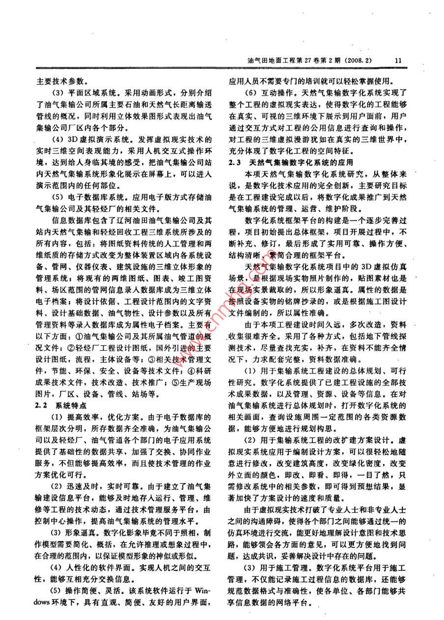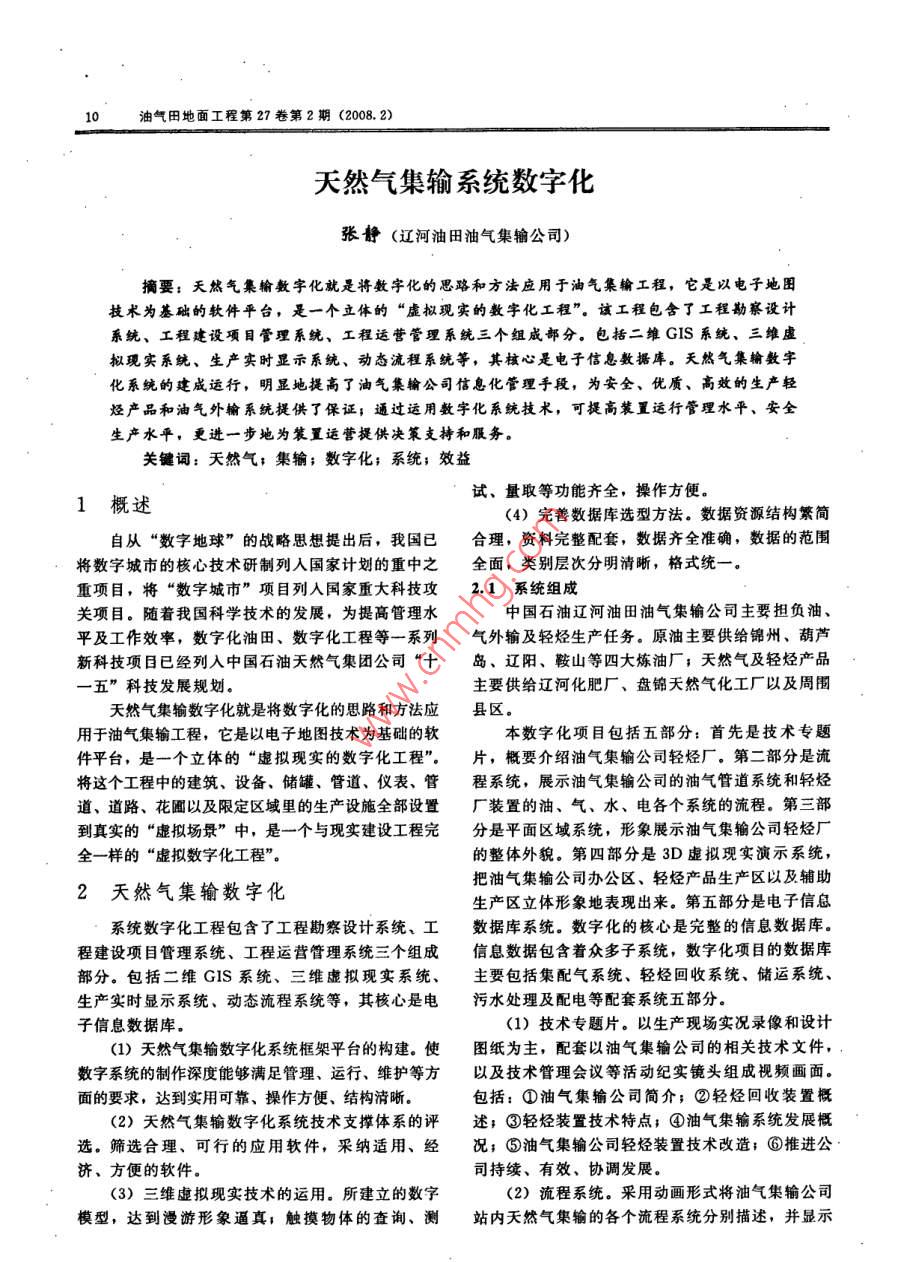 1油氣田地面工程第27卷第2期(2008. 2)天然氣集輸系統(tǒng)數(shù)字化張靜(遼河油田油氣集輸公司)摘要:天然氣集輸數(shù)字化就是將數(shù)字化的思路和方法應用于油氣集輸工程,它是以電子地圖技術為基礎的軟件平臺,是一個立體的“虛擬現(xiàn)實的數(shù)字化工程”。該工程包含了工程勘察設計系統(tǒng)、工程建設項目管理系統(tǒng)、工程運營管理系統(tǒng)三個組成部分。包括二維GIS系統(tǒng)、三維虛擬現(xiàn)實系統(tǒng)、生產(chǎn)實時顯示系統(tǒng)、動態(tài)流程系統(tǒng)等,其核心是電子信息數(shù)據(jù)庫。天然氣集輸數(shù)字化系統(tǒng)的建成運行,明顯地提高了油氣集輸公司信息化管理手段,為安全、優(yōu)質(zhì)、高效的生產(chǎn)輕烴產(chǎn)品和油氣外輸系統(tǒng)提供了保證;通過運用數(shù)字化系統(tǒng)技術,可提高裝置運行管理水平、安全生產(chǎn)水平,更進一步地為裝置運營提供決策支持和服務。關鍵詞:天然氣:集輸;數(shù)字化;系統(tǒng);效益試、量取等功能齊全,操作方便。1概述(4)完善數(shù)據(jù)庫選型方法。數(shù)據(jù)資源結(jié)構(gòu)繁簡自從“數(shù)字地球”的戰(zhàn)略思想提出后,我國已合理,資料完整配套,數(shù)據(jù)齊全準確,數(shù)據(jù)的范圍.將數(shù)字城市的核心技術研制列人國家計劃的重中之全面,類別層次分明清晰,格式統(tǒng)-。重項目,將“數(shù)字城市”項目列人國家重大科技攻2.1系統(tǒng)組成關項目。隨著我國科學技術的發(fā)展,為提高管理水中國石油遼河油田油氣集輸公司主要擔負油、平及工作效率,數(shù)字化油田、數(shù)字化工程等一系列氣外輸及輕烴生產(chǎn)任務。原油主要供給錦州、葫蘆新科技項目已經(jīng)列入中國石油天然氣集團公司“十島、遼陽、鞍山等四大煉油廠;天然氣及輕烴產(chǎn)品-五”科技發(fā)展規(guī)劃。主要供給遼河化肥廠、盤錦天然氣化工廠以及周圍天然氣集輸數(shù)字化就是將數(shù)字化的思路和方法應縣區(qū)。用于油氣集輸工程,它是以電子地圖技術為基礎的軟本數(shù)字化項目包括五部分:首先是技術專題件平臺,是一個立體的“虛擬現(xiàn)實的數(shù)字化工程"。片,概要介紹油氣集輸公司輕烴廠。第二部分是流將這個工程中的建筑、設備、儲罐、管道、儀表、管程系統(tǒng),展示油氣集輸公司的油氣管道系統(tǒng)和輕烴道、道路、花圃以及限定區(qū)域里的生產(chǎn)設施全部設置廠裝置的油、氣、水、電各個系統(tǒng)的流程。第三部到真實的“虛擬場景”中,是一個與現(xiàn)實建設工程完分是平面區(qū)域系統(tǒng),形象展示油氣集輸公司輕烴廠全-樣的“虛擬數(shù)字化工程”。的整體外貌。第四部分是3D虛擬現(xiàn)實演示系統(tǒng),把油氣集輸公司辦公區(qū)、輕烴產(chǎn)品生產(chǎn)區(qū)以及輔助2天然氣集輸數(shù)字化生產(chǎn)區(qū)立體形象地表現(xiàn)出來。第五部分是電子信息系統(tǒng)數(shù)字化工程包含了工程勘察設計系統(tǒng)、工數(shù)據(jù)庫系統(tǒng)。數(shù)字化的核心是完整的信息數(shù)據(jù)庫。程建設項目管理系統(tǒng)、工程運營管理系統(tǒng)三個組成信息數(shù)據(jù)包含著眾多子系統(tǒng),數(shù)字化項目的數(shù)據(jù)庫部分。包括二維GIS系統(tǒng)、三維虛擬現(xiàn)實系統(tǒng)、主要包括集配氣系統(tǒng)、輕烴回收系統(tǒng)、儲運系統(tǒng)、.生產(chǎn)實時顯示系統(tǒng)、動態(tài)流程系統(tǒng)等,其核心是電污水處理及配電等配套系統(tǒng)五部分。子信息數(shù)據(jù)庫.(1)技術專題片。以生產(chǎn)現(xiàn)場實況錄像和設計(1)天然氣集輸數(shù)字化系統(tǒng)框架平臺的構(gòu)建。使圖紙為主,配套以油氣集輸公司的相關技術文件,數(shù)字系統(tǒng)的制作深度能夠滿足管理、運行、維護等方以及技術管理會議等活動紀實鏡頭組成視頻畫面。面的要求,達到實用可靠、操作方便、結(jié)構(gòu)清晰。包括:①油氣集輸公司簡介;②輕烴回收裝置概(2)天然氣集輸數(shù)字化系統(tǒng)技術支撐體系的評述;③輕烴裝置技術特點;④油氣集輸系統(tǒng)發(fā)展概選。篩選合理、可行的應用軟件,采納適用、經(jīng)況;⑤油氣集輸公司輕烴裝置技術改造;⑥推進公濟、方便的軟件。司持續(xù)、有效、協(xié)調(diào)發(fā)展。(3)三維虛擬現(xiàn)實技術的運用。所建立的數(shù)字(2)流程系統(tǒng)。采用動畫形式將油氣集輸公司模型,達到漫游形象逼真;觸摸物體的查詢、測站內(nèi)天然氣集輸?shù)母鱾€流程系統(tǒng)分別描述,并顯示油氣田地面工程第27卷第2期(2008. 2)1主要技術參數(shù)。應用人員不需要專門的培訓就可以輕松掌握使用。(3) 平面區(qū)域系統(tǒng)。采用動畫形式,分別介紹(6)互動操作。天然氣集輸數(shù)字化系統(tǒng)實現(xiàn)了了油氣集輸公司所屬主要石油和天然氣長距離輸送整個工程的虛擬現(xiàn)實表達,使得數(shù)字化的工程能夠管線的概況,同時利用立體效果圖形式表現(xiàn)出油氣在真實、可視的三維環(huán)境下展示到用戶面前,用戶集輸公司廠區(qū)內(nèi)各個部分。通過交互方式對工程的公用信息進行查詢和操作,(4) 3D虛擬演示系統(tǒng)。發(fā)揮虛擬現(xiàn)實技術的對工程的三維虛擬漫游猶如在真實的三維世界中,實時三維