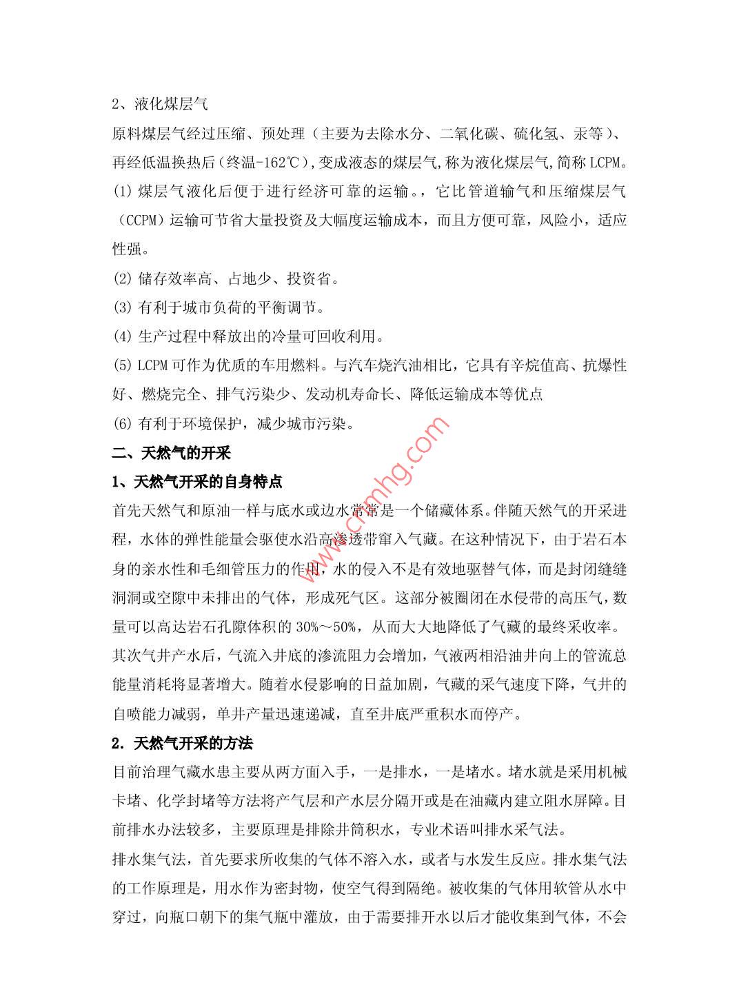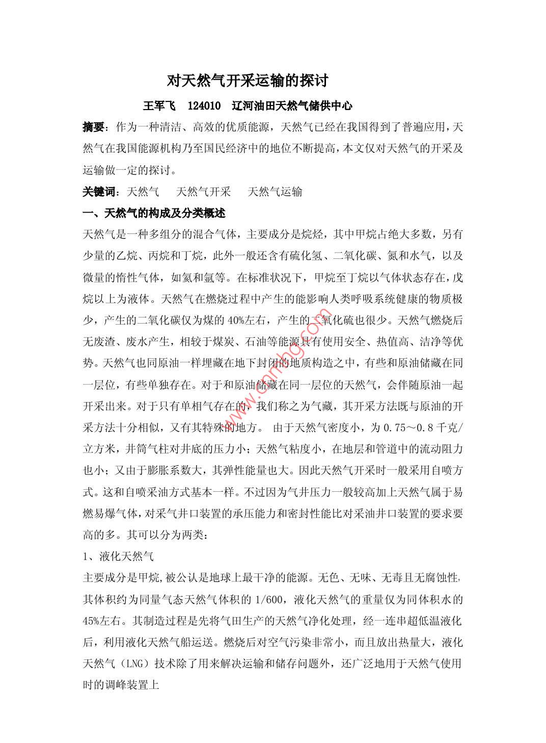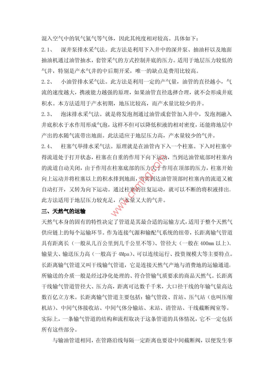 對(duì)天然氣開(kāi)采運(yùn)輸?shù)奶接懲踯婏w124010遼河油田天然氣儲(chǔ)供中心摘要:作為一種清潔、高效的優(yōu)質(zhì)能源,天然氣已經(jīng)在我國(guó)得到了普遍應(yīng)用,天然氣在我國(guó)能源機(jī)構(gòu)乃至國(guó)民經(jīng)濟(jì)中的地位不斷提高,本文僅對(duì)天然氣的開(kāi)采及運(yùn)輸做一定的探討關(guān)鍵詞:天然氣天然氣開(kāi)采天然氣運(yùn)輸天然氣的構(gòu)成及分類概述天然氣是一種多組分的混合氣體,主要成分是烷烴,其中甲烷占絕大多數(shù),另有少量的乙烷、丙烷和丁烷,此外一般還含有硫化氫、二氧化碳、氮和水氣,以及微量的惰性氣體,如氦和氬等。在標(biāo)準(zhǔn)狀況下,甲烷至丁烷以氣體狀態(tài)存在,戊烷以上為液體。天然氣在燃燒過(guò)程中產(chǎn)生的能影響人類呼吸系統(tǒng)健康的物質(zhì)極少,產(chǎn)生的二氧化碳僅為煤的40%左右,產(chǎn)生的二氧化硫也很少。天然氣燃燒后無(wú)廢渣、廢水產(chǎn)生,相較于煤炭、石油等能源具有使用安全、熱值高、潔凈等優(yōu)勢(shì)。天然氣也同原油一樣埋藏在地下封閉的地質(zhì)構(gòu)造之中,有些和原油儲(chǔ)藏在同一層位,有些單獨(dú)存在。對(duì)于和原油儲(chǔ)藏在同一層位的天然氣,會(huì)伴隨原油一起開(kāi)采出來(lái)。對(duì)于只有單相氣存在的,我們稱之為氣藏,其開(kāi)采方法既與原油的開(kāi)采方法十分相似,又有其特殊的地方。由于天然氣密度小,為0.75~0.8千克/立方米,井筒氣柱對(duì)井底的壓力小;天然氣粘度小,在地層和管道中的流動(dòng)阻力也小;又由于膨脹系數(shù)大,其彈性能量也大。因此天然氣開(kāi)采時(shí)一般采用自噴方式。這和自噴采油方式基本一樣。不過(guò)因?yàn)闅饩畨毫σ话爿^高加上天然氣屬于易燃易爆氣體,對(duì)采氣井口裝置的承壓能力和密封性能比對(duì)采油井口裝置的要求要高的多。其可以分為兩類:1、液化天然氣主要成分是甲烷,被公認(rèn)是地球上最干凈的能源。無(wú)色、無(wú)味、無(wú)毒且無(wú)腐蝕性,其體積約為同量氣態(tài)天然氣體積的1/600,液化天然氣的重量?jī)H為同體積水的45%左右。其制造過(guò)程是先將氣田生產(chǎn)的天然氣凈化處理,經(jīng)一連串超低溫液化后,利用液化天然氣船運(yùn)送。燃燒后對(duì)空氣污染非常小,而且放出熱量大,液化天然氣(LNG)技術(shù)除了用來(lái)解決運(yùn)輸和儲(chǔ)存問(wèn)題外,還廣泛地用于天然氣使用時(shí)的調(diào)峰裝置上2、液化煤層氣原料煤層氣經(jīng)過(guò)壓縮、預(yù)處理(主要為去除水分、二氧化碳、硫化氫、汞等)、再經(jīng)低溫?fù)Q熱后(終溫-162℃),變成液態(tài)的煤層氣,稱為液化煤層氣,簡(jiǎn)稱LCPM。(1)煤層氣液化后便于進(jìn)行經(jīng)濟(jì)可靠的運(yùn)輸。,它比管道輸氣和壓縮煤層氣(CCPM)運(yùn)輸可節(jié)省大量投資及大幅度運(yùn)輸成本,而且方便可靠,風(fēng)險(xiǎn)小,適應(yīng)性強(qiáng)。(2)儲(chǔ)存效率高、占地少、投資省。(3)有利于城市負(fù)荷的平衡調(diào)節(jié)。(4)生產(chǎn)過(guò)程中釋放出的冷量可回收利用(5)LC甽M可作為優(yōu)質(zhì)的車用燃料。與汽車燒汽油相比,它具有辛烷值高、抗爆性好、燃燒完全、排氣污染少、發(fā)動(dòng)機(jī)壽命長(zhǎng)、降低運(yùn)輸成本等優(yōu)點(diǎn)(6)有利于環(huán)境保護(hù),減少城市污染。天然氣的開(kāi)采1、天然氣開(kāi)采的自身特點(diǎn)首先天然氣和原油一樣與底水或邊水常常是一個(gè)儲(chǔ)藏體系。伴隨天然氣的開(kāi)采進(jìn)程,水體的彈性能量會(huì)驅(qū)使水沿高滲透帶竄入氣藏。在這種情況下,由于巖石本身的親水性和毛細(xì)管壓力的作用,水的侵入不是有效地驅(qū)替氣體,而是封閉縫縫洞洞或空隙中未排岀的氣體,形成死氣區(qū)。這部分被圈閉在水侵帶的高壓氣,數(shù)量可以高達(dá)巖石孔隙體積的30%~50%,從而大大地降低了氣藏的最終采收率其次氣井產(chǎn)水后,氣流入井底的滲流阻力會(huì)增加,氣液兩相沿油井向上的管流總能量消耗將顯著增大。隨著水侵影響的日益加劇,氣藏的采氣速度下降,氣井的自噴能力減弱,單井產(chǎn)量迅速遞減,直至井底嚴(yán)重積水而停產(chǎn)。2.天然氣開(kāi)采的方法目前治理氣藏水患主要從兩方面入手,一是排水,一是堵水。堵水就是采用機(jī)械卡堵、化學(xué)封堵等方法將產(chǎn)氣層和產(chǎn)水層分隔開(kāi)或是在油藏內(nèi)建立阻水屏障。目前排水辦法較多,主要原理是排除井筒積水,專業(yè)術(shù)語(yǔ)叫排水采氣法排水集氣法,首先要求所收集的氣體不溶入水,或者與水發(fā)生反應(yīng)。排水集氣法的工作原理是,用水作為密封物,使空氣得到隔絕。被收集的氣體用軟管從水中穿過(guò),向瓶口朝下的集氣瓶中灌放,由于需要排開(kāi)水以后才能收集到氣體,不會(huì)混入空氣中的氧氣氮?dú)獾葰怏w,因此其純度相對(duì)較高。具體如下:2.1、深井泵排水采氣法。此方法是利用下入井中的深井泵、抽油桿以及地面抽油機(jī)通過(guò)油管抽水,套管采氣的方式控制井底的壓力。適用于地層壓力較低的氣井,特別是產(chǎn)水氣井的中后期開(kāi)采,唯一的缺點(diǎn)是費(fèi)用比較高。2.2、小油管排水采氣法。此方法是利用一定的產(chǎn)氣量,油管的直徑越小,氣流