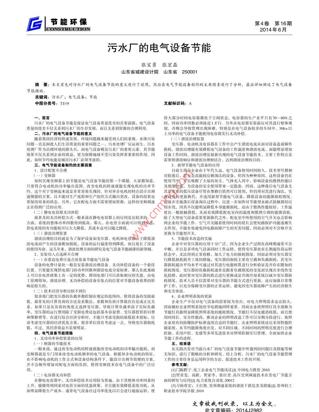 節(jié)能環(huán)保第4卷第16期G|CONSTRUCTION2014年6月污水廠的電氣設(shè)備節(jié)能張寶勇張宏磊山東省城建設(shè)計院山東省250001商要:本文首先對污水廠的電氣設(shè)備節(jié)能的意義進行了說明,然后在電氣節(jié)能設(shè)備制約的主要因素進行了分析,最后詳細闡述了電氣設(shè)備節(jié)能措施關(guān)鍵詞:污水廠;電氣設(shè)備;節(jié)能中圖分類號: TE08文獻標識碼: A得大部分時間電容器都處于空閑狀態(tài),電容器的生產(chǎn)水平只有70--80%之污水廠的電氣設(shè)備節(jié)能是保證電氣設(shè)備質(zhì)量優(yōu)劣的首要前提,電氣設(shè)備間,因而功率因數(shù)必須接近1才行。另外在電容器安裝前應(yīng)對其進行整體規(guī)量的優(yōu)劣不僅關(guān)系到污水廠的生存發(fā)展,祖關(guān)系到資源的合理利用。劃,否則會導致管理出現(xiàn)困難,特別是在電氣設(shè)備較多的車間中,38Kw以三、污水廠的電氣設(shè)備節(jié)能的意義上功率的電氣設(shè)備才能使用電容器實行無功補償。隨著我國經(jīng)濟的快速發(fā)展,環(huán)境問題越來越受到人們的重視。水體污染問題-一直是困擾人們生活質(zhì)量的重要問題之一.污水處理廠應(yīng)運而生。污水變壓器、電動機及電容器在工作中會產(chǎn)生諧波電流從而對設(shè)備造成額外外海廠作生治陽環(huán)域苗排匯莊而由與設(shè)農(nóng)剛縣法水廠的重重元去甘告能效果不僅關(guān)系到企業(yè)的效益,更為保陳地珠不受活體發(fā)揮者重要的作用。國設(shè)備工作時間能有效降低電氣設(shè)備的工作溫度和諧波電流,而能明顯增加用。因設(shè)備工作時間。諧波治理是最新出現(xiàn)的電氣設(shè)備節(jié)能技術(shù),主要工作特點是效果不僅天系到企業(yè)的效益,史為保障地球1此,如何節(jié)約電能是城市污水廠必須考慮的。需要將諧波響應(yīng)和諧波治理相結(jié)合,達到諧波治理的目的。三、電氣節(jié)能設(shè)備制約的主要因素2、新型節(jié)能電氣設(shè)備的應(yīng)用1.設(shè)計配置不合理目前大部分企業(yè)由于年代久遠,電氣設(shè)備使用時間較久,技術(shù)型號都相(一)變頻器對較落后,甚至是高能耗應(yīng)被淘汰的設(shè)備,但因為種種原因,這些設(shè)備仍在如何實現(xiàn)變頻:器上的節(jié)能是電氣設(shè)備節(jié)能的第一個課題。 大家都知道,使用當中, 并且吸附了大量的灰塵、氣體充人其中,影響設(shè)備的散熱性能以只要符合電動機的功率輸出范圍,改變電機的轉(zhuǎn)速就能實現(xiàn)電機的功率節(jié)及絕緣性能,為設(shè)備的安全使用帶來-定隱患。因而,這種落后電氣設(shè)備尤約。這個對于變頻起來說是非常容易實現(xiàn)的,針對異步電機的特點設(shè)計出調(diào)其是 重要的低壓設(shè)備盡管在維修后依然可以使用,但仍須對其進行淘汰,實速便捷的方案,且不能對生產(chǎn)流程和生產(chǎn)組織方式做出更改,設(shè)備的組裝也現(xiàn)設(shè) 備的更新?lián)Q代,并選用新型節(jié)能電氣設(shè)備,降低設(shè)備的能源損耗情況。要保持原來的狀態(tài)。另外,它在配電方面不需要增加資源,這樣的變頻調(diào)速在 逐步實施落后設(shè)備淘汰過程中,應(yīng)進一一步 加快對節(jié)能型永磁式接觸器的應(yīng)正在得到廣泛的應(yīng)用。用步伐,因其不僅能明顯降低本身能源損耗,還由于散熱性能較好,工作溫(二)靜電電容器無功補償度比一-般接觸器低,從而有效降低配電室內(nèi)的溫度和散熱空調(diào)的能源消耗。最普及的無功補償方式- -般來說在靜電電容器上的應(yīng)用是比較多的。除了大型電氣設(shè)備需要更新?lián)Q代之外,配電室中所使用的空氣開關(guān)也會影響方面,系統(tǒng)的整體功率因數(shù)得到提高,那么,在電價方面就可以得到實惠:到 企業(yè)的節(jié)能工作。空氣開關(guān)隨著使用時間的延長會使短路保護功能逐漸失供電系統(tǒng)的有功能耗可以大大降低,其成本也可以隨之降低。去作用,不能有效避免因電路故障產(chǎn)生的災(zāi)害問題,因而必須對不合格開關(guān)(三)諧波治理裝置更換為節(jié)能型開關(guān)。諧波治理的目的就是為了保護設(shè)備如變壓器、電機和電容器由于降低諧3、節(jié)能技術(shù)改造的實施波電流而產(chǎn)生的設(shè)備附加損耗,設(shè)備的運行溫度得到降低,而且延長了設(shè)備企業(yè)中對變壓器的應(yīng)用十分廣泛,因為企業(yè)生產(chǎn)過程在高峰期通常不會的使用壽命。這幾年來,諧波處理方面的研究是電氣設(shè)備節(jié)能減排的新領(lǐng)域。中斷,并且是多項電氣設(shè)備同時工作運轉(zhuǎn),使得變壓器處在長期超負荷運轉(zhuǎn)2、安裝切人點選擇不合理狀態(tài)中,無法得到正常檢修,加大了電力的損耗情況。因而必須對變壓器實(一)在靠近電費計量點處裝備節(jié)能電氣設(shè)備行降低損耗提升工效的措施,變壓器的損耗主要有空載和負載損耗,若變壓設(shè)備的電費計量處一般是安裝諧波治理設(shè)備、無功補償設(shè)備的一-個最佳器損耗超出平均水平可通過對其進行電能核算進行分析驗證是否存在附加的位置。只要能實現(xiàn)供電部門]的功率因數(shù)和諧波電流分量標準,那么在此基礎(chǔ)損耗情況。 變壓器的負載損耗通常是跟著負載情況的變化而呈現(xi