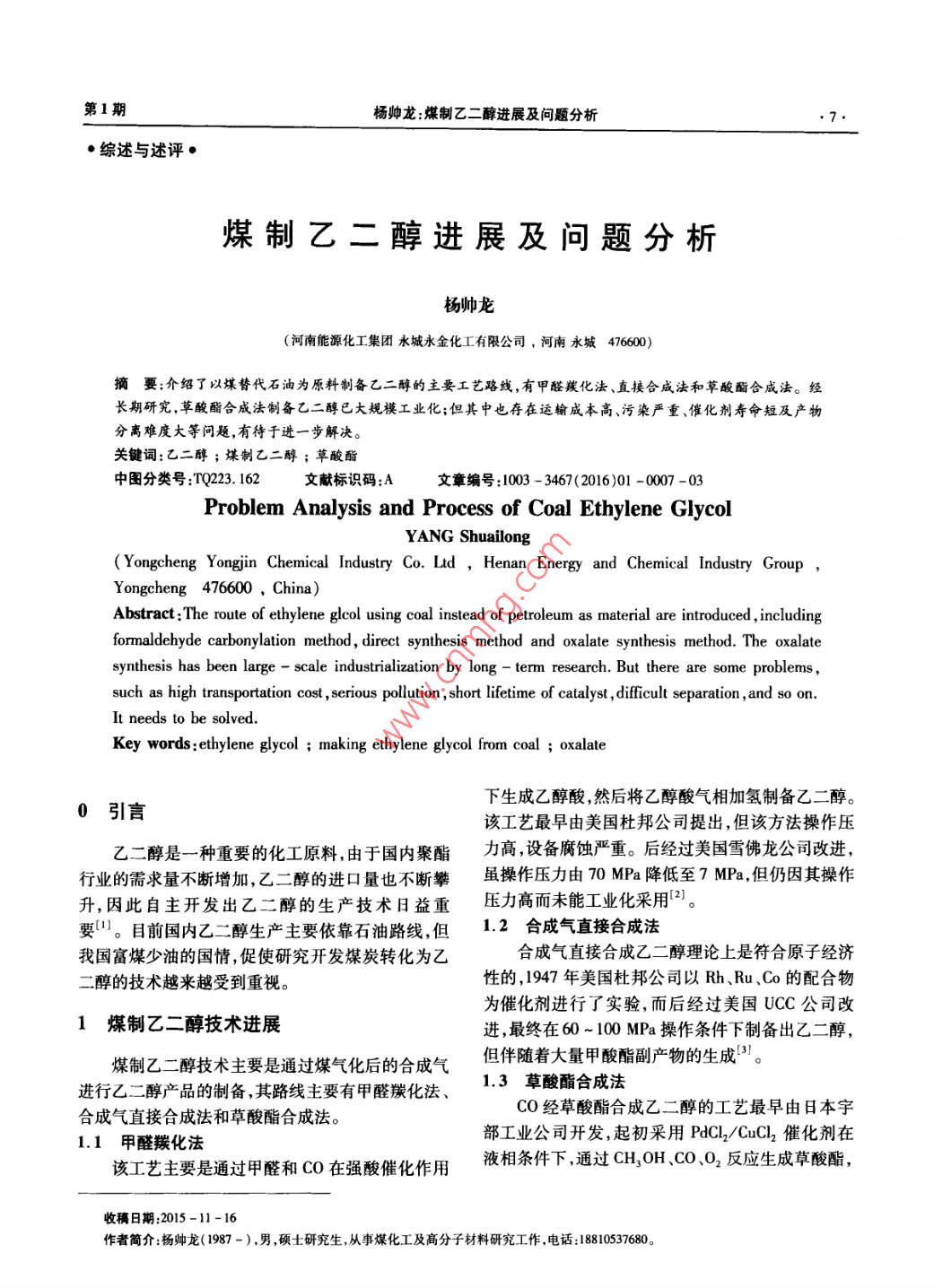 第1期楊帥龍:煤制乙二醇進(jìn)展及問(wèn)題分析·綜述與述評(píng)煤制乙二醇進(jìn)展及問(wèn)題分析楊帥龍(河南能源化工集團(tuán)永城永金化工有限公司,河南永城476600摘要;介紹了以煤替代石油為原料制備乙二醇的主要工藝路線,有甲醛羰化法、直接合成法和草酸酯合成法。經(jīng)長(zhǎng)期研究,草酸酯合成法制備乙二醇已大規(guī)模工業(yè)化;但其中也存在運(yùn)輸成本高、污染嚴(yán)重、催化劑壽命短及產(chǎn)物分離難度大等問(wèn)題,有待于進(jìn)一步解決。關(guān)鍵詞:乙二醇;煤制乙二醇;草酸酯中圖分類號(hào):TQ23.162文獻(xiàn)標(biāo)識(shí)碼:A文章編號(hào):1003-3467(2016)01-0007-03Problem Analysis and Process of Coal Ethylene GlycolYANG ShuailongYongcheng Yongjin Chemical Industry Co. Ltd Henan Energy and Chemical Industry GroupYongcheng 476600, China)Abstract: The route of ethylene glcol using coal instead of petroleum as material are introduced, includingformaldehyde carbonylation method, direct synthesis method and oxalate synthesis method. The oxalatesynthesis has been large scale industrialization by long-term research. But there are some problemssuch as high transportation cost, serious pollution, short lifetime of catalyst, difficult separation, and so onIt needs to be solvedKey words: ethylene glycol making ethylene glycol from coal; oxalate下生成乙醇酸,然后將乙醇酸氣相加氫制備乙二醇0引言該工藝最早由美國(guó)杜邦公司提出,但該方法操作壓乙二醇是一種重要的化工原料,由于國(guó)內(nèi)聚酯力高,設(shè)備腐蝕嚴(yán)重。后經(jīng)過(guò)美國(guó)雪佛龍公司改進(jìn)行業(yè)的需求量不斷增加,乙二醇的進(jìn)口量也不斷攀雖操作壓力由70MPa降低至7MPa,但仍因其操作升,因此自主開(kāi)發(fā)出乙二醇的生產(chǎn)技術(shù)日益重壓力高而未能工業(yè)化采用。要。目前國(guó)內(nèi)乙二醇生產(chǎn)主要依靠石油路線但1.2合成氣直接合成法我國(guó)富煤少油的國(guó)情,促使研究開(kāi)發(fā)煤炭轉(zhuǎn)化為乙合成氣直接合成乙二醇理論上是符合原子經(jīng)濟(jì)二醇的技術(shù)越來(lái)越受到重視。性的,1947年美國(guó)杜邦公司以Rh、Ru、Co的配合物為催化劑進(jìn)行了實(shí)驗(yàn),而后經(jīng)過(guò)美國(guó)UC公司改1煤制乙二醇技術(shù)進(jìn)展進(jìn),最終在60~100MPa操作條件下制備出乙二醇,煤制乙二醇技術(shù)主要是通過(guò)煤氣化后的合成氣但伴隨著大量甲酸酯副產(chǎn)物的生成。進(jìn)行乙二醇產(chǎn)品的制備,其路線主要有甲醛羰化法、1.3草酸酯合成法合成氣直接合成法和草酸酯合成法CO經(jīng)草酸酯合成乙二醇的工藝最早由日本宇1.1甲醛羰化法部工業(yè)公司開(kāi)發(fā),起初采用PdCl2/CuCl2催化劑在該工藝主要是通過(guò)甲醛和CO在強(qiáng)酸催化作用液相條件下,通過(guò)CH, OH CO, O2反應(yīng)生成草酸酯,收稿日期:2015-11-16作者簡(jiǎn)介楊帥龍(1987-),男,碩士研究生,從事煤化工及高分子材料研究工作,電話:18810537680。河南化工8HENAN CHEMICAL INDUSTRY2016年第33卷然后經(jīng)過(guò)加氫制備出乙二醇。但該反應(yīng)副產(chǎn)物較多,而且設(shè)備腐蝕嚴(yán)重“。后經(jīng)過(guò)日本宇部興產(chǎn)公2煤制乙二醇存在問(wèn)題司和美國(guó)聯(lián)碳公司合作開(kāi)發(fā)草酸二烷基酯合成工2.1運(yùn)輸問(wèn)題藝5,采用亞硝酸丁酯作為助劑,在8-11MPa和煤制乙二醇是以煤炭為基礎(chǔ)原料,我國(guó)華北和90~110℃條件下反應(yīng)生成草酸酯,解決了設(shè)備腐西北區(qū)的煤炭?jī)?chǔ)量占全國(guó)煤炭?jī)?chǔ)量的50%和30%蝕問(wèn)題。但總體來(lái)說(shuō),液相條件下合成草酸酯易造左右,而聚酯工業(yè)多分布于東南,浙江和江蘇分別占成催化劑活性組分流失,而且其對(duì)反應(yīng)生成的水分40%和34%。煤制乙二醇項(xiàng)目建設(shè)在富煤地區(qū),即控制嚴(yán)格等,限制了其工業(yè)化。日本宇部興產(chǎn)公司華北和西北生產(chǎn)出的乙二醇再銷往東南地區(qū),需長(zhǎng)開(kāi)發(fā)了氣相條件下合成乙二醇的工藝,在0.5MPa距離運(yùn)輸,其運(yùn)輸條件受到限制,也增大了運(yùn)輸成和80~150℃條件下即可進(jìn)行反應(yīng),而且通過(guò)了本9。480h的穩(wěn)定連續(xù)運(yùn)行,并進(jìn)行了小型工業(yè)化生產(chǎn)。2.2污染問(wèn)題國(guó)內(nèi)許多高校及研究單位也進(jìn)行深人研究由于煤制乙二醇工藝生產(chǎn)直接采用CO、NO、O22005年華東理工大學(xué)重點(diǎn)實(shí)驗(yàn)室和上海焦化達(dá)成及亞酯氣進(jìn)行反應(yīng),這些氣體中含有部分惰性氣體,合作開(kāi)發(fā)協(xié)議,通過(guò)研究,成功開(kāi)發(fā)了30a的合成隨著反應(yīng)的不斷進(jìn)行,會(huì)產(chǎn)生雜質(zhì)氣體(甲烷、CO2氣制乙二醇技術(shù)。雖然成功制備出聚酯級(jí)乙二醇,NO2),同時(shí)原來(lái)系統(tǒng)內(nèi)的惰性氣體將不斷累積,會(huì)但相應(yīng)的問(wèn)題也暴露出來(lái)如催化劑壽命短反應(yīng)器影響到生產(chǎn)的正常進(jìn)行,因此需要不斷從反應(yīng)系統(tǒng)溫度不易控制等。中科院福建物構(gòu)所從20世紀(jì)排出這些氣體。隨著尾氣的排放,NO、CO、甲醇和80年代開(kāi)始進(jìn)行研究,于2005年和江蘇丹化科技亞酯氣等有用氣體都會(huì)被排放,既造成了原料浪費(fèi)合作進(jìn)行了年產(chǎn)30的中試生產(chǎn),并在中