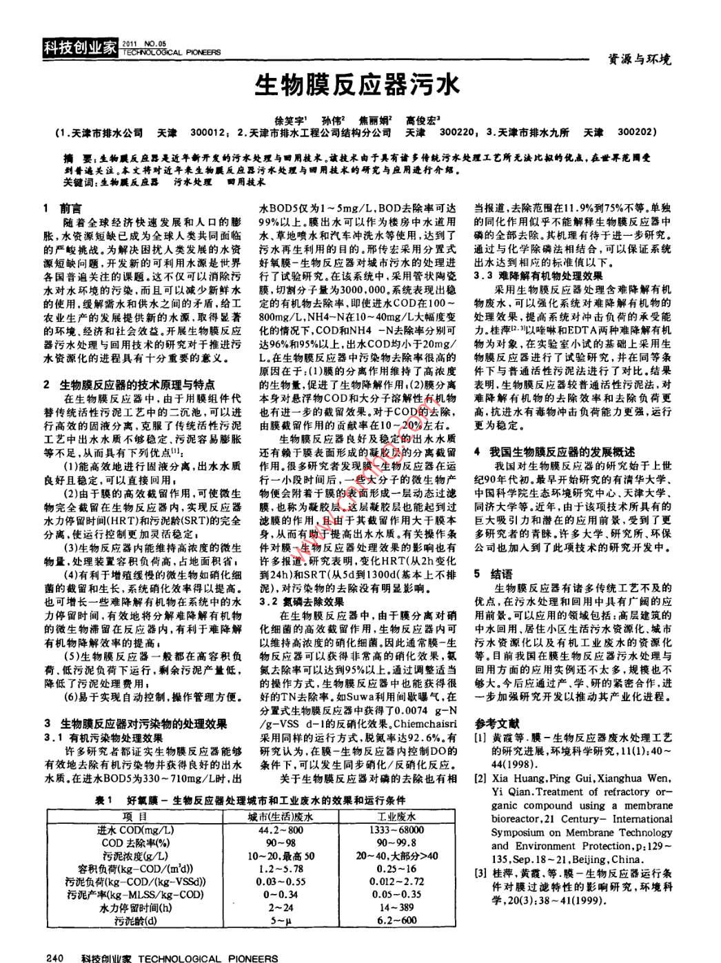 科技創(chuàng)業(yè)家2011 N0.05TECHNOLOGICAL PIONEERS資源與環(huán)境生物膜反應(yīng)器污水徐笑字'孫偉3焦麗娟高俊宏*(1.天津市排水公司天津300012; 2. 天津市排水工程公司結(jié)構(gòu)分公司天津300220, 3. 天津市排水九所天津300202)摘要;生物膜反應(yīng)器是近年新開發(fā)的污水處理與回用技術(shù)。該技術(shù)由于具有諸 多傳兢污水處理工藝所無汝比叔的優(yōu)點,在世界范闊受到普遍關(guān)注。本文將對近年來生物膜反應(yīng)器污水處理與四用技術(shù)的研究與應(yīng)用進行介紹。關(guān)鍵詞:生物膜反應(yīng)器污水處理 四用技術(shù)水BOD5僅為1 ~ 5mg/L, BOD去除率可達當報 道,去除范圍在11.9%到75%不等。單獨隨著全球經(jīng)濟快速發(fā)展和人口的膨99%以上。膜出水可以作為樓房中水道用的同化 作用似乎不能解釋生物膜反應(yīng)器中脹,水資源短缺已成為全球人類共同面臨水、草地噴水和汽車沖洗水等使用,達到了磷的全部去除 。其機理有待于進一步研究。的嚴峻挑戰(zhàn)。為解決困擾人類發(fā)展的水資污水再生利用的目的。 邢傳宏采用分置式通過 與化學除磷法相結(jié)合,可以保證系統(tǒng)源短缺問題,開發(fā)新的可利用水源是世界好氧膜一生物 反應(yīng)器對城市污水的處理進出水 達到相應(yīng)的標準值以下。各國普遍關(guān)注的課題。這不僅可以消除虧行 了試驗研究。在該系統(tǒng)中,采用管狀陶瓷3.3 難降解有機物處理效果水對水環(huán)境的污染,而且可以減少新鮮水膜,切割分子量為300000。系統(tǒng)表現(xiàn)出穩(wěn)采用生物膜反應(yīng)器處理含難降解有機的使用,縵解需水和供水之間的矛盾,給工定的有機物去除事,即使進水COD在100~物廢水 ,可以強化系統(tǒng)對難降解有機物的農(nóng)業(yè)生產(chǎn)的發(fā)展提供新的水源,取得顯著800mg/L,NH4-N在10~ 40mg/L大幅度變處理效果 ,提高系統(tǒng)對沖擊負荷的承受能的環(huán)境、經(jīng)濟和社會效益。開展生物膜反應(yīng)化的情況下,COD和NH4 -N去除率分別可力。 桂萍12.以喹啉和EDT A兩種難降解有機器污水處理與回用技術(shù)的研究對于推進污達96%和95%以上,出水COD均小于20mg/物 為對象,在實驗室小試的基礎(chǔ)上采用生水資源化的進程具有十分重要的意義。L.在生物膜反應(yīng)器中污染物去除事很高的物膜反應(yīng)器進行了試驗研究,并在同等條原因在于:(1)膜的分離作用維持了高濃度件 下與普通活性污泥法進行了對比。結(jié)果2生物膜反應(yīng)器的技術(shù)原理與特點的生物量,促進了生物降解作用+(2)膜分離表明,生物膜反應(yīng)器較普通活性污泥法,對在生物膜反應(yīng)器中,由于用膜組件代本身對懸浮物COD和大分子溶解性有機物難降解有機物的去 除效率和去除負荷更替?zhèn)鹘y(tǒng)活性污泥工藝中的二沉池,可以進也有進一一步的截留效果。對于COD的去除,高, 抗進水有毒物沖擊負荷能力更強,運行行高效的固液分離,克服了傳統(tǒng)話性污泥由膜截留作用的貢獻率在10~ 20%左右。更 為穩(wěn)定。工藝中出水水質(zhì)不夠穩(wěn)定.污泥容易膨脹生物膜反應(yīng)器良好及穩(wěn)定的出水水質(zhì)等不足,從而具有下列優(yōu)點"!:還有賴于膜表面形成的凝膠層的分離截留4 我國生物膜反應(yīng)器的發(fā)展概述(1)能高效地進行固液分離,出水水質(zhì)作用。很多研究者發(fā)現(xiàn)膜一生物反應(yīng)器在運我國對生物膜反應(yīng)器的研究始于上世良好且穩(wěn)定,可以直接回用:行一小段時間后,一些大分子的微生物產(chǎn)紀90年 代初.最早開始研究的有清華大學、(2)由 于膜的高效截留作用,可使微生物便會附著于膜的表面形成一層動態(tài)過濾中國科學院生態(tài)環(huán)境研究中心.天津大學.物完全截留在生物反應(yīng)器內(nèi),實現(xiàn)反應(yīng)器膜,也稱為凝膠層。這層凝膠層也能起到過同濟大學等 。近年,由于該項技術(shù)所具有的水力停留時間(HRT)和污泥齡(SRT)的完全濾膜的作用,且由于其截留作用大干膜本巨大吸引力和潛 在的應(yīng)用前景,受到了更分離.使運行控制更加靈活穩(wěn)定;身,從而有助于提高出水水質(zhì).有關(guān)操作條多研究者的青睞。許多 大學、研究所、環(huán)保(3)生物反應(yīng)器內(nèi)能維持高濃度的微生件對膜-生物反應(yīng)器處理效果的影響也有公 司也加人到了此項技術(shù)的研究開發(fā)中。物量,處理裝置容積負荷高,占地面積省:許多報道.研究表明,變化HRT(從2h變化(4)有 利于增殖緩慢的微生物如硝化細到24h)和SRT(從5d到1300d(基本上不排5 結(jié)語菌的截留和生長,,系統(tǒng)硝化效率得以提高。泥),對污染物的去除沒有明顯影響。生物膜反應(yīng)器有諸多傳統(tǒng)工藝不及的也可增長一些難降解有機物在系統(tǒng)中的水3.2 氨磷去除效果優(yōu)點,在污水處理和回用中具有廣闊的應(yīng)力停留時間,有效地將分解難降解有機物在生物膜反應(yīng)器中,由于膜分離對硝用前 景。可以應(yīng)用的領(lǐng)域包括:高層建筑的的微生物滯留在反應(yīng)器內(nèi),有利于難降解化細菌的高效截留作用, 生物反應(yīng)器內(nèi)可中水回用 、居住小區(qū)生活污水資源化.城市有機物降解效率的提高;以維持高濃度的硝化細菌。因此通常膜一生污水 資源化以及有機工業(yè)廢水的資源化(5)生物膜反應(yīng)器