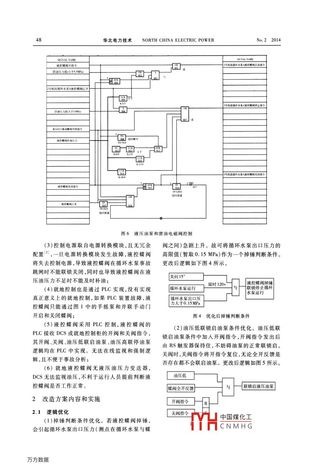華北電力技術(shù)NORTH CHINA ELECTRIC POWERNo.2 2014.技術(shù)改造.循環(huán)水泵出口液控蝶閥控制系統(tǒng)優(yōu)化匡磊,李涌斌,張久洲(廣東大唐國際潮州發(fā)電有限責任公司,廣東潮州515723)摘要:循環(huán)水系統(tǒng)將冷卻水送至高低壓凝汽器 去冷卻汽輪機低壓缸排汽,以維持高低壓凝汽器的真空,使.汽水循環(huán)得以繼續(xù)。循環(huán)水泵出口液控蝶閥與循環(huán)水泵存在著密切的聯(lián)系,因此循環(huán)水泵出口液控蝶閥的安全性對循環(huán)水系統(tǒng)尤為重要。介紹了重錘式液控蝶閥的一般控制方式,分析了循環(huán)水泵出口液控蝶閩PLC控制邏輯存在的不足,提出將循環(huán)水泵出口液控蝶閥控制引入DCS系統(tǒng)的改造方法。設(shè)計了就地控制循環(huán)水泵出口液控蝶閥的電氣回路,就地控制電源改為220 VAC,解決了信號遠距離傳送的問題,并提高了電源控制系統(tǒng)的可靠性。關(guān)鍵詞:液控蝶閥;DCS;控制系統(tǒng);改造中圖分類號:TK32文獻標識碼:B文章 編號:1003-9171(2014 )02 0046-04The Control System Technological Transformation ofHydraulic-controlled Butterfly Valves for Circulating Water PumpsKuang Lei, Li Yong-bin ,Zhang Jiu-zhou( Guangdong Datang International Chaozhou Power Generation Co. Ltd. ,Chaozhou 515723 , China)Abstract :The circulating water system provides cooling water to the high and low pressure steam turbine condenserto cool exhaust steam, so that it can maintain the vacuum of high and low voltage condenser and keep the steam-watercycle continue. There is close contact between the hydraulic controlled butterfly valves and the circulating waterpump , so the safety of hydraulic-controlled butterfly valves is particularly important for the circulating water system.This article describes the general control methods on heavy hammer hydraulic - controlled butterfly valves , and analy-zes its deficiency on controlling PLC logics , then proposes the improvement measures that using DCS system to controlthe hydraulic-controlled butterly valves. In this article,it designs an local electric control circuit for the hydraulic-controlled butterfly valves. The local control power had been changed to 220 V AC,it solved the problem of long-dis-tance signal transmission , and improved the reliability of power supply control system.Key words : hydraulic - contolled butterly valves ;DCS ;control system; technological transformation0前言1改造前的液控蝶閥控制方式和存在的潮州發(fā)電廠1.2號機組為600 MW火力發(fā)電問題機組,配1.2、3.4號4臺循環(huán)水泵,1號機組用1、1.1 改造前的控制方式2號2臺循泵,2號機組用3、4號2臺循泵,每臺該廠循環(huán)水泵與出口液控蝶閥之間的聯(lián)鎖機組的兩臺循泵互為聯(lián)鎖備用,2臺機組循泵出邏輯做在DCS中,液控蝶閥自身的控制邏輯都通口母管通過聯(lián)絡(luò)門可以互為備用。循泵出口蝶過PLC控制,就地開、關(guān)液控蝶閥指令也送至閥為長沙閥門廠生產(chǎn)的重錘式液控止回閥,控制PLC。開啟液控蝶閥和運行過程中補壓通過啟動裝置為PLC控制。在實際應(yīng)用中發(fā)現(xiàn)液控蝶閥.油泵實現(xiàn);關(guān)閉液控蝶閥時由電磁鐵帶電打開泄控制存在不足,為提高循環(huán)水控制的可靠性,將油通道,利用中國煤化工。液控蝶閥液控蝶閥的控制引人到DCS系統(tǒng),并在DCS邏油路圖和控MYHCNMHG輯中對原有控制思想進行優(yōu)化。.No.2 201華北電力技術(shù)NORTH CHINA ELECTRIC POWER40壓力表,高壓膠管調(diào)速閥串聯(lián)手動閥. 單向法中并聯(lián)手動閥手搖泵H- 慢關(guān)時間調(diào)節(jié)閥蓄能器快關(guān)時間調(diào)節(jié)閥中|.快慢關(guān)時間調(diào)節(jié)閥中成溢流閥電磁閥1. 此部分集聚在擺動油缸(接力器)內(nèi)m-重錘電機」油泵濾油器L濾油器一油箱圖1油路圖開指令型侈MR__M_M__M_X0O2_XOHL_Z_ro0o)油泵啟動(開閥和| Y000關(guān)指令無高油無關(guān)指于&無停止未過載 K12000補油)T4T_X010Y0OL油溫X007| 油樂在油壓高Y90OMTMOMIOX992原聯(lián)