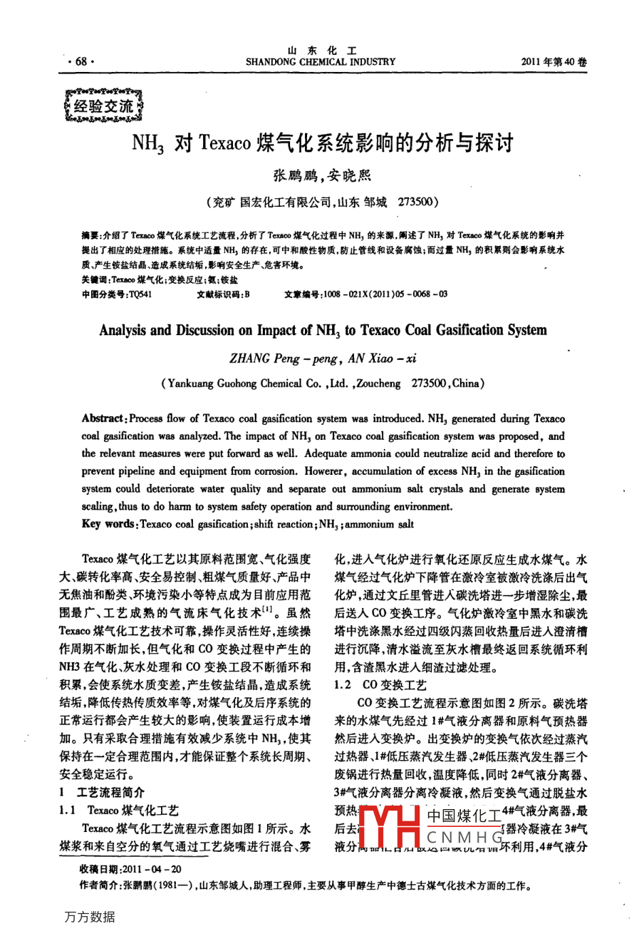 NH3對(duì)Texaco煤氣化系統(tǒng)影響的分析與探討