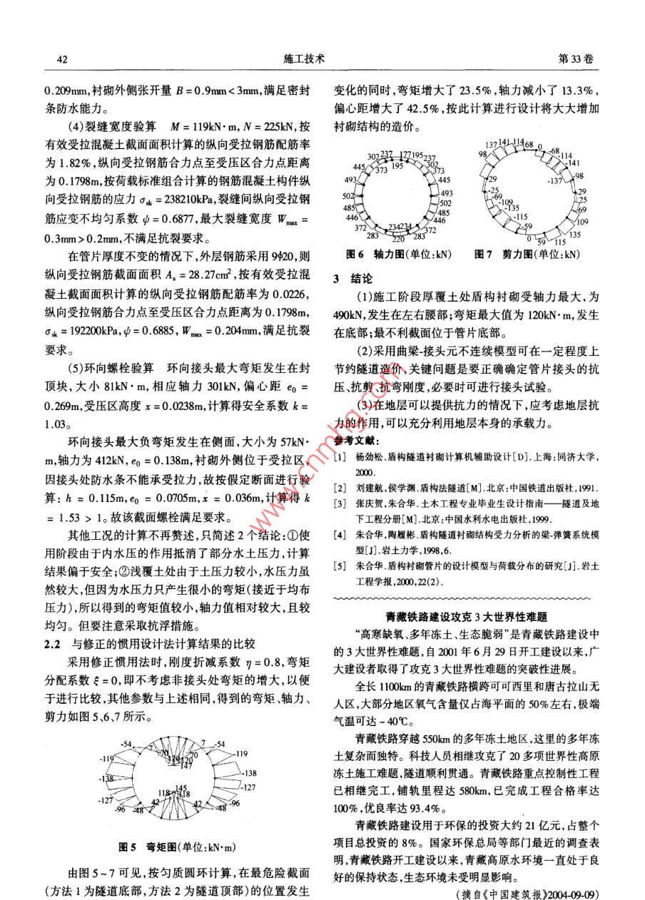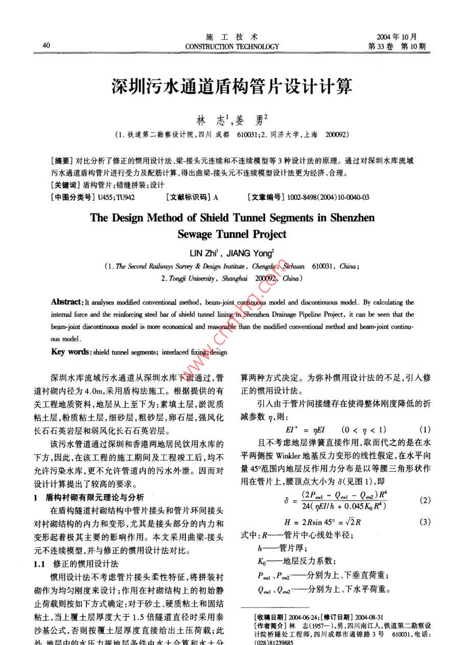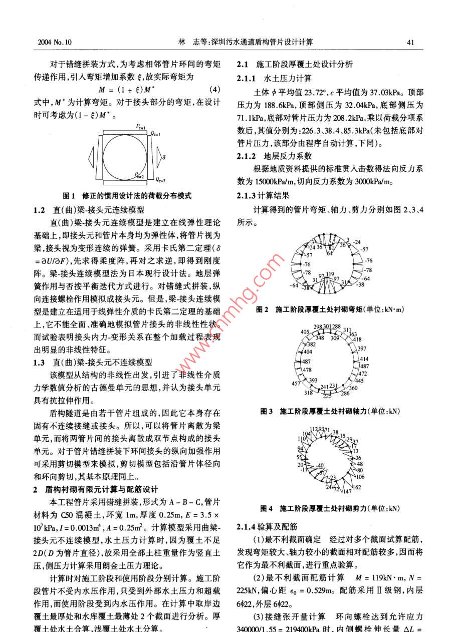 施工技術(shù)2004年10月40CONSTRUCTION TECHNOLOGY第33卷第10期深圳污水通道盾構(gòu)管片設(shè)計計算林志',姜勇2(1.鐵道第二勘察設(shè)計院,四川成都610031;2. 同濟(jì)大學(xué),上海200092)[摘要]對比分析了修正的慣用設(shè)計法、梁接頭元連續(xù)和不連續(xù)模型等3種設(shè)計法的原理。通過對深圳水庫流域污水通道盾構(gòu)管片進(jìn)行受力及配筋計算,得出曲梁~接頭元不連續(xù)模型設(shè)計法更為經(jīng)濟(jì)、合理。[關(guān)鍵詞]盾構(gòu)管片;錯縫拼裝;設(shè)計[中圖分類號] U455;TU942[文獻(xiàn)標(biāo)識碼]A[文章編號] 1002-8498( 2010-00The Design Method of Shield Tunnel Segments in ShenzhenSewage Tunnel ProjectLIN Zhi' , JIANG Yong(1. The Second Railwarys Suney & Design Institute,Chengdu, Sicuan 610031, China;2. Tongji Univesity, Shanghai 20092, China)Abstract: It analyses modifed conventional method, beam-joint continuous model and discontinuous model. By calcuaing theintermal force and the rinfrcing steel bar of shield tunnel lining in Shenzhen Drainage Pipeline Project, it can be seen that thebeam-joint discontinuous model is more economical and reasonable than the modified conventional method and bam-joint continu-ous model.Key words: shield tunnel segments; interlaced fixing;design深圳水庫流域污水通道從深圳水庫下面通過,管算兩種方式?jīng)Q定。為彌補(bǔ)慣用設(shè)計法的不足,引人修道襯砌內(nèi)徑為4.0m,采用盾構(gòu)法施工。根據(jù)提供的有正的慣用設(shè)計法。關(guān)工程地質(zhì)資料,地層從上至下為:素填土層,淤泥質(zhì)引入由于管片間接縫存在使得整體剛度降低的折粘土層,粉質(zhì)粘土層,細(xì)砂層,粗砂層,卵石層,強(qiáng)風(fēng)化減參數(shù)η,則:長石石英巖層和弱風(fēng)化長石石英巖層。EI*= nEl(0< η< 1)(1)該污水管道通過深圳和香港兩地居民飲用水庫的且不考慮地層彈簧直接作用,取而代之的是在水下方,因此,在該工程的施工期間及工程竣工后,均不平兩側(cè)按Winkler 地基反力變形的線性假定,在水平向允許污染水庫,更不允許管道內(nèi)的污水外泄。因而對量459范圍內(nèi)地層反作用力分布是以等腰三角形狀作設(shè)計計算提出了較高的要求。用在管片上,腰頂點大小為8(見圖1),即1盾構(gòu)村砌有限元理論與分析δ=(2Pw- Qan- Qm)R*(2)24( nEiIh + 0.045KoR)在盾構(gòu)隧道襯砌結(jié)構(gòu)中管片接頭和管片環(huán)間接頭對襯砌結(jié)構(gòu)的內(nèi)力和變形,尤其是接頭部分的內(nèi)力和H = 2Rsin45° = 2R(3)變形起著極其主要的影響作用。本文采用曲梁接頭式中:R- 管片中心線處半徑;元不連續(xù)模型,并與修正的慣用設(shè)計法對比。h一管片厚;1.1修正的慣用設(shè)計法Ko一地層反力 系數(shù);慣用設(shè)計法不考慮管片接頭柔性特征,將拼裝襯Pu、Pon--分別為上、下垂 直荷重;砌作為均勻剛度來設(shè)計;作用在襯砌結(jié)構(gòu)上的初始靜Qm.Qn-- -分別為上、下水平荷重。止荷載則按如下方式確定:對于砂土、硬質(zhì)粘土和固結(jié)粘土,當(dāng)上覆土層厚度大于1.5倍隧道直徑時采用泰[收稿日期] 20040624;[修訂日期] 2004-08-31沙基公式,否則按覆土層厚度直接給出土壓荷載;此[作者簡介]林志(1957-),男 ,四川南江人,鐵道第二勘察設(shè)計院橋隧處工程師,四川成都市通錦路3號610031, 電話:外,地h縣中的水樂力加地巨爾件由水十人管和水+公(028 )812398852004 No. 10林志等:深圳污水通道盾構(gòu)管 片設(shè)計計算4對于錯縫拼裝方式,為考慮相鄰管片環(huán)間的彎矩2.1施工階段厚覆土處設(shè)計分析傳遞作用,引入彎矩增加系數(shù)ξ,故實際彎矩為2.1.1水土壓力計算M = (1+ ξ)M°4)土體φ平均值23.72*,c平均值為37.03kPao頂部式中,M"為計算彎矩。對于接頭部分的彎矩,在設(shè)計壓力為188.6kPa,頂部側(cè)壓為32.04kPa,底部側(cè)壓為時可考慮為(1-ξ)M"。71. 1kPa,底部對管片壓力為208.2kPa,乘以荷載分項系數(shù)后,其值分別為:226.3、38.4、85.3kPa(未包括底部對管片壓力,該部分由程序自動計算,下同)。| )>82.1.2地層反力系數(shù)根據(jù)地質(zhì)資料提供的標(biāo)準(zhǔn)貫人擊數(shù)得法向反力系數(shù)為15000kPa/m,切向反力系數(shù)為3000kPa/m。圖1修正的慣用設(shè)計法的荷載分布模式2.1.3計算結(jié)果1.2直(曲)梁-接頭元連續(xù)模型.計算得到的管片彎矩、軸力、剪力分別如圖2.3.4直(曲)梁-接頭元連續(xù)模型是建立在線彈性理論所示。基礎(chǔ)上,即接頭元和管片本身均為彈性體,將管片視為2438484/36224梁,接頭視為變形連續(xù)的彈簧。采用卡氏第二定理(δX-57=aU/aF),先求得柔度陣,再對之求逆,即得到剛度-76陣。梁-接頭連續(xù)模型法為日本現(xiàn)行設(shè)計法。地層彈-64簧作用與否按平衡迭代方式進(jìn)行。對錯縫式拼裝,縱向連接螺栓作用模擬成接頭元。但是,梁接頭連續(xù)模型是建立在適用于線彈性介質(zhì)的卡氏第二定理的基礎(chǔ)圖2施工階段厚覆土處村砌彎 矩(單位:kN. m)上,它不能全面、準(zhǔn)確地模擬管片接頭的非線性性狀。298301288而試驗表明接頭內(nèi)力-變形關(guān)系在整個加載過程表現(xiàn)0%A382397出明顯的非線性特征。44041.3直(曲)梁-接頭元不連續(xù)模型-487-478該模型從結(jié)構(gòu)的非線性出發(fā),引進(jìn)了非線性介質(zhì)457<393力學(xué)數(shù)值分析的古德曼單元的思想,并認(rèn)為接頭單元318286具有抗拉伸作用。盾構(gòu)隧道是由若干管片組成的,因此它