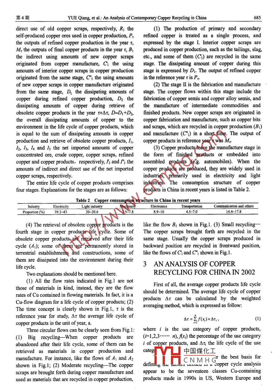 第6卷第4期過程工程學(xué)報Vol.6 No.42006年8月The Chinese Journal of Process EngineeringAug. 2006An Analysis of Contemporary Copper Recycling in ChinaYUE Qiang(岳強(qiáng)),LU Zhong-wu(陸鐘武)(SEPA Key Laboratory on Eco-Industry, Northeastern Universit, Shenyang, Liaoning 10004, China)Abstract: Copper consumption increased very quickly in China in recent years, which could not be met by inland copperindustry. In order to achieve a sustainable development of copper industry, an analysis of copper recycling in China wasnecessary. For the life cycle of copper products a copper-flow diagram with time factor was worked out and the contemporarycopper recycling in China was analyzed, ftom which the following data were obtained. The average life cycle of copperproducts was 30 years. From 1998 to 2002, the use ratio of copper scraps in copper production, the use ratio of copper scrapsin copper manufacture, the materials self-support ratio in copper production, and the materials self-support ratio in coppermanufacture were 26.50%, 15.49%, 48.05% and 59. 41%, respectively. The materials self-support ratios in copper productionand manufacture declined year by year in recent years on the whole, and the ltter dropped more quickly. The average indexof copper ore and copper scrap from 1998 to 2002 were 0.8475 t and 0.0736 t respectively, and copper resource eficiencywas 1.1855 Ut. Some efforts should be paid to reduce copper ores consumption and promote copper scraps regeneration.Copper scraps were mostly imported from foreign countries because of shortage in recent years in China. Here the reasonsrelated to copper scraps deficiency were also demonstrated. But we can forecast: when copper production was in a slow riseor in a steady state in China, the deficiency of copper scraps may be mitigated; when copper production was in a steady statefor a very long time, copper scraps may become relatively abundant. According to the status of copper industry in China, theraw materials of copper production and manufacture have to depend on oversea markets heavily in recent years, and at thesame time, the copper scraps using proportion and eficiency in copper industry should be improved.Key words: copper scrap; copper recycling; copper-flow diagram of the life cycle of copper products; self-support ratio;copper ore index; copper scrap index; copper resource eficiencyCLC No.: TF811Document Code: AArticle ID: 1009- 606X(2006)04 -0683-081 INTRODUCTIONcopper ore resources is as follows: reserves arerelatively abundant, but mostly in low grades; copper1.1 Backgroundores are dfficult for mining and milling; the reserve perCopper is an important basic material and widelycapita is deficient'. As a developing country,used in many fields, such as electricity, light industry,consumption of copper ores in China increased moreindustrial machinery,electronics, transportation,quickly than those in developed countries. Comparedcommunication and national defense, etc. The demandwith the demand, the supply of copper ores was severelyfor copper increased quickly in China in recent yearsin shortage and the self-support ratio of copper ores waswith the rapid development of economy, as indicated inonly about 50%. In the early stage of the 21st century,Table 1. China has become the largest country in copperthe condition of copper ore was austere. So theconsumption since 2002. Along with the rapidregeneration of copper scraps has an importantincrement of consumption, copper production in Chinasignifcance for the copper industry in China. Firstly,can not meet the demand, and the gap has to be filled byusing of copper scraps can reduce the consumption ofoversea markets.non-renewable resources- copper ores, and secondly, itThe reserves of copper ores in China are proved incan reduce consumption of energy and decreasethe fourth place throughout the world. The status quo ofenvironmental pollution.Table 1 Production and consumption of refined copper in China in 1995~2002 (x10*t)Year1995 1996 1997 1998 1 9992000 2001 2002 Increasing rate (%)Production107.97 11919 1l 794121.13 117.42 137.11 152.33 163.256.08Cosumption 114.70 119.27 126.97 140.22 148.42 192.81 230.73. 268.4412.92%Note: The data come from China Noferrous Metals Industy Yearbook (1996中國煤化工TYHCNMHGReceived date: 2005- -10- -18; Accepted date: 2006 -04 -08Foundato ti spre Key TccloierD‘Ce Pogamme (No 203A614A-42)Biography: YUE Qiang(1975-), male, native of Anshan City, Liaoning Province, Ph.D, lecturer, major in material flow analysis.684過程工程學(xué)報第6卷,An analysis of contemporary copper recycling ofin this paper, such as Kapur et al.5J on Asian copperChina is very useful in finding the recycling status quo cycle, Spatari et al.4 on European copper cycle, andof copper scraps in copper industry in China, which canlan Beers et al.sl on African copper cycle; Most ofhelp to attain the savings of Cu-containing resourcesthem are the components of the Stocks and Flowsand achieve a sustainable development in the industry.(STAF) Project of the Center for Industrial Ecology at1.2 The Investigative Status Quo of CopperYale University, which seeks a comprehensiveRecycling in China and Abroadaccounting of the anthropogenic mobilization of copperThe method of substance flow analysis is used inand other metals in the industrial economy; and worksanalyzing copper recycling in the present work.of Ayresl2.0), Graedel and Allenby", Kleijn, HansenSubstance flow analysis (SFA) is an effective tool fornd Lassen on theory and practice in general. It isstudying the industrial metabolism of specificclear that in developed countries the method of SFA hassubstances (e.g. copper, aluminum) in a certain spatial been shaped, and a wealth of experience accumulated.scale, for example, in the scale of a nation, a region or aCopper flow analysis in China was lacking and fewfirm. Industrial metabolism means the whole integratedpapers were published on it. There are only so