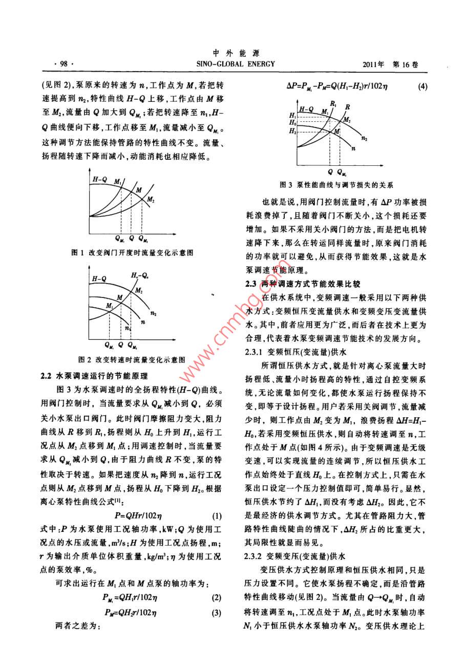 第6期SINO-GLOBAL ENERGY97循環(huán)水泵節(jié)能改造與應(yīng)用丁均勝(中國石油大連石化公司,遼寧大連116032)摘要水泵流量揚(yáng)程和功率分別與其轉(zhuǎn)速的一次方、二次方和三次方成正比。對(duì)于流量經(jīng)常變化的場(chǎng)合,采用變頻調(diào)速技術(shù),控制電機(jī)轉(zhuǎn)速,改變泵的流量和揚(yáng)程,可節(jié)約電能50%,顯著降低節(jié)流損耗,且生產(chǎn)T藝穩(wěn)定,具有調(diào)速性能好、節(jié)能效果顯著、運(yùn)行T藝安全可靠等優(yōu)點(diǎn)。根據(jù)運(yùn)行參數(shù)輸送同等流量的水,減少壓頭損失40m,電流降低約40A,節(jié)約用電14kWh,按目前T業(yè)電價(jià)067元/W,h計(jì),每年產(chǎn)生直接經(jīng)濟(jì)效益8萬余元。葉輪切割也是常用的節(jié)能技術(shù)之一,其技術(shù)實(shí)施要滿足三個(gè)條作:水泵實(shí)際循環(huán)流鼉滿足系統(tǒng)需求,水泵銘牌揚(yáng)程高于實(shí)際揚(yáng)程5m以上;水泵在裝置內(nèi)所有循環(huán)系統(tǒng)主支路調(diào)節(jié)閥全開時(shí),循環(huán)水泵的運(yùn)行電流超過額定電流;能夠降低裝置循環(huán)系統(tǒng)的阻力。應(yīng)用葉輪切割技術(shù)后,單臺(tái)水泵T作電流由32A降至30A,一年節(jié)電68590kWh關(guān)鍵詞變頻技術(shù)葉輪切割水泵風(fēng)機(jī)節(jié)能1前言21水泵流量調(diào)節(jié)在供排水行業(yè),循環(huán)水泵電耗占循環(huán)水泵房總離心泵在指定管路上工作時(shí),由于生產(chǎn)工況發(fā)耗電成本的70%-80%,冷卻塔風(fēng)機(jī)及其他設(shè)備占生變化,可能出現(xiàn)泵的設(shè)計(jì)流量與生產(chǎn)要求不相適總耗電成本的20%-30%。裝置設(shè)計(jì)時(shí)往往從安全應(yīng),或已選擇好的離心泵在特定管路中運(yùn)轉(zhuǎn)時(shí),所角度出發(fā),加大循環(huán)水泵流量、提高循環(huán)水泵揚(yáng)程,提供的流量與實(shí)際工況不符等情況。對(duì)此,需要進(jìn)以致增加水泵電機(jī)容量,從而加大循環(huán)水泵的電能行流量調(diào)節(jié),也就是改變泵的工作點(diǎn)。消耗?,F(xiàn)在,絕大部分循環(huán)水泵房均采用調(diào)節(jié)閥門既然泵的工作點(diǎn)為管路特性和泵的特性所決開度及變頻調(diào)速的運(yùn)行方法,來調(diào)節(jié)循環(huán)水流量,定,因此,改變兩種特性曲線之一,均能達(dá)到調(diào)節(jié)流但因變頻設(shè)備投資較大,決定了變頻調(diào)速裝置不是量的目的。降低水泵能耗的最佳方法。2.1.1改變閥門開度理論上講,只有讓循環(huán)水泵的揚(yáng)程在保證必須改變離心泵出口管線上的閥門開度,實(shí)質(zhì)是改循環(huán)流量的前提下與系統(tǒng)運(yùn)行阻力值接近,才能達(dá)變管路特性曲線。當(dāng)閥門關(guān)小時(shí),管路的局部阻力到降低水泵能耗的目的。生產(chǎn)實(shí)際中,由于技術(shù)水加大(見圖1),工作點(diǎn)由M移至M1,流量由Q減小平限制或缺乏必要的測(cè)試手段,加之設(shè)計(jì)時(shí)留有較到Qx。當(dāng)閥門開大時(shí),管路局部阻力減小管路特大的富裕量水泵揚(yáng)程大多超出系統(tǒng)實(shí)際阻力(最性曲線變得平坦,工作點(diǎn)移至M,流量加大到Q。多超過20m以上),增加了能量消耗。用閥門調(diào)節(jié)流量迅速而方便,且流量可以連續(xù)變2變頻調(diào)速節(jié)電原理及應(yīng)用化,適合連續(xù)生產(chǎn)的特點(diǎn)。其缺點(diǎn)是當(dāng)閥門關(guān)小時(shí),由離心泵原理叫,在相似情況下,水泵流量揚(yáng)流動(dòng)阻力大,要額外消耗一部分動(dòng)能,經(jīng)濟(jì)性差。程和功率分別與其轉(zhuǎn)速的一次方、二次方和三次方2.1.2改變泵轉(zhuǎn)速成正比。對(duì)于流量經(jīng)常變化的場(chǎng)合,采用變頻調(diào)速改變離心泵轉(zhuǎn)速,實(shí)質(zhì)上是改變泵的特性曲線泵供水,可以顯著降低節(jié)流損耗,具有明顯節(jié)能效果。由于許多風(fēng)機(jī)、水泵的驅(qū)動(dòng)電機(jī)處于恒速運(yùn)轉(zhuǎn)作者簡介:丁均勝,工翟師,1987年半業(yè)于大連廣播電視大學(xué)化狀態(tài),而生產(chǎn)中的風(fēng)、水流量要求處于變工況運(yùn)行工機(jī)械專業(yè),主要從事石油化工裝王設(shè)備管理工作。水泵和風(fēng)機(jī)變頻調(diào)速被認(rèn)為是有效的節(jié)能措施。E-mail:dingjs_di@petrochinA.com.cn中外能源SINO-GLOBAL ENERGY011年第16卷(見圖2),泵原來的轉(zhuǎn)速為n,工作點(diǎn)為M,若把轉(zhuǎn)AP=Px -P Q(Hr-H,)r/102n速提高到m2,特性曲線H-Q上移,工作點(diǎn)由M移至M,流量由Q加大到Qx;若把轉(zhuǎn)速降至n1,HQ曲線便向下移,工作點(diǎn)移至M,流量減小至Q這種調(diào)節(jié)方法能保持管路的特性曲線不變。流量揚(yáng)程隨轉(zhuǎn)速下降而減小,動(dòng)能消耗也相應(yīng)降低。圖3泵性能曲線與調(diào)節(jié)損失的關(guān)系也就是說,用閥門控制流量時(shí),有△P功率被損耗浪費(fèi)掉了,且隨著閥門不斷關(guān)小,這個(gè)損耗還要增加。如果不采用關(guān)小閥門的方法,而是把電機(jī)轉(zhuǎn)速降下來,那么在轉(zhuǎn)運(yùn)同樣流量時(shí),原來閥門消耗1改變閥門開度時(shí)流量變化示意圖的功率就可以避免,從而獲得節(jié)能效果,這就是水泵調(diào)速節(jié)能原理。H-Q23兩種調(diào)速方式節(jié)能效果比較在供水系統(tǒng)中,變頻調(diào)速一般采用以下兩