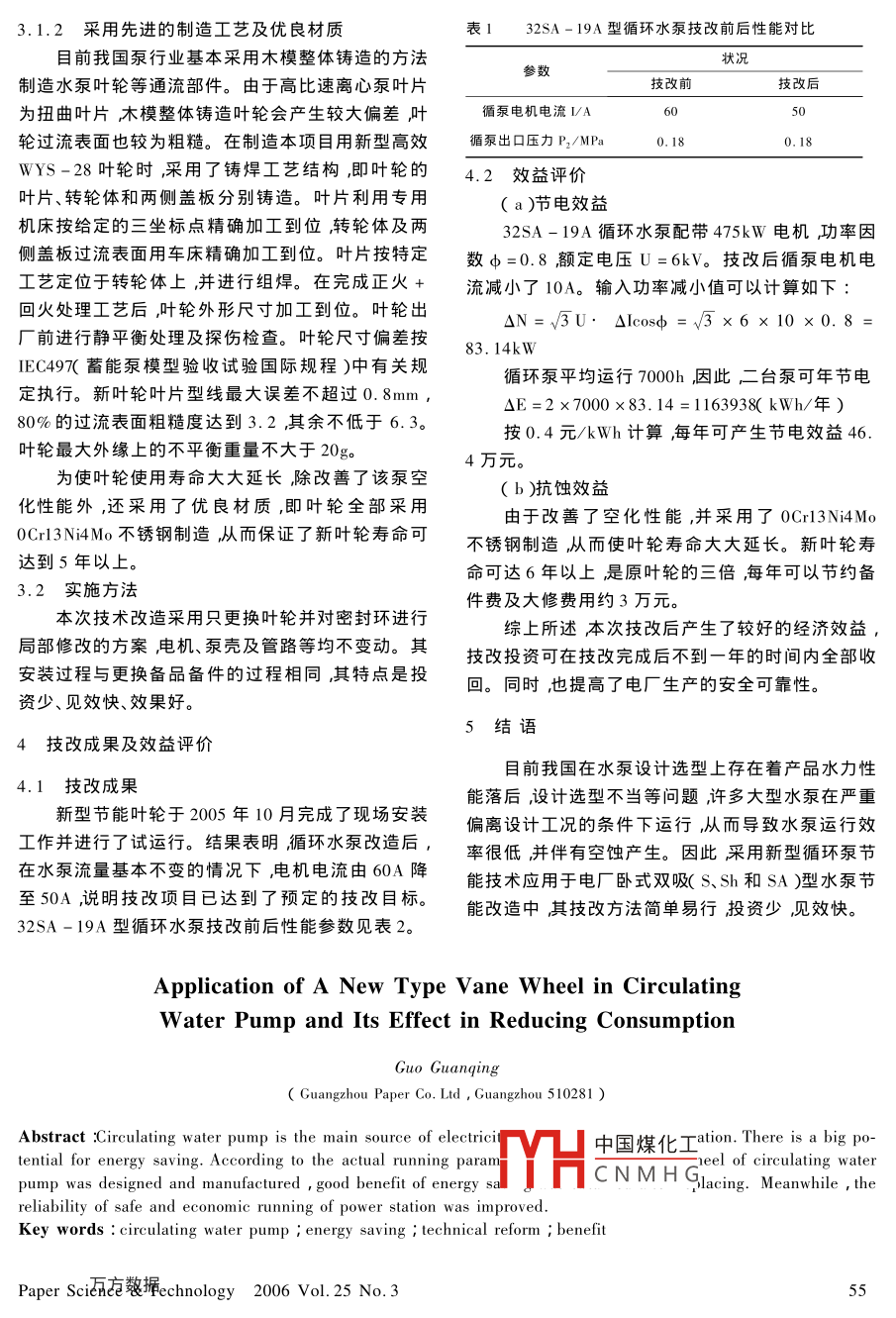 新型葉輪在循環(huán)水泵降耗中的應(yīng)用郭冠卿(越秀廣紙集團(tuán)熱電分廠,廣州510281 )摘要:循環(huán)水泵是電廠用電的主要消耗源,有巨大的節(jié)能降耗潛力。針對熱電廠循環(huán)水泵的實(shí)際運(yùn)行參數(shù),重新設(shè)計(jì)制造了節(jié)能抗蝕新葉輪,更換后取得了較好的節(jié)能效益。同時(shí)提高了電廠安全經(jīng)濟(jì)運(yùn)行的可靠性。關(guān)鍵詞:循環(huán)水泵;節(jié)能;技改;效益中圖分類號:TU991.35文獻(xiàn)標(biāo)識碼:B文章編號:1671 -4571( 2006 )03 -0054-02設(shè)計(jì)流量:Q=6700m3/h電機(jī)電流:I≤50A.前言越秀廣紙集團(tuán)熱電分廠裝有50MW汽輪發(fā)電3技改措施及實(shí)施方法機(jī)組2臺,配備32SH -19A循環(huán)水泵4臺,為閉式3.1 技改措施循環(huán)系統(tǒng)。該泵設(shè)計(jì)參數(shù)如下:3.1.1采用優(yōu)秀的水力模型設(shè)計(jì)揚(yáng)程:H = 26m目前我國水泵生產(chǎn)廠家多采用一元方法進(jìn)行水設(shè)計(jì)流量:Q = 5000m'/h泵設(shè)計(jì)而科研單位及高校則常用二元方法。國外電機(jī)轉(zhuǎn)速:n = 730r/ min著名企業(yè)的產(chǎn)品設(shè)計(jì)與開發(fā)也多是采用二元方法進(jìn)電機(jī)容量:N =475kW行。目前三元設(shè)計(jì)方法也達(dá)到了實(shí)用化的程度。電廠在-年的絕大多數(shù)時(shí)間內(nèi)采用-泵一機(jī)方根據(jù)國內(nèi)外的研究情況看,三元設(shè)計(jì)方法的效果尚式運(yùn)行,只在炎熱夏季的較短時(shí)間內(nèi)采用三泵二機(jī)不理想究其原因,主要是目前尚不能十分準(zhǔn)確的描方式運(yùn)行。在一泵一機(jī)工況下,泵出口壓力為P2=述泵內(nèi)的流動狀況,因此水泵的設(shè)計(jì)對經(jīng)驗(yàn)的依賴0.18MPa進(jìn)口壓力為P =0.03MPa ,電機(jī)電流平均性很強(qiáng)。值為60A。從泵實(shí)際運(yùn)行參數(shù)可見,泵實(shí)際運(yùn)行工根據(jù)循環(huán)水泵實(shí)際運(yùn)行條件可知,該 泵實(shí)際運(yùn)況嚴(yán)重偏離最優(yōu)工況運(yùn)行效率很低按上述參數(shù)可行比轉(zhuǎn)速為n, =280遠(yuǎn)大于該泵設(shè)計(jì)比轉(zhuǎn)速n。=以估算出泵實(shí)際運(yùn)行效率約為60%。此外,該泵在190。對于離心泵而言,當(dāng)比轉(zhuǎn)速超過250時(shí)要使實(shí)際運(yùn)行中存在空蝕,在葉片進(jìn)口區(qū)域產(chǎn)生了局部水泵的性能指標(biāo)和空化指標(biāo)達(dá)到先進(jìn)水平其技術(shù)穿孔破壞。因此對該泵進(jìn)行節(jié)能抗蝕技術(shù)改造將難度很大。其中首先要解決新型高效葉輪與原泵殼會產(chǎn)生巨大的直接經(jīng)濟(jì)效益。的匹配問題。為此我們在該水力模型開發(fā)研究時(shí)采用了二元設(shè)計(jì)、三元校核的方法。2技改目標(biāo)設(shè)計(jì)完成后,利用三維流動分析軟件進(jìn)行流動中國水利水電科學(xué)研究院水力機(jī)電研究所是我分析。由數(shù)值分析得到的流場分析和壓力場分析結(jié)國專門從事水泵水輪機(jī)開發(fā)研究的大型專業(yè)研究單果,可以得到水力模型的修型依據(jù),從而對水力模型位具有國內(nèi)-流的模型試驗(yàn)臺離心泵技術(shù)水平屬進(jìn)行進(jìn)-步優(yōu)化。針對本次改造的條件及要求,設(shè)國際先進(jìn)水平。經(jīng)過中國水利水電科學(xué)研究院和我計(jì)了WYS-28型水力模型。該水力模型的性能在公司雙方進(jìn)行現(xiàn)場考查、測試及分析確定循環(huán)水泵高精度水泵試驗(yàn)臺上進(jìn)行了驗(yàn)證試驗(yàn)。試驗(yàn)遵照技改目標(biāo)為節(jié)能降耗,即在保證水泵抽水量基本不SL140-97(水泵模型驗(yàn)收試驗(yàn)規(guī)程)的有關(guān)要求進(jìn)變的情況下提高水泵效率,降低電機(jī)電流,從而產(chǎn)行。f險(xiǎn)空化試驗(yàn)、水壓脈動試中國煤化工生可觀的節(jié)能效益。據(jù)此確定了技改參數(shù)如下:驗(yàn)及MHCNMH(氣明采用WYS-28技設(shè)計(jì)揚(yáng)程:H= 17m術(shù)進(jìn)」以項(xiàng)x小以心剛,以實(shí)現(xiàn)預(yù)定的技改目標(biāo)。作者簡介:郭冠卿男工程師主要從事汽輪發(fā)電機(jī)方面的工作。54《造紙科學(xué)與技術(shù)》2006年第25卷第3期3.1.2采用 先進(jìn)的制造工藝及優(yōu)良材質(zhì)32SA-19A型循環(huán)水泵技改前后性能對比目前我國泵行業(yè)基本采用木模整體鑄造的方法狀況參數(shù)制造水泵葉輪等通流部件。由于高比速離心泵葉片技改前技改后為扭曲葉片,木模整體鑄造葉輪會產(chǎn)生較大偏差,葉循泵電機(jī)電流I/A65輪過流表面也較為粗糙。在制造本項(xiàng)目用新型高效循泵出口壓力P2/MPa0. 180.18WYS-28葉輪時(shí),采用了鑄焊工藝結(jié)構(gòu),即葉輪的4.2效益評價(jià)葉片、轉(zhuǎn)輪體和兩側(cè)蓋板分別鑄造。葉片利用專用(a)節(jié)電效益機(jī)床按給定的三坐標(biāo)點(diǎn)精確加工到位,轉(zhuǎn)輪體及兩32SA - 19A循環(huán)水泵配帶475kW電機(jī)功率因側(cè)蓋板過流表面用車床精確加工到位。葉片按特定數(shù)φ=0.8額定電壓U=6kV。技改后循泵電機(jī)電工藝定位于轉(zhuǎn)輪體上,并進(jìn)行組焊。在完成正火+流減小了10A。 輸入功率減小值可以計(jì)算如下:回火處理工藝后,葉輪外形尺寸加工到位。葉輪出ON=v3U●Alcosφ =√3x6x 10 x0.8=廠前進(jìn)行靜平衡處理及探傷檢查。葉輪尺寸偏差按83.14kWIEC497(蓄能泵模型