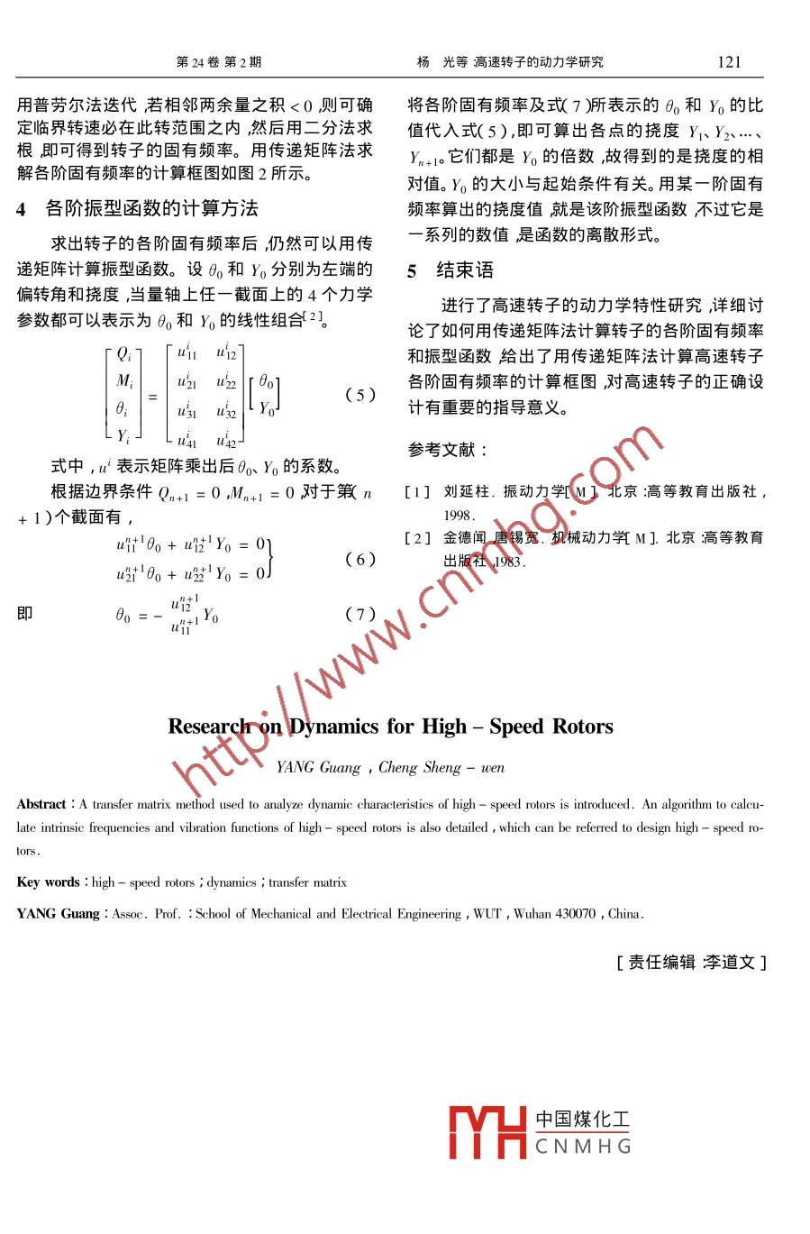 第24卷第2期武漢理工大學(xué)學(xué)報(bào)·信息與管理工程版Vol 24 No. 22002 4 JOURNAL OF WUT( INFORMATION MANAGEMENT ENGINEERING)Apr2002文章編號:1007-144X2002)2-0119-03高速轉(zhuǎn)子的動力學(xué)研究楊光,程勝文21.武漢理工大學(xué)機(jī)電工程學(xué)院,湖北武漢430070;2.孝感職業(yè)技術(shù)學(xué)院,湖北孝感437000摘要:介紹了對高速轉(zhuǎn)子進(jìn)行動力學(xué)特性分析的傳遞矩陣法洋細(xì)討論了高速轉(zhuǎn)子的各階固有頻率和振型函數(shù)的計(jì)算方法對高速轉(zhuǎn)子的正確設(shè)計(jì)有重要的參考價(jià)值。關(guān)鍵詞:高速轉(zhuǎn)子;動力學(xué);傳遞矩陣中圖法分類號:TH133.3文獻(xiàn)標(biāo)識碼:A1前言隨著工業(yè)技術(shù)的發(fā)展要求機(jī)械的工作轉(zhuǎn)速和工作效率不斷提高。在很多高速回轉(zhuǎn)機(jī)械中轉(zhuǎn)子的工作速度甚至超過其本身的臨界轉(zhuǎn)速并且要求它的旋轉(zhuǎn)精度高、振動小。因此在這類轉(zhuǎn)子的設(shè)計(jì)中對其進(jìn)行動力學(xué)分析是必不可少的。其分析內(nèi)容包括求出該轉(zhuǎn)子的各階固有頻率n