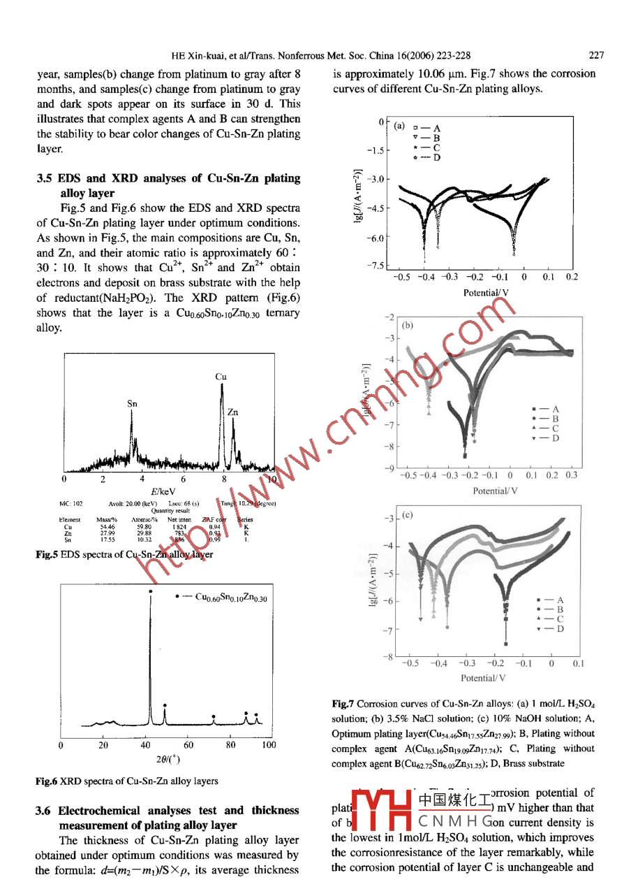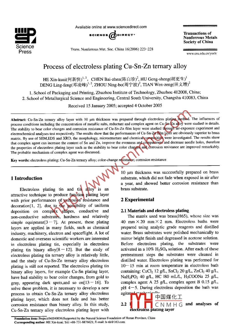 Available online at www.sciencedirect.comTransactions ofSCIENOE鄂*@oiner.NonfSociety of Chinarous MetalsScienceTrans. Nonferrous Met. Soc. China 16(2006) 223-228Presswww.csu.cdu.cn/ysxh/Process of electroless plating Cu-Sn- Zn ternary alloyHE Xin-kua(何新快).2, CHEN Bai-zhen(陳白珍)尸, HU Geng -sheng(胡更生)'DENG Ling-feng(鄧凌峰)',2, ZH0U Ning-bo(周寧波)尸, TIAN Wen-zeng(田文增)尸1. School of Packaging and Printing. Zhuzhou Institute of Technology, Zhuzhou 412008, China;2. School of Metallurgical Science and Engineering, Central South Universit, Changsha 410083, ChinaReceived 15 January 2005; accepted 4 October 2005Abstract: Cu-Sn-Zn temary alloy layer with 10 pμm thickness was prepared through elctroless plating method. The infuences ofprocess conditions including the concentration of matllic salts, reductant and complex agent on Cu-Sn-Zn aloy were studied in details.The stability to bear color changes and corrosion resistance of Cu-Sn-Zn film layer were studied through air-exposure experiment andeletrochemical analyses test respectively. The results show that the performances of Cu-Sn-Zn flm layer are obviouslysuperior to brassmatrix. By use of SEM,EDS and XRD, the morphology, microstnucture and chemical composition were investigated. The results showthat complex agent can increase the content of Sn and Zn, improve the evenness and compactness and decrease needle holes, thereforethe properties of electroless plating layer such as the stability to bear color changes and corrosion resistance are improved remakably.The probable mechanism of complex agent was discussed.Key words: electroless plating: Cu-Sn-Zn temary aly;, color-change resistance; corrosion resistance10 pum thickness was sucessfully prepared on brass1 Introductionsubstrate, which did not fade when exposed in air aftera year, and showed better corrosion resistance thanElectroless plating tin and tin alloy is anbrass substrate.attractive technique to produce function plating layerwith prior performances of corrosion resistance and2 Experimentaldecoration[1, 2], due to the possibility of uniformdeposition on complex shapes, conductive and2.1 Materials and electroless platingnon-conductive substrates, hardness and relativelyThe matrix used was brass(H65), whose size wassimple equipment[3- 7]. At present, these plating40 mmX 20 mmX2 mm. Electroless baths werelayers are applied in many fields, such as chemicalprepared using analytic grade reagents and distlledindustry, machinery, electron and spaceflight. A lot ofwater. Brass substrates were polished mechanically todomestic and overseas scientific workers are interestedmiror bright finish and degreased in acetone solution.in electroless plating tin, especially in electrolessBefore electroless plating, the substrates wereplating tin binary alloy[8- 12]. But the study ofactivated in a 10% H2SO4 solution. After each of theseelectroless plating tin ternary alloy is relatively lttle,pretreatment steps the substrates were cleaned irand the study of Cu-Sn-Zn termary alloy electrolessdistilled water, Electroless plating was performed forplating is still not reported. The electroless plating tin10- 15 min at room temperature in electroless bathbinary alloy layers, for example Cu-Sn plating layer,containing: CuCl 12 g/L, SnCl2 20 g/L, ZnCl2 40 g/L,have bad stability to bear color changes, from gold toNaH2PO2 40 g/L, HC 180 mL/L, HsCOONa 25 g/L,gray, appearing dark spots,and so on[13- 16]. Tocomplex agent A 25 g/L, complex agent B 0.15 g/L,solve these problem, it is necessary to develop a newpH 4- 5. During electroless deposition the bath wasprocess to obtain Cu-Sn-Zn temary alloy electrolessagitat中國煤化工plating layer, which does not fade and has bettercorrosion resistance than binary alloy. In this study,.2!YHCN M HG and analyses ofCu-Sn-Zn temnary alloy electroless plating layer withelectroless plating layerFoundation item: Projcec(04J140036)Supported by the Naturl Science Foundation of Hunan Province. ChinaCorrespondimg autbor: HE Xin-kuai; Tel: +86 731-8876621; F-mail: h-xk@ 163.com224HE Xin-kuai, ct al/Trans. Nonferrous Met. Soc. China 16(2006) 223-228KYKY2800 SEM was used to observe thea)■-Snmorphology of Cu-Sn-Zn electroless plating layer, thecomposition of layer was analyzed by EDS. The0tthickness was measured by the following formula:d=(m2- m)SXp. Where m2, m are respectively thmass of Cu-Sn-Zn ternary alloy electroless plating咨35-specimen and substrate; S is the area of the electrolessplating specimen; ρ=p(Cu) X w(Cu)+p(Sn) X w(Sn)+p(Zn)X w(Zn) (Cu)=8.9 g/cm', p(Sn)=7.29 g/cm',卡20個p(Zn)=7.09 g/cm', w is the mass fraction of Cu, Sn, Znin the alloy). The stability of the layer to bear colorchanges was studied through air-exposure experiment4812620by observing its rate of color and luster alteration inp(CuCl2)(g.L-1)room, and the corrosion resistance of the layer wasinvestigated through electrochemical analyses test in" (b)1 mol/L H2SO4, 3.5% NaCl and 10% NaOH solution0-respectively using electrochemical work stationCHI600b. Cu-Sn-Zn plating layer was used as workelectrode, the large area platinum slice as auxiliaryelectrode, and the reference electrode was a saturatedcalomel electrode (SCE).0}3 Results and discussion0葉3.1 Influences of main salts152550The important function of main salts(CuCl2,SnCl2 and ZnCl2) in bath is to provide Cu2+, Sn2+ andρ(SnCl2)(g.L))Zn~* in the process of electroless deposition, and their(e)"concentrations have great influences on the composi-tions and performances of Cu-Sn-Zn ternary alloy. In3order to obtain their influences simply and effectively,50■-Snthe method of keeping other compositions unchangingand only changing one of the concentrations of Cu2*,另40.-CuSn*+, Zn2*, reductant and complex agent respectivelywas adopted, and the results are shown in Fig. l.Theoptimum content of salts, reductant and complex agent20 tin bath was determined by air- exposure experiment,electrochemical analyses and depositio