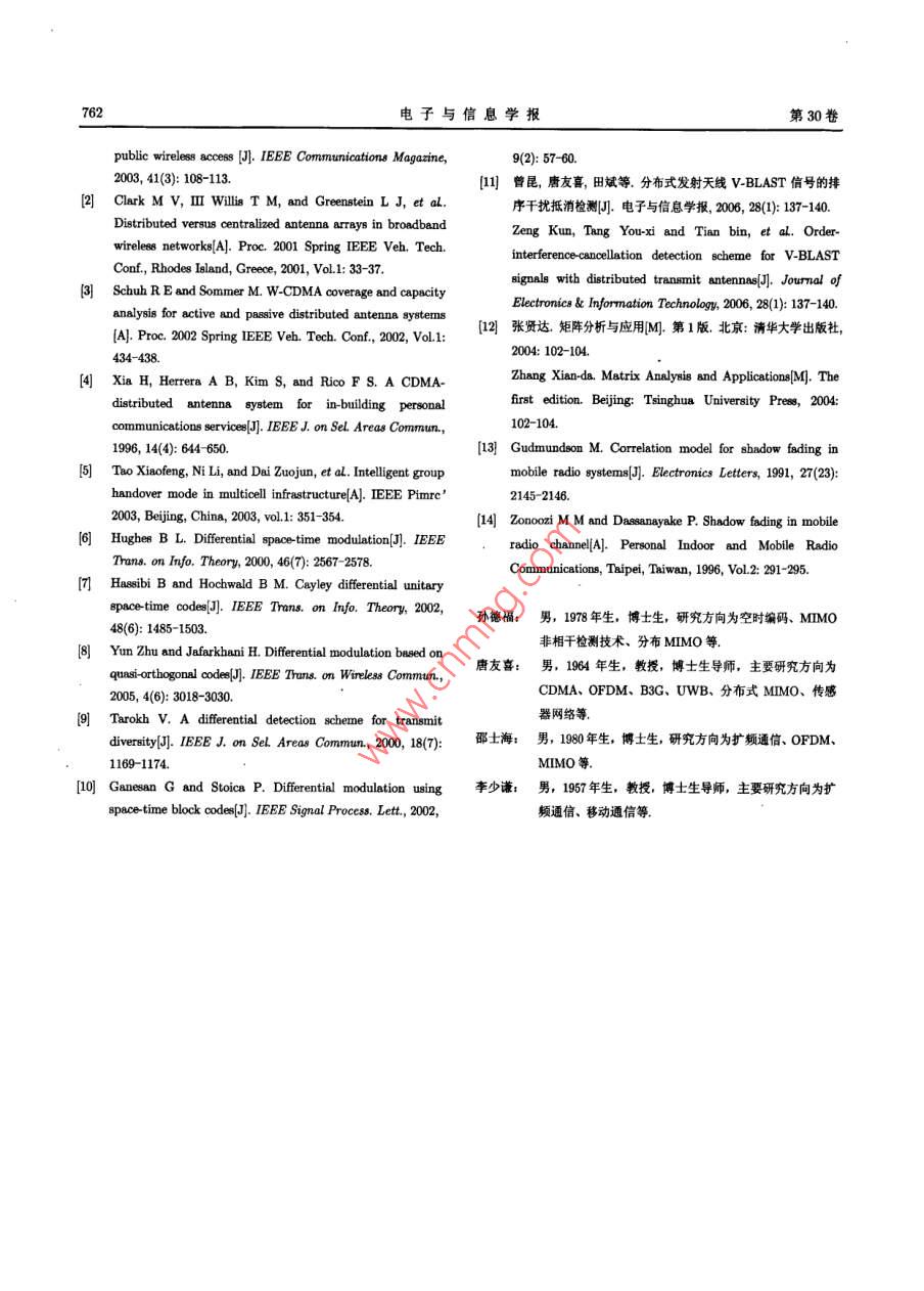 第30卷第3期電子與信息學報Vol. 30No 32008年3月Journal of Electronics Information TechnologyMar 2008一種基于分布式發(fā)射天線的差分空時調制方法孫德福唐友喜邵士海李少謙〔電子科技大學通信抗干擾技術國家級重點實驗室成都610054)摘要:在基于分布式發(fā)射天線的多入多出(、MIMO)系統(tǒng)中,由于各發(fā)射天線的發(fā)射信號不同時到達接收端,用于信道估計的導引設計及發(fā)射方法存在一定困難。針對這一問題,該文提出一種無需信道估計的分布式MIMO差分編碼及檢測方法:發(fā)送端將發(fā)射矩陣進行相位差分調制后發(fā)射,接收端利用前后接收量判斷相位信息恢復出發(fā)送端數據信息。該方法頻譜效率與 V-BLAST相同,適用于任意發(fā)射天線數和接收天線數,且不要求接收天線數大于發(fā)射天線數。仿真結果表明,在不同信道傳播時延情況下,誤碼率性能不同。關鍵詞:分布式發(fā)射天線;分布式多入多出;信道傳播時延;差分檢測中圖分類號:TN914文獻標識碼:A文章編號:1009-5896(2008)03-075904Differential Space Time Modulation withDistributed Transmit AntennasSun De-fu Tang You-xi Shao Shi-hai Li Shao-qian(National key Lab of Communication, University of Electronic Science and Technology ofChina, Chengdu 610054, China)Abstract: It is difficult to estimate channel knowledge in multiple input multiple output system which based ondistributed antenna structure because the transmit signals are received asynchronously. aiming at this matter,adifferential encoding and detection scheme is proposed where channel estimation is not needed. The proposedscheme has the game spectral efficiency as V-BLAST scheme and can be applied to any number of transmitantenna and receive antenna, besides the number of receive antenna can be less than transmit antenna. Thesimulation results show that the ber performance is different corresponding to different channel propagationKey words: Distributed transmit antennas; Distributed Multiple Input Multiple Output(MIMO); Channelpropagation delay; Differential detection1引言速移動或者天線數目較多情況下,系統(tǒng)接收端難以獲得準確近年來,分布式無線通信系統(tǒng)叫 distributed wireless的信道狀態(tài)信息,因此,在分布式MINO系統(tǒng)中,研究無需ommunication system受到越來越多的關注,果用分布式天做信道估計的非相干檢測技術很有必要。線結構的多入多出( Distributed Multiple Input Multiple國內外學者對同步MMO(信號同時發(fā)射,同時到達接收oupt;, Distributed MIMO)系統(tǒng)(本文簡稱為分布式端)差分檢測技術進行了一定研究1,但是,在分布式MIMO,可以使得收發(fā)天線間的鏈路更加獨立,空間相關性MMO系統(tǒng)中,由于發(fā)射天線在地域上的分布性引起各發(fā)射更弱,能達到更高的系統(tǒng)容量;由于天線分布于小區(qū)中不天線的發(fā)射信號不同時到達接收天線,同步MMO差分檢測同地理位置,能有效縮短信號的接入距離,降低發(fā)射信號功算法不再適用。到目前為止,還未發(fā)現基于分布式發(fā)射天線率,提高小區(qū)覆蓋率14。分布式MMO具有高容量、低功的MMO差分檢測技術的相關研究文獻。針對這一問題,本耗、更好的覆蓋、對人體低電磁損害等優(yōu)點,是第四代移動文提出一種適用于分布式發(fā)射天線系統(tǒng)的MMO差分編碼通信系統(tǒng)的顯著特征之一國5。及檢測方法在發(fā)送端和接收端都未知信道狀態(tài)信息的情況在分布式MIMO系統(tǒng)中,為了獲取信道狀態(tài)信息下,系統(tǒng)可進行非相干檢測。Channel State Information,CSI),需要占用額外的帶寬資本文其余部分是這樣安排的:第2節(jié)給出分布式MIMO源;由于各發(fā)射天線的發(fā)射信號不同時到達接收端,用于信系統(tǒng)模型:第3節(jié)給出一種分布式MIMO差分編碼及檢測方道估計的導引設計及發(fā)射方法都存在一定困難;另外,在高法:仿真結果在第4節(jié)給出:最后是對全文總結20060817收到,20070205改回2分布式MIMo系統(tǒng)模型國家自然科學基金(6027200,60572090,60472045,60496313)和教文獻[1]提出了分布式MIMO系統(tǒng)模型,如圖1所示育部博士點基金(20061400資助課題電子與信息學報第30卷該發(fā)射矩陣不代表任何信息,只進行初始化,矩陣各元素都是M使得發(fā)射功率歸一化,發(fā)送端每aMN個數(=x據比特組成一個數據塊,a為正整數。假設第l-1個數據塊分布式MMo信通對應的編碼矩陣為光纖/電纜發(fā)射機一接收機…圖1分布式MIMO系統(tǒng)模型假設系統(tǒng)有M根發(fā)射天線,L根接收天線。發(fā)送端將待發(fā)射符號經過調制后,通過光纖或同軸電纜送到遠端的分布式發(fā)第l個數據塊中的數據比特串\并轉換后調制成MN射天線由于各發(fā)射天線到接收天線的距離不同,導致了各個FS星座符號,x”“;x其中,最大信道傳播時延小于1個符號周期,并且各發(fā)射天線到接n≤N),利用發(fā)天線發(fā)射信號不同時到達接收端。不失一般性,本文假設≤M,1≤n≤N),利用xy生成空時碼矩收天線間的信道傳播時延不同。假設每根發(fā)射天線在N連續(xù)時刻內發(fā)射了N個符號,22則發(fā)射天線k上的低通等效復基帶信號可以表示為E4(0VM>40(-7),k=…,M(1)n1城2…或其中E,是M根發(fā)射天線的總發(fā)射功率,本文同樣假設各天利用該矩陣進行差分編碼X線的發(fā)射功率相等,b(),=0…N-1是第k根發(fā)射天線上第個調制符號,g()是發(fā)射天線的等效復基帶波形,分其中“”代表矩陣的 Hadamard積,在N個連續(xù)時刻,步MMO信號