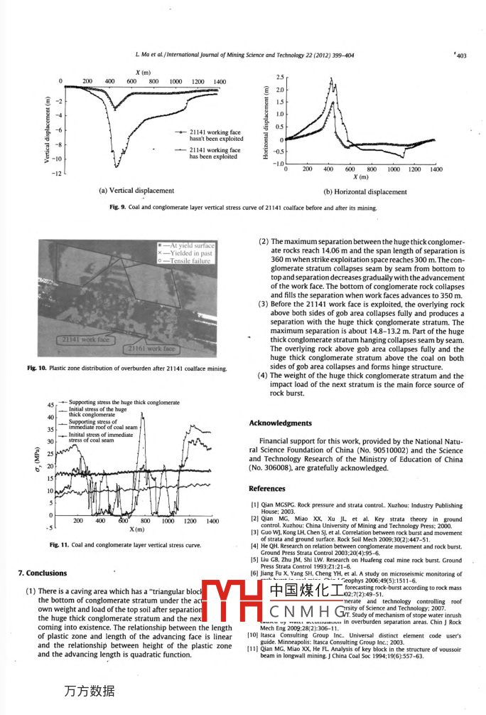 International Joumal of Mining Science and Technology 22(2012)399-404Contents lists available at SciVerse Science DirectInternational Journal of Mining Science and TechnologyELSEVIERjournalhomepagewww.eisevier.com/locate/iimstHuge thick conglomerate movement induced by full thick longwall mininghuge thick coal seamMa Liqiang. D, *, Qju Xiaoxiang Dong Tao. b, Zhang Jixiong a Huang Yanlia b"China Yongcheng Cool and Eiectric Power Group Corporation Ltd, Yongcheng 476600. ChinaARTICLEINFOA BSTRACTness of conglomerate layer in a full thick seamReceived 10 October 2011ilable online 22 May 2012next i afer reaching t em axtmum ca eity die to pw aoth the botte of the plaster telinear fit between the height of the plasticHuge thick coal seamSeparationRock bests theccurrence of rock burst induced by face as the major factor in the accident. This research revealsmeeasures to provide a theoretical basis and implementatiD 2012 Published by Elsevier B.V. on behalf of China University of Mining Technologyin the work face [3-5] Jiang et al. proved that the collapse of hugMine collapsing from top todue to owconglomerate. The overlying huge thick coal seam affects the dislo. Jing analyzed the characteristics of fracation of overburden and appearance of the rock burst when the when overburdened conglomerate rock and coal seam are extion of huge thick from Huafeng coal. He pointed that separation of stratum in roofme and abroad. and crevice is the main reason of connection of water betweers examinations focused on the surface subsidence. water-bearing strata and water entering work face[8ittle examination ontivity rhythm. Guo et al. reportYima coal and xinwen coafect of the moving compounds in the basic roof, and中國(guó)煤化工 norphology which Is forrock is the main reason for abnormal pressure and stronCNMHgmain determinant fonding author TeL: +86 13645201296the work face and the movement ofE-mail address: ckmadcumt eduan(L Ma)ck promote each other. The extraction2095-2686/s- see front matter o 2012 Published by Elsevier BV. on behalf of China University of Mining Technologyttp //xdoiorg/10.1016/jijmst 2011 1200140L Ma et aL/intemational Journal of Mining Saence and Technology 22(2012)399-404of full-thickness seam is the reason of the movement of stratum right and bottom boundaries are fixed and their top boundariesd thection of thehe lower work face. The laws of motion fthe numerical simulations for both strike modelingstratum under the influence of extraction and theeling measuring 2000 m x 700 m and 1380 mactivity rhythm of huge thick con- tom boundarsesnd displacemeectively, and a dip angle of 12.Weythm of stress distribution under influence of huge thick corwe used Mohr-Coulumb modeling to setharacteristic for the collapse of huge thick conglomermechanics by considering the real mechanics of rock in21and how collap3. 2. Mining method and date processing2. Geological conditions of coal miningAstrike modelited the 21101 and 21121tinitillustrates the face layout of 21 districts in Qianqiu Coal thickness extraction of the huge thick coal seam.in second level is located in the west of 21 mining districts. A4. Strike activity law of huge thick cord ispart. AtIn pace with expansion and advancement ofworkave been completed. The geological construction of 21141 workerage depth of work face is 665 m, the strike length is 1298 m;ining work. The engenders separation with the rock formation which is below thecline length is 130 m and the dip angle is 10-14.Fig 3 shows the maximum separation between two huge thick3. Element modelingspace reaches 300 m, After the exploitationthe perpendicular displacement in the botton3. 1. Model numerical simulation modelingglomerate stratum grow rapidly and theat the collapse of the conglomof mining districts was simulated using dip. Models of the left, There is a caving area which halock"form at theand load from the top soil after separationconglomerate stratum and the next stratum coming into being1121 work faceThe caving area at the bottom of conglomerate rock increasespidly and the boby seam after exploitation space reaching 310 m. The bottom of21161 work facen space advancing to 40 m. Fig, 4 shows growing form21201 work faceThe plastic zone in the huge thick cohe increasing exploitation space. Fig. 5 shows that the relationshipFig. 1. Face Layout of 21 districts in Qianqiu Coal Mine.between the length of the plastic zone and face advancement isYH中國(guó)煤化工CNMHGL Ma er al/international Joumal of Mining Sdence and Technol gy 22(2012)3994×10’c05× 1( Epipedon250x02.2x10' Clay25×0 Mudstone2.7×103 Fine stouL002.7x 10 Fine sandstone80×10 Conglomerate3.253.754254.755255756256.75(102Flg. 3. Caving of overlying strata and deformation conditions when the 211413253.75425475525575625(103a)work face advance 300 m5,50Fig 6 shows the changes of vertical displacement in the hugconglomerate stratum from top to bottom during the advanc2.2×103The collapsing of the bottom of thecement at the top of conglomerate rock shows that the top ofhuge thick conglomerate rock presents bending deflection5, Incline activity law for huge thick conglomerate stratum325375425475525575625675(10)(b) Work face advance 310 mwork ae i epi huge thick conglomerate stratum before 211415. 1. Activity lawIn pace with stratum between coal seam and the collapsing hugelomerate stratum after exploitation of the 21101, 21121, 21181132m22×103Cay2.5×103and the length of the separation is about 240 mre comprising of only steadwastes, The coals in the front-endback-end and unexploited 21141, 21161 work faces bear the2.25The maximum vertical and normal stresses in the 21 141 work303540455055606570(10)face before being exploited are 34.98 and 1.85 MPa, respectively.(c) Work face advance 350 m21121 work faces develop upward because of the effect of roof cut- layer on the strilFig. 4. Plastic zone development patterns at the bottom of the thick coronglomerate stratum above 21181 and 21201 work faces is small.