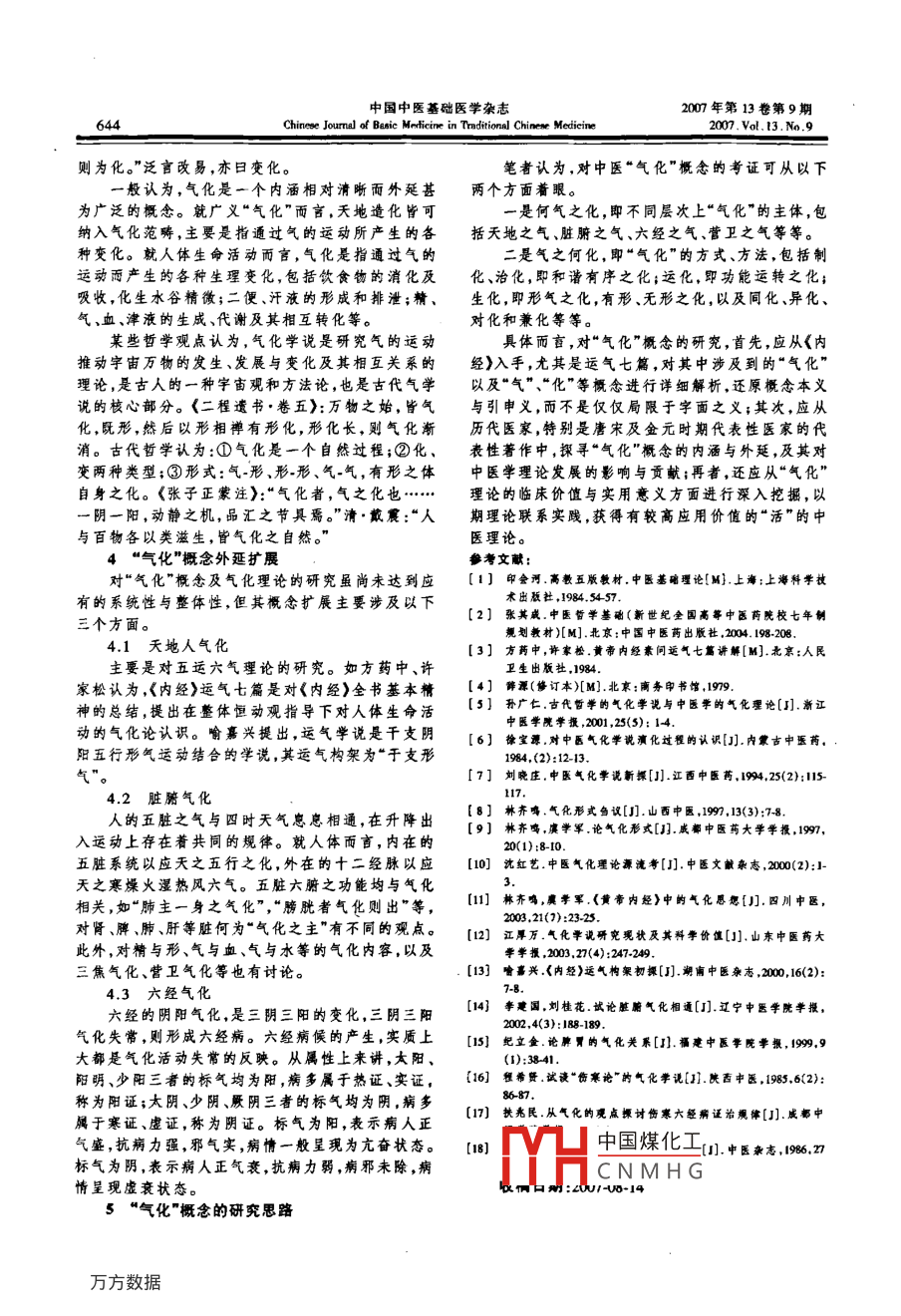 200年第13卷第9期中國中醫(yī)基礎(chǔ)醫(yī)學(xué)雜志n07.Vl.13,N,9Chinese Journal of Bagic Medieine in Traditional Chinese Medicine【理論探討】“氣化”概念辨析楊威,張字鵬,劉寨華,于崢(中國中醫(yī)科學(xué)院中醫(yī)基礎(chǔ)理論研究所,北京100700)關(guān)鍵諏;氣化;辮析中圖分類號(hào);R2文獻(xiàn)標(biāo)識(shí)碼;A文章編號(hào):1006-3250(2007)090643-02“氣化”是中國古代哲學(xué)和自然科學(xué)研究中的重研究范圍之內(nèi),視之為氣學(xué)理論的重要支柱,這一觀要概念,是對(duì)字宙萬物發(fā)展變化過程的認(rèn)識(shí),其理論點(diǎn)在1949年以后相當(dāng)長的一段時(shí)閫內(nèi),占據(jù)著主流形成與“元?dú)庹摗被驓庖辉撽P(guān)系磨切。而中醫(yī)氣化位置。理論是在氣化哲學(xué)思想和自然科學(xué)研寬方法的影響在中醫(yī)教材中,如五版《中醫(yī)基礎(chǔ)理論》認(rèn)為下形成的用以解釋自然生命運(yùn)動(dòng)規(guī)律的理論體系氣是不斷運(yùn)動(dòng)著的具有很強(qiáng)活力的精微物質(zhì),是構(gòu)屬于中醫(yī)基礎(chǔ)理論范疇,其理論思想對(duì)中醫(yī)基本概成人體和維持人體生命活動(dòng)的最基本物質(zhì)。氣具體念與理論體系如陰陽五行、藏象經(jīng)絡(luò)等的構(gòu)建具有分為推動(dòng)、溫煦、防御、園攝、氣化五大作用,而氣化蘿要影響,并且在臨床實(shí)踐和調(diào)掇養(yǎng)生方面均趙到是指通過氣的運(yùn)動(dòng)而產(chǎn)生的各種變化。吳體而言有效的理論指導(dǎo)作用。是指精、氣、血、津液各自的新陳代謝及其相互轉(zhuǎn)化。中醫(yī)氣化理論為歷代醫(yī)家所重視,但對(duì)于“氣氣化過程是體內(nèi)物質(zhì)代謝的過程,是物質(zhì)轉(zhuǎn)化和能化”概念,歷代學(xué)者見仁見智,尚未形成較為一致的暨轉(zhuǎn)化的過程。氣機(jī)是氣的運(yùn)動(dòng),歸納為升、降、出理論觀點(diǎn)。入四種基本運(yùn)動(dòng)形式?!蔽灏娼滩膶?duì)氣、氣化、氣機(jī)的1氣化概念來源與發(fā)展解釋具有一定的代表性,但也受到了相當(dāng)?shù)馁|(zhì)疑,引《內(nèi)經(jīng)》是中醫(yī)氣化理論形成的標(biāo)志。“氣化”一發(fā)了不斷的辨爭(zhēng)與研究。詞,語出《太始天元玉冊(cè)),始見于《素問·靈蘭秘典在新版教材《中醫(yī)哲學(xué)基礎(chǔ))中已重新給予定論》、《素問·運(yùn)氣微旨論》諸篇。但后世對(duì)氣化概念義,認(rèn)為“氣是天地萬物的本原,是聯(lián)系萬事萬物的的理解各不相同。中介,是構(gòu)成形體的本原,是物質(zhì)性與功能性的統(tǒng)《內(nèi)經(jīng)》中“氣化”至少包含兩方面的內(nèi)容。其一。而氣化是氣的變化過程,是生命活動(dòng)的基水形為天地之氣的運(yùn)動(dòng)變化,如運(yùn)氣學(xué)說以氣化說明天式,用以了解人體的正常生理活動(dòng)和異嘗病理變化。地陰陽五行之氣的運(yùn)動(dòng)變化,《素問·五常致大論》氣機(jī)是指氣的運(yùn)動(dòng)機(jī)制?!辈Ⅻc(diǎn)明中醫(yī)學(xué)重氣化不重“根于外者,命曰氣立,氣止則化絕?!逼涠樯钚钨|(zhì)的特色。動(dòng)中的氣的運(yùn)動(dòng)變億,如《素問·靈蘭秘典論》膀胱在代表性的中醫(yī)辭書中,對(duì)“氣化”一詞的解釋“氣化則能出矣?!睔饣背蔀檎f明天地之間一氣與也不盡相同。如謝觀的《中醫(yī)大辭典》解釋:“氣化,萬物化生關(guān)系的特定概念。六氣之變化也?!薄端貑枴饨蛔兇笳摗?“各從其氣化從氣化概念的發(fā)展源流考證,般認(rèn)為,鼙始于也。”并見《素問·六元正紀(jì)大論》?!洞笫继煸駜?cè)》,自彰于(內(nèi)經(jīng)》七篇大論之后,逐漸李經(jīng)緯《中醫(yī)大辭典)(人衛(wèi),1995)注釋:“氣化為中醫(yī)學(xué)家所重視。至隋唐時(shí)期,以王冰為主對(duì)其是氣的運(yùn)行變化。①泛指人體各臟腑器官的氣化活進(jìn)行理論闌發(fā),氣化含義逐漸擴(kuò)展,并對(duì)“膀胱氣化”動(dòng),其中較多用以表示三熊輸布水液及腎與膀胱的加以重視;宋金元時(shí)期,由于金元四大家重視并創(chuàng)新尿功能。《素問·靈蘭秘典論》:勝胱者,州都之中醫(yī)理論,“氣化”概念得到進(jìn)一步的發(fā)展,其時(shí)尤其官,津液藏焉,氣化則能出矣。②自然六氣的變化。強(qiáng)調(diào)“亢害承制”;明代命門學(xué)說全面討論了“水氣互《素問·氣交變大論》:各從其氣化也?!薄被芭c“三焦氣化”;其后“氣化”概念泛化,成為臟臍3氣化概念的文義考證及全身功能運(yùn)化的理論支撐。至清代中末期之后,考“氣”之意,《辭源》認(rèn)為,其本義為云氣?!墩f中西匯通學(xué)派更將氣化作為中醫(yī)學(xué)的基本特征之文解中國煤化工氣體?!秲?nèi)經(jīng))中涉,成為與西醫(yī)學(xué)的形質(zhì)、解剖觀念相對(duì)立的概念,及到氣、五返之氣等用以表達(dá)中醫(yī)學(xué)的生命功能懊式不勝CNMHG2現(xiàn)代普遍認(rèn)識(shí)考“化”之意,《說文解字》言:“化,教行也?!薄俄崒ⅰ皻饣笨钆c氣化理論研究置于“氣”學(xué)理論會(huì)》:“天地陰陽運(yùn)行自有而無,自無而有,萬物生息中國中醫(yī)基礎(chǔ)醫(yī)學(xué)雜志2007年第13卷第9期644Chinese Journal of Basic Medicine in Traditional Chinese Medicine2007.Vot,13.N9則為化?!狈貉愿囊?亦日變化。筆者認(rèn)為,對(duì)中醫(yī)“氣化”概念的考