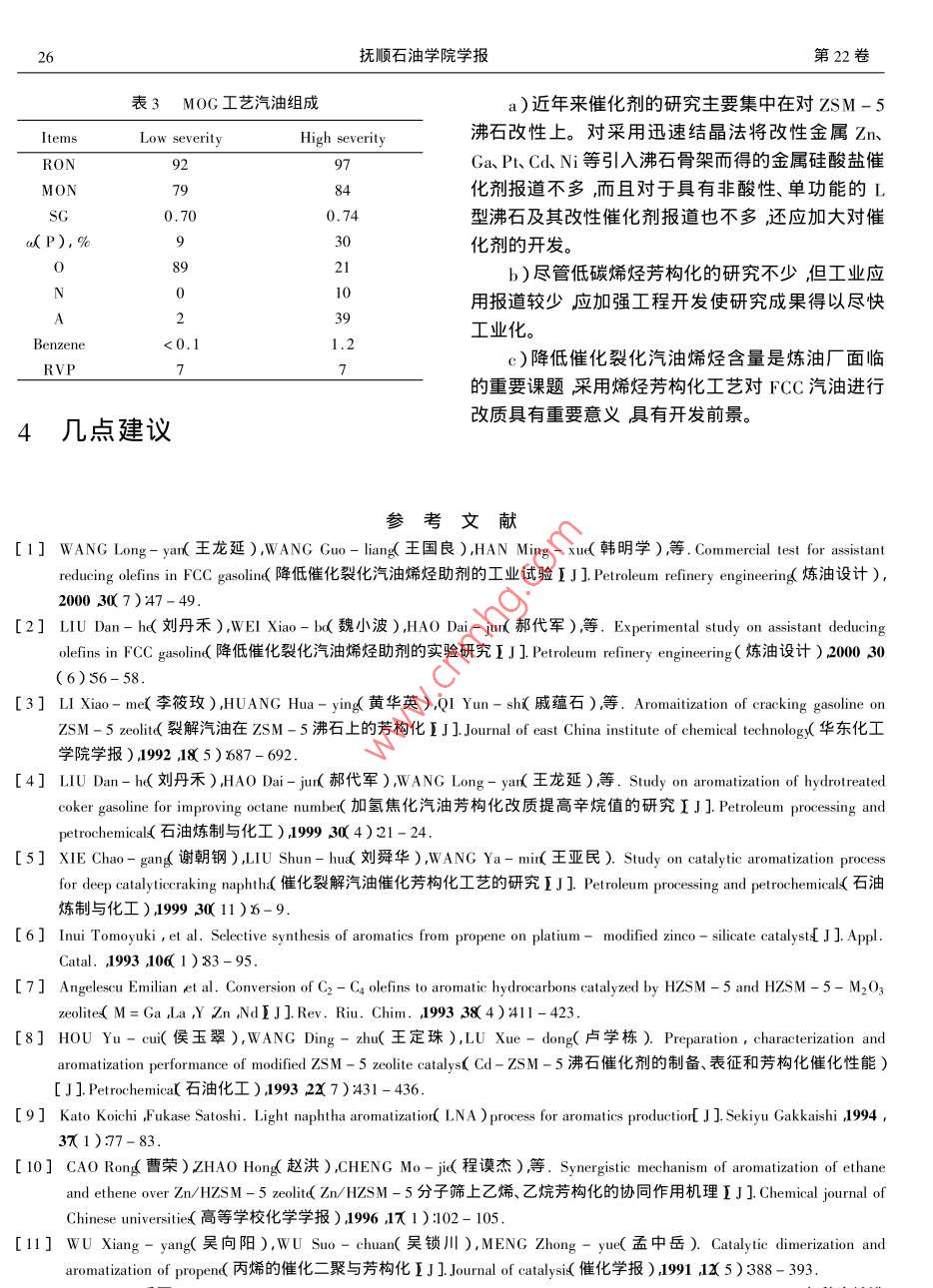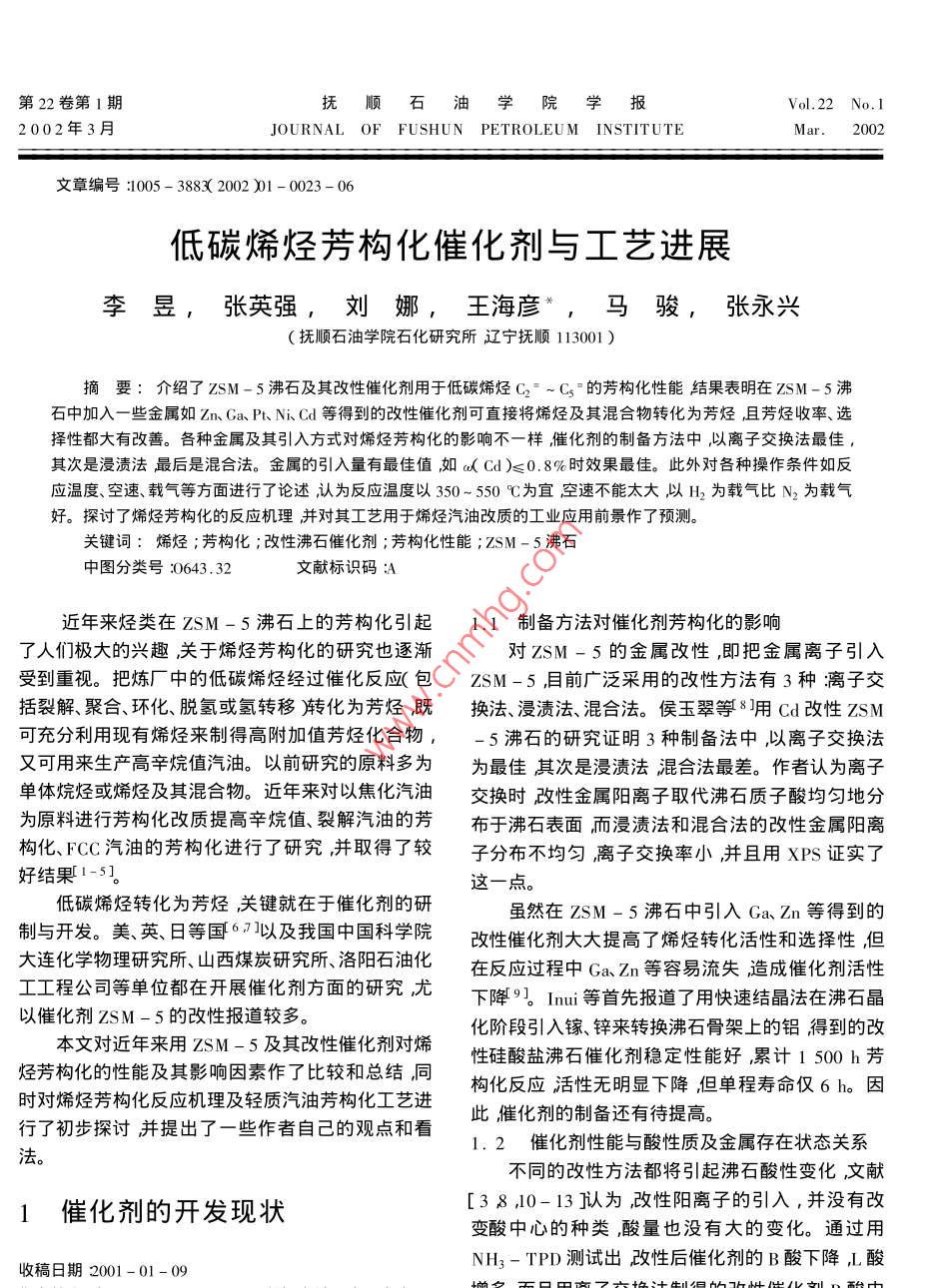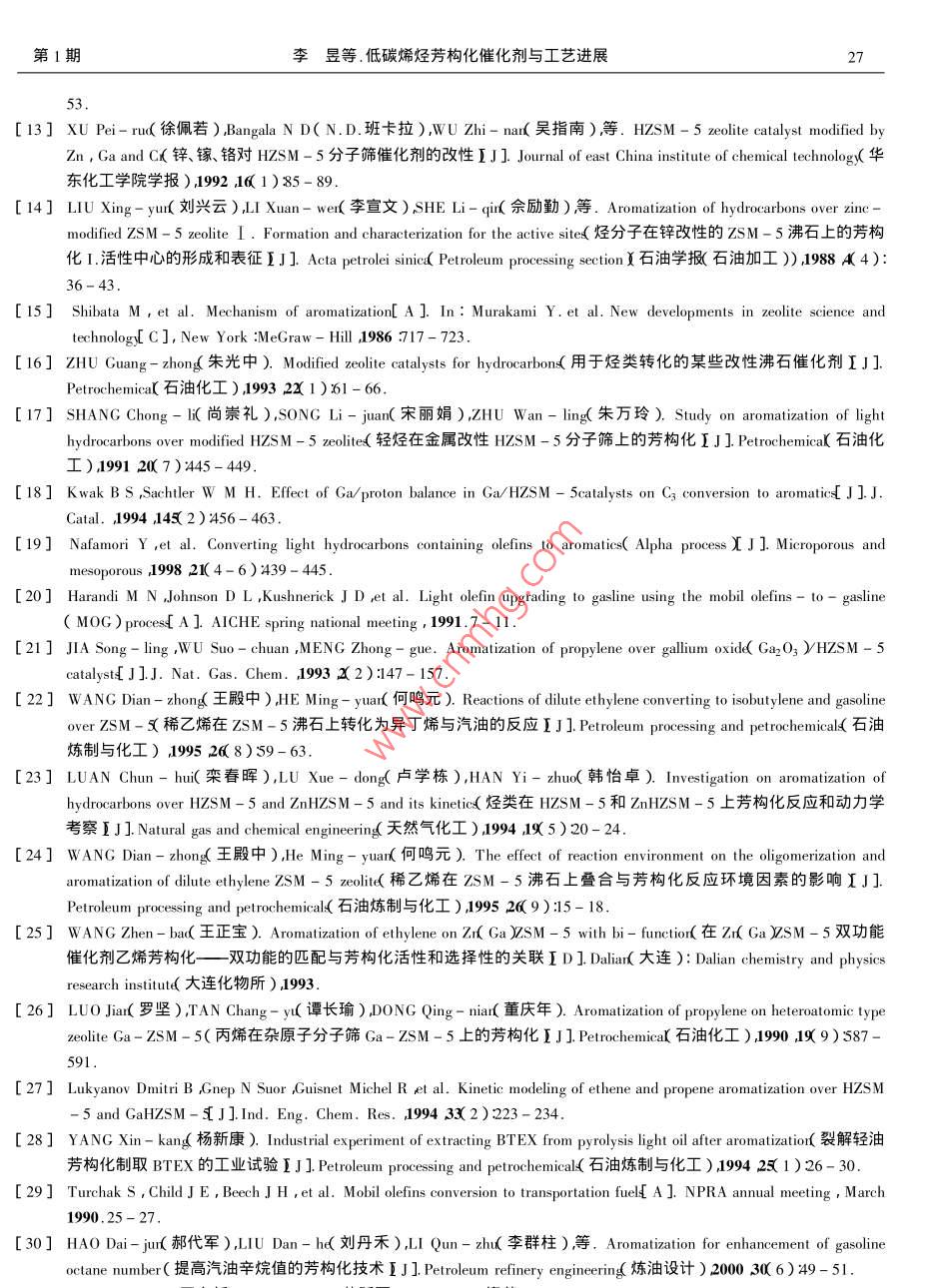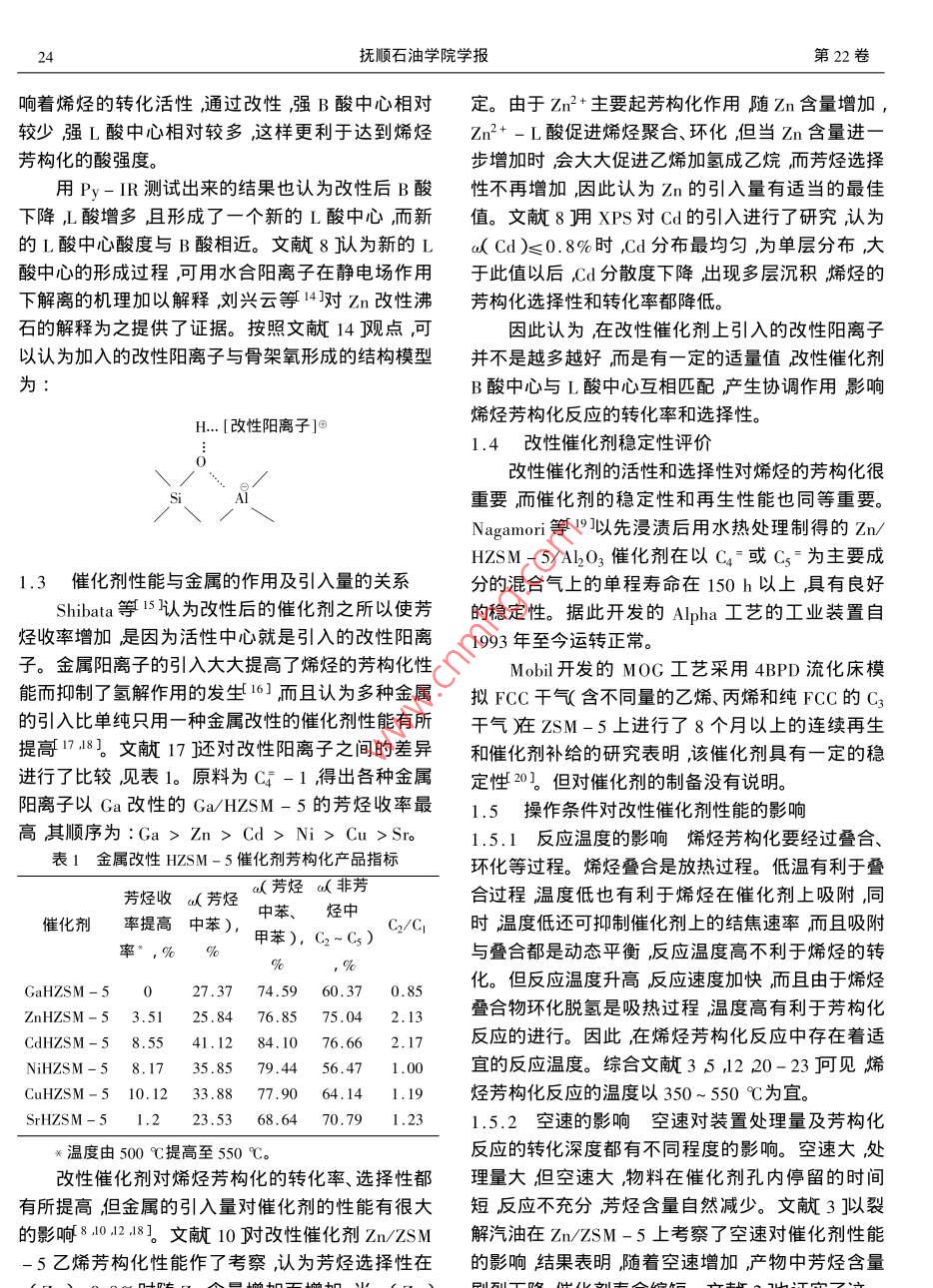 第22卷第1期撫順石由學(xué)院學(xué)指Vol.22 No.l2002年3月.JOURNAL OF FUSHUN PETROLEUM INSTITUTEMar.2002文章編號(hào)1005 - 3883 2002 )01 -0023- 06低碳烯烴芳構(gòu)化催化劑與工藝進(jìn)展李昱,張英強(qiáng),劉娜,王海彥”,馬駿,張永興(撫順石油學(xué)院石化研究所遼寧撫順113001 )摘要:介紹了ZSM-5沸石及其改性催化劑用于低碳烯烴C2= ~ Cs"的芳構(gòu)化性能結(jié)果表明在ZSM- 5沸石中加入一些金屬如Zn、GaPt、NiCd等得到的改性催化劑可直接將烯烴及其混合物轉(zhuǎn)化為芳烴,且芳烴收率、選擇性都大有改善。各種金屬及其引入方式對(duì)烯烴芳構(gòu)化的影響不一樣催化劑的制備方法中,以離子交換法最佳,其次是浸漬法最后是混合法。金屬的引入量有最佳值,如alCd)≤0.8%時(shí)效果最佳。此外對(duì)各種操作條件如反應(yīng)溫度、空速、載氣等方面進(jìn)行了論述,認(rèn)為反應(yīng)溫度以350~ 550 c為宜空速不能太大,以H2為載氣比N2為載氣好。探討了烯烴芳構(gòu)化的反應(yīng)機(jī)理并對(duì)其工藝用于烯烴汽油改質(zhì)的工業(yè)應(yīng)用前景作了預(yù)測(cè)。關(guān)鍵詞:烯烴;芳構(gòu)化;改性沸石催化劑;芳構(gòu)化性能;ZSM-5沸石中圖分類號(hào):0643.32 .文獻(xiàn)標(biāo)識(shí)碼A近年來烴類在ZSM - 5沸石上的芳構(gòu)化引起1.1制備 方法對(duì)催化劑芳構(gòu)化的影響了人們極大的興趣,關(guān)于烯烴芳構(gòu)化的研究也逐漸對(duì)ZSM-5的金屬改性,即把金屬離子引入受到重視。把煉廠中的低碳烯烴經(jīng)過催化反應(yīng)(包ZSM-5 ,目前廣泛采用的改性方法有3種:離子交括裂解、聚合、環(huán)化、脫氫或氫轉(zhuǎn)移)轉(zhuǎn)化為芳烴,既換法、浸漬法、混合法。侯玉翠等8]用Cd改性ZSM可充分利用現(xiàn)有烯烴來制得高附加值芳烴化合物,-5沸石的研究證明3種制備法中,以離子交換法又可用來生產(chǎn)高辛烷值汽油。以前研究的原料多為為最佳其次是浸漬法混合法最差。作者認(rèn)為離子單體烷烴或烯烴及其混合物。近年來對(duì)以焦化汽油交換時(shí)改性金屬陽離子取代沸石質(zhì)子酸均勻地分為原料進(jìn)行芳構(gòu)化改質(zhì)提高辛烷值、裂解汽油的芳布于沸石表面而浸漬法和混合法的改性金屬陽離構(gòu)化、FCC汽油的芳構(gòu)化進(jìn)行了研究,并取得了較子分布不均勻離子交換率小并且用XPS證實(shí)了好結(jié)果1-5]。這一點(diǎn)。低碳烯烴轉(zhuǎn)化為芳烴,關(guān)鍵就在于催化劑的研雖然在ZSM-5沸石中引入Ga、Zn等得到的制與開發(fā)。美、英、日等國67]以及我國中國科學(xué)院改性催化劑大大提高了烯烴轉(zhuǎn)化活性和選擇性,但大連化學(xué)物理研究所、山西煤炭研究所、洛陽石油化在反應(yīng)過程中GaZn等容易流失造成催化劑活性工工程公司等單位都在開展催化劑方面的研究,尤下降9]。lnui等首先報(bào)道了用快速結(jié)晶法在沸石晶以催化劑ZSM - 5的改性報(bào)道較多。本文對(duì)近年來用ZSM - 5及其改性催化劑對(duì)烯化階段引入鎵、鋅來轉(zhuǎn)換沸石骨架上的鋁得到的改烴芳構(gòu)化的性能及其影響因素作了比較和總結(jié),同性硅酸鹽沸石催化劑穩(wěn)定性能好累計(jì)1500h芳時(shí)對(duì)烯烴芳構(gòu)化反應(yīng)機(jī)理及輕質(zhì)汽油芳構(gòu)化工藝進(jìn)構(gòu)化反應(yīng)活性無明顯下降,但單程壽命僅6h。因行了初步探討并提出了一些作者自己的觀點(diǎn)和看此,催化劑的制備還有待提高。1. 2催化劑性能與酸性質(zhì)及金屬存在狀態(tài)關(guān)系法。不同的改性方法都將引起沸石酸性變化,文獻(xiàn)[3 8 ,10- 13 ]認(rèn)為,改性陽離子的引入,并沒有改1催化劑的開發(fā)現(xiàn)狀變酸中心的種類,酸量也沒有大的變化。通過用NH3- TPD測(cè)試出改性后催化劑的B酸下降L酸收稿日期2001-01 -0924撫順石油學(xué)院學(xué)報(bào)第22卷響著烯烴的轉(zhuǎn)化活性,通過改性強(qiáng)B酸中心相對(duì)定。由于Zn2+主要起芳構(gòu)化作用隨Zn含量增加較少強(qiáng)L酸中心相對(duì)較多,這樣更利于達(dá)到烯烴Zn2+ - L酸促進(jìn)烯烴聚合、環(huán)化但當(dāng)Zn含量進(jìn)一芳構(gòu)化的酸強(qiáng)度。步增加時(shí)會(huì)大大促進(jìn)乙烯加氫成乙烷而芳烴選擇用Py- IR測(cè)試出來的結(jié)果也認(rèn)為改性后B酸性不再增加,因此認(rèn)為Zn的引入量有適當(dāng)?shù)淖罴严陆礚酸增多,且形成了一個(gè)新的L酸中心,而新值。文獻(xiàn)8用XPS對(duì)Cd的引入進(jìn)行了研究,認(rèn)為的L酸中心酸度與B酸相近。文獻(xiàn)8]認(rèn)為新的La( Cd)≤0. 8%時(shí),Cd分布最均勻,為單層分布,大酸中心的形成過程,可用水合陽離子在靜電場(chǎng)作用于此值以后,Cd分散度下降,出現(xiàn)多層沉積烯烴的下解離的機(jī)理加以解釋,劉興云等14]對(duì)Zn改性沸芳構(gòu)化選擇性和轉(zhuǎn)化率都降低。石的解釋為之提供了證據(jù)。按照文獻(xiàn)14]觀點(diǎn)可因此認(rèn)為在改性催化劑上引入的改性陽離子以認(rèn)為加入的改性陽離子與骨架氧形成的結(jié)構(gòu)模型并不是越多越好,而是有一定的適 量值改性催化劑為:B酸中心與L酸中心互相匹配,產(chǎn)生協(xié)調(diào)作用影響烯烴芳構(gòu)化反應(yīng)的轉(zhuǎn)化率和選擇性。H... [改性陽離子]@1.4改性催化劑穩(wěn)定性評(píng) 價(jià)0改性催化劑的活性和選擇性對(du
