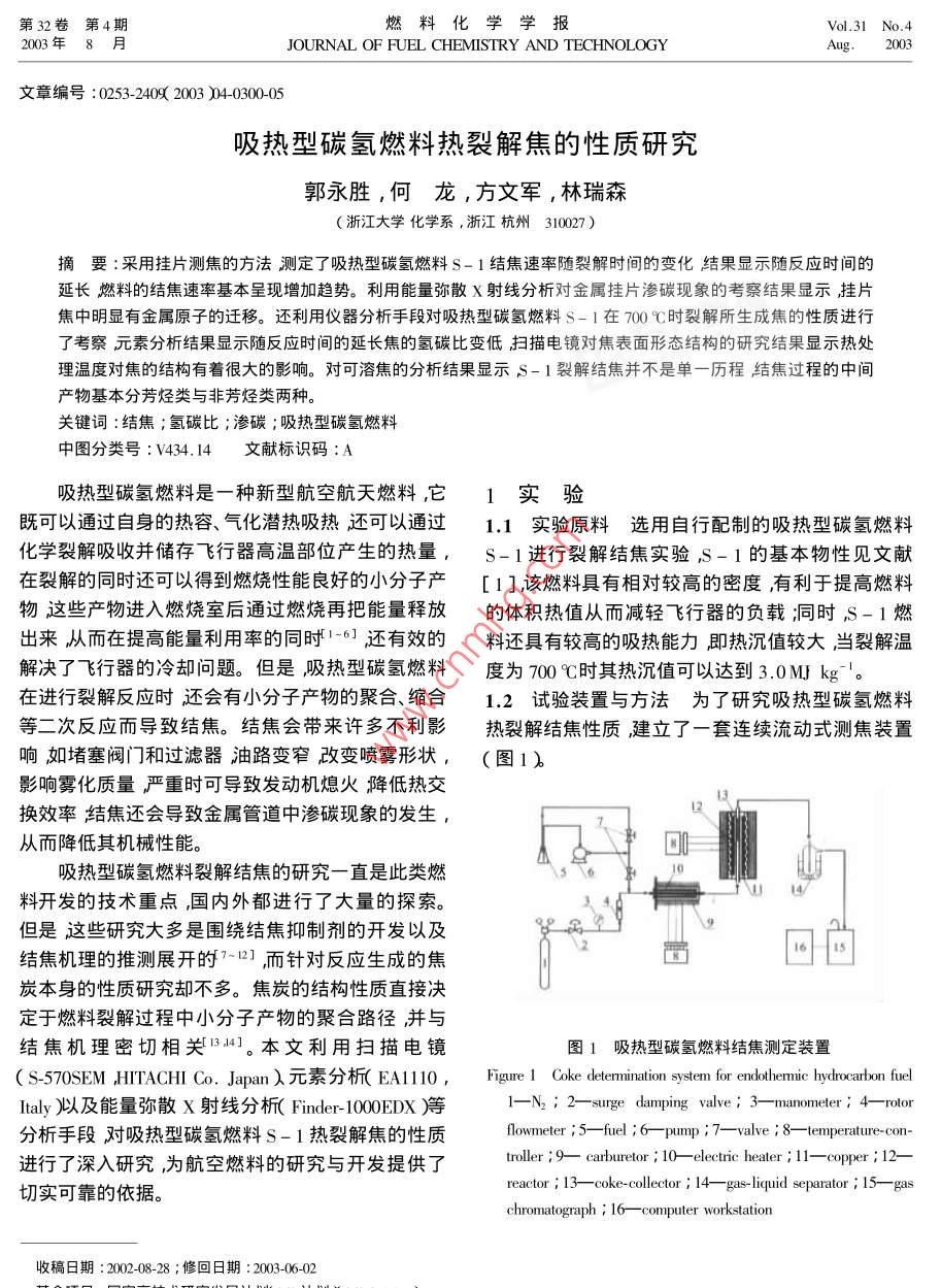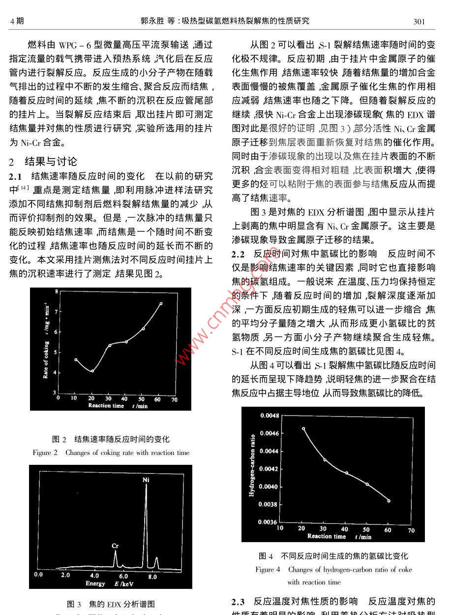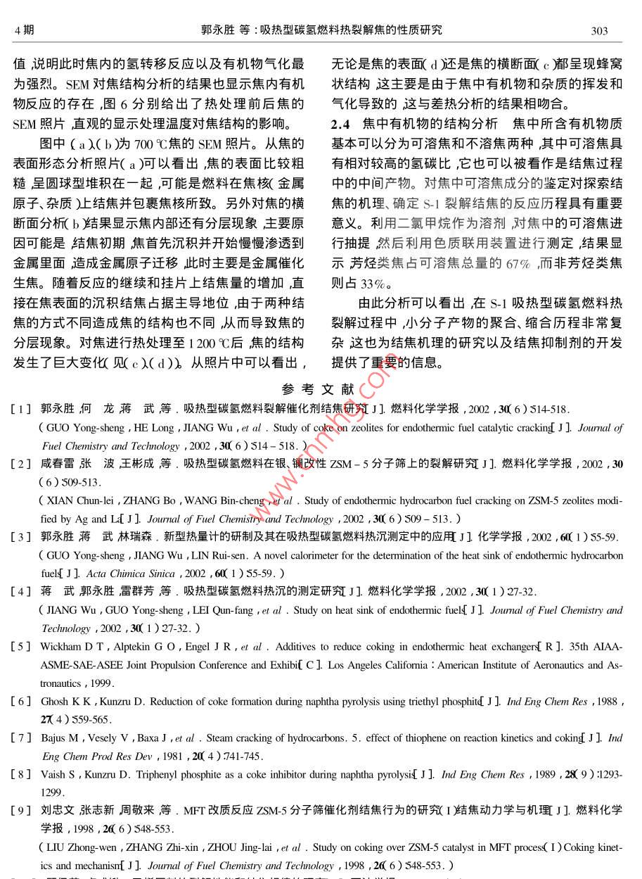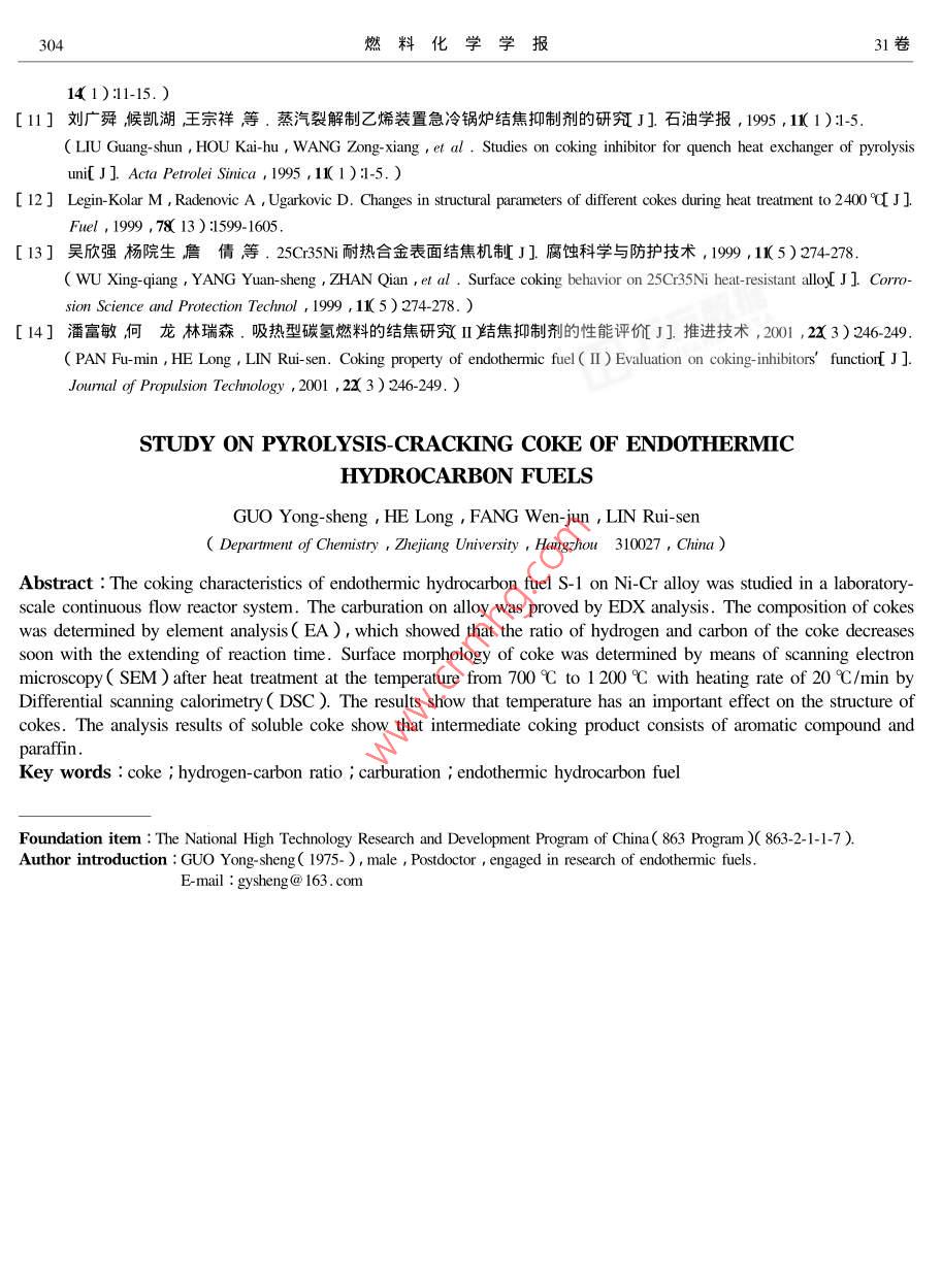 第32卷第4期燃料化學(xué)學(xué)報Vol.31 No.42003年8月JOURNAL OF FUEL CHEMISTRY AND TECHNOLOGYAug.2003文章編號:0253-24092003 )04-0300-05吸熱型碳?xì)淙剂蠠崃呀饨沟男再|(zhì)研究郭永勝,何龍,方文軍,林瑞森(浙江大學(xué)化學(xué)系,浙江杭州310027 )摘要:采用掛片測焦的方法測定了吸熱型碳?xì)淙剂蟂-1結(jié)焦速率隨裂解時間的變化結(jié)果顯示隨反應(yīng)時間的延長燃料的結(jié)焦速率基本呈現(xiàn)增加趨勢。利用能量彌散x射線分析對金屬掛片滲碳現(xiàn)象的考察結(jié)果顯示掛片焦中明顯有金屬原子的遷移。還利用儀器分析手段對吸熱型碳?xì)淙剂蟂-1在700C時裂解所生成焦的性質(zhì)進(jìn)行了考察元素分析結(jié)果顯示隨反應(yīng)時間的延長焦的氫碳比變低掃描電鏡對焦表面形態(tài)結(jié)構(gòu)的研究結(jié)果顯示熱處理溫度對焦的結(jié)構(gòu)有著很大的影響。對可溶焦的分析結(jié)果顯示s- 1裂解結(jié)焦并不是單一歷程結(jié)焦過程的中間產(chǎn)物基本分芳烴類與非芳烴類兩種。關(guān)鍵詞:結(jié)焦;氫碳比;滲碳;吸熱型碳?xì)淙剂现袌D分類號:V434. 14文獻(xiàn)標(biāo)識碼:A .吸熱型碳?xì)淙剂鲜?種新型航空航天燃料,它1實驗既可以通過自身的熱容、氣化潛熱吸熱還可以通過1.1實驗原料選用自行配制的吸熱型碳?xì)淙剂匣瘜W(xué)裂解吸收并儲存飛行器高溫部位產(chǎn)生的熱量,s- 1進(jìn)行裂解結(jié)焦實驗,S- 1的基本物性見文獻(xiàn)在裂解的同時還可以得到燃燒性能良好的小分子產(chǎn)[ 1] ,該燃料具有相對較高的密度,有利于提高燃料物這些產(chǎn)物進(jìn)入燃燒室后通過燃燒再把能量釋放的體積熱值從而減輕飛行器的負(fù)載;同時,S-1燃出來,從而在提高能量利用率的同時(1-6]還有效的料還具有較高的吸熱能力即熱沉值較大當(dāng)裂解溫解決了飛行器的冷卻問題。但是,吸熱型碳?xì)淙剂隙葹?00 C時其熱沉值可以達(dá)到3.0M]J kgt'。在進(jìn)行裂解反應(yīng)時還會有小分子產(chǎn)物的聚合、縮合1.2試驗裝置與方法為了研究吸熱型碳?xì)淙剂系榷畏磻?yīng)而導(dǎo)致結(jié)焦。結(jié)焦會帶來許多不利影熱裂解結(jié)焦性質(zhì),建立了-套連續(xù)流動式測焦裝置響如堵塞閥門和過濾器油路變窄改變噴霧形狀,(圖1)2影響霧化質(zhì)量嚴(yán)重時可導(dǎo)致發(fā)動機(jī)熄火降低熱交換效率結(jié)焦還會導(dǎo)致金屬管道中滲碳現(xiàn)象的發(fā)生,從而降低其機(jī)械性能。吸熱型碳?xì)淙剂狭呀饨Y(jié)焦的研究一直 是此類燃0料開發(fā)的技術(shù)重點,國內(nèi)外都進(jìn)行了大量的探索。但是這些研究大多是圍繞結(jié)焦抑制劑的開發(fā)以及\92l結(jié)焦機(jī)理的推測展開的7-12] ,而針對反應(yīng)生成的焦茜16-15炭本身的性質(zhì)研究卻不多。焦炭的結(jié)構(gòu)性質(zhì)直接決定于燃料裂解過程中小分子產(chǎn)物的聚合路徑,并與結(jié)焦機(jī)理密切相關(guān)134]。本文利用掃描電鏡.圖1吸熱型碳 氫燃料結(jié)焦測定裝置( S-570SEM ,HTTACHI Co. Japan入元素分析( EA1110 ,Figure 1 Coke determination system for endothemie hydrocarbon fuelItaly )以及能量彌散X射線分析( Finder-100EDX )等1-N2; 2-surge damping valve; 3- -manometer; 4- rotor分析手段對吸熱型碳?xì)淙剂蟂- 1熱裂解焦的性質(zhì)flowmeter ;5一-fuel ;6- pump ;7一valve ;8一temperature- con-進(jìn)行了深入研究,為航空燃料的研究與開發(fā)提供了troller ;9一carburetor ;10- -electric heater;11- -copper ;12-reactor ; 13一-coke-collector ; 14- gas-liquid separator ; 15- -gas切實可靠的依據(jù)。chromatograph ; 16- computer workstation收稿日期: 2002-08-28 ;修回日期:2003-06-024期郭永勝等:吸熱型碳?xì)淙剂蠠崃呀饨沟男再|(zhì)研究301燃料由WPG-6型微量高壓平流泵輸送通過從圖2可以看出S-1裂解結(jié)焦速率隨時間的變指定流量的載氣攜帶進(jìn)入預(yù)熱系統(tǒng)汽化后在反應(yīng)化極不規(guī)律。反應(yīng)初期,由于掛片中金屬原子的催管內(nèi)進(jìn)行裂解反應(yīng)。反應(yīng)生成的小分子產(chǎn)物在隨載化生焦作用結(jié)焦速率較快隨著結(jié)焦量的增加合金氣排出的過程中不斷的發(fā)生縮合、聚合反應(yīng)而結(jié)焦,表面慢慢的被焦覆蓋,金屬原子催化生焦的作用相隨著反應(yīng)時間的延續(xù),焦不斷的沉積在反應(yīng)管尾部應(yīng)減弱結(jié)焦速率也隨之下降。但隨著裂解反應(yīng)的的掛片上。當(dāng)裂解反應(yīng)結(jié)束后,取出掛片即可測定.繼續(xù),很快Ni-Cr合金上出現(xiàn)滲碳現(xiàn)象(焦的EDX譜結(jié)焦量并對焦的性質(zhì)進(jìn)行研究實驗所選用的掛片圖對此是很好的證明,見圖3)部分活性Ni、Cr金屬為Ni-Cr 合金。:原子遷移到焦層表面重新恢復(fù)對結(jié)焦的催化作用。同時由于滲碳現(xiàn)象的出現(xiàn)以及焦在掛片表面的不斷2結(jié)果與 討論2.1結(jié)焦速率隨 反應(yīng)時間的變化在以前的研究沉積,合金表面變得相對粗糙,比表面積增大,使得中14]重點是測定結(jié)焦量,即利用脈沖進(jìn)樣法研究更多的烴可以粘附于焦的表面參與結(jié)焦反應(yīng)從而提添加不同結(jié)焦抑制劑后燃料裂解結(jié)焦量的減少從高了結(jié)焦速率。而評價抑制劑的效果。但是,-次脈沖的結(jié)焦量只圖3是對焦的EDX分析譜圖圖中顯示從掛片能反映初始結(jié)焦速率,而結(jié)焦是-個隨時間不斷變上