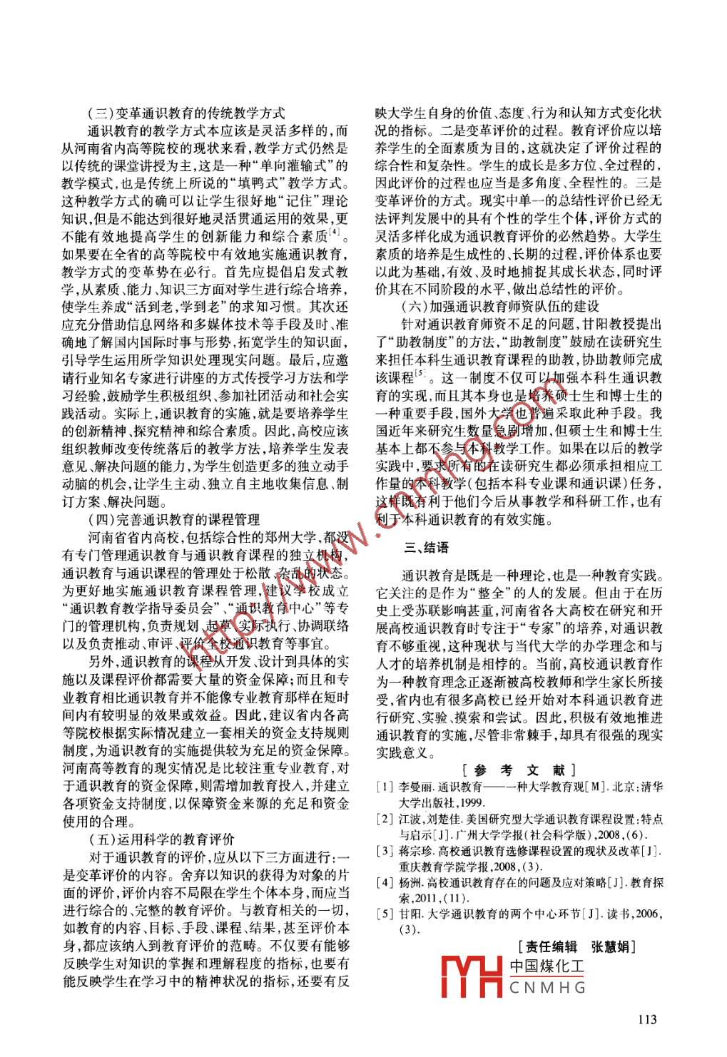 2013年10月新鄉(xiāng)學(xué)院學(xué)報(bào)(社會(huì)科學(xué)版)Oet. 2013第27卷第5期Joumal of Xinxiang University( Social Science Edition)Vol.27 No.5●管理學(xué)研究淺析河南省高校通識(shí)教育李玲(新鄉(xiāng)學(xué)院藝術(shù)學(xué)院,河南新鄉(xiāng)453000)摘要:文章從河南省 高校通識(shí)教育的發(fā)展現(xiàn)狀出發(fā),分析省內(nèi)高等院校的通識(shí)教育現(xiàn)狀及存在的共性問(wèn)題,并有針對(duì)性地對(duì)河南省高校通識(shí)教育的實(shí)施和發(fā)展提出了適合省內(nèi)具體教育資源條件的建議和對(duì)策,以便培養(yǎng)出21世紀(jì)合格的高素質(zhì)人才。關(guān)鍵詞:河南省;通識(shí)教育;對(duì)策;高校中圖分類(lèi)號(hào): G649.21文獻(xiàn)標(biāo)志碼:A文章編號(hào):1674 - 32013)05 -0111 -03收稿日期:2013-03 -19基金項(xiàng)目:河南省教育廳人文社會(huì)科學(xué)研究課題(2012 - QN -404)作者簡(jiǎn)介:李玲,女,河南新鄉(xiāng)人,新鄉(xiāng)學(xué)院教師。通識(shí)教育在美國(guó)、加拿大等國(guó)家較為流行,在我程,并且大多數(shù)將其又分為非正式通識(shí)課程與正式國(guó)的研究起步比較晚,對(duì)其真正研究是近+多年的通識(shí)課程;二是指可以供全校學(xué)生自由選修的“公事。其中,對(duì)通識(shí)教育進(jìn)行系統(tǒng)有效梳理的著作當(dāng)共選修課”,但各高校都開(kāi)設(shè)的馬克思主義理論課推李曼麗博士的《通識(shí)教育一種大學(xué)教育觀》,程和思想政治教育課程卻不屬于通識(shí)課程范圍,因其對(duì)我國(guó)高校通識(shí)教育的起源、發(fā)展過(guò)程與實(shí)施現(xiàn)它們是必修課程;三是指人文教育課程,主要包括各狀均作了詳細(xì)的論述”"。馮惠敏教授的著作《中國(guó)種人文社科類(lèi)課程?,F(xiàn)代大學(xué)通識(shí)教育》,將中國(guó)現(xiàn)代大學(xué)從清朝末期就河南省內(nèi)高校而言,對(duì)通識(shí)教育的目標(biāo)不清到民國(guó)時(shí)期,再到新中國(guó)成立初期、“文革”時(shí)期、改楚.不明確的問(wèn)題普遍存在。大多數(shù)人認(rèn)為高校的革開(kāi)放時(shí)期等階段進(jìn)行研究,系統(tǒng)地論述了我國(guó)通通識(shí)教育等同于人文教育,具體的課程設(shè)置就是全識(shí)教育的發(fā)展過(guò)程,并試圖從我國(guó)現(xiàn)代大學(xué)通識(shí)教校的公共選修課加 上公共必修課;還有部分人認(rèn)為育的歷史沿革中,摸索出具有客觀規(guī)律性的道路和實(shí)施通識(shí)教育的目標(biāo)就是要理科的學(xué)生有點(diǎn)藝術(shù)文寶貴經(jīng)驗(yàn),從而為當(dāng)今高校通識(shí)教育的改革和發(fā)展字修養(yǎng) ,要文科的學(xué)生懂點(diǎn)自然科學(xué)知識(shí);甚至某些提供啟示性的指導(dǎo)。黃俊杰教授在其編著的《大學(xué)大學(xué)只是為了應(yīng)付通識(shí)教育的要求而開(kāi)設(shè)- -大批通通識(shí)教育的理念與實(shí)踐》一書(shū)中,列舉大量的事實(shí)識(shí)意義不大的課程供學(xué)生 選修,課程內(nèi)容浮淺而雜對(duì)我國(guó)古代法家、道家、儒家的教育思想進(jìn)行了闡亂,課堂上僅僅向?qū)W生進(jìn)行“填鴨式”的講授。學(xué)生述,并對(duì)通識(shí)教育的實(shí)踐模式和核心理念進(jìn)行了論在各個(gè)課程中獲得不同的知識(shí),但是他們沒(méi)有得到術(shù)。學(xué)習(xí)和鍛煉發(fā)掘不同知識(shí)領(lǐng)域之間內(nèi)在的有機(jī)聯(lián)系的機(jī)會(huì)和能力,更沒(méi)有機(jī)會(huì)鍛煉運(yùn)用學(xué)到的各學(xué)科一、河南省高校通識(shí)教育存在的問(wèn)題分析知識(shí)來(lái)綜合處理現(xiàn)實(shí)問(wèn)題的能力,這就背離了通識(shí)(一)省內(nèi)高校通識(shí)教育的概念與目標(biāo)不明確教育的核心目標(biāo)?,F(xiàn)階段在我省各大高校設(shè)置的課程結(jié)構(gòu)中,并(二)高校通識(shí)教育的教學(xué)方式不全面沒(méi)有給通識(shí)教育以合適的定位。在大學(xué)教育的實(shí)踐美國(guó)名炸高坊通門(mén)誓育的哲學(xué)方式-般采用過(guò)程中河南省教育界各階層對(duì)高等教育的通識(shí)課程研究課、講中國(guó)煤化工立學(xué)習(xí)、教師個(gè)別指導(dǎo)與YHCN MH G行,方式豐富且的理解大致有三種:一是泛指專(zhuān)業(yè)課以外的所有課111(三)變革通識(shí)教育的傳統(tǒng)教學(xué)方式映大學(xué)生自身的價(jià)值、態(tài)度、行為和認(rèn)知方式變化狀通識(shí)教育的教學(xué)方式本應(yīng)該是靈活多樣的,而況的指標(biāo)。二是變革評(píng)價(jià)的過(guò)程。教育評(píng)價(jià)應(yīng)以培從河南省內(nèi)高等院校的現(xiàn)狀來(lái)看,教學(xué)方式仍然是養(yǎng)學(xué)生的全面素質(zhì)為目的,這就決定了評(píng)價(jià)過(guò)程的以傳統(tǒng)的課堂講授為主,這是一種“單向灌輸式”的綜合性和復(fù)雜性。學(xué)生的成長(zhǎng)是多方位、全過(guò)程的,教學(xué)模式,也是傳統(tǒng)上所說(shuō)的“填鴨式”教學(xué)方式。因此評(píng)價(jià)的過(guò)程也應(yīng)當(dāng)是多角度、全程性的。三是這種教學(xué)方式的確可以讓學(xué)生很好地“記住”理論變革評(píng)價(jià)的方式?,F(xiàn)實(shí)中單一的總結(jié)性評(píng)價(jià)已經(jīng)無(wú)知識(shí),但是不能