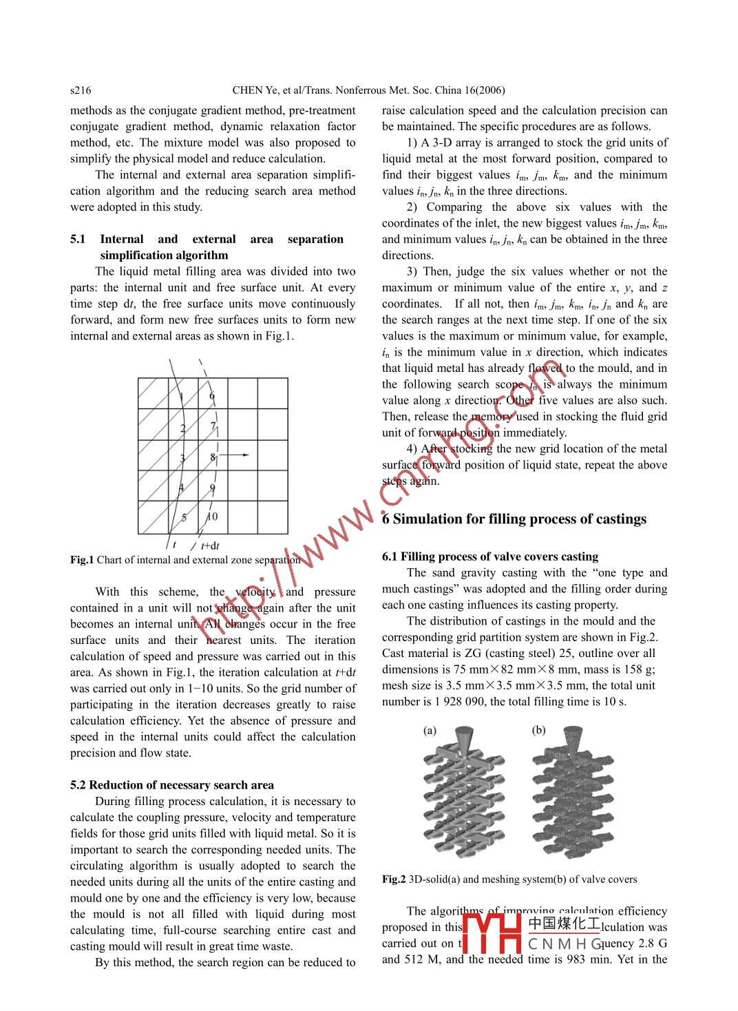 Available online at www.sciencedirect.comsCIENCEz @oIREcT.Transactions of.Nonferrous Metals罵PSociety of ChinaScienceTrans. Nonferrous Met. Soc. China 16(2006) s214-s218Presswww.csu.edu.cn/ysxb/Numerical simulation for thermal flow filling process of castingCHEN Ye(陳嘩), ZHAO Yu-hong(趙宇宏)尸,HOU Hua(侯華)'1. College of Materials Science and Engineering, North University of China, Taiyuan 03005 1, China;2. College of Materials Science and Engineering, Taiyuan University of Technology, Taiyuan 030024, ChinaReceived 20 April 2006; accepted 30 June 2006Abstract: The solution algorithm (SOLA) method was used to solve the velocity and pressure field of the thermal flow fllingprocess, and the volume of fluid (VOF) method for the free surface problem. Since the“donor-acceptor rule often results in the freeinterface vague, the explicit difference method was adopted, and a method describing the free surface state at0