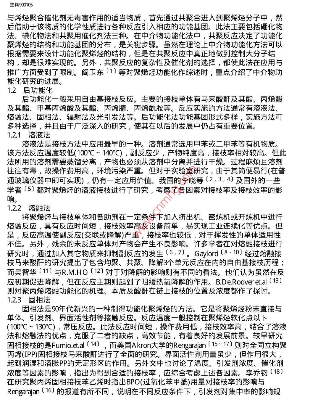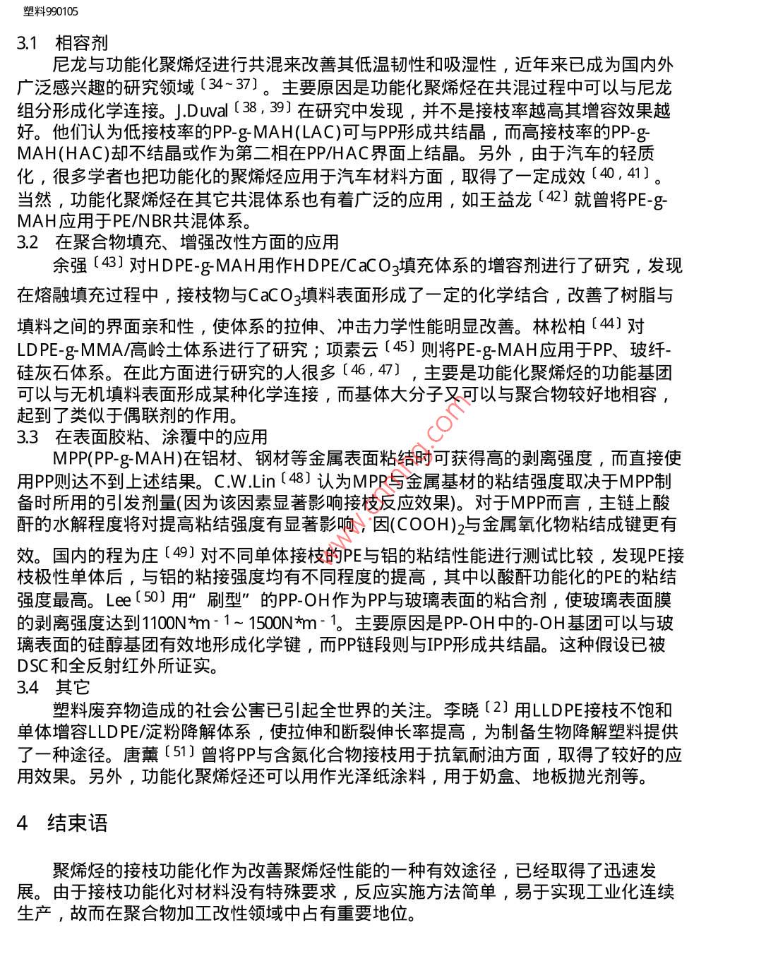 塑料990105塑料田ChinalnfoPLASTICS科技期刊。WANFANG DATA1999年第1期No.11999接枝功能化聚烯烴高玉平黃濤趙建青聚烯烴功能化是目前人們普遍關注的熱點。綜述了國內(nèi)外對聚烯烴進行功能化的各種方法,其中重點討論了聚烯烴的接枝功能化,并對接枝物的結構性能與應用作了簡要介紹。關鍵詞:聚烯烴功能化接枝應用Graft Functionalization of PolyolefinsGao YupingH uangT a0 and Zhao Jianqing(Department of Macromolecule, South China University of T echnology,Guangzhou,510641)The functionalization of polyolefins has been a common concern recently.V arious methodsof the functionalization of polyolefins at home and abroad aresummarized.T he discussion isconcentrated on polyolefins' graft functionalization.And the structures and applications ofgrafted polymers are mentioned as well. .Keywords.polyolefins, functionalization,graftapplication前言聚烯烴具有良好的力學性能、電性能、化學性能等,且其價格低廉,故被廣泛應用于日常生活及工農(nóng)業(yè)和軍事等許多領域。然而,由于其非極性,表面能低導致了它的染色性、粘結性、抗靜電性、親水性及和其它極性高分子或無機填料等的相容性差,限制了它的應用范圍的進-步擴大。為了滿足對聚烯烴材料日益增長的要求,使聚烯烴應用到工程方面或做某些特殊用途,就必須對其進行改性。所謂聚烯烴的功能化是指通過適當?shù)姆椒ㄔ诰巯N分子中引入功能基團,從而賦予聚烯烴特殊功能的方法。聚烯烴的功能化有后功能化法和中介物功能化法,其中,后功能化方法的研究工作開展得較早,而且現(xiàn)在仍然十分活躍。本文主要對聚烯烴后功能化中的接枝功能化進行討論。1功能化方法1.1中介物功能化借助于中介物實現(xiàn)聚烯烴功能化是其功能化的新思路和新方法。該方法選用- -種fle//E/ 151919190195.tm(第1/7頁) 2010-3-236:58:22塑料990105與烯烴聚合催化劑無毒害作用的適當物質,首先通過共聚合進入到聚烯烴分子中,然后借助于該物質的化學性質進行各種反應引入相應的功能基團。此法主要包括硼化物法、碘化物法和共聚用催化劑法三種。在中介物功能化法中, 共聚反應決定了功能化聚烯烴的結構和功能基團的分布,是關鍵步驟。雖然在理論上中介物功能化方法可以根據(jù)需要來設計功能化聚烯烴的結構,但是在共聚反應中真正地做到控制大分子結構,卻是很難實現(xiàn)的。另外,共聚反應的復雜性及催化劑的選擇, 都使此法在應用與推廣方面受到了限制。閻衛(wèi)東[1]等對聚烯烴功能化作綜述時, 重點介紹了中介物功能化研究的進展。1.2 后功能化后功能化-般采用自由基接枝反應。主要的接枝單體有馬來酸酐及其酯、丙烯酸及其酯、甲基丙烯酸及其酯、丙烯腈、丙烯酰胺等。反應實施的方法通常有溶液法、熔融法、固相法、輻射法及光引發(fā)法等。后功能化法功能基團形式多樣,實施方法可多種選擇,并且由于廣泛深入的研究,使其在以后的發(fā)展中仍占有重要位置。1.2.1 溶液法溶液法是接枝方法中應用最早的一種。溶劑通常選用甲苯或_ =甲苯等有機物質。該方法反應溫度較低(100°C~ 140°C) ,副反應少,產(chǎn)物純度高,接枝率相對較高。但此法所用的溶劑需要蒸餾分離,產(chǎn)物也必須從溶劑中分離并進行干燥。過程麻煩且溶劑往往有毒,故操作費用高,環(huán)境污染嚴重。但對于實驗室研究,由于其簡便易行(在普通玻璃儀器中即可實現(xiàn)) ,仍有一定應用價值。我國的李曉等[2,3,4]及國外的一些學者[5]都對聚烯烴的溶液接枝進行了研究,考察了各因素對接枝率及接枝效率的影響。1.2.2 熔融法將聚烯烴與接枝單體和各助劑在-定條件下加入擠出機、密煉機或開煉機中進行熔融反應,具有反應時間短,接枝效率高及設備簡單,易實現(xiàn)工業(yè)連續(xù)化等優(yōu)點。但是,反應高溫使副反應(交聯(lián)或降解)嚴重,接枝率也較低,對于揮發(fā)性的單體適用性不佳。另外,殘余的未反應單體對產(chǎn)物會產(chǎn)生不良影響。許多學者在對熔融接枝進行研究時,通過加入其它物質來抑制副反應的發(fā)生[6, 7]。Gaylord [8~10]經(jīng)過熔融接枝馬來酸酐的研究提出了包含均聚、共聚、降解3個單元反應在內(nèi)的自由基接枝歷程;而吳智華[11]與R.M.HO [12]對于對降解的影響則有不同的看法。他們認為雖然在反應初期促進降解,但在反應主期則起到了阻緩熱氧降解的作用。B.De.Rooveret.al [13]則對聚丙烯熔融功能化的機理、本質及酸酐在鏈上接枝的位置及濃度都作了探討。1.2.3固相法固相法是90年代新興的一種制得功能化聚烯烴的方法。它是將聚烯烴粉末直接與單體、引發(fā)劑、界面活性劑等接觸反應。反應溫度-般控制在聚烯烴軟化點以下(100°C~ 130°C) ,常壓反應。此法反應時間短,操作費用低,接枝效率高,結合了溶液法和熔融法的優(yōu)點,克服了二者的缺點,高效節(jié)能,有著良好的發(fā)展前景。較早研究固相接枝的是Fumio.et.al [14] , 而美國Akron大學的Rengarajan [15 ~ 17]則對全同立構聚丙烯(IPP)固相接枝馬來酸酐進行了全面的研究。界面活性劑用量雖少,但作用很大,起到潤濕和溶脹PP的無定形區(qū)的作用。另外文中也討論了溫度、引發(fā)劑濃度、催化劑.濃度等因素的影響,指出為得到合適的接枝率, 應綜合考慮上述各因素。李喬鈞[18]在研究聚丙烯固相接枝苯乙烯時指出BPO(過氧化苯甲酰)用量對接枝率的影響與Rengarajan [16]的