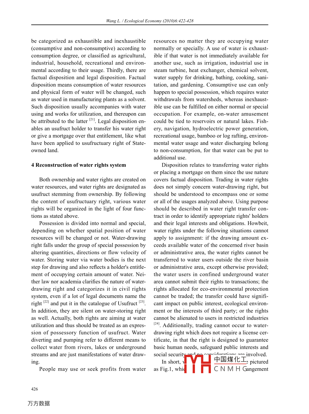 Ecological Economy (2010)6:422-428Empirical StudyRebuilding water rights system from the perspective of usufructWANG LeiSchool of Law, Southwestern University of Finance and Economics, Chengdu 610074, P: R. ChinaAbstract: As the source of life, water is indispensable to human beings. Being aware of the water stress imposed bypopulation growth, climate change, rapid urbanization, pollution, many scholars and decision makers argue that theestablishment of water rights cand their system is the primary measure to tackle the water crisis problem. However;no consensus has been reached regarding the definition, nature and content of water rights both practically anaacademically. By examining the existing theories regarding water rights, this article tries to redefine the entitlementsfrom the aspect of civil law. Meanwhile, it provides a system which classifies various rights by the four fiunctions ofusufruct.Keywords: Water rights; Water rights system; Water resources; Usufruct1 Introductiontransfer has been recognized by the governmentand non-government advocates as both an efficientThe recent drought ravaging southwest China and conflict-reducing means to achieve environ-for months, had led millions of residents in Gui- mental and ecological ends such as maintainingzhou, Yunnan, Sichuan, Chongqing, and Guangxi instream flow, conservation of soil and water 2.faced up with drinking water shortages. Although On the contrary, the academic field fails to makeit seems that the disaster resulted from the impact a strong response to the practical needs of waterof greenhouse gases on the hydrologic cycle, the market and water trading, which actually involvesdestabilized climate should not take all the at- the definition of water rights and the identificationtribution. A lack of effective water rights systemsof their system.creates major problems for the management ofSince a clear definition of property rights is aincreasingly scarce water supplies.requisite for market economy, this article tries toAs the source of life, water is indispensable to redefine water rights from the aspects of subject,human beings. However, the distribution of this object and content, by examining the existingnatural resource in China varies largely from place theories regarding water rights. In the meanwhile,to place and the imbalance between supply and it provides a system which classifies various rightsdemand exacerbates, especially under the context by the functions of usufructuary right.of the unexpected natural calamity. It has beenargued that the best way to meet the challenge is 2 An overview and analysis of existing theoriesthe introduction of market mechanism into water concerning water rightssupply. The construction of the market-based in-stitutional and regulatory systems is the primaryThere are various theories about water rights,measure to tackle the water crisis problem. The especially relating to the definition of water rights.transfer of water required by market can offer sub- In sum, those explanations can be classified intostantial economic efficiencies in distributing water two schools in accordance with whether ownershipto those who value it most "I. What's more, water of water resources is included.2.1 A system of rights including ownership of wa-Received June 16, 2010; Accepted Aug. 10, 2010* E-mail address: leiwangl 140@hotmail.comter resources中國(guó)煤化工Author: WANG Lei (1979- ), female, lecturer, PhD, specializedin water law.Professor,MYHC N M H Gargument422◎2010 Ecological Economy (ttp://xb.suse .edu.cn/)Wang L. / Ecological Economy (2010)6:422-428about water rights by saying that the system con- paid on utilization instead of ascription of prop-sisting of the ownership, the usufructuary right,erty. Hence, it is unnecessary to put ownership intothe right for public using, the administrative right,the category of water rights. Moreover, the ideathe management right of water resources, the envi- of land determining water was established underronmental right to water, and the property right ofthe historical background that water was privatelyaquatic product [3]. The same opinion was sharedowned as land, but with water being realized as .by other scholars, by holding that water rights arenon-renewable resources, it is isolated from landa group of rights containing the ownership, the and ascribed to the state or public (91 and accord-usufructuary right and the management right 4, oringly there is no need to follow the rights regimea bunch of rights covering the ownership, the usu- relating to land.fructuary right, the right for water allocation, thComprehensiveness seems to feature in thealienation right, the trading right, etc 5I. Besides,opinions regarding a group or a bunch of rights.some views narrowed the scope of the water rights However, they have caused contradiction andsystem, which only comprises the ownership andconfusion to the water rights system since thosethe usufructuary right 0. Encyclopedia of China specific rights are overlapped and some of them. Water points out that water rights mean individu-are not labeled from legal perspective. Besides, theals' or organizations' ownership and the usufruc- hybrid conception of property rights and drawingtuary right of surface and underground water”right regarding water fails to make a clear distinc-Furthermore, the right of drawing water is increas- tion between water resources and water products,ingly recognized as the key element for waterto explain the nature of water rights and, more im-resources being transformed into water products,portantly, to categorize water- drawing right in civiland reflects the distribution of water resources and rights system. Anyway, in light of the designinga means of its exhaustible consumption. Under theintention and the trading essence of the system,context, water rights are identified as a hybrid of water right means the usufructury right of waterproperty rights and drawing right regarding water,