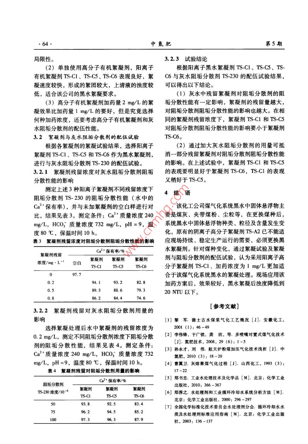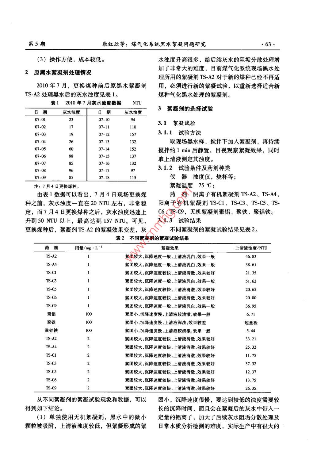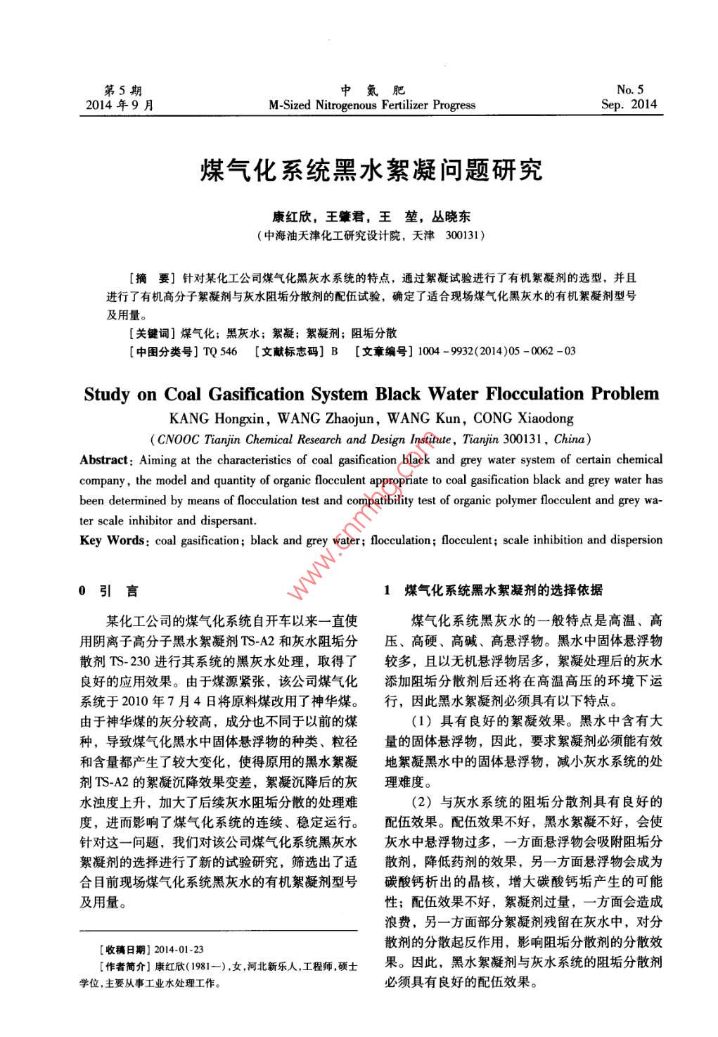 第5期中氮肥 No.52014年9月 M-Sized Nitrogenous Fertilizer ProgressSep.2014煤氣化系統(tǒng)黑水絮凝問題研究康紅欣,王肇君,王堃,叢曉東(中海油天津化工研究設(shè)計(jì)院,天津300131)摘要]針對(duì)某化工公司煤氣化黑灰水系統(tǒng)的特點(diǎn),通過絮凝試驗(yàn)進(jìn)行了有機(jī)絮凝劑的選型,并且進(jìn)行了有機(jī)高分子絮凝劑與灰水阻垢分散劑的配伍試驗(yàn),確定了適合現(xiàn)場(chǎng)煤氣化黑灰水的有機(jī)絮凝劑型號(hào)及用量。關(guān)鍵詞]煤氣化;黑灰水;絮凝;絮凝劑;阻垢分散中圖分類號(hào)]TQ546【文獻(xiàn)標(biāo)志碼]B【文章編1004-9932(201405-0062-03 Study on Coal Gasification System Black Water Flocculation Problem KANG Hongxin, WANG Zhaojun, WANG Kun, CONG Xiaodong (CNOOC Tianjin Chemical Research and Design Institute, Tianjin 300131, China) Abstract: Aiming at the characteristics of coal gasification black and grey water system of certain chemical company, the model and quantity of organic flocculent appropriate to coal gasification black and grey water has been determined by means of flocculation test and compatibility test of organic polymer flocculent and grey wa- ter scale inhibitor and dispersant. Key Words: coal gasification; black and grey water; flocculation; flocculent; scale inhibition and dispersion0引言1煤氣化系統(tǒng)黑水絮凝劑的選擇依據(jù)某化工公司的煤氣化系統(tǒng)自開車以來(lái)一直使煤氣化系統(tǒng)黑灰水的一般特點(diǎn)是高溫、高用陰離子高分子黑水絮凝劑TA2和灰水阻垢分壓、高硬、高堿、高懸浮物。黑水中固體懸浮物散劑TS-230進(jìn)行其系統(tǒng)的黑灰水處理,取得了較多,且以無(wú)機(jī)懸浮物居多,絮凝處理后的灰水良好的應(yīng)用效果。由于煤源緊張,該公司煤氣化添加阻垢分散劑后還將在高溫高壓的環(huán)境下運(yùn)系統(tǒng)于2010年7月4日將原料煤改用了神華煤。行,因此黑水絮凝劑必須具有以下特點(diǎn)。由于神華煤的灰分較高,成分也不同于以前的煤(1)具有良好的絮凝效果。黑水中含有大種,導(dǎo)致煤氣化黑水中固體懸浮物的種類、粒徑量的固體懸浮物,因此,要求絮凝劑必須能有效和含量都產(chǎn)生了較大變化,使得原用的黑水絮凝地絮凝黑水中的固體懸浮物,減小灰水系統(tǒng)的處劑TS-A2的絮凝沉降效果變差,絮凝沉降后的灰理難度。水濁度上升,加大了后續(xù)灰水阻垢分散的處理難(2)與灰水系統(tǒng)的阻垢分散劑具有良好的度,進(jìn)而影響了煤氣化系統(tǒng)的連續(xù)、穩(wěn)定運(yùn)行。配伍效果配伍效果不好,黑水絮凝不好,會(huì)使針對(duì)這一問題,我們對(duì)該公司煤氣化系統(tǒng)黑灰水灰水中懸浮物過多,一方面懸浮物會(huì)吸附阻垢分絮凝劑的選擇進(jìn)行了新的試驗(yàn)研究,篩選出了適散劑,降低藥劑的效果,另一方面懸浮物會(huì)成為合目前現(xiàn)場(chǎng)煤氣化系統(tǒng)黑灰水的有機(jī)絮凝劑型號(hào)碳酸鈣析出的晶核,增大碳酸鈣垢產(chǎn)生的可能及用量。性;配伍效果不好,絮凝劑過量,一方面會(huì)造成浪費(fèi),另一方面部分絮凝劑殘留在灰水中,對(duì)分【收稿日期】2014-01-23散劑的分散起反作用,影響阻垢分散劑的分散效作者簡(jiǎn)介]康紅欣(1981-),女河北新樂人,工程師,碩士果因此,黑水絮凝劑與灰水系統(tǒng)的阻垢分散劑學(xué)位,主要從事工業(yè)水處理工作。必須具有良好的配伍效果。第5期康紅欣等:煤氣化系統(tǒng)黑水絮凝問題研究63(3)操作方便,成本較低。水濁度升高很多,給后續(xù)灰水的阻垢分散處理增2原黑水絮凝劑處理情況加了非常大的難度,目前煤氣化系統(tǒng)現(xiàn)場(chǎng)黑水處理所用的絮凝劑TS-A2對(duì)于新的煤種已經(jīng)不再適2010年7月,更換煤種前后原黑水絮凝劑用,須進(jìn)行新的絮凝試驗(yàn),以重新選擇適合新TS-A2處理黑水后的灰水濁度見表1煤種氣化黑水處理的絮凝劑。表12010年7月灰水濁度數(shù)據(jù)NTU日期灰水濁度日期灰水濁度3絮凝劑的選擇試驗(yàn)07-012307-109407-023.1絮凝試驗(yàn)1707-1111007-031907-121573.1.1試驗(yàn)方法07-042607-13132取現(xiàn)場(chǎng)黑水樣,攪拌下加入絮凝劑,再持續(xù)07-056007-14152攪拌約1min后靜置,目視觀察絮凝效果,同時(shí)07-069807-1513707-078507-16132取上清液測(cè)定其濁度。07-089607-17973.1.2試驗(yàn)條件及藥劑種類07-098507-18115儀器濁度儀,燒杯等;注:7月4日更換煤種。絮凝溫度75℃;由表1數(shù)據(jù)可以看出,7月4日現(xiàn)場(chǎng)更換煤藥劑陰離子有機(jī)絮凝劑TS-A2、TS-A4,種之前,灰水濁度一直在20NTU左右,非常穩(wěn)陽(yáng)離子有機(jī)絮凝劑ts-cl、ts-c3、ts-c5、ts定,而7月4日更換煤種之后,灰水濁度迅速上6、SC9,無(wú)機(jī)絮凝劑聚鋁、聚鐵、聚鋁鐵升到50NTU以上,最高達(dá)到157NTU??梢?3.1.3試驗(yàn)結(jié)果更換煤種后,絮凝劑TS-A2的絮凝效果變差,灰不同絮凝劑的絮凝試驗(yàn)結(jié)果見表2。表2不同絮凝劑的絮凝試驗(yàn)結(jié)果藥劑用量/mg·L-絮凝效果上清液濁度/NTU TS-A21絮團(tuán)較大,沉降速度一般,上清液乳白,效果一般46.83 TS-A4絮團(tuán)較大,沉降速度一般,上清液乳白,效果一般38.61 TS-CI絮團(tuán)較大,沉降速度較快,上清液清澈,效果較好21.35 TS-C3 TS-C5111111上里絮團(tuán)較大,沉降速度一般,上清液乳白,效果一般51.6絮團(tuán)較大,沉降速度較快,上清液清澈,效果較好20.65 TS-C6絮團(tuán)較大,沉降速度較快,上清液清澈,效果