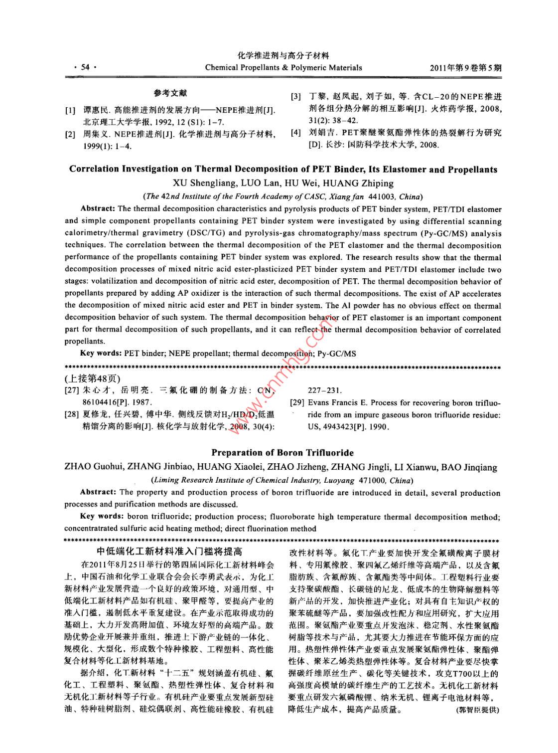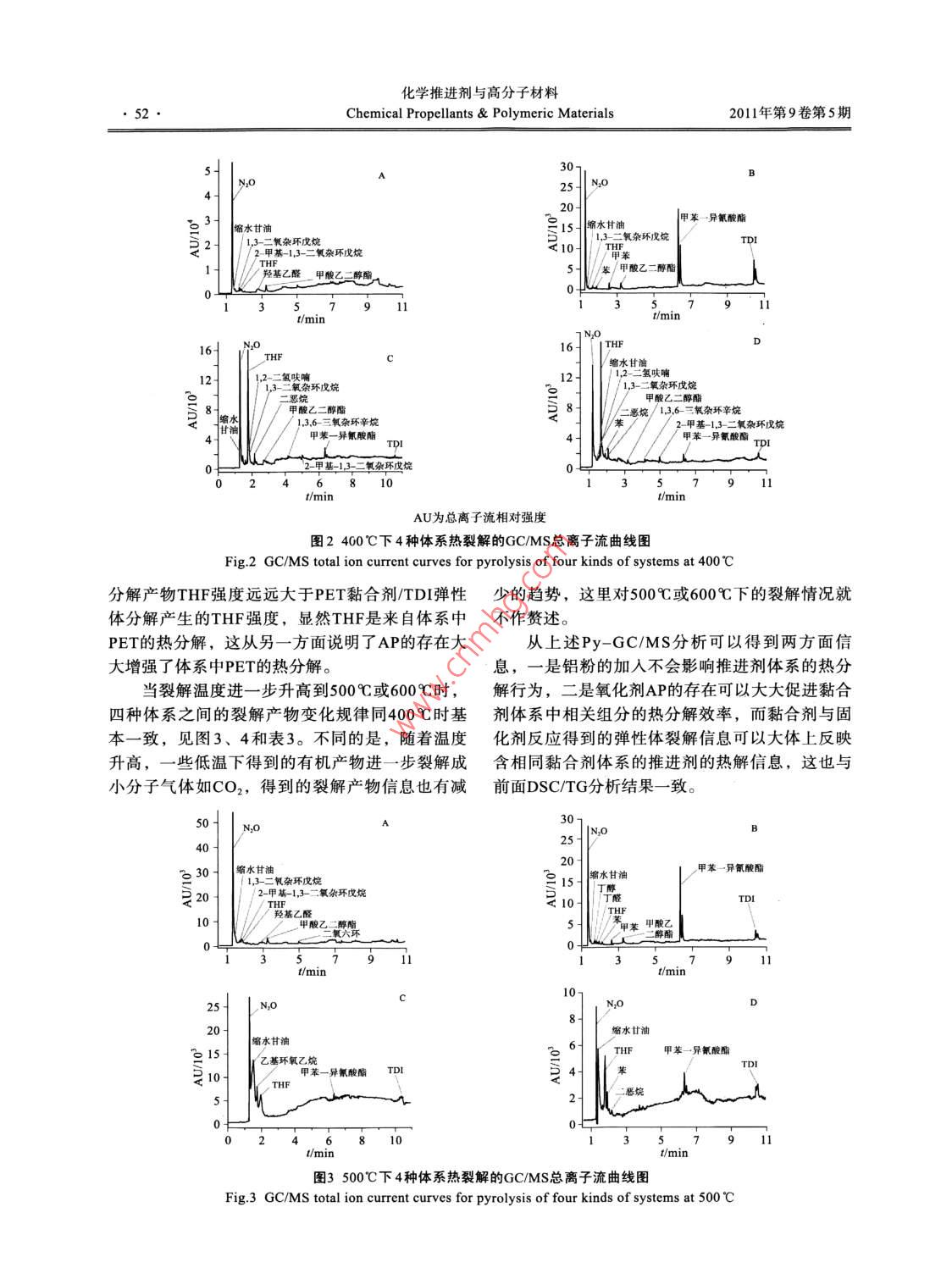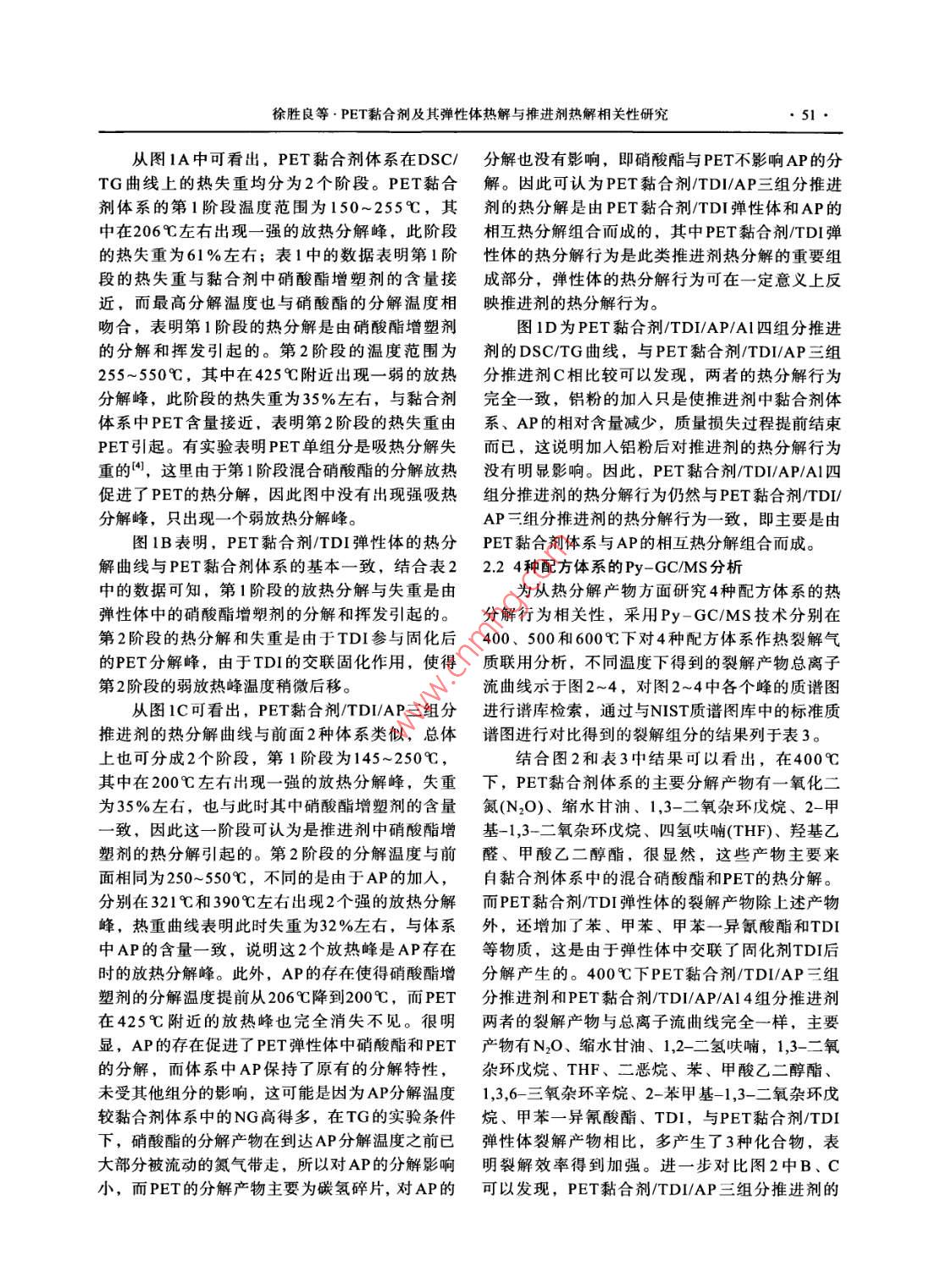 化學(xué)推進(jìn)劑與高分子材料201 1年第9卷第5期Chemical Propellants & Polymeric Materials49●●研究與開(kāi)發(fā)●PET黏合劑及其彈性體熱解與推進(jìn)劑熱解相關(guān)性研究徐勝良,羅嵐,胡偉,黃志萍(中國(guó)航天科技集團(tuán)公司四院四十二所,湖北襄樊441003)摘要:采用差示掃描最熱/熱重(DSC/TG)和裂解氣相色譜質(zhì)譜聯(lián)用(Py- GC/MS)分 析技術(shù)研究了PET黏合劑體系、PET/TDI彈性體以及含PET黏合劑體系的簡(jiǎn)單組分推進(jìn)劑的熱分解特性和熱裂解產(chǎn)物狀況,探索了peT彈性體的熱分解與含peT黏合劑體系的推進(jìn)劑熱解性能之間的相關(guān)性。研究結(jié)果表明,混合硝酸酯增塑的PET黏合劑體系和PET/TDI彈性體的熱分解過(guò)程分為2個(gè)階段:硝酸酯的.揮發(fā)和分解,PET 的分解。引人氧化劑AP后制成的推進(jìn)劑的熱分解行為是上述熱分解行為的共同作用,其中AP的存在促進(jìn)了黏合劑體系中混合硝酸酯和PET的分解,AI粉對(duì)該體系的熱分解行為沒(méi)有明顯影響。PET彈性體的熱分解行為是此類(lèi)推進(jìn)劑熱分解的重要組成部分,它的熱分解行為基本上能反映相關(guān)推進(jìn)劑的熱分解行為。關(guān)鍵詞: PET黏合劑; NEPE推進(jìn)劑;熱分解;裂解氣相色譜質(zhì)譜中圖分類(lèi)號(hào): TQ433文獻(xiàn)標(biāo)識(shí)碼: A文章編號(hào): 1672-2191(2011)05- 0049 -06NEPE推進(jìn)劑綜合了雙基推進(jìn)劑和復(fù)合推進(jìn)關(guān)系,為深入了解推進(jìn)劑的燃燒機(jī)理進(jìn)而為該推劑的優(yōu)點(diǎn),是能量性能和力學(xué)性能優(yōu)異的新型推進(jìn)劑的能量和燃燒性能的調(diào)節(jié)奠定基礎(chǔ)。文中選進(jìn)劑,代表著高能固體推進(jìn)劑的發(fā)展方向"。此撣典型的PET黏合劑體系、PET/TDI彈性體體系.類(lèi)推進(jìn)劑的-個(gè)重要特點(diǎn)是其黏合劑體系采用硝和不同配方的簡(jiǎn)單組分推進(jìn)劑為對(duì)象,采用差示酸酯增塑的聚醚黏合劑,并添加了能量物質(zhì)奧克托掃描量熱/熱重(DSC/TG)和裂解氣相色譜質(zhì)譜聯(lián)今(HMX)、高氯酸銨(AP)和金屬鋁粉等組分2]。用(Py-GC/MS)分析技術(shù)研究了它們的熱分解特在滿足NEPE推進(jìn)劑良好能量水平和力學(xué)性能的性,探索了PET彈性體的熱分解與含PET黏合劑聚醚黏合劑中,聚環(huán)氧乙烷-四氫呋喃共聚醚體 系的推進(jìn)劑熱解性能之間的相關(guān)性。(PET)黏合劑體系是一-種較有前途的黏合劑體系。1實(shí)驗(yàn)部分熱分解是固體推進(jìn)劑燃燒過(guò)程得以存在的前提和基礎(chǔ),它所釋放的能量是燃燒波傳播的動(dòng)1.1 材料與制備力,推進(jìn)劑配方中各組分的熱分解行為及整個(gè)配.甲苯二異氰酸酯(TDI):工業(yè)級(jí),拜耳公司;方的熱分解規(guī)律都必然會(huì)影響到推進(jìn)劑的燃燒過(guò)二官能度PET(M。約4500)、三官能度PET(Mn程)]。在以PET為黏合劑的NEPE推進(jìn)劑固化過(guò)約5 000):洛陽(yáng)黎明化工研究院;混合硝酸酯程中,PET黏合劑體系與固化劑反應(yīng)形成的聚醚(BG):含硝化甘油(NG)和三縮二乙二醇二硝酸酯聚氨酯彈性體即是推進(jìn)劑力學(xué)性能的基礎(chǔ)因素,(TEGDN),湖北襄樊航天四十二所; Al粉:蓋州而且彈性體本身作為燃料又在推進(jìn)劑的熱分解和市金屬粉末廠;高氯酸銨(AP):大連氯酸鉀廠;燃燒過(guò)程中起著重要的作用。三苯基秘(TPB):試劑級(jí),上海有 機(jī)所。了解PET黏合劑體系和基于PET黏合劑彈PET黏合劑體系:以-定配比的二、三官能性體熱分解特性對(duì)理解推進(jìn)劑的熱分解有重要意度PET混合物和混合硝酸酯按--定增塑比制備而義,對(duì)研究該類(lèi)推進(jìn)劑燃燒機(jī)理有重要作用4。成。選用的PET黏合劑、PET/TDI 彈性體體系、因此,筆者進(jìn)行了PET黏合劑體系、PET彈性體PET黏合劑/固化劑/AP三組分推進(jìn)劑和PET黏合的熱解行為與基于PET黏合劑體系的推進(jìn)劑熱解劑/固化劑/AP/AI四組分推進(jìn)劑的配方見(jiàn)表1。性能相關(guān)性研究,旨在進(jìn)--步揭示PET彈性體的制備方法:按固化參數(shù)R=1.3稱取PET黏合熱解特性與含PET黏合劑體系的推進(jìn)劑熱解性能劑、TDI固化劑、AP或AI粉于聚四氟乙烯容器收稿日期: 2011-03-03作者簡(jiǎn)介:徐勝良(1976-),男,工程師,主要從事固體推進(jìn)劑分析測(cè)試技術(shù)研究。電子信箱: chemxu@mail.ustc .edu.cn化學(xué)推進(jìn)劑與高分子材料●50●Chemical Propellants & Polymeric Materials2011年第9卷第5期表1制備樣品的配方Tab.l Formulation of prepared samples體系配方w(PET)/%w(BG)/%w(TD)/%w(AP)%w(A1)/%PET黏合劑體系4060PET黏合劑/TDI彈性體體系35.252.812.0PET黏合劑/TDI/AP三組分推進(jìn)劑23.635.033.4PET黏合劑/TDIAP/AI 四組分推進(jìn)劑21932..531 3中,用聚四氟乙烯棒充分?jǐn)嚢枋蛊浠旌暇鶆?,抽流?.0mL/min;色譜柱: HP-5MS彈性石英真空除去氣體,把物料倒人聚四氟乙烯模具中,毛細(xì)管柱,30mx0.25 mmx0.25μm;柱溫:置于50C油浴烘箱中固化7d,冷卻至室溫,即得初始溫度50C,不保留,以10C/min速 率升溫PET彈性體和各單元組分推進(jìn)劑的樣品。至240C;進(jìn)樣量: 0.2~0.5 mg;③質(zhì)譜條件:1.2實(shí)驗(yàn)儀器離子源: EI源;電子能量: 70eV; GC接口溫美國(guó)TA公司SDTQ600 DSC-TG; WATERS度: 250C; MS溫度: 200C;檢測(cè)器電壓:公司GCT氣相色譜/質(zhì)譜聯(lián)用儀;澳大利亞SGE 2 550V;質(zhì)量掃描范圍: 10~ 800 amu。公司管式
