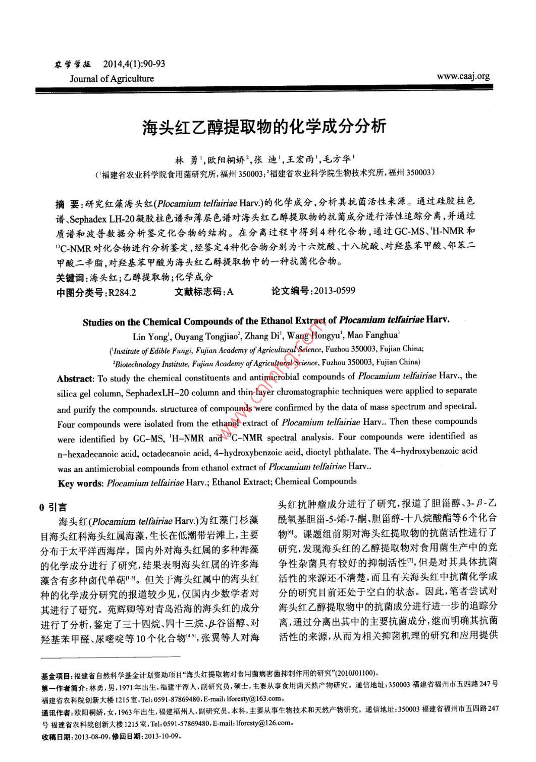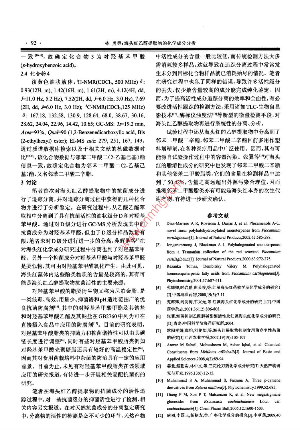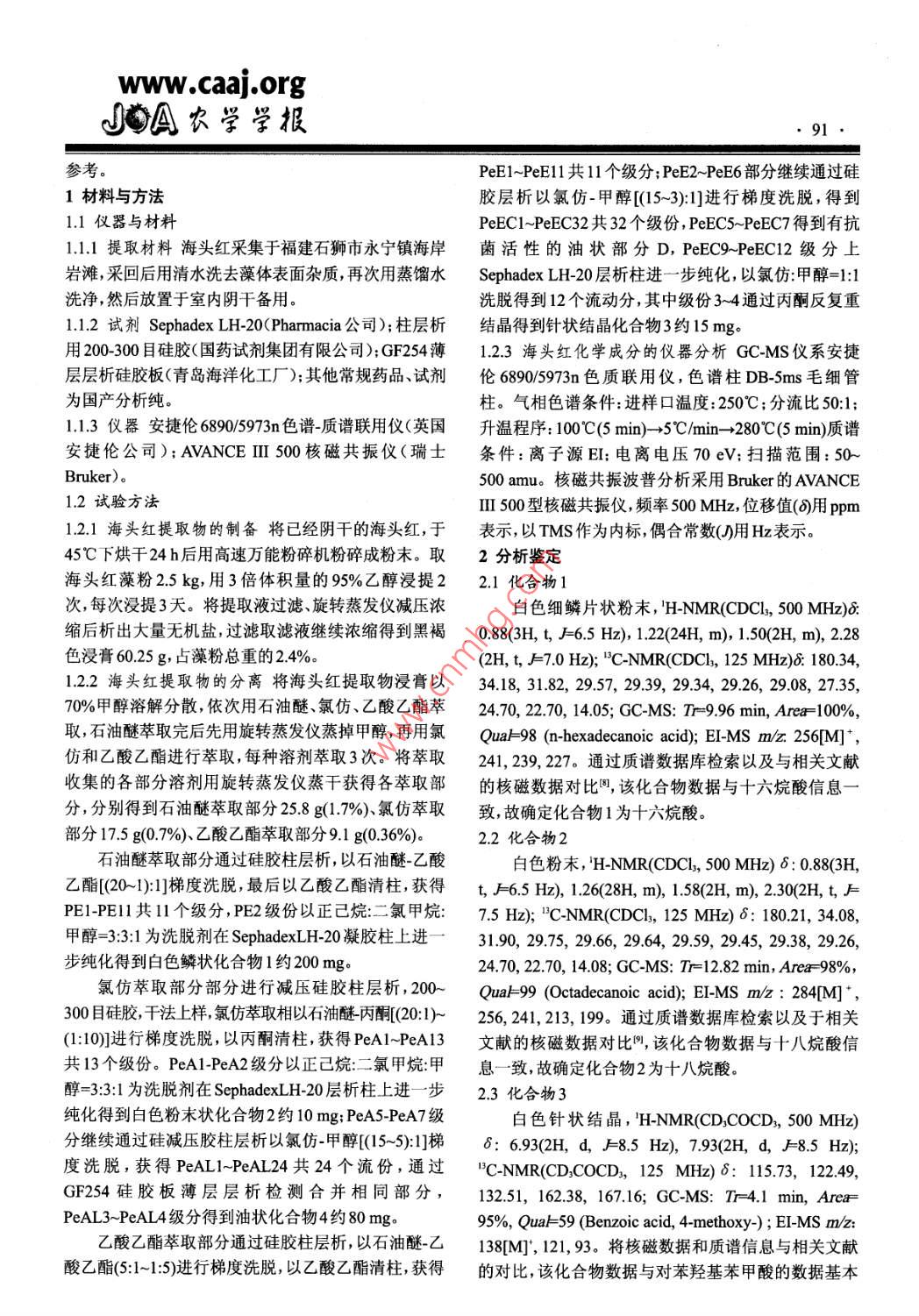 農(nóng)學(xué)學(xué)報(bào)2014,4(1):90Journal of Agriculturewww.caa].org海頭紅乙醇提取物的化學(xué)成分分析林勇',歐陽桐嬌2,張迪',王宏雨',毛方華(福建省農(nóng)業(yè)科學(xué)院食用菌研究所,福州350003:福建省農(nóng)業(yè)科學(xué)院生物技術(shù)究所,福州350003)摘要:研究紅藻海頭紅( Plocamium telfairiae harⅳ)的化學(xué)成分,分析其抗菌活性來源。通過硅膠柱色譜、 Sephadex Lh-20凝膠柱色譜和薄層色譜對(duì)海頭紅乙醇提取物的抗菌成分進(jìn)行活性追蹤分離,并通過質(zhì)譜和波普數(shù)據(jù)分析鑒定化合物的結(jié)構(gòu)。在分離過程中得到4種化合物,通過GCMS、HM和"C-NMR對(duì)化合物進(jìn)行分析鑒定,經(jīng)鑒定4種化合物分別為十六烷酸、十八烷酸、對(duì)羥基苯甲酸、鄰苯二甲酸二辛脂,對(duì)羥基苯甲酸為海頭紅乙醇提取物中的一種抗菌化合物。關(guān)鍵詞:海頭紅;乙醇提取物;化學(xué)成分中圖分類號(hào)R2842文獻(xiàn)標(biāo)志碼:A論文編號(hào):2013-0599Studies on the Chemical Compounds of the Ethanol Extract of Plocamium telfairiae Harv.Lin yong, Ouyang Tongjia, Zhang Di, Wang Hongy(institute of Edible Fungi, Fujian Academy of Agricultural Science, Fuzhou 350003, Fujian ChinaBiotechnology Institute, Fujian Academy of Agricultural Science, Fuzhou 350003, Fujian China)Abstract: To study the chemical constituents and antimicrobial compounds of Plocamium telfairiae Harv, thesilica gel column, SephadexLH-20 column and thin layer chromatographic techniques were applied to separateand purify the compounds. structures of compounds were confirmed by the data of mass spectrum and spectral.Four compounds were isolated from the ethanol extract of Plocamium telfainiae Harv. Then these compoundswere identified by GC-MS, H-NMR and C-NMR spectral analysis. Four compounds were identified asn-hexadecanoic acid, octadecanoic acid, 4-hydroxybenzoic acid, dioctyl phthalate. The 4-hydroxybenzoic acidwas an antimicrobial compounds from ethanol extract of Plocamium telfainiae HarvKey words: Plocamium telfairiae Harv. Ethanol Extract; Chemical Compounds0引言頭紅抗腫瘤成分進(jìn)行了研究,報(bào)道了膽甾醇、3-B-乙海頭紅( Plocamium telfairiae hary)為紅藻門杉藻酰氧基膽甾-5-烯-7-酮、膽甾醇-十八烷酸酯等6個(gè)化合目海頭紅科海頭紅屬海藻,生長(zhǎng)在低潮帶巖灘上,主要物。課題組前期對(duì)海頭紅提取物的抗菌活性進(jìn)行了分布于太平洋西海岸。國(guó)內(nèi)外對(duì)海頭紅屬的多種海藻研究發(fā)現(xiàn)海頭紅的乙醇提取物對(duì)食用菌生產(chǎn)中的競(jìng)的化學(xué)成分進(jìn)行了研究,結(jié)果表明海頭紅屬的許多海爭(zhēng)性雜菌具有較好的抑制活性,但是對(duì)其具體抗菌藻含有多種鹵代單萜以。但關(guān)于海頭紅屬中的海頭紅活性的來源還不清楚,而且有關(guān)海頭紅中抗菌化學(xué)成種的化學(xué)成分研究的報(bào)道較少見,僅國(guó)內(nèi)少數(shù)學(xué)者對(duì)分的研究目前還處于空白的狀態(tài)。因此,筆者嘗試對(duì)其進(jìn)行了研究。苑輝卿等對(duì)青島沿海的海頭紅的成分海頭紅乙醇提取物中的抗菌成分進(jìn)行進(jìn)一步的追蹤分進(jìn)行了分析,鑒定了三十四烷、四十三烷、β谷甾醇、對(duì)離,通過分離出其中的主要抗菌成分,繼而明確其抗菌羥基苯甲醛、尿嘧啶等10個(gè)化合物艸,張翼等人對(duì)?;钚缘膩碓?從而為相關(guān)抑菌機(jī)理的研究和應(yīng)用提供基金項(xiàng)目:福建省自然科學(xué)基金計(jì)劃資助項(xiàng)日“海頭紅提取物對(duì)食用菌病害菌抑制作用的研究”(2010J01100第一作者簡(jiǎn)介:林勇,男,1971年出生,福建平潭人,副研究員,碩士,主要從事食用菌天然產(chǎn)物研究。通信地址:350003福建省福州市五四路247號(hào)福建省農(nóng)科院創(chuàng)新大樓1215室,rel:0591-87869480, E-mail: Foresty@163com通訊作者:歐陽桐嬌,女,1963年出生,福建福州人,副研究員,本科,主要從事生物技術(shù)和天然產(chǎn)物研究。通信地址:350003福建省福州市五四路247號(hào)福建省農(nóng)科院創(chuàng)新大樓1215室,Tel:059157869480,Emil: foresty@126om收稿日期:20130809,修回日期:2013-10-09Www。 caa.orgJ◇A農(nóng)學(xué)學(xué)報(bào)參考。PeE1~PeEl共11個(gè)級(jí)分;PeE2~PeE6部分繼續(xù)通過硅1材料與方法膠層析以氯仿-甲醇[(15~3):門進(jìn)行梯度洗脫,得到11儀器與材料PeEL~PeEC32共32個(gè)級(jí)份,PeEC5~PeEC7得到有抗11.1提取材料海頭紅采集于福建石獅市永寧鎮(zhèn)海岸菌活性的油狀部分D,PeEC9 PeSCI2級(jí)分上巖灘,回后用清水洗去藻體表面雜質(zhì)再次用蒸餾水 Sephadex lh-20層析柱進(jìn)一步純化,以氯仿:甲醇=1:1洗凈,然后放置于室內(nèi)陰干備用。洗脫得到12個(gè)流動(dòng)分,其中級(jí)份3-4通過丙酮反復(fù)重112試劑 Sephadex LH-20( Pharmacia公司);柱層析結(jié)晶得到針狀結(jié)晶化合物3約15mg用200-300目硅膠(國(guó)藥試劑集團(tuán)有限公司);GF254薄1.23海頭紅化學(xué)成分的儀器分析GCMS儀系安捷層層析硅膠板(青島海洋化工廠);其他常規(guī)藥品、試劑倫68905973n色質(zhì)聯(lián)用儀,色譜柱DB-5ms毛細(xì)管為國(guó)產(chǎn)分析純。柱。氣相色譜條件:進(jìn)樣口溫度:250℃;分流比501;1.3儀器安捷倫68905973n色譜-質(zhì)譜聯(lián)用儀(英國(guó)升溫程序:100℃(5mn)→5℃/mn→280℃(5min)質(zhì)譜安捷倫公司); AVANCEⅢ500核磁共振儀(瑞士條件:離子源E:電離電壓70eV:;掃描范圍:50Bruker)。500amu。核磁共