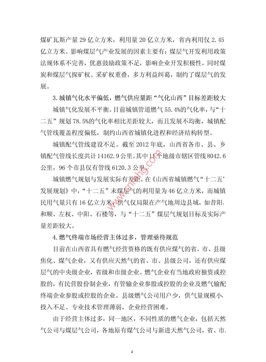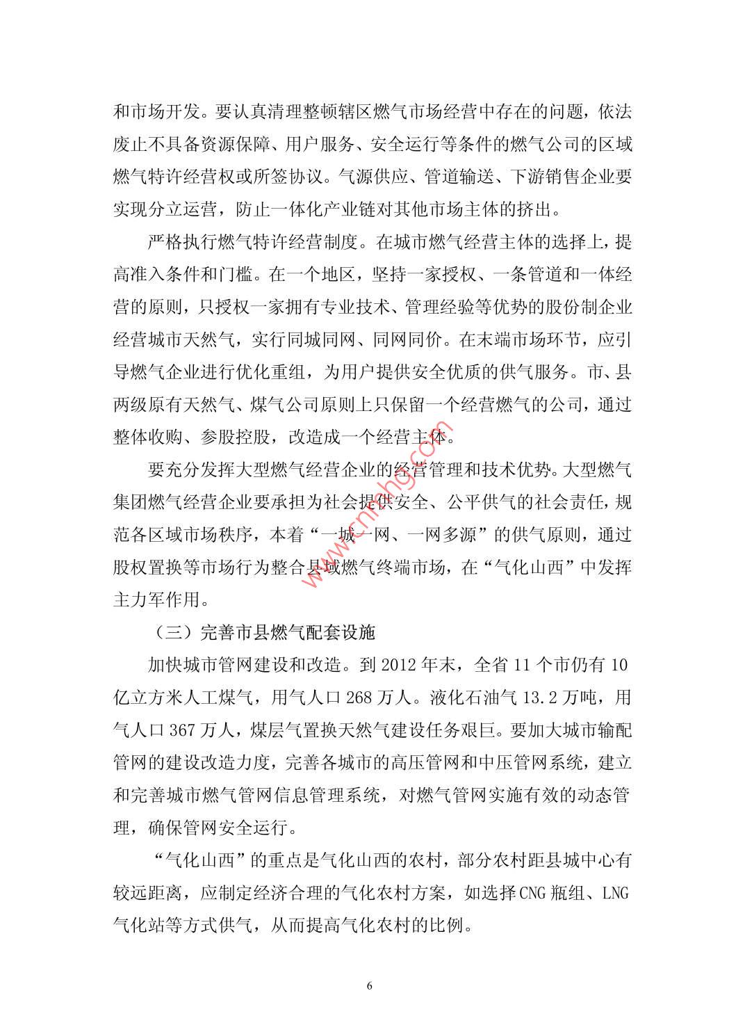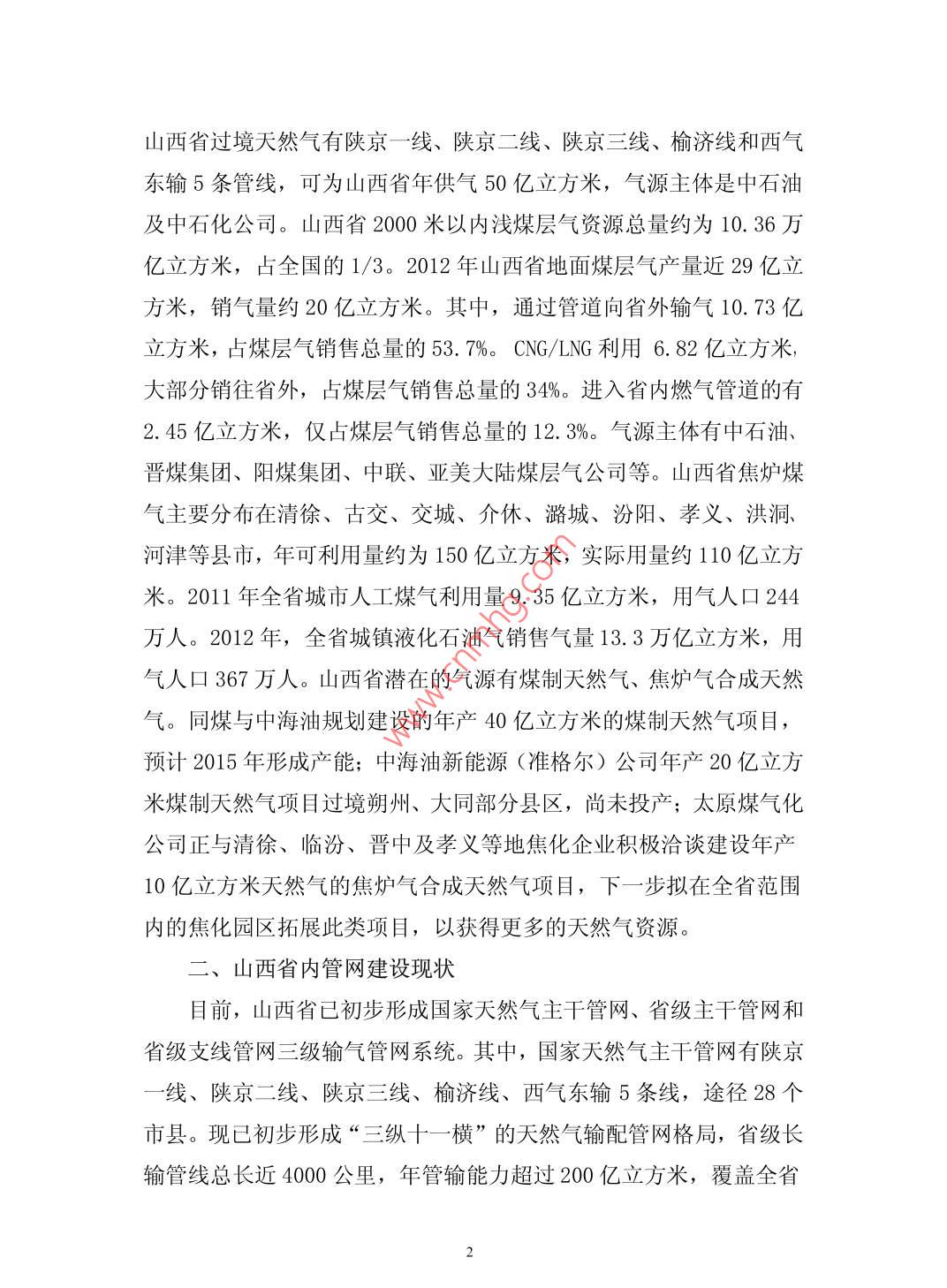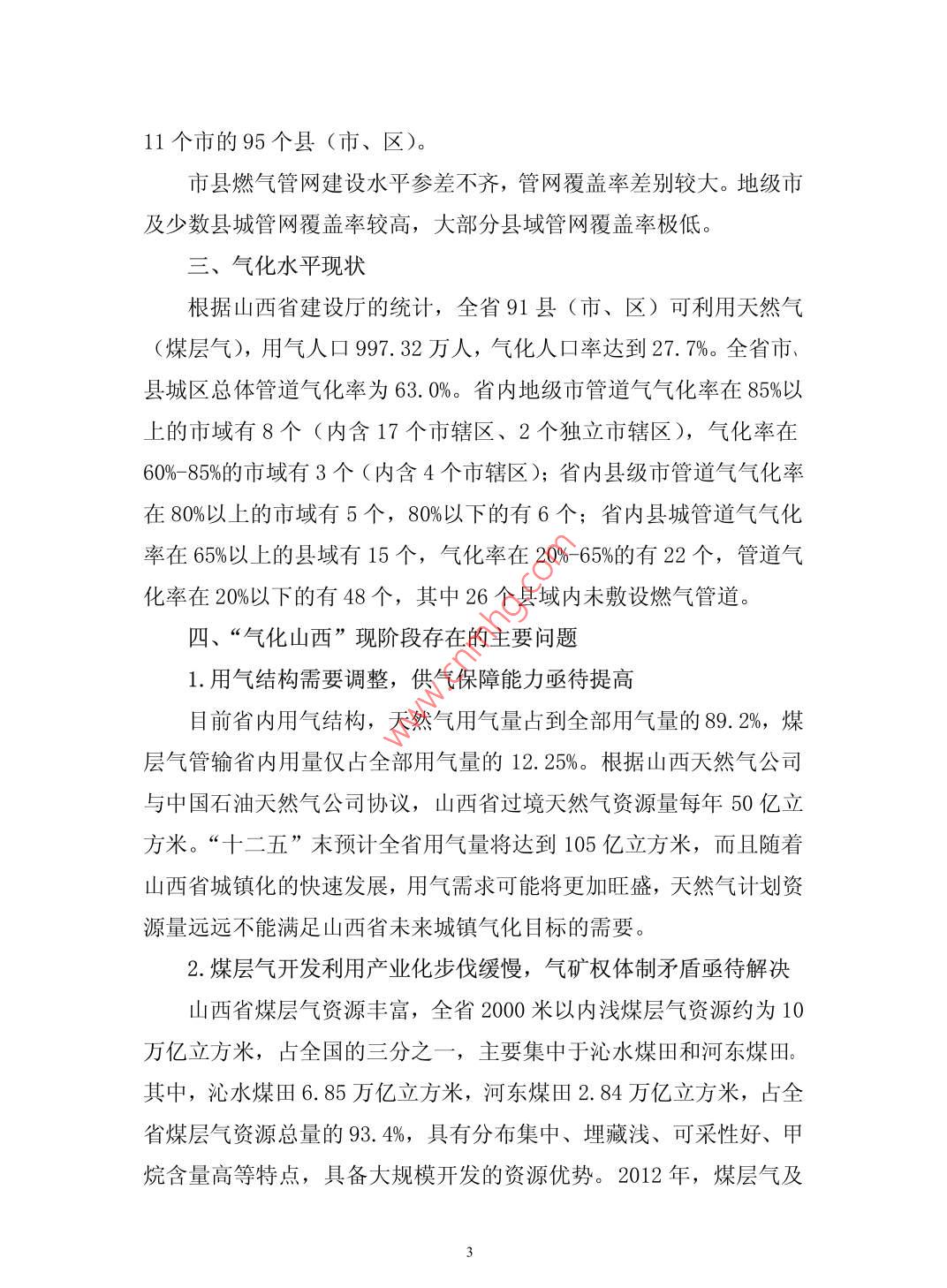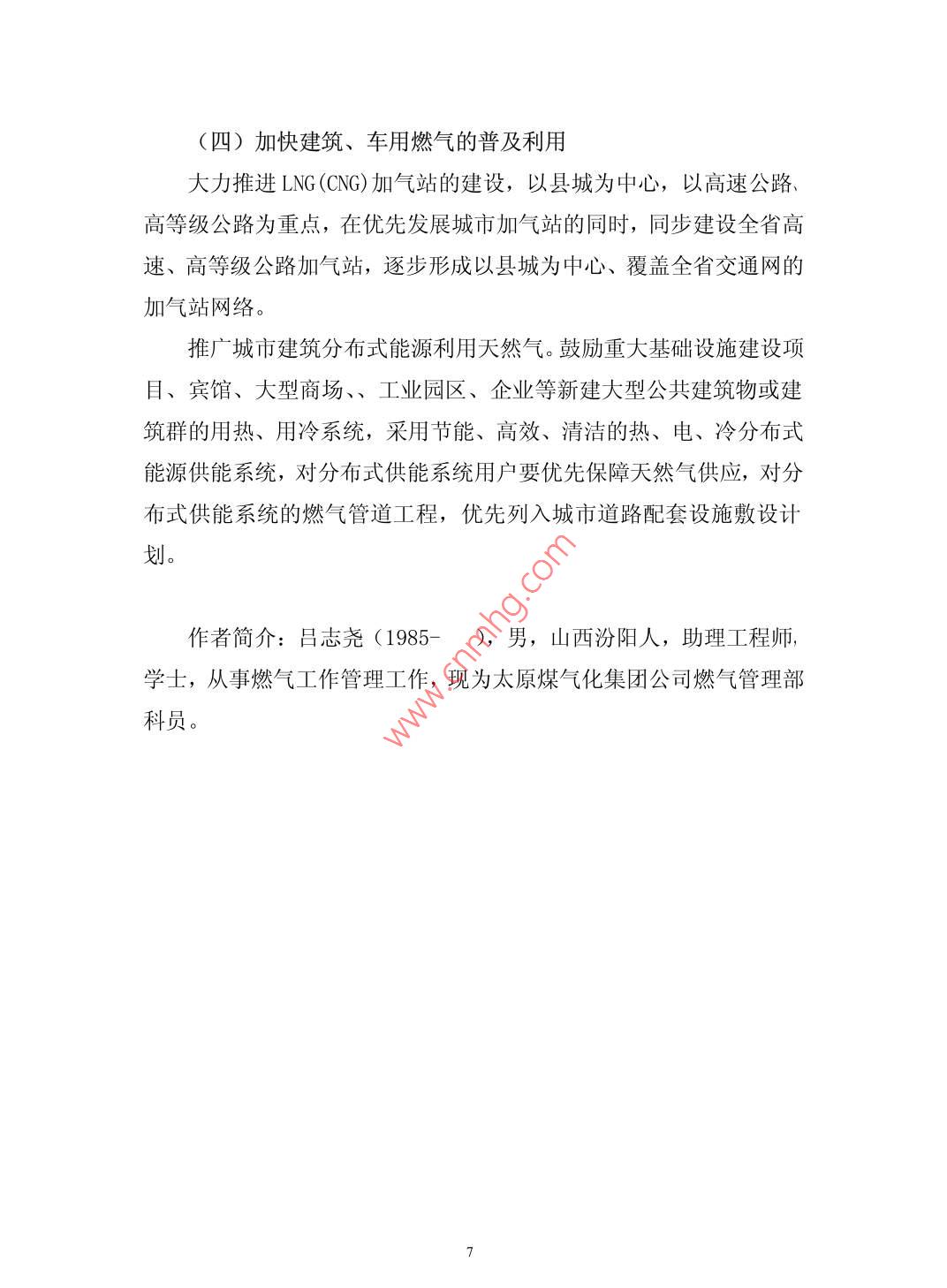 “氣化山西”技術(shù)路線的探討呂志堯周杰慧太原煤炭氣化(集團(tuán))有限責(zé)任公司山西030024摘要:根據(jù)山西省燃?xì)饫矛F(xiàn)狀,結(jié)合山西省燃?xì)赓Y源的配置情況,制定出比較經(jīng)濟(jì)合理的燃?xì)饫眉夹g(shù)路線。從而達(dá)到“氣化山西”的目的。關(guān)鍵詞:“氣化山西”;技術(shù)路線Discussion on "gasification Shanxi" technologyLv zhiyaozhou jiehuiAbstract: According to the Shanxiprovincial gasutil ization si tuation,combined with the allocation of gasresources in Shanxi Province, make gas more economic andreasonable utilization technology. In order to achieve thepurpose of" gasification of Shanxi" .Keywords: "gasification Shanxi"; technical route中圖分類號(hào): F470.22文獻(xiàn)標(biāo)識(shí)碼: A燃?xì)馐且?種潔凈、高效、環(huán)保的能源。隨著燃?xì)獾膹V泛使用,燃?xì)猱a(chǎn)業(yè)也成為21世紀(jì)最具競(jìng)爭(zhēng)力的朝陽產(chǎn)業(yè),燃?xì)庖云洫?dú)特的優(yōu)勢(shì)在能源領(lǐng)域中所占的比例越來越重?!皻饣轿鳌笔鞘∥?、省政府推進(jìn)能源結(jié)構(gòu)新型化、城鄉(xiāng)生態(tài)化的重要戰(zhàn)略工程。一、山西省氣源現(xiàn)狀山西省目前有60個(gè)天然氣分輸口和7個(gè)煤層氣并入點(diǎn),已形成以天然氣、煤層氣為主,焦?fàn)t煤氣等為補(bǔ)充的多元互補(bǔ)氣源供應(yīng)結(jié)構(gòu)。山西省過境天然氣有陜京一-線、陜京二線、陜京三線、榆濟(jì)線和西氣東輸5條管線,可為山西省年供氣50億立方米,氣源主體是中石油及中石化公司。山西省2000米以內(nèi)淺煤層氣資源總量約為10. 36萬億立方米,占全國(guó)的1/3。2012 年山西省地面煤層氣產(chǎn)量近29億立方米,銷氣量約20億立方米。其中,通過管道向省外輸氣10. 73億立方米,占煤層氣銷售總量的53.7%。CNG/LNG利用 6. 82億立方米,大部分銷往省外,占煤層氣銷售總量的34%。進(jìn)入省內(nèi)燃?xì)夤艿赖挠?.45億立方米,僅占煤層氣銷售總量的12. 3%。氣源主體有中石油、.晉煤集團(tuán)、陽煤集團(tuán)、中聯(lián)、亞美大陸煤層氣公司等。山西省焦?fàn)t煤氣主要分布在清徐、古交、交城、介休、潞城、汾陽、孝義、洪洞、河津等縣市,年可利用量約為150 億立方米,實(shí)際用量約110億立方米。2011 年全省城市人工煤氣利用量9.35億立方米,用氣人口244萬人。2012年,全省城鎮(zhèn)液化石油氣銷售氣量13.3萬億立方米,用氣人口367萬人。山西省潛在的氣源有煤制天然氣、焦?fàn)t氣合成天然氣。同煤與中海油規(guī)劃建設(shè)的年產(chǎn)40億立方米的煤制天然氣項(xiàng)目,預(yù)計(jì)2015年形成產(chǎn)能;中海油新能源(準(zhǔn)格爾)公司年產(chǎn)20億立方米煤制天然氣項(xiàng)目過境朔州、大同部分縣區(qū),尚未投產(chǎn),太原煤氣化公司正與清徐、臨汾、晉中及孝義等地焦化企業(yè)積極洽談建設(shè)年產(chǎn)10億立方米天然氣的焦?fàn)t氣合成天然氣項(xiàng)目,下一-步擬在全省范圍內(nèi)的焦化園區(qū)拓展此類項(xiàng)目,以獲得更多的天然氣資源。二、山西省內(nèi)管網(wǎng)建設(shè)現(xiàn)狀目前,山西省已初步形成國(guó)家天然氣主干管網(wǎng)、省級(jí)主干管網(wǎng)和省級(jí)支線管網(wǎng)三級(jí)輸氣管網(wǎng)系統(tǒng)。其中,國(guó)家天然氣主干管網(wǎng)有陜京-線、陜京二線、陜京三線、榆濟(jì)線、西氣東輸5條線,途徑28個(gè)市縣?,F(xiàn)已初步形成“三縱十一橫”的天然氣輸配管網(wǎng)格局,省級(jí)長(zhǎng)輸管線總長(zhǎng)近4000公里,年管輸能力超過200億立方米,覆蓋全省11個(gè)市的95個(gè)縣(市、區(qū))。市縣燃?xì)夤芫W(wǎng)建設(shè)水平參差不齊,管網(wǎng)覆蓋率差別較大。地級(jí)市及少數(shù)縣城管網(wǎng)覆蓋率較高,大部分縣域管網(wǎng)覆蓋率極低。三、氣化水平現(xiàn)狀根據(jù)山西省建設(shè)廳的統(tǒng)計(jì),全省91縣(市、區(qū))可利用天然氣(煤層氣),用氣人口997.32萬人,氣化人口率達(dá)到27. 7%。全省市、縣城區(qū)總體管道氣化率為63.0%。省內(nèi)地級(jí)市管道氣氣化率在85%以上的市域有8個(gè)(內(nèi)含17個(gè)市轄區(qū)、2個(gè)獨(dú)立市轄區(qū)),氣化率在60%-85%的市域有3個(gè)(內(nèi)含4個(gè)市轄區(qū));省內(nèi)縣級(jí)市管道氣氣化率在80%以上的市域有5個(gè),80%以下的有6個(gè);省內(nèi)縣城管道氣氣化率在65%以上的縣域有15個(gè),氣化率在20% -65%的有22個(gè),管道氣化率在20%以下的有48個(gè),其中26個(gè)縣域內(nèi)未敷設(shè)燃?xì)夤艿?。四、“氣化山西”現(xiàn)階段存在的主要問題1.用氣結(jié)構(gòu)需要調(diào)整,供氣保障能力亟待提高目前省內(nèi)用氣結(jié)構(gòu),天然氣用氣量占到全部用氣量的89.2%,煤層氣管輸省內(nèi)用量?jī)H占全部用氣量的12. 25%。根據(jù)山西天然氣公司與中國(guó)石油天然氣公司協(xié)議,山西省過境天然氣資源量每年50億立方米?!笆濉蹦╊A(yù)計(jì)全省用氣量將達(dá)到105億立方米,而且隨著山西省城鎮(zhèn)化的快速發(fā)展,用氣需求可能將更加旺盛,天然氣計(jì)劃資源量遠(yuǎn)遠(yuǎn)不能滿足山西省未來城鎮(zhèn)氣化目標(biāo)的需要。2.煤層氣開發(fā)利用產(chǎn)業(yè)化步伐緩慢,氣礦權(quán)體制矛盾亟待解決山西省煤層氣資源豐富,全省2000米以內(nèi)淺煤層氣資源約為10萬億立方米,占