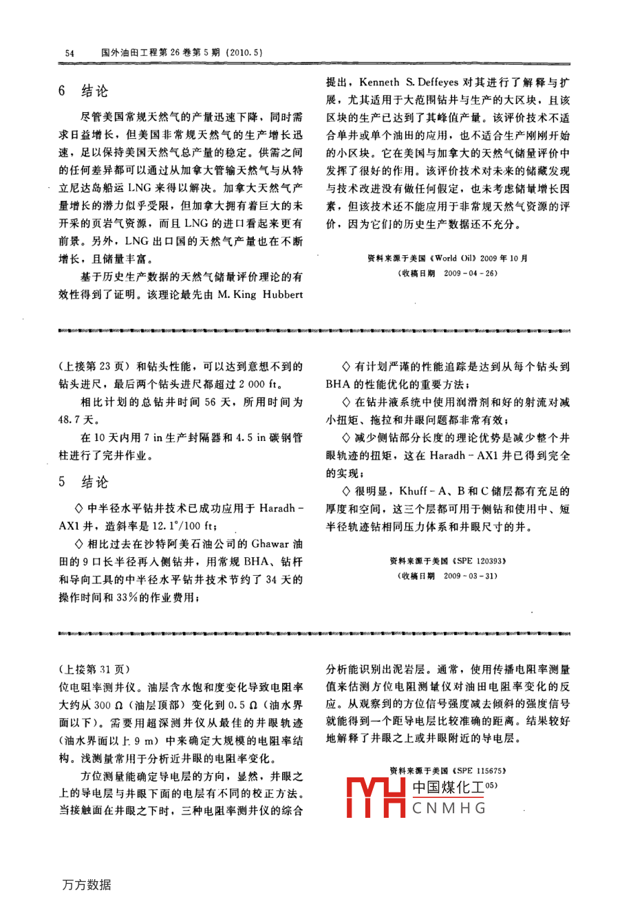 楊冰:美國(guó)天然氣:需求、供給和儲(chǔ)量美國(guó)夭然氣:需求、供給和儲(chǔ)量編譯:楊冰(大慶油田工程有限公司)審校:張興平(大慶油田工程有限公司)要評(píng)價(jià)了美國(guó)過去和目前天然氣的時(shí)間或標(biāo)準(zhǔn)日期,a;產(chǎn)量,給出了天然氣未來儲(chǔ)量的來源。目前t。—峰值產(chǎn)量年;美國(guó)常規(guī)天然氣供給緊縮,只能提供需求的b—產(chǎn)量變化因子,1012ft43%。美國(guó)能源信息管理局(EIA)預(yù)測(cè)目Q—時(shí)間t時(shí)的累積產(chǎn)量前44%的天然氣需求來自非常規(guī)能源,另Hubbert理論曲線在獲得了充分的長(zhǎng)期生產(chǎn)數(shù)據(jù)外的13%來自進(jìn)口。還介紹了僅應(yīng)用歷史后與生產(chǎn)數(shù)據(jù)擬合得很好。自1989年以來,當(dāng)實(shí)際生產(chǎn)數(shù)據(jù)來估算天然氣儲(chǔ)量的方法,該方法生產(chǎn)達(dá)到最大產(chǎn)量且產(chǎn)出約一半的天然氣時(shí),數(shù)據(jù)趨涉及價(jià)格、地質(zhì)、政治、技術(shù)、最終可采氣勢(shì)與理論曲線非常一致,從此曲線不能馬上看出未來量或儲(chǔ)量的增長(zhǎng),不做任何假定,可見這種產(chǎn)量,尤其在離散數(shù)據(jù)數(shù)量相當(dāng)大時(shí)。圖2表明,到評(píng)估是現(xiàn)實(shí)的2020年常規(guī)大然氣可能減至7×102ft詞天然氣需求供給儲(chǔ)量進(jìn)口美國(guó)Dol:10.3969/.isn.1002-641X.2010.50141概述母常凈進(jìn)口1987年以來,美國(guó)天然氣的消耗量已經(jīng)超過了美國(guó)的生產(chǎn)能力,兩者之間的差距通過管道和船只進(jìn)口液化天然氣(LNG)來彌補(bǔ)。供給中最大的部分是常規(guī)天然氣,但已開始不斷降低,現(xiàn)在只圖1美國(guó)天然氣資源的最近走勢(shì)能提供總需求量的43%;供給中的第二大部分是致密天然氣,目前為29%,且在迅速增長(zhǎng);供給中的第三部分是管道天然氣的進(jìn)口,占12%;其余的來自煤層甲烷、頁巖氣和LNG。天然氣供給中各部分的趨勢(shì)如圖1所示。非常規(guī)天然氣產(chǎn)量在最近的20年中已增長(zhǎng)了4倍。2常規(guī)天然氣圖1表明,美國(guó)常規(guī)天然氣產(chǎn)量持續(xù)下降,從1990年的15×1012ft(1ft3=38.317dm3)降至圖2美國(guó)常規(guī)天然氣的產(chǎn)量2008年的10×1012ft。天然氣歷史產(chǎn)量與時(shí)間的可以重新描制生產(chǎn)數(shù)據(jù)曲線,以檢測(cè)是否與關(guān)系曲線呈現(xiàn)出鐘形(圖2),曲線不包括非常規(guī) Hubbert理論相符,并表明什么時(shí)候開始達(dá)到似天然氣產(chǎn)量。圖2中的紅色曲線是一個(gè)對(duì)數(shù)分布,合。圖3是年生產(chǎn)量與累積生產(chǎn)量的比值(y軸)該曲線方程是 M. King Hubbert使用的對(duì)數(shù)曲線與累積產(chǎn)量(x軸)的關(guān)系曲線,可以看到一線的導(dǎo)數(shù)。導(dǎo)數(shù)曲線方程為P=dQ/dt,其中性圖形(紅色),從1989年開始與 Hubbert理論2P曲線cOS為零中國(guó)煤化工軸相交時(shí),產(chǎn)量終累積產(chǎn)量為式中P—天然氣產(chǎn)量,1012ft;CNMHG新發(fā)現(xiàn)一個(gè)大的峰值產(chǎn)量天然氣田,那么這條曲線將會(huì)改變,但迄今為止產(chǎn)52國(guó)外油田工程第26卷第5期(2010.5)量數(shù)據(jù)跟從 Hubbert曲線已經(jīng)20年了。從圖3可求的7%。正如它的命名,頁巖氣產(chǎn)自頁巖,也需以看出,美國(guó)至今產(chǎn)出常規(guī)天然氣約930×1012要水平井或水力壓裂開采。由圖4可知,頁巖的增ft,還有約230×1012ft·待生產(chǎn)長(zhǎng)速率在它的指數(shù)階段。顯然, Fort Worth盆地中的 Barnett Shale是頁巖氣產(chǎn)量最大的地區(qū),2008年產(chǎn)量為1.4×102ft3。在1993年與2008年間 Barne產(chǎn)出5.0×1012ft2頁巖氣,剩余儲(chǔ)量能接近26×1012ft'。人們相信,目前32%的生產(chǎn)增長(zhǎng)率是不會(huì)持久的,尤其在目前的高油價(jià)(4美元/10°Btu)情況下。一些研究人員估測(cè)可能達(dá)到6美元或更高。路易斯安娜州西北部和東得克薩斯州的13美國(guó)常規(guī)天然氣的累積產(chǎn)量增長(zhǎng)速率Haynesville Shale是目前天然氣市場(chǎng)的亮點(diǎn)。初始產(chǎn)量在15~20MMcd( 1 MMcfd=10°ft3)是3非常規(guī)天然氣正常產(chǎn)量。第一年的降幅達(dá)65%~80%。計(jì)算的天然氣可采量為34×102ft3。每口井鉆至11500美國(guó)非常規(guī)天然氣生產(chǎn)份額從1998年總產(chǎn)量15250ft需7.5~9.5百萬美元的成本的28%上升到2007年的46%。圖1表明,產(chǎn)量穩(wěn)Haynesville可能需要6~8美元/10Btu才可達(dá)到步增長(zhǎng),目前已與常規(guī)天然氣的產(chǎn)量相當(dāng)。非常規(guī)經(jīng)濟(jì)開采天然氣可以分為三類:致密氣、頁巖氣和煤層氣。在美國(guó)有20多個(gè)頁巖生產(chǎn)區(qū),據(jù)估測(cè),到非常規(guī)天然氣基本上能彌補(bǔ)常規(guī)天然氣的下降,因2020年7個(gè)大的生產(chǎn)區(qū)的產(chǎn)量可以達(dá)到10×102此國(guó)內(nèi)天然氣的總產(chǎn)量一直很穩(wěn)定,只是近幾年有14×1012ft3,這個(gè)預(yù)測(cè)可能太樂觀了。了明顯的不足。近年來,商天然氣價(jià)格帶來了高鉆3.3煤層甲烷機(jī)數(shù)量的動(dòng)用,鉆井?dāng)?shù)量增多,產(chǎn)量自然增長(zhǎng)。圖煤層甲烷(CBM)是指煤層基質(zhì)中吸收的甲給出美國(guó)非常規(guī)天然氣的生產(chǎn)產(chǎn)量。烷。在煤夾層中可能存在一些自由氣,這是煤開采中的危險(xiǎn)因素,但