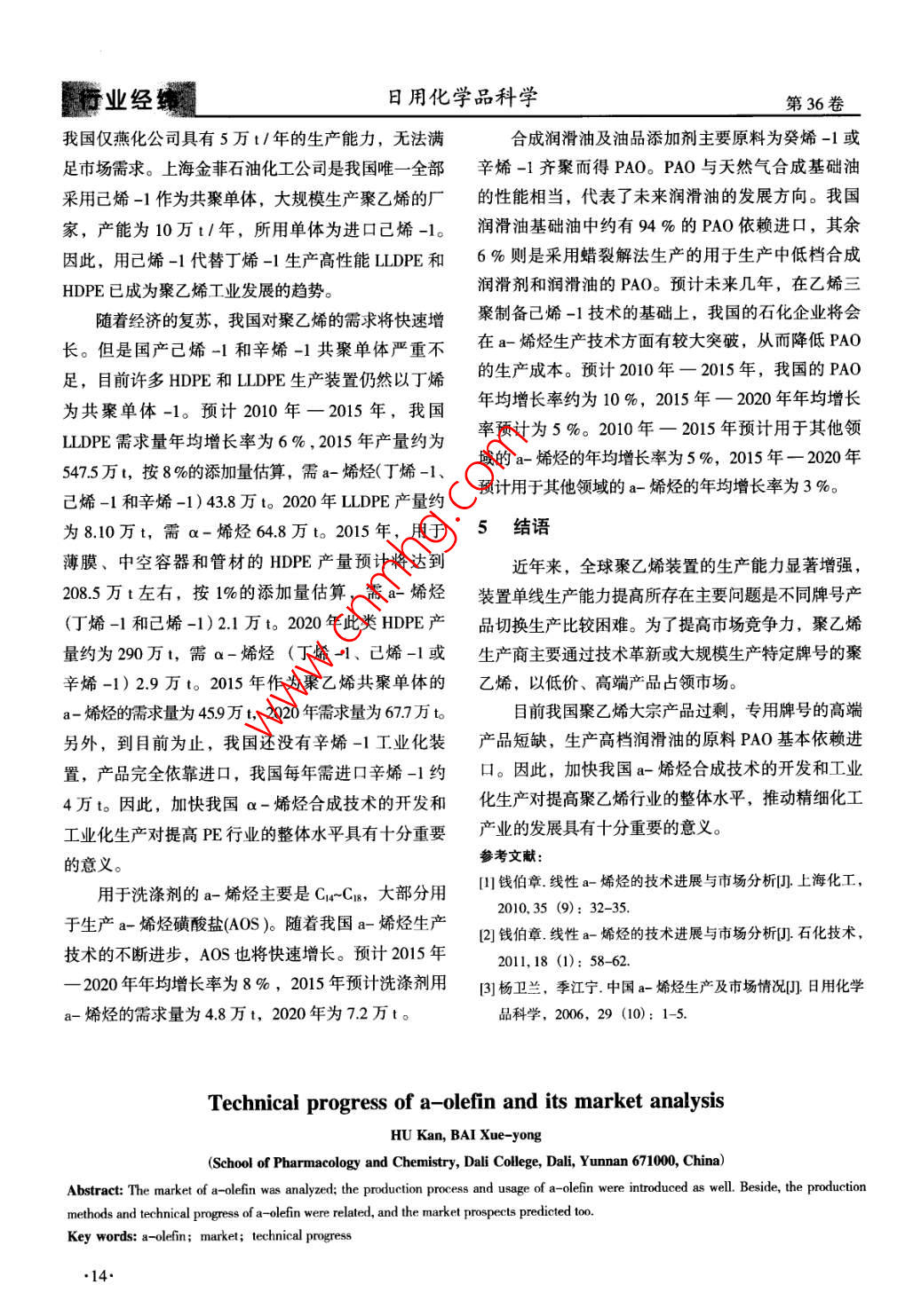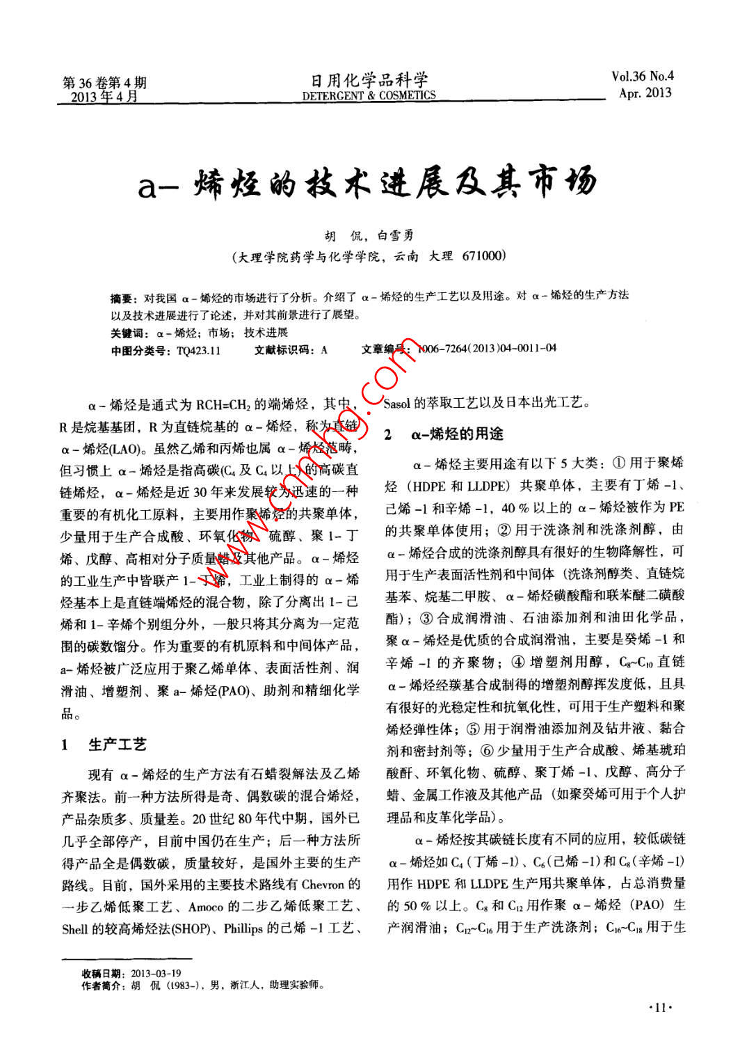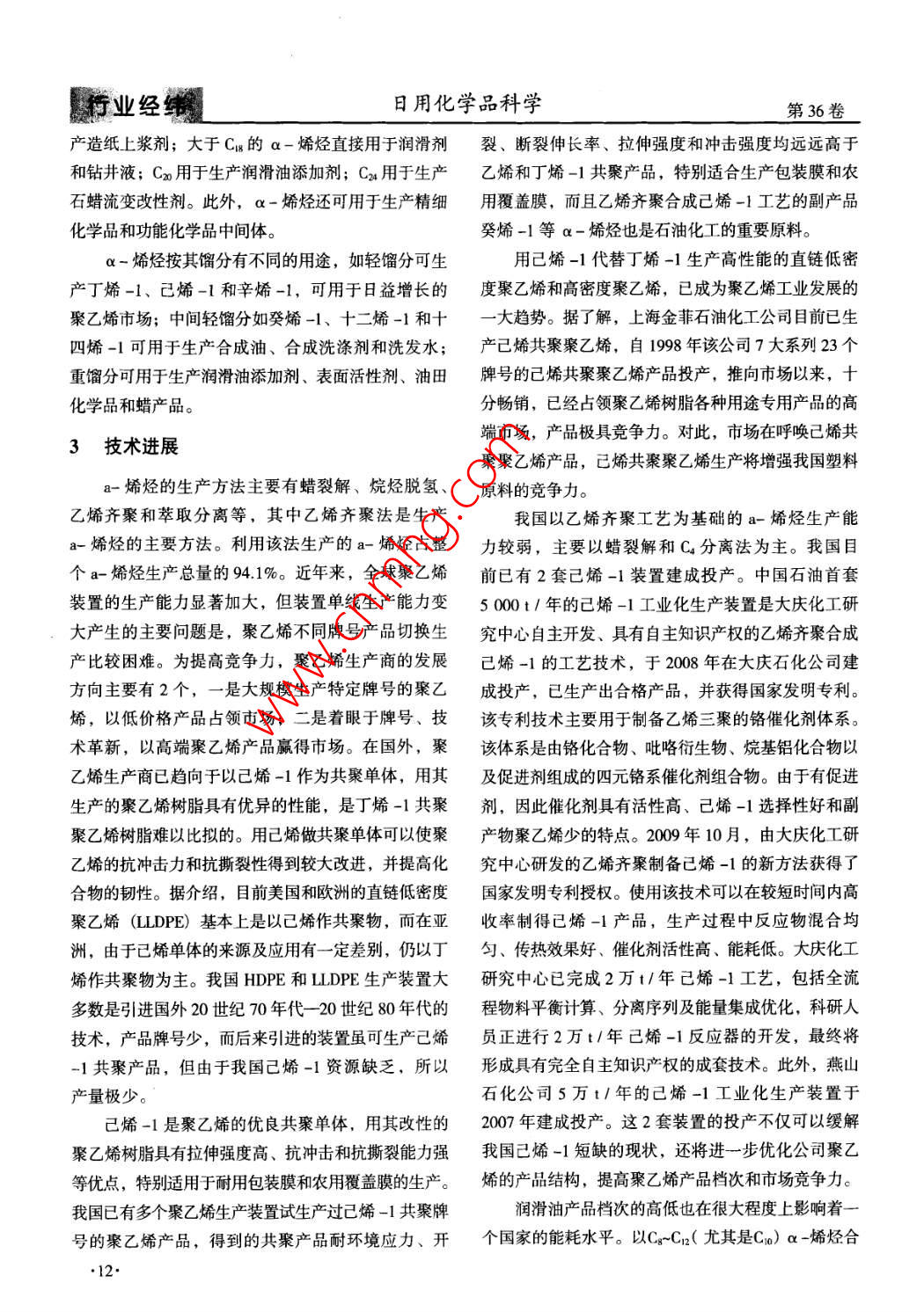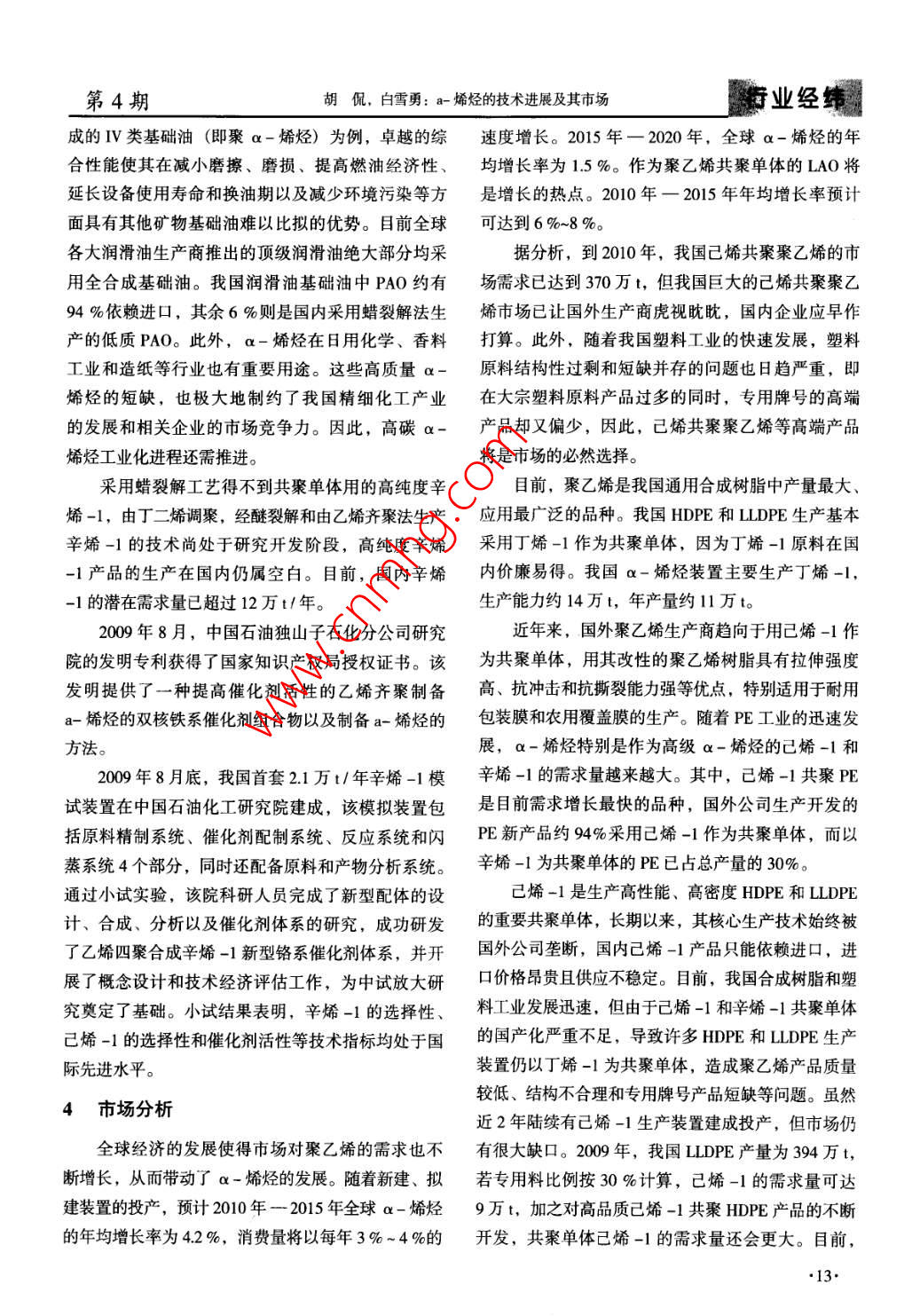 第36卷第4期日用化學品科學Vol.36 No.4_2013 年4月DETERGENT & COSMETICSApr. 2013a-烯烴的技術進展及其市場胡侃, 白雪勇(大理學院藥學與化學學院,云南大理671000)摘要:對我國a-烯烴的市場進行了分析。介紹了a-烯烴的生產工藝以及用途。對a-烯烴的生產方法以及技術進展進行了論述,并對其前景進行了展望。關鍵詞: a-烯烴; 市場,技術進展中圖分類號: TQ423.11文獻標識碼: A文章編號: 1006-7264( 2013 )04-0011-04a-烯烴是通式為RCH=CH2的端烯烴,其中,Sasol 的萃取工藝以及日本出光工藝。R是烷基基團, R為直鏈烷基的a-烯烴,稱為直鏈a-烯烴的用途a-烯烴(LAO)。雖然乙烯和丙烯也屬c -烯烴范疇,但習慣上a-烯烴是指高碳(C4及Cs以上)的高碳直a-烯烴主要用途有以下5大類:①用于聚烯鏈烯烴,a-烯烴是近30年來發(fā)展較為迅速的一-種烴(HDPE和LLDPE) 共聚單體,主要有丁烯-1、重要的有機化工原料,主要用作聚烯烴的共聚單體,已烯-1和辛烯-1, 40%以上的a-烯烴被作為PE少量用于生產合成酸、環(huán)氧化物、硫醇、聚1-丁的共聚單體使用;②用于洗滌劑和洗滌劑醇,由烯、戊醇、高相對分子質量蠟及其他產品。a- 烯烴a-烯烴合成的洗滌劑醇具有很好的生物降解性,可的工業(yè)生產中皆聯(lián)產1-丁烯,工業(yè)上制得的x-烯用于生產表面活性劑和中間體(洗滌劑醇類、直鏈烷烴基本上是直鏈端烯烴的混合物,除了分離出1-己基苯、烷基二甲胺、a-烯烴磺酸酯和聯(lián)苯醚_磺酸烯和1-辛烯個別組分外,一般只將其分離為- -定范酯);③合成潤滑油、石油添加劑和油田化學品,圍的碳數(shù)餾分。作為重要的有機原料和中間體產品,聚a-烯烴是優(yōu)質的合成潤滑油,主要是癸烯-1和a-烯烴被廣泛應用于聚乙烯單體、表面活性劑、潤辛烯-1的齊聚物;④增塑劑用醇,Cg~Cro 直鏈滑油、增塑劑、聚a-烯烴(PAO)、助劑和精細化學a-烯烴經羰基合成制得的增塑劑醇揮發(fā)度低,且具有很好的光穩(wěn)定性和抗氧化性,可用于生產塑料和聚品。烯烴彈性體;⑤用于潤滑油添加劑及鉆井液、黏合1生產工藝劑和密封劑等;⑥少量用于生產合成酸、烯基琥珀現(xiàn)有a-烯烴的生產方法有石蠟裂解法及乙烯酸酐、環(huán)氧化物、硫醇、聚丁烯-1、戊醇、高分子齊聚法。前一種方法所得是奇、偶數(shù)碳的混合烯烴,蠟、金屬工作液及其他產品(如聚癸烯可用于個人護產品雜質多、質量差。20 世紀80年代中期,國外已理品和皮革化學品)。幾乎全部停產,目前中國仍在生產;后一種方法所a-烯烴按其碳鏈長度有不同的應用,較低碳鏈得產品全是偶數(shù)碳,質量較好,是國外主要的生產a- 烯烴如C4(丁烯-1)、C6(己烯-1)和C(辛烯-1)路線。目前,國外采用的主要技術路線有Chevron的用作HDPE和LLDPE生產用共聚單體,占總消費量一步乙烯低聚工藝、Amoco的二步乙烯低聚工藝、的50%以上。Cg 和C12用作聚a-烯烴(PAO)生Shell的較高烯烴法(SHOP)、Pilips 的己烯-1工藝、產 潤滑油; Cnr-Ci%6 用于生產洗滌劑; CIio-C1g 用于生收稿日期: 2013- -03-19作者簡介:胡侃(1983-),男,浙江人,助理實驗師。.11.行業(yè)經結I日用化學品科學第36卷產造紙上漿劑;大于C1g的a-烯烴直接用于潤滑劑裂、斷裂伸長率、拉伸強度和沖擊強度均遠遠高于和鉆井液; Co用于生產潤滑油添加劑; C24 用于生產乙烯和丁烯-1共聚產品,特別適合生產包裝膜和農石蠟流變改性劑。此外,a -烯烴還可用于生產精細用覆蓋膜,而且乙烯齊聚合成己烯-1工藝的副產品化學品和功能化學品中間體。癸烯-1等a-烯烴也是石油化工的重要原料。a-烯烴按其餾分有不同的用途,如輕餾分可生用己烯-1代替丁烯-1生產高性能的直鏈低密產丁烯-1、己烯-1和辛烯-1,可用于日益增長的度聚乙烯和高密度聚乙烯,已成為聚乙烯工業(yè)發(fā)展的聚乙烯市場;中間輕餾分如癸烯-1、十二烯-1和十-大趨勢。 據(jù)了解,上海金菲石油化工公司目前已生四烯-1可用于生產合成油、合成洗滌劑和洗發(fā)水;產己烯共聚聚乙烯,自1998 年該公司7大系列23個重餾分可用于生產潤滑油添加劑、表面活性劑、油田牌號的己烯共聚聚乙烯產品投產,推向市場以來,十化學品和蠟產品。分暢銷,已經占領聚乙烯樹脂各種用途專用產品的高端市場,產品極具競爭力。對此,市場在呼喚己烯共3技術進展聚聚乙烯產品,已烯共聚聚乙烯生產將增強我國塑料a-烯烴的生產方法主要有蠟裂解、烷烴脫氫、原料的競爭力。乙烯齊聚和萃取分離等,其中乙烯齊聚法是生產我國以乙烯齊聚工藝為基礎的a-烯烴生產能a-烯烴的主要方法。利用該法生產的a-烯烴占整力較弱,主要以蠟裂解和C4分離法為主。我國目個a-烯烴生產總量的94.1%。近年來,全球聚乙烯前已有2套已烯-1裝置建成投產。中國石油首套裝置的生產能力顯著加大,但裝置單線生產能力變5 000t/年的己烯-1工業(yè)化生產裝置是大慶化工研大產生的主要問題是,聚乙烯不同牌號產品切換生究中心自主開發(fā)、具有自主知識產權的乙烯齊聚合成產比較困難。為提高競爭力,聚乙烯生產商的發(fā)展己烯-1的工藝技術,于2008年在大慶石化公司建方向主要有2個,一是大規(guī)模生產特定牌號的聚乙成投產,已生產出合格產品,并獲得國家發(fā)明專利。烯,以低價格產品占領市場;二是著眼于牌號、技該專 利技術主要用于制備乙烯三聚的鉻催化劑體系。術革新,以高端聚乙烯產品贏得市場。在國外,聚該體 系是由鉻化合物、吡咯衍生物